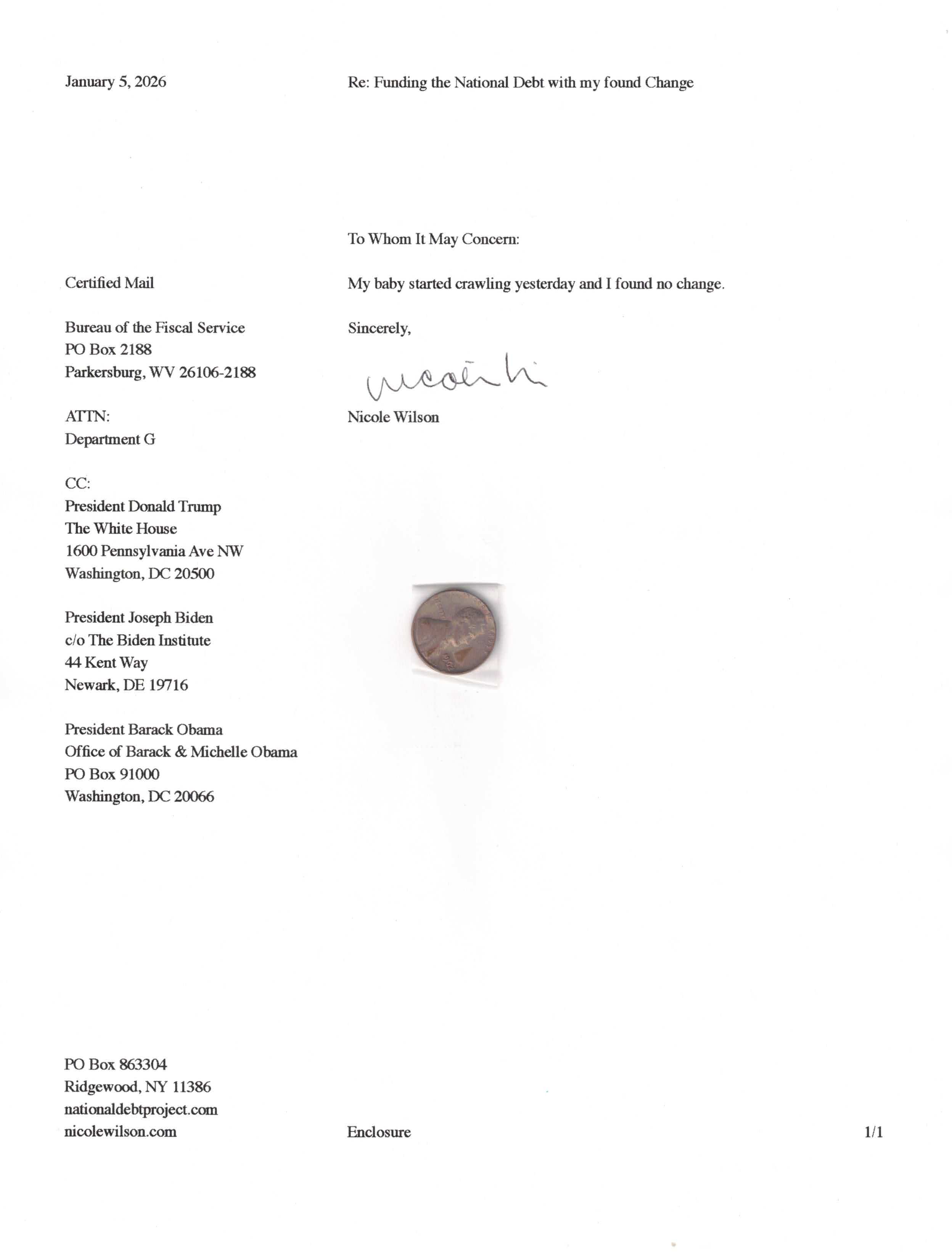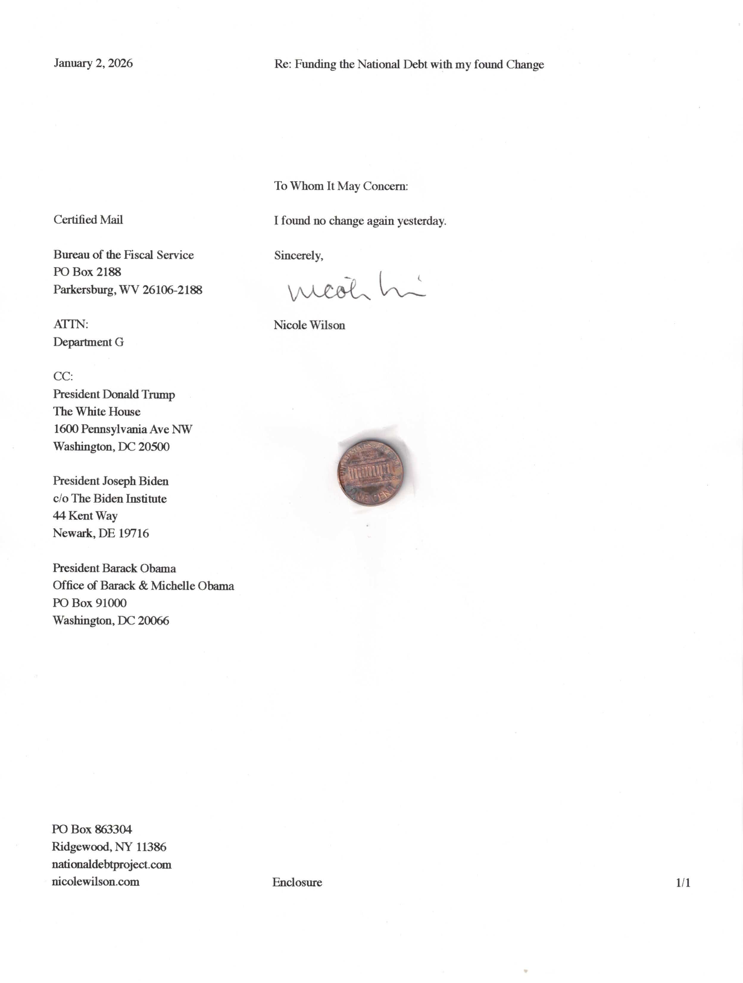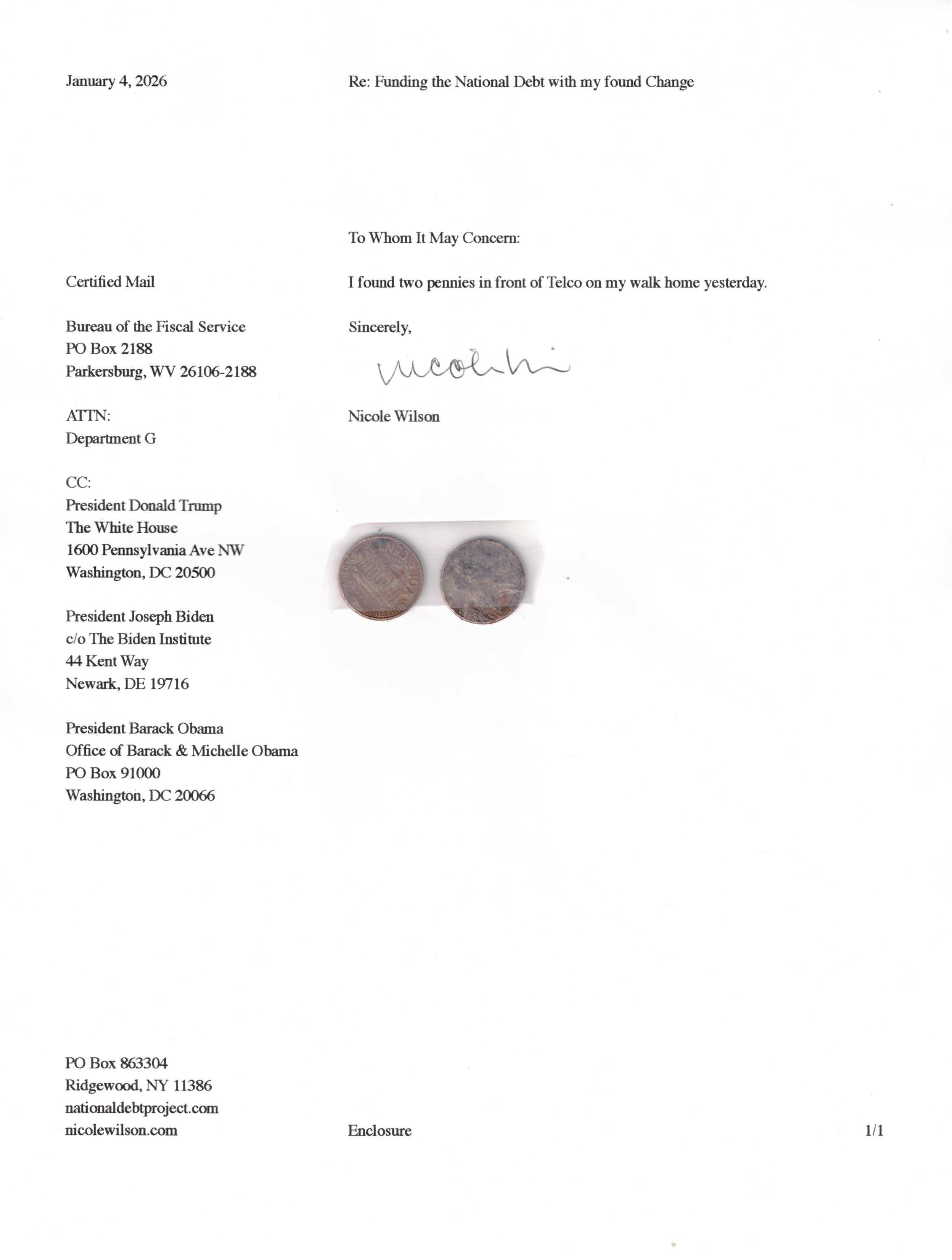 Yet, as I went through each day, I found at least one discarded penny. So, since August 31, 2009, I have sent my found change daily via certified mail to the Bureau of the Fiscal Service (previously the Bureau of the Public Debt), a sector of the Treasury Department whose purpose is to manage the deficit. If by some chance I do not find any change one day, then I send a penny of my own.