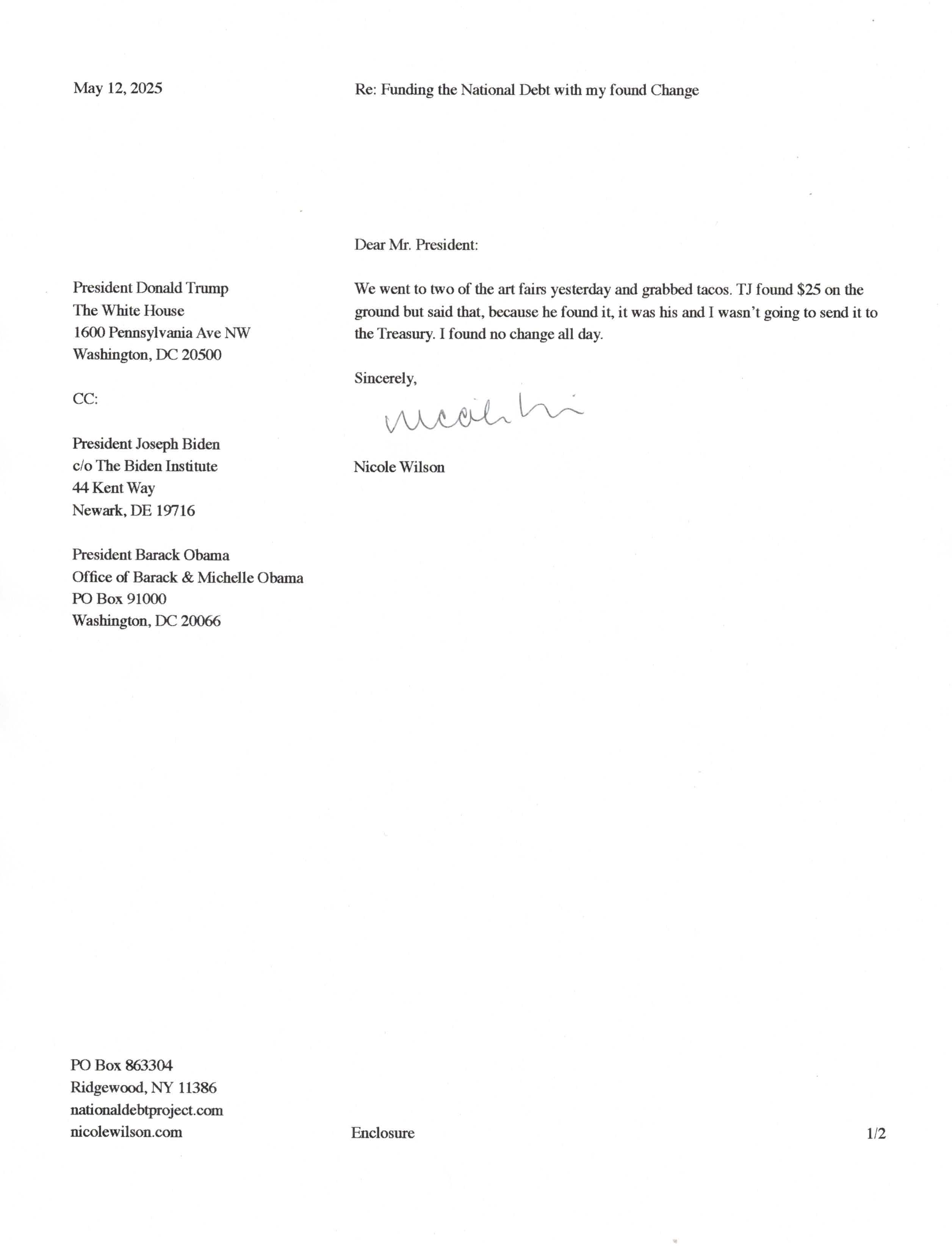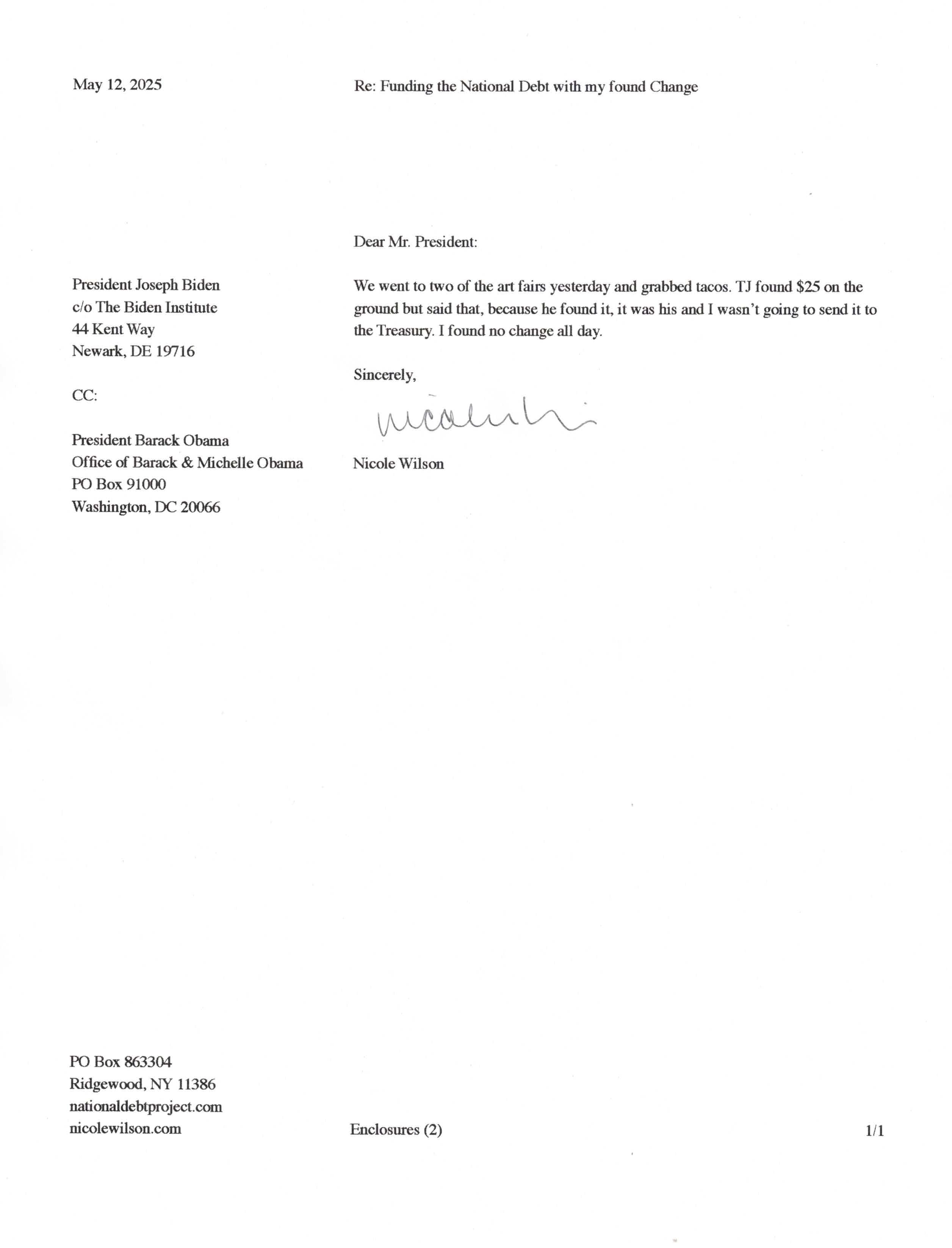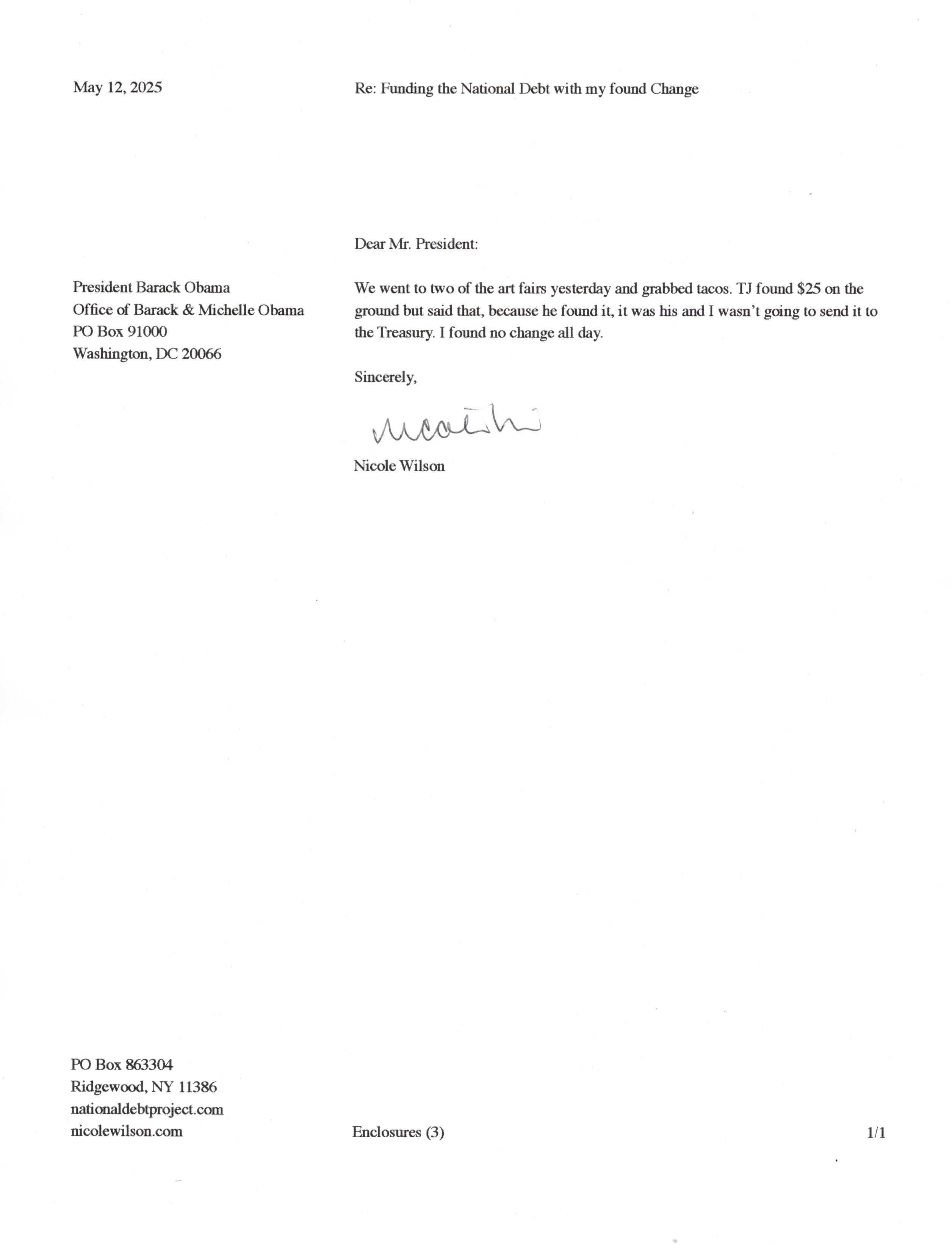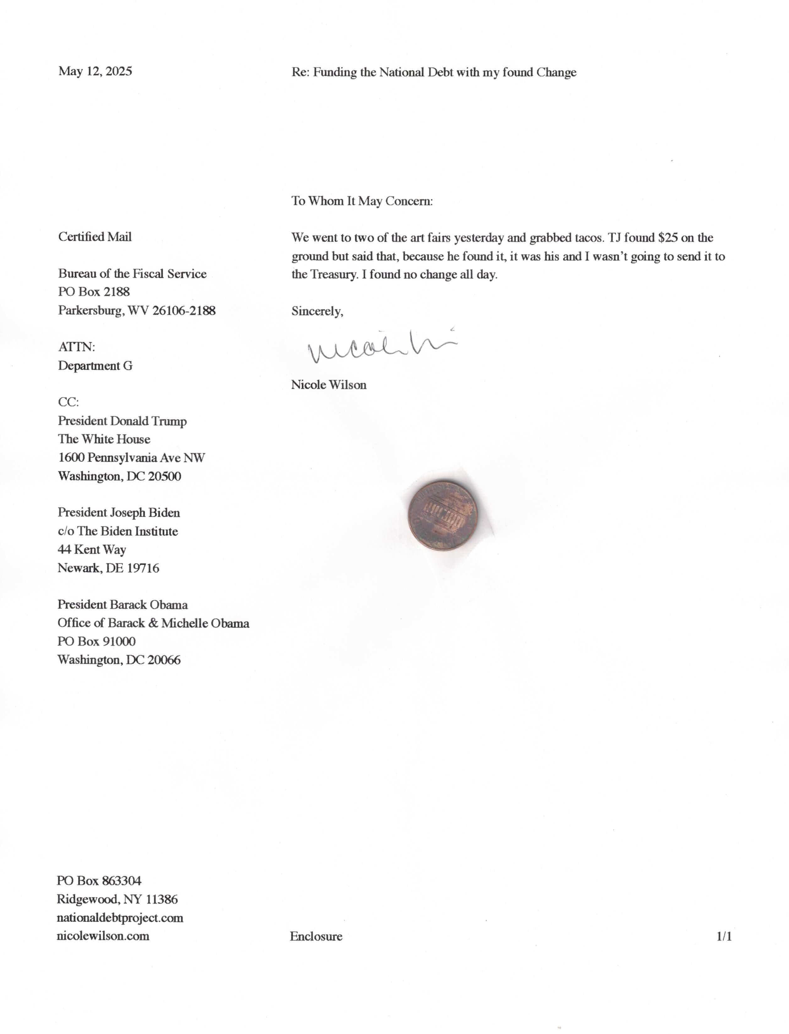 Yet, as I went through each day, I found at least one discarded penny. So, since August 31, 2009, I have sent my found change daily via certified mail to the Bureau of the Fiscal Service (previously the Bureau of the Public Debt), a sector of the Treasury Department whose purpose is to manage the deficit. If by some chance I do not find any change one day, then I send a penny of my own.