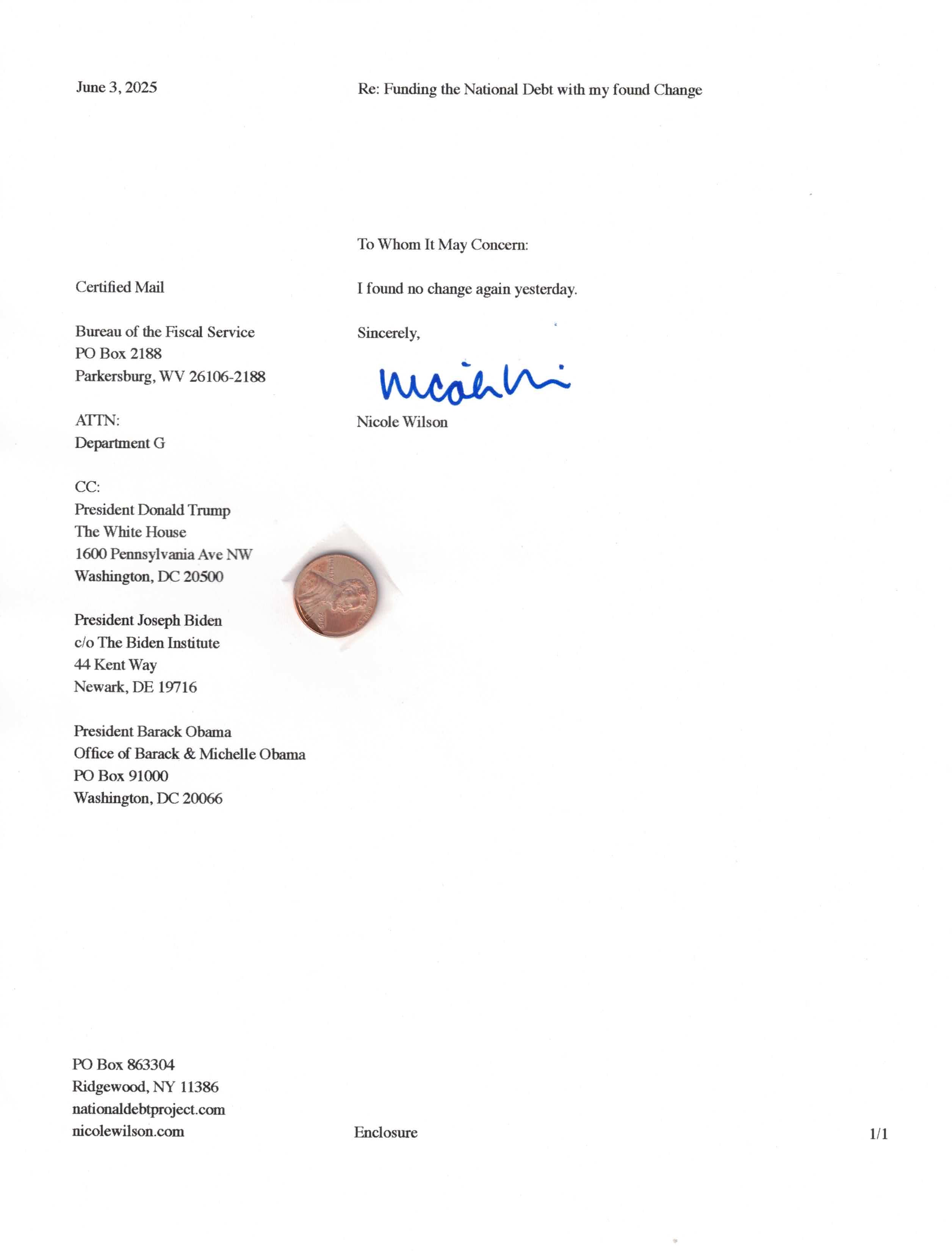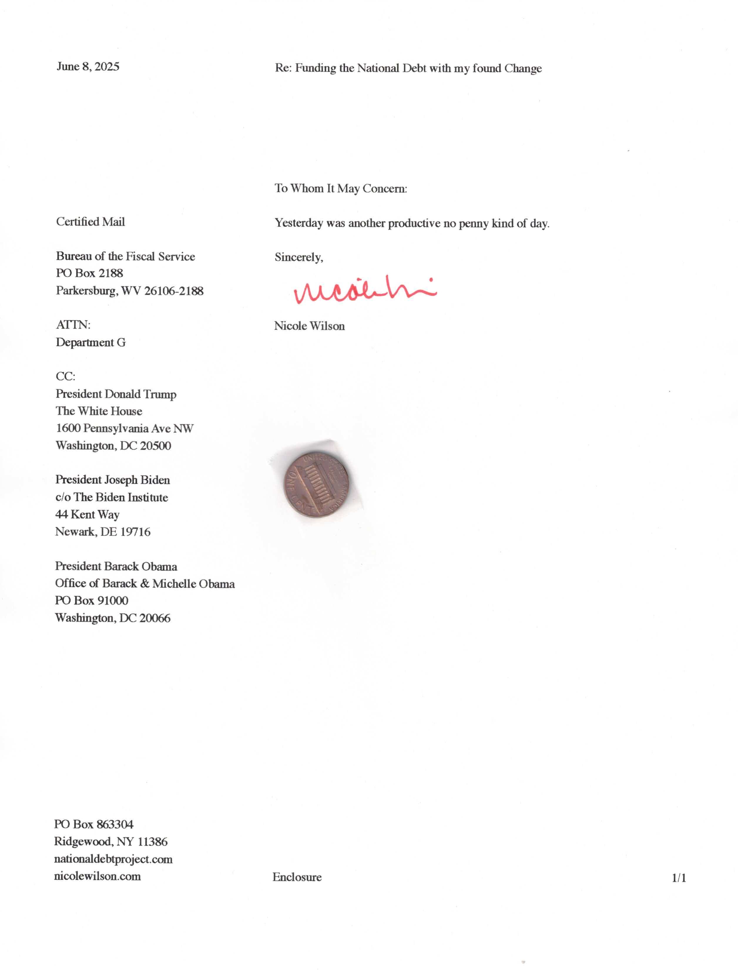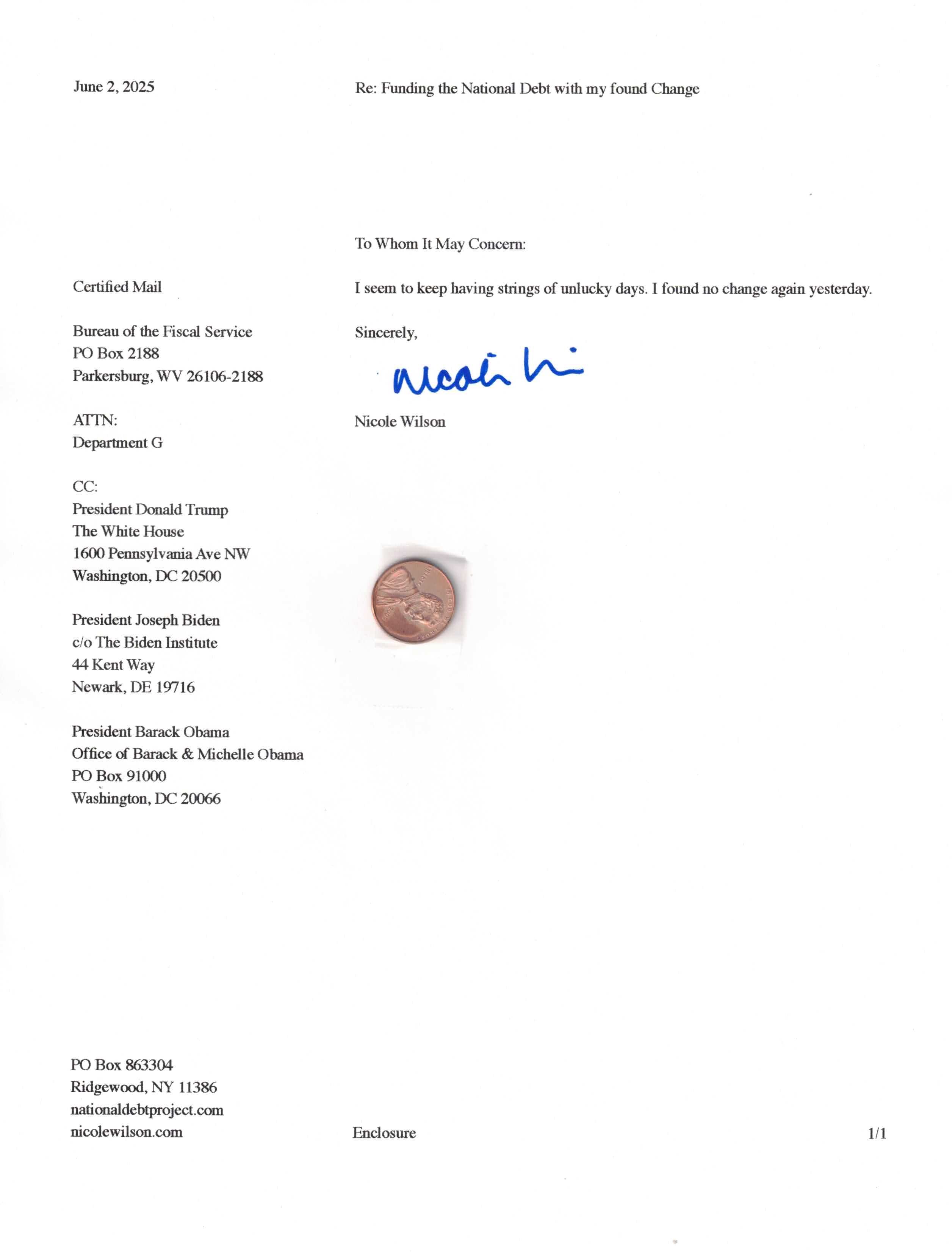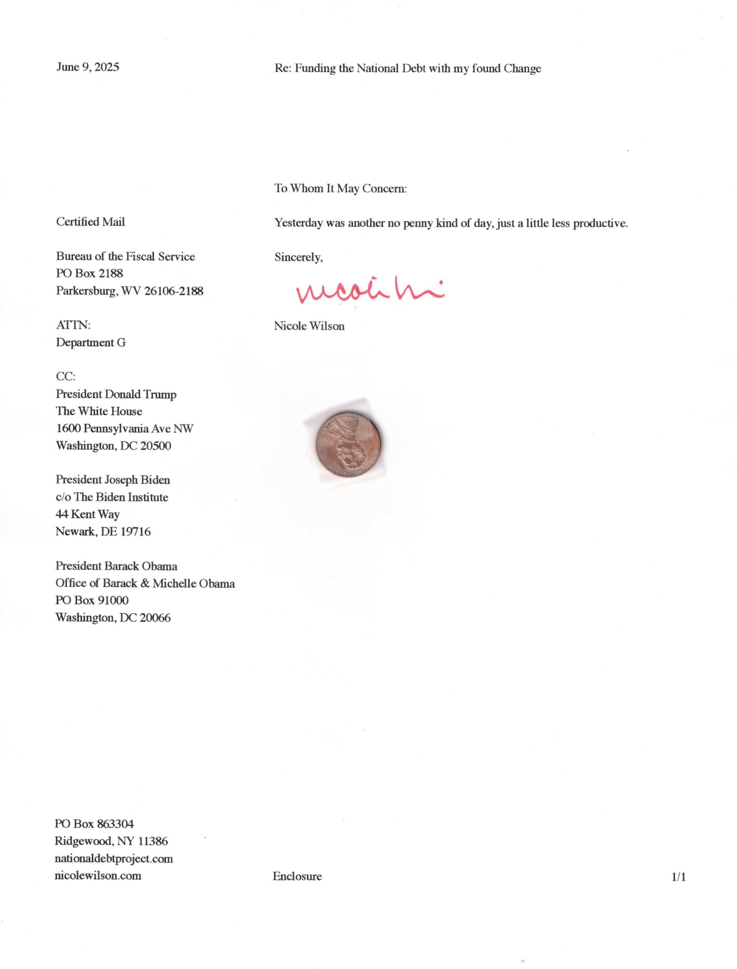 Yet, as I went through each day, I found at least one discarded penny. So, since August 31, 2009, I have sent my found change daily via certified mail to the Bureau of the Fiscal Service (previously the Bureau of the Public Debt), a sector of the Treasury Department whose purpose is to manage the deficit. If by some chance I do not find any change one day, then I send a penny of my own.