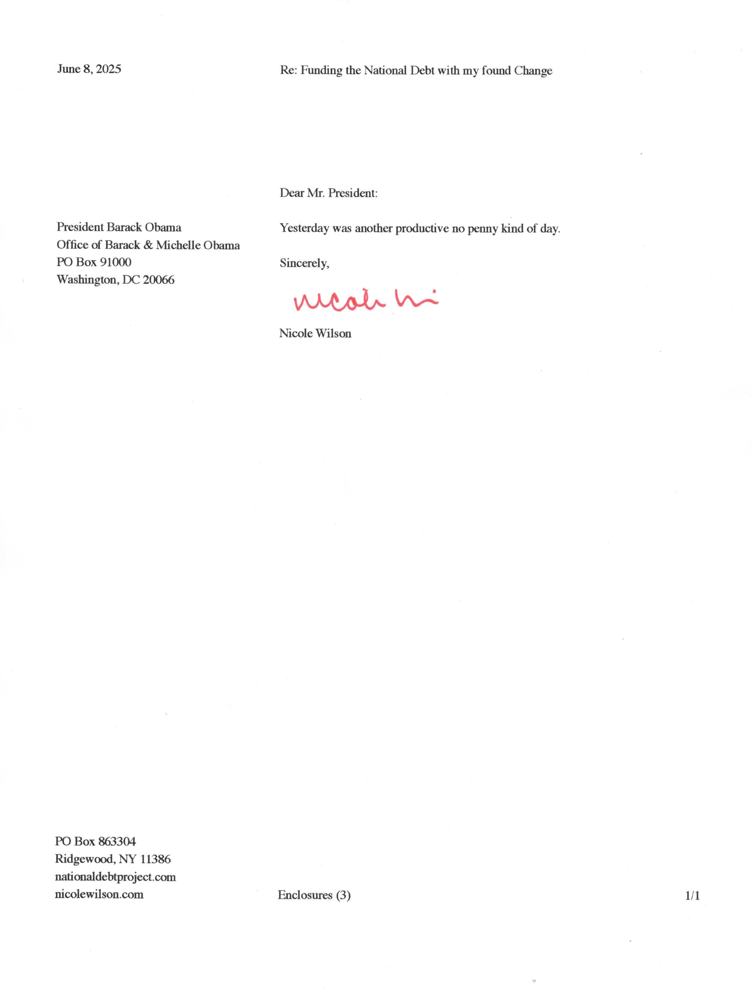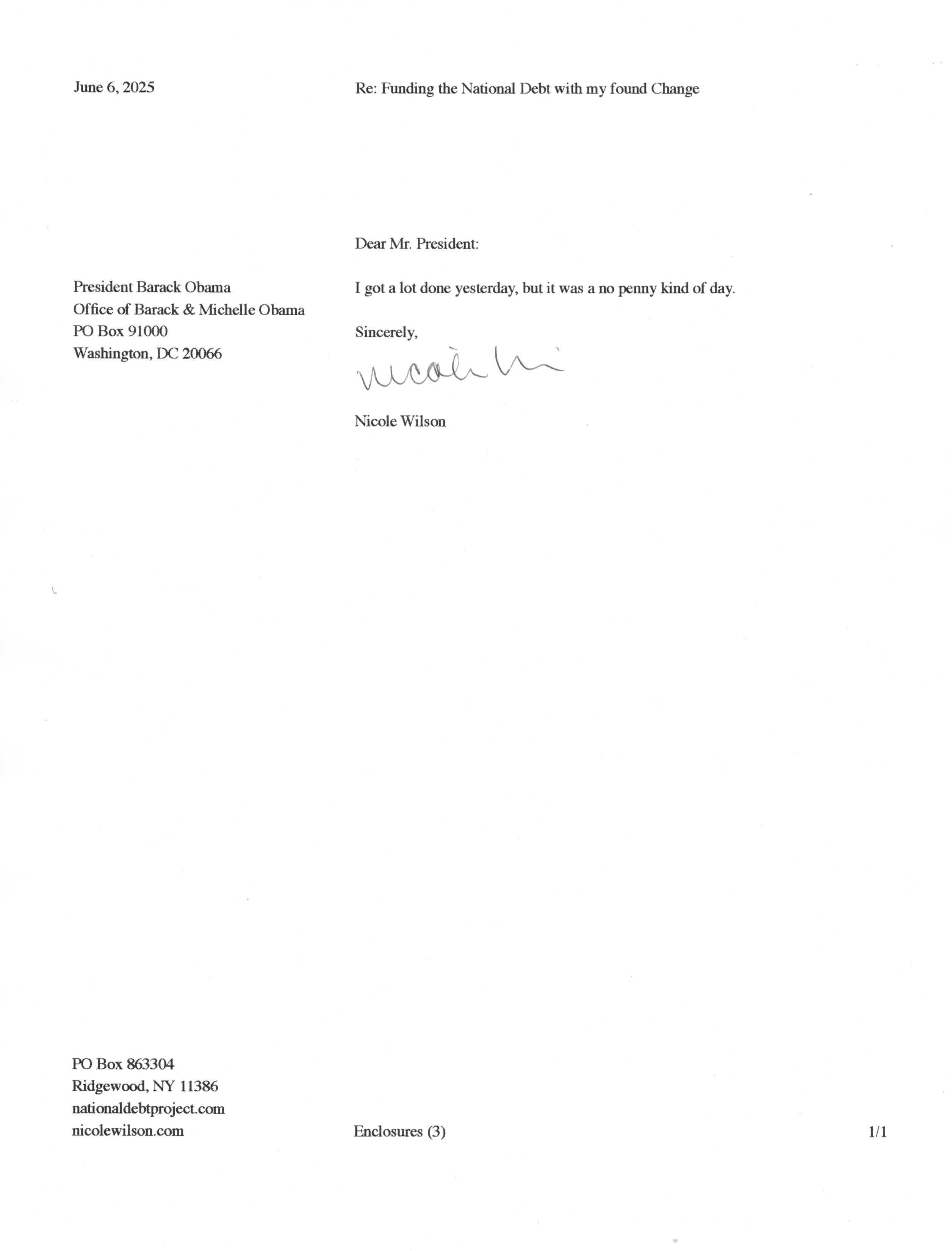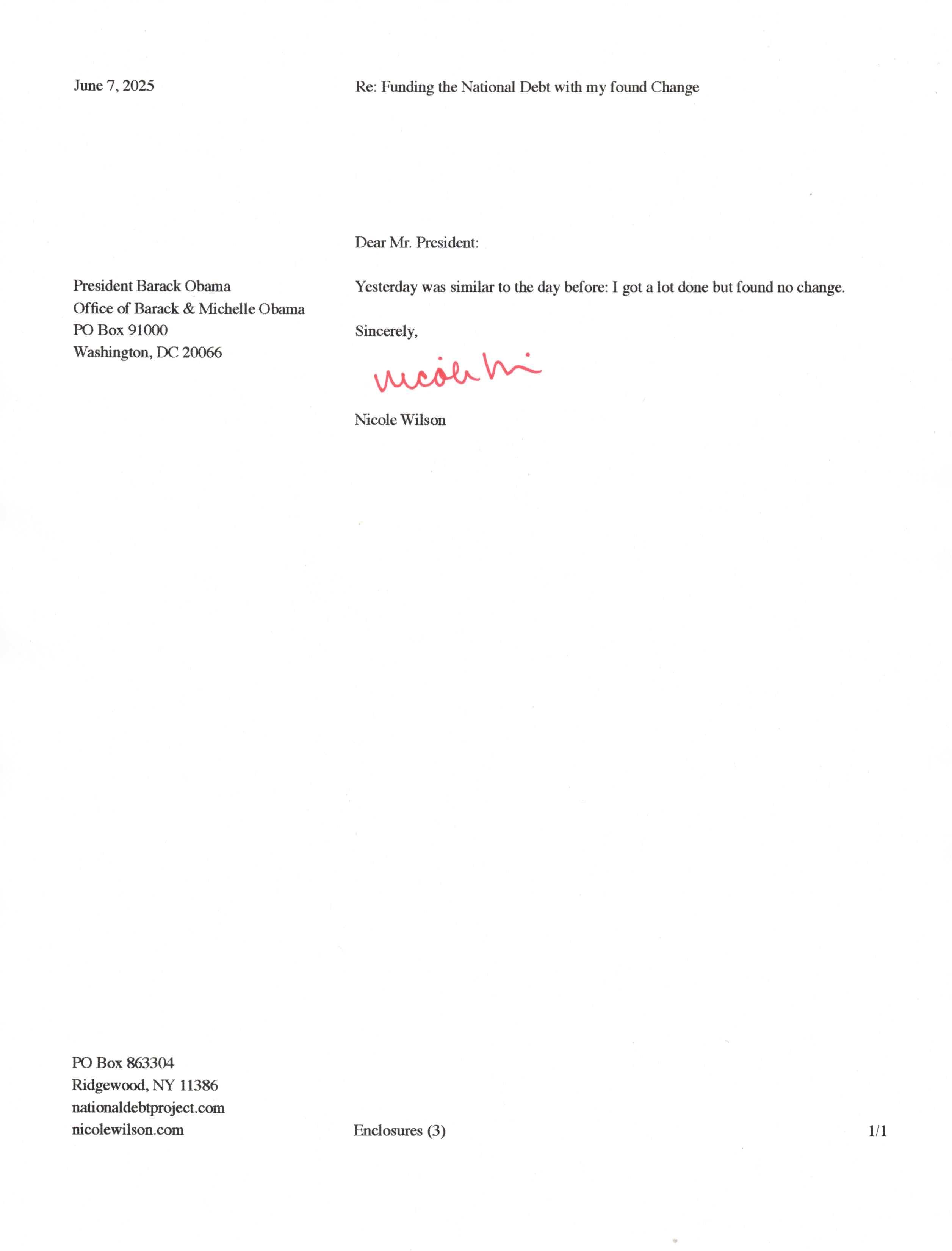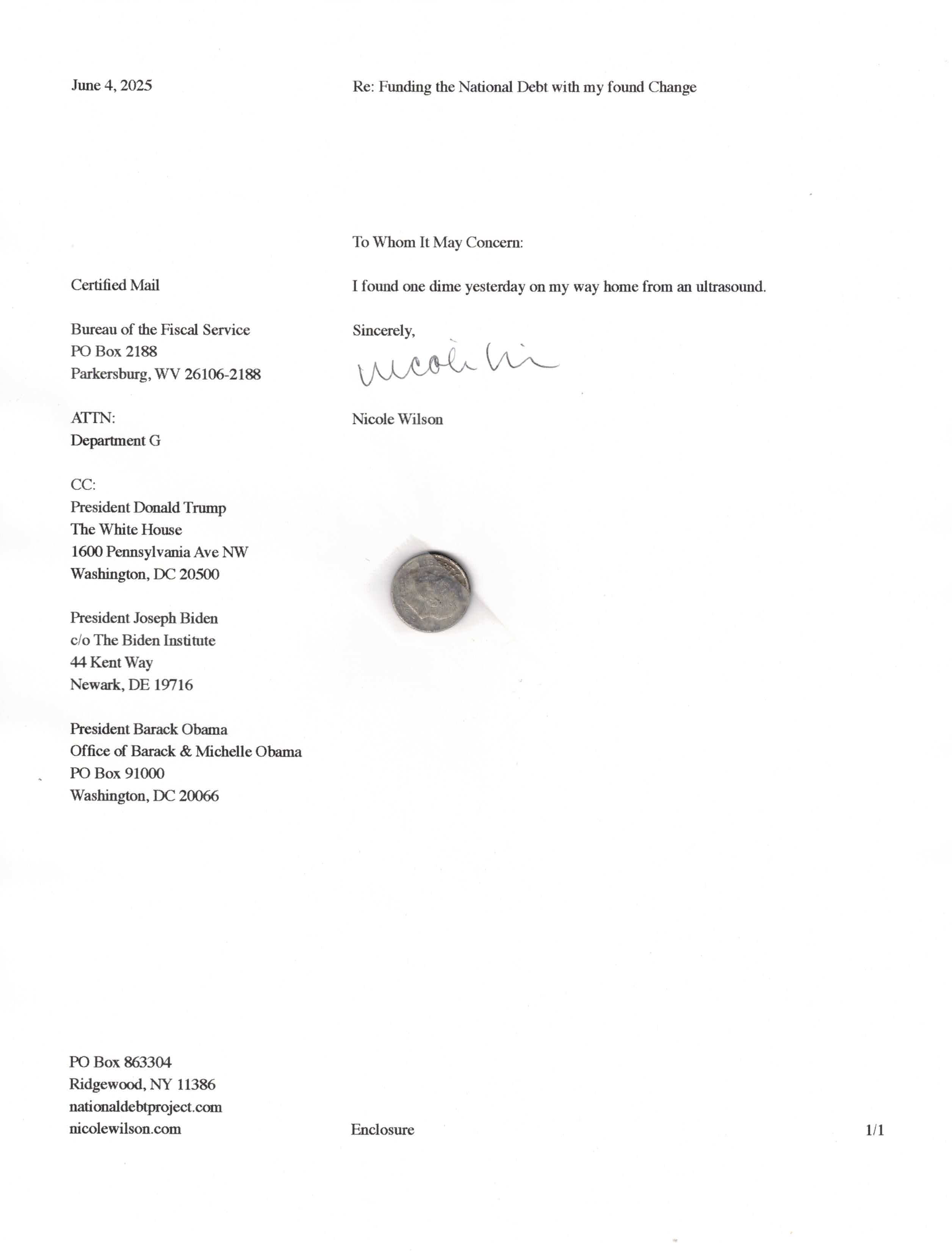 Yet, as I went through each day, I found at least one discarded penny. So, since August 31, 2009, I have sent my found change daily via certified mail to the Bureau of the Fiscal Service (previously the Bureau of the Public Debt), a sector of the Treasury Department whose purpose is to manage the deficit. If by some chance I do not find any change one day, then I send a penny of my own.