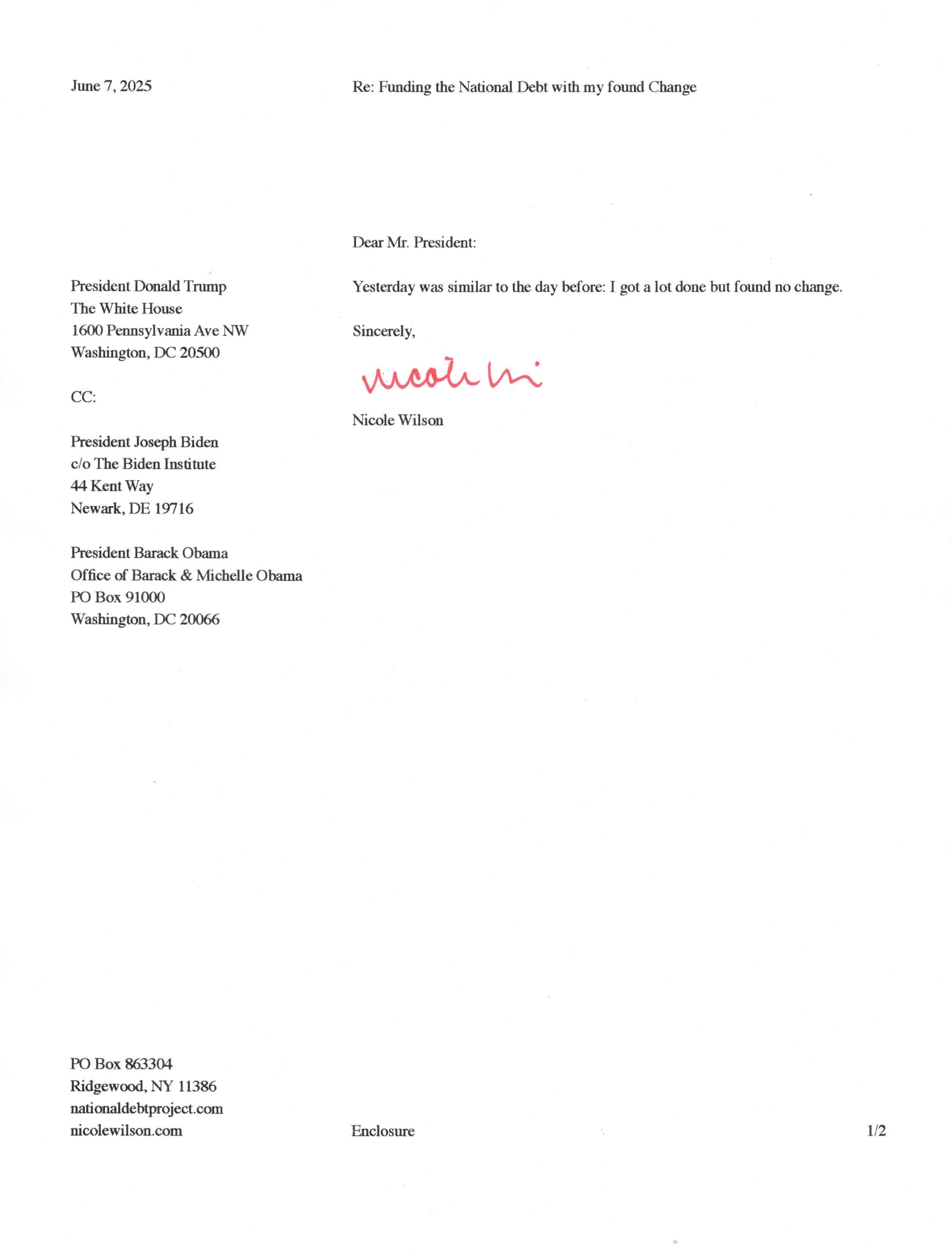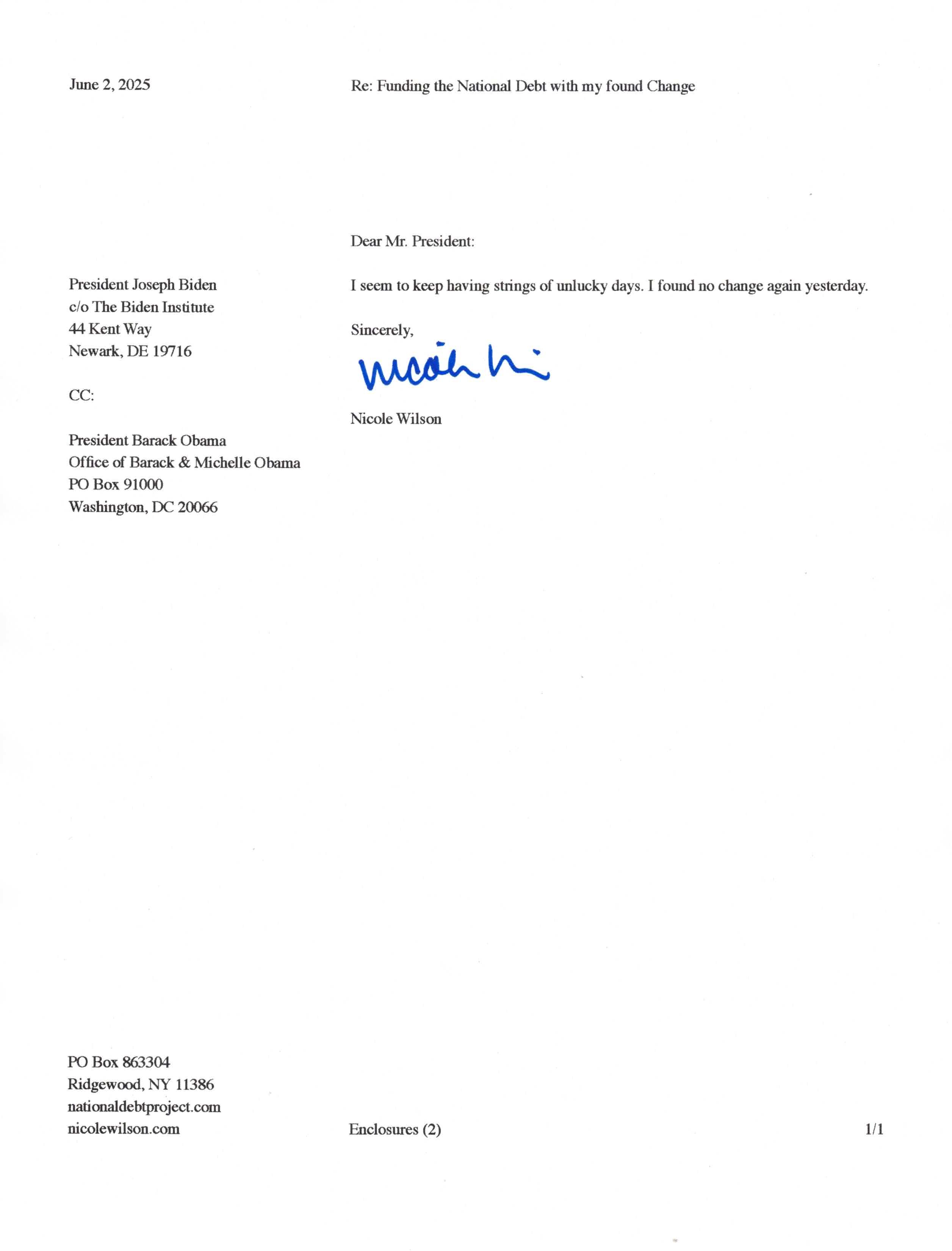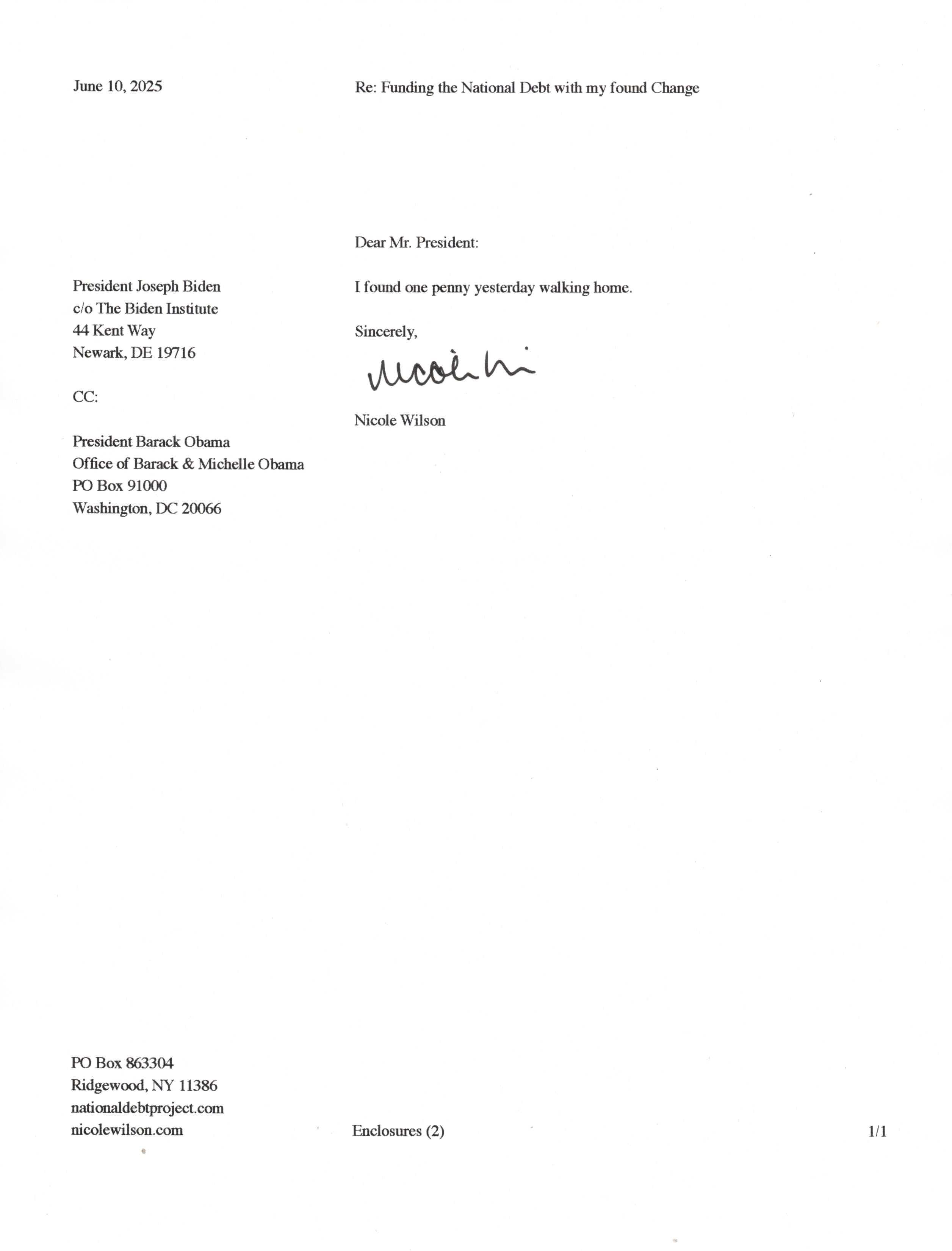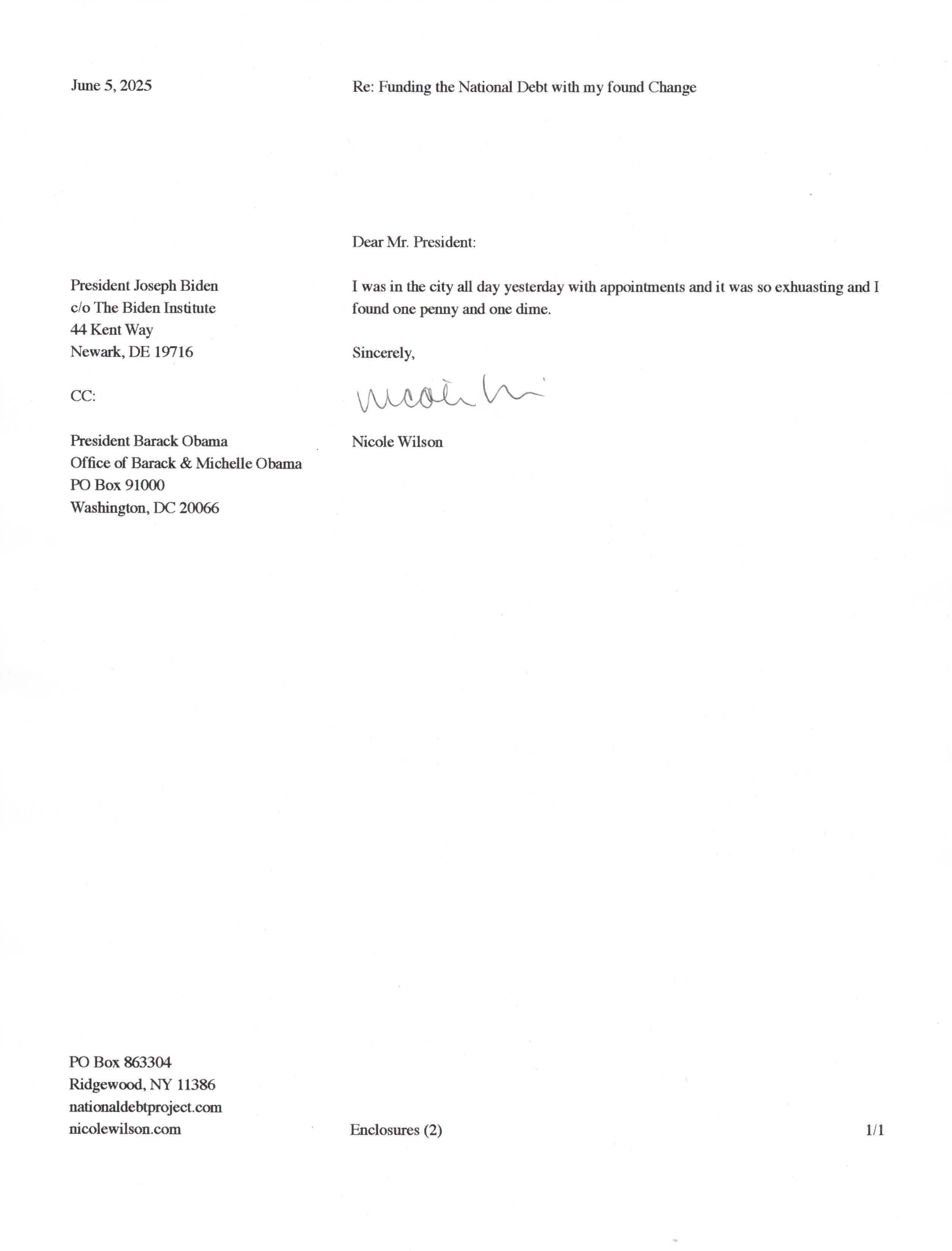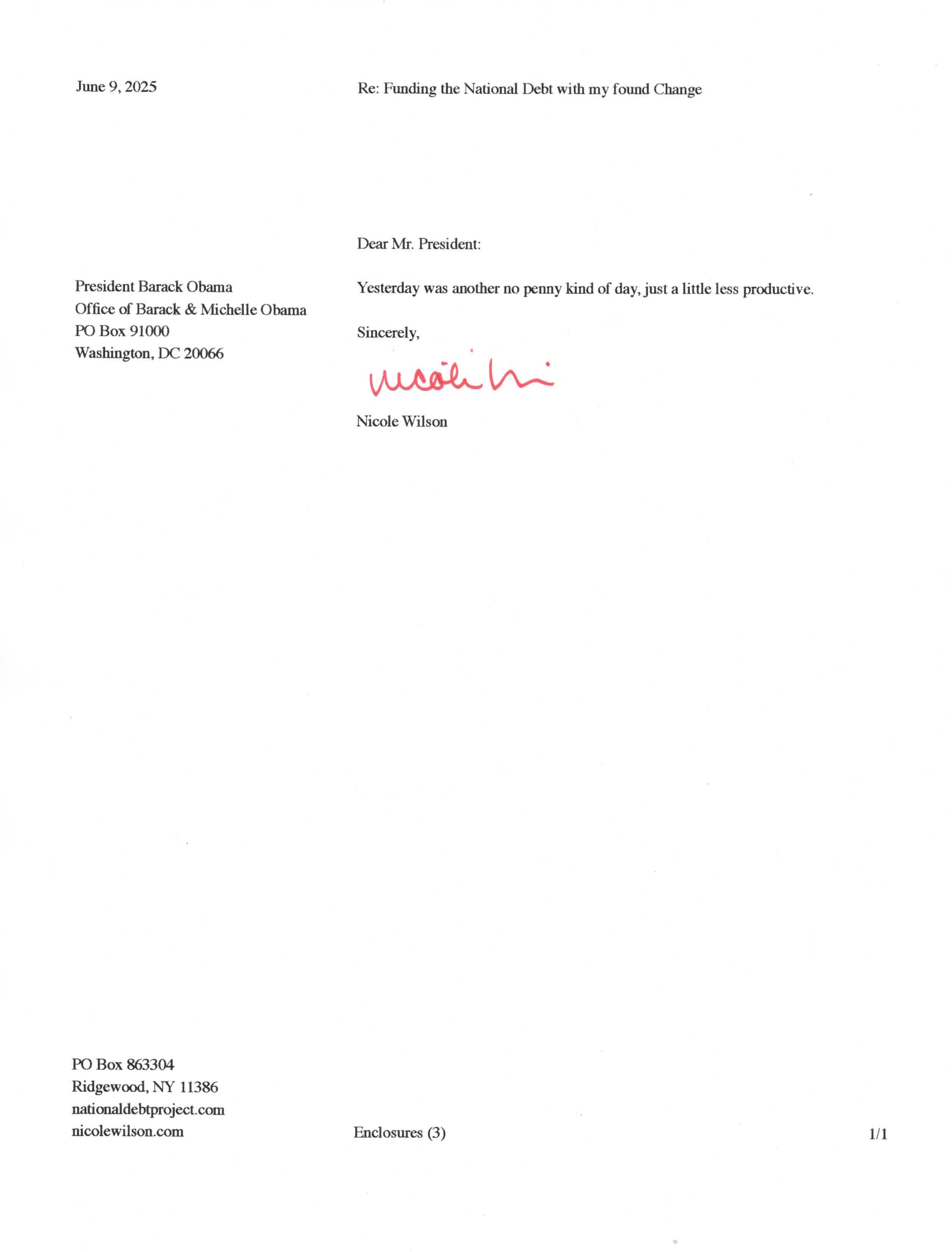 Yet, as I went through each day, I found at least one discarded penny. So, since August 31, 2009, I have sent my found change daily via certified mail to the Bureau of the Fiscal Service (previously the Bureau of the Public Debt), a sector of the Treasury Department whose purpose is to manage the deficit. If by some chance I do not find any change one day, then I send a penny of my own.