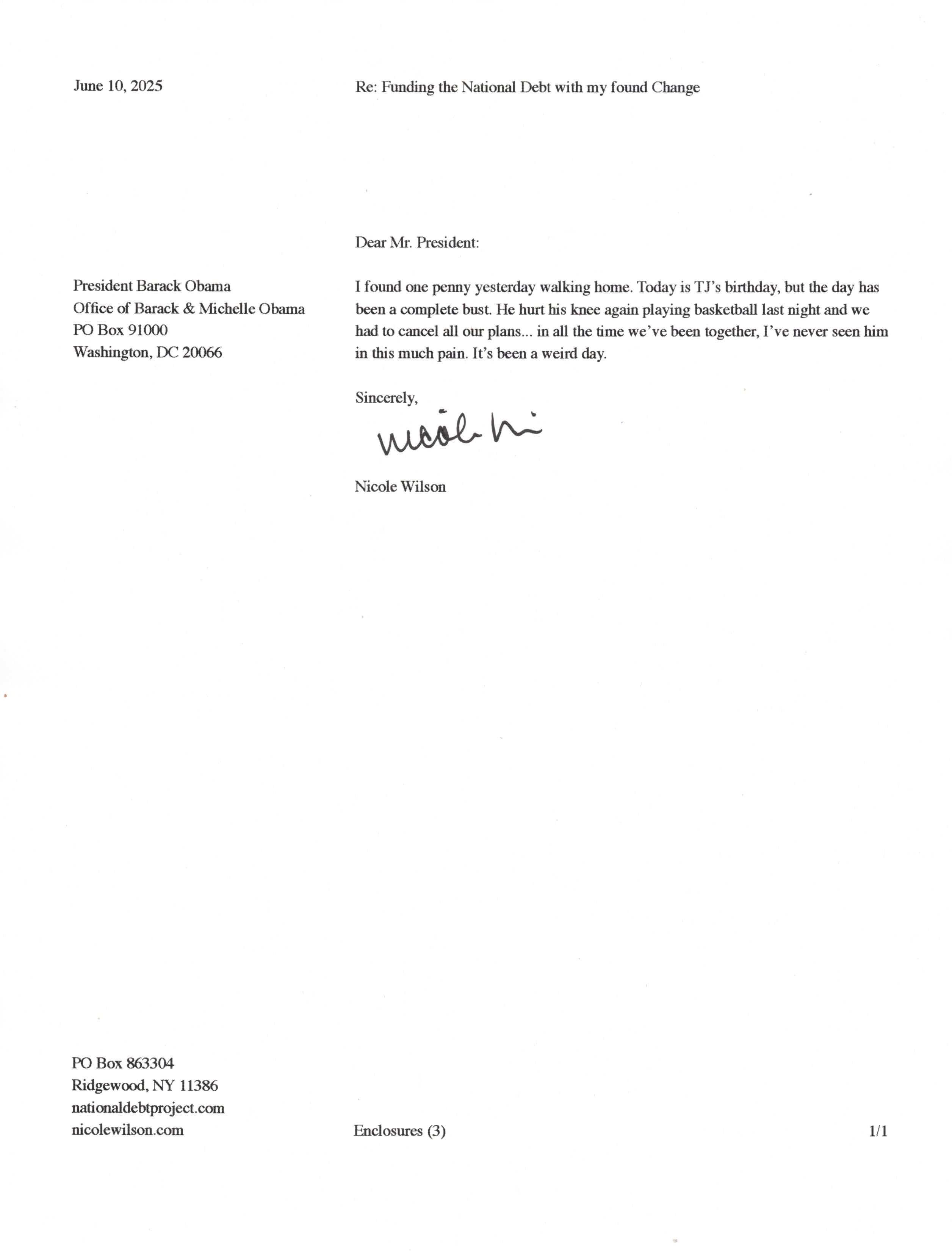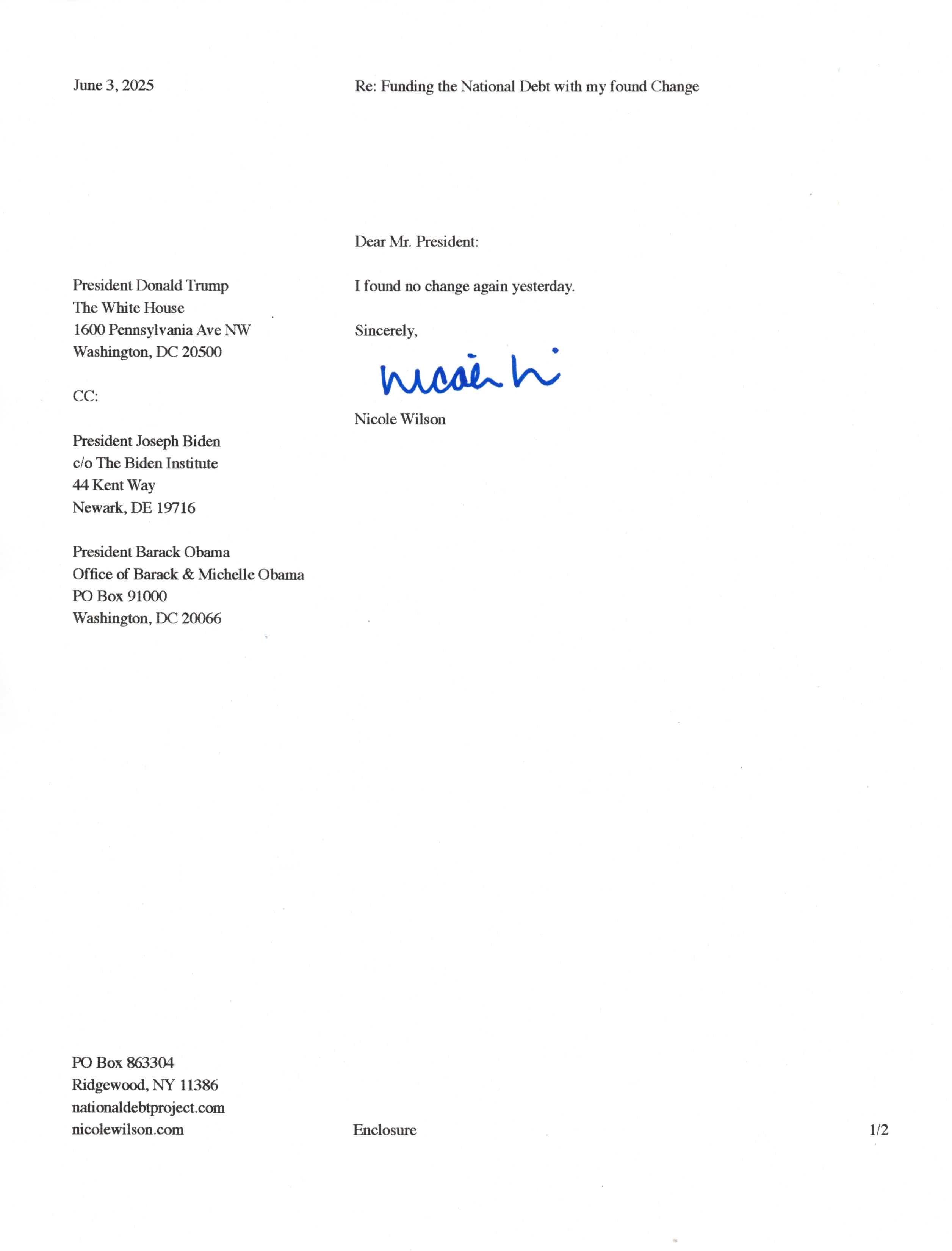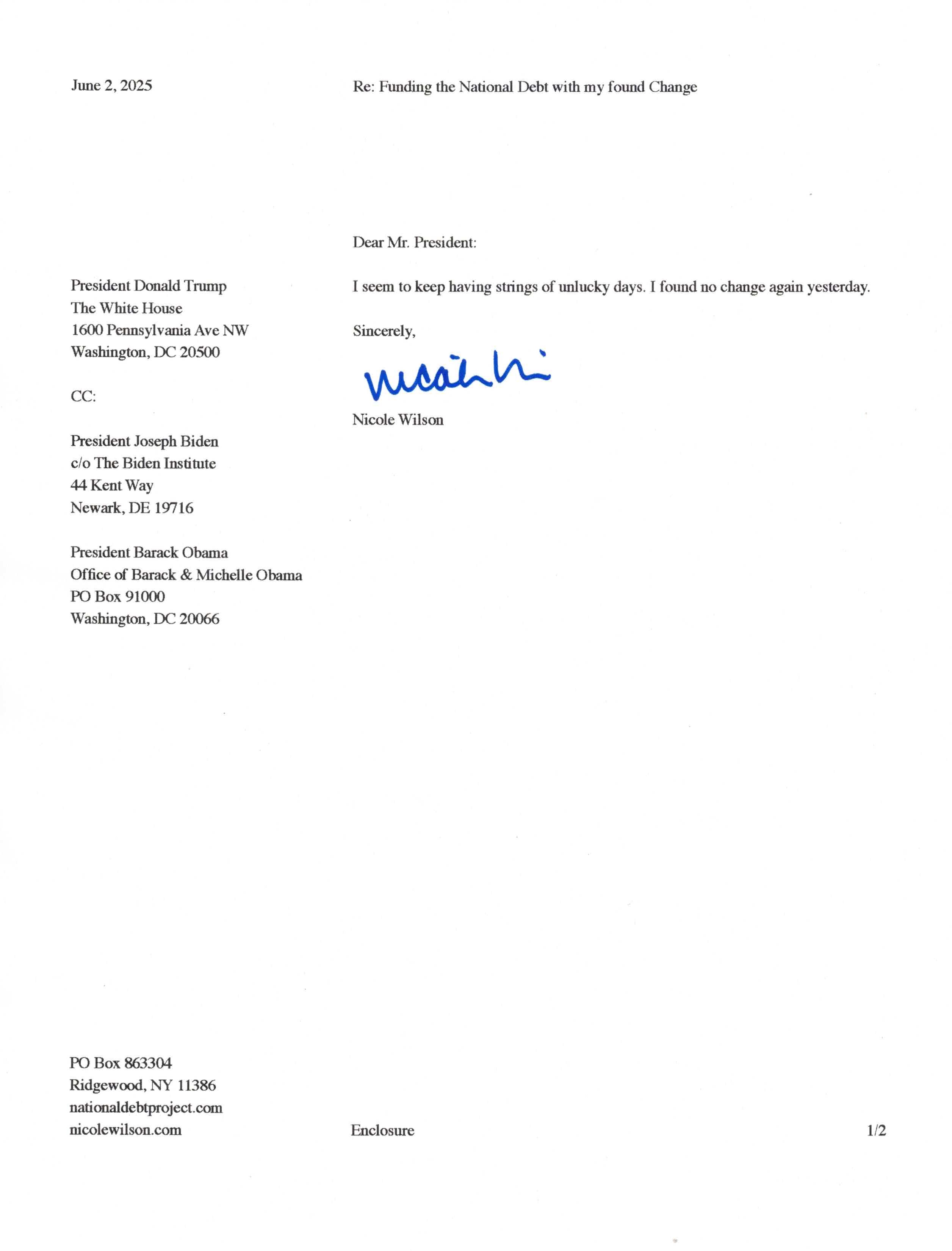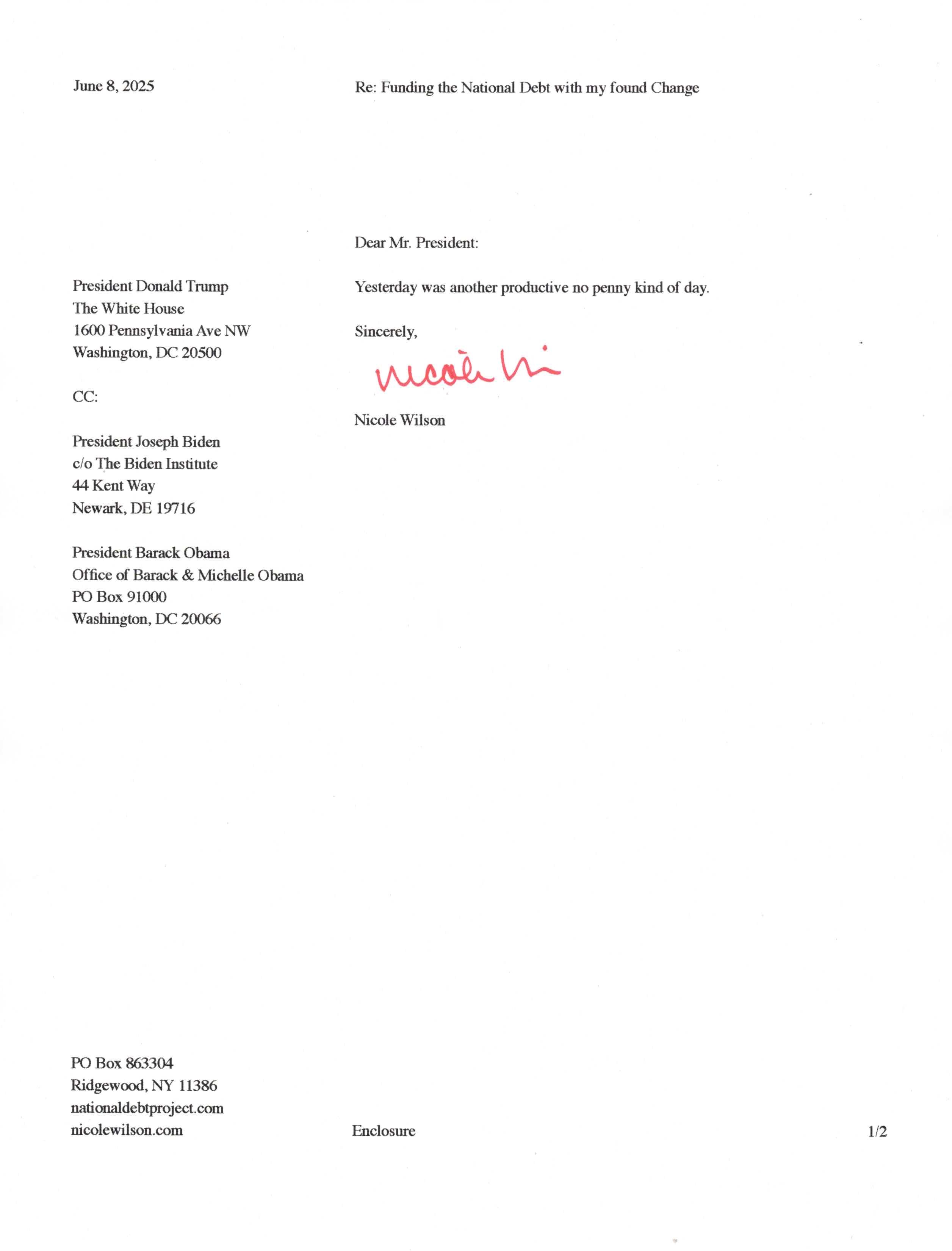 Yet, as I went through each day, I found at least one discarded penny. So, since August 31, 2009, I have sent my found change daily via certified mail to the Bureau of the Fiscal Service (previously the Bureau of the Public Debt), a sector of the Treasury Department whose purpose is to manage the deficit. If by some chance I do not find any change one day, then I send a penny of my own.