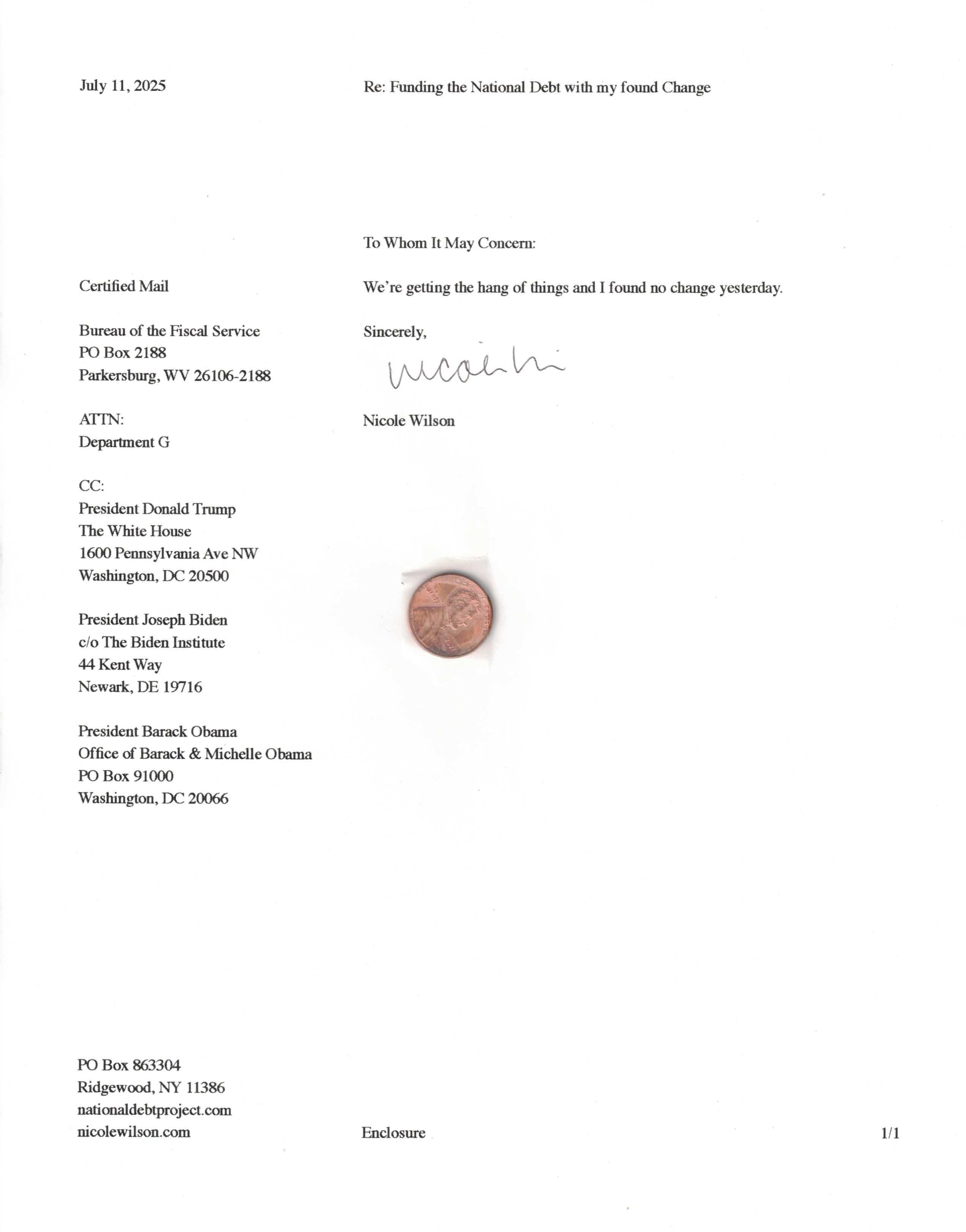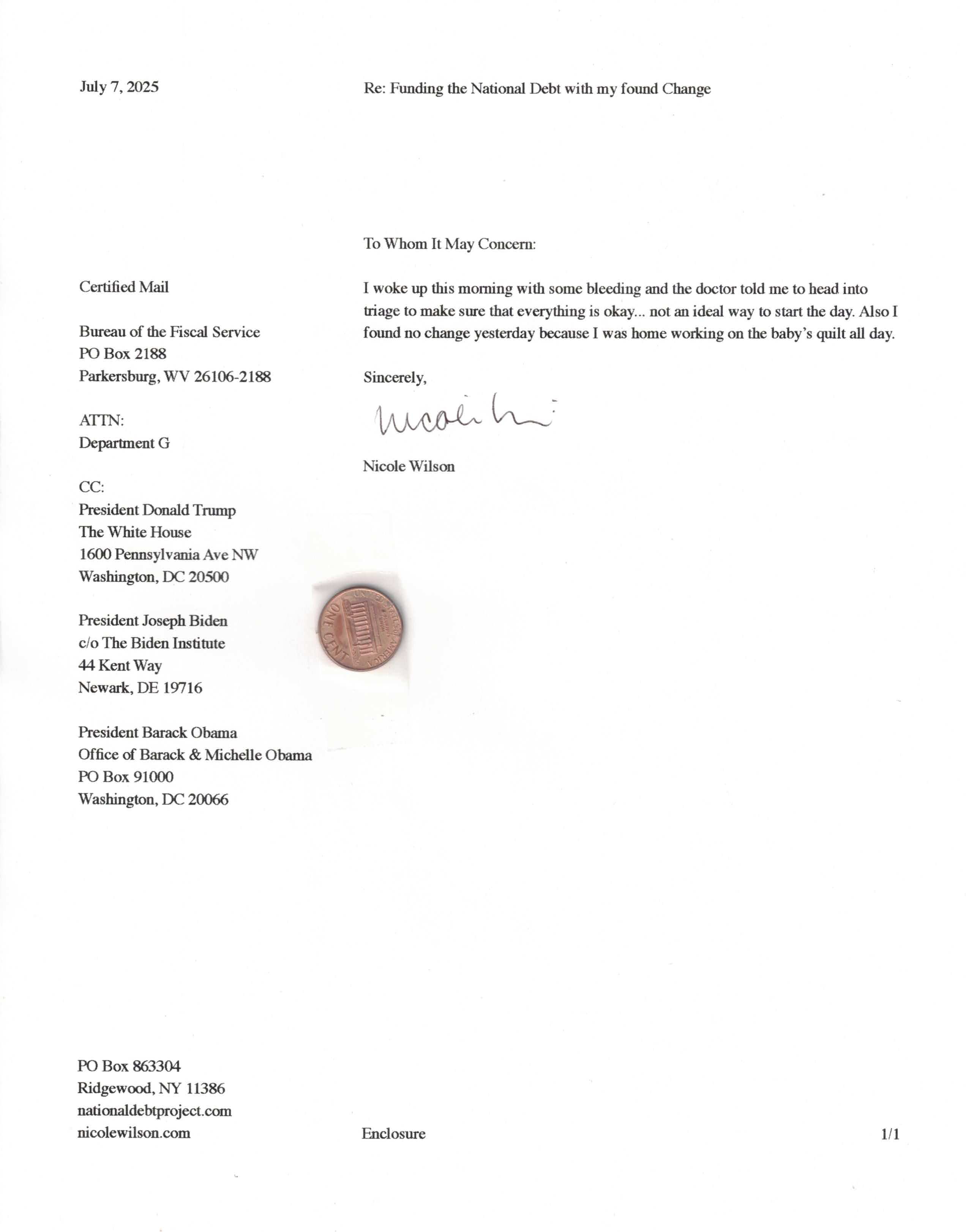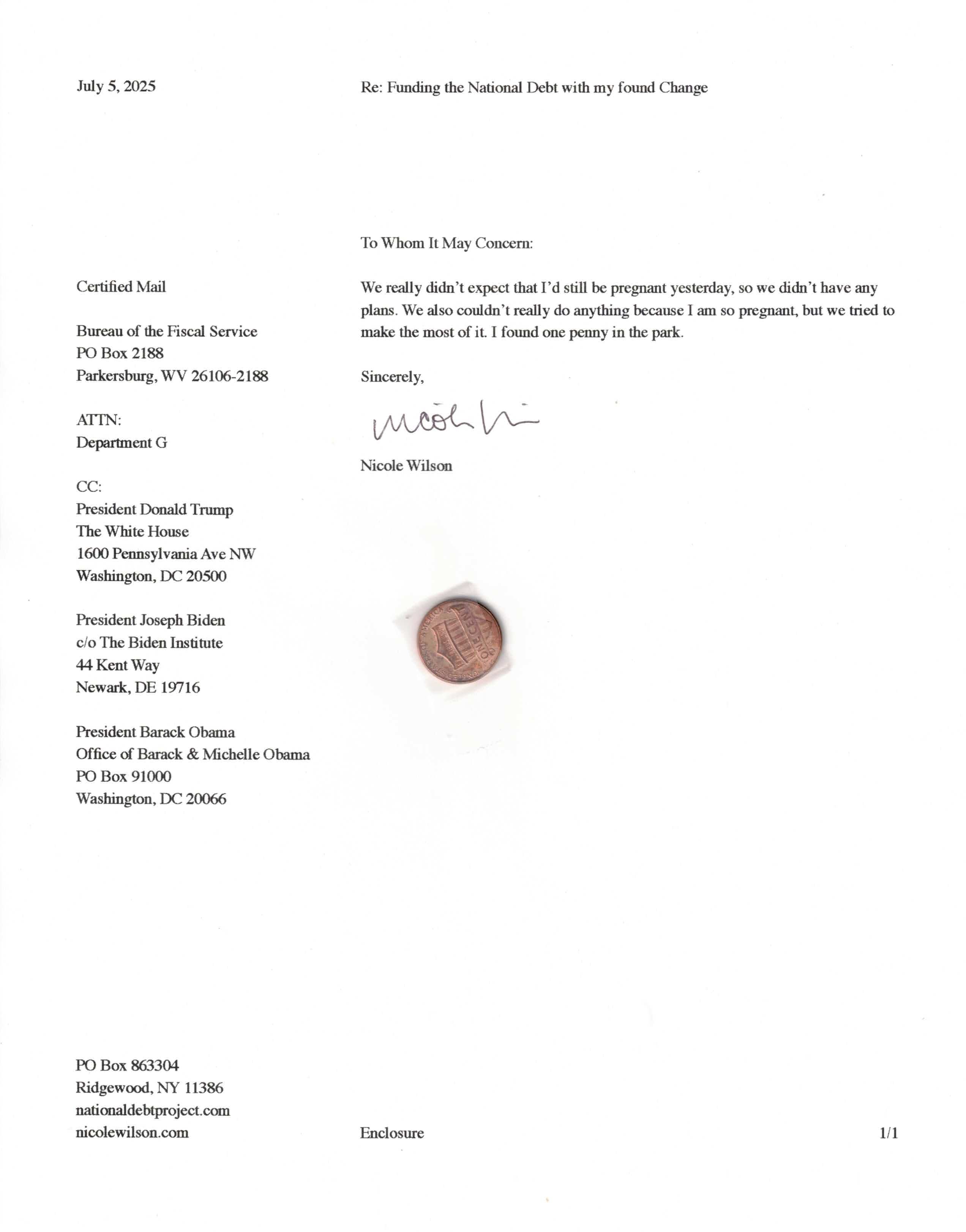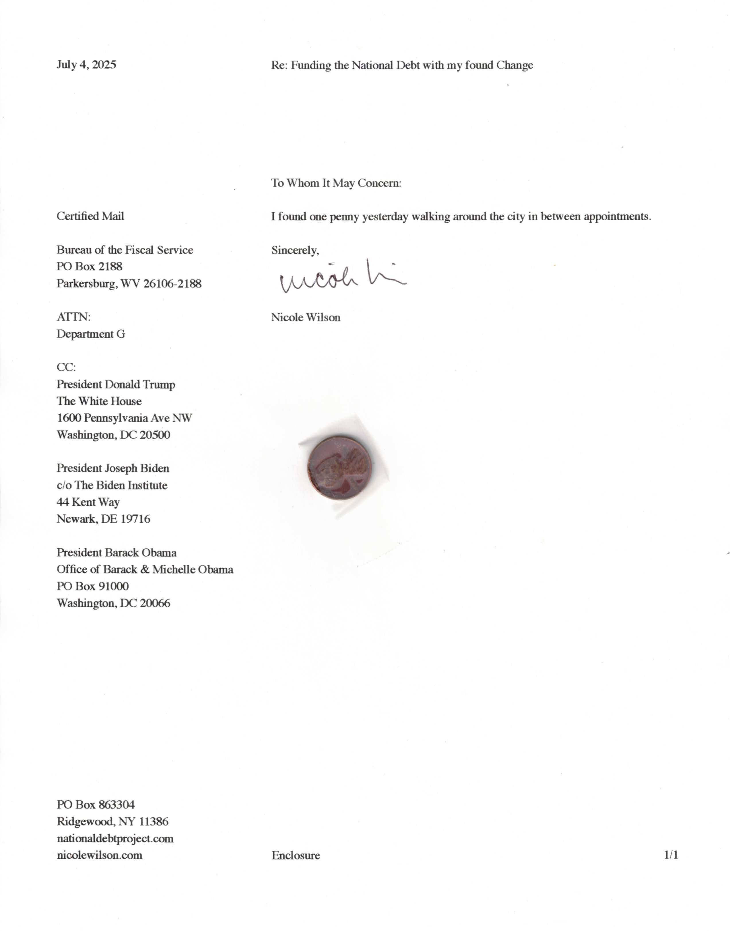 Yet, as I went through each day, I found at least one discarded penny. So, since August 31, 2009, I have sent my found change daily via certified mail to the Bureau of the Fiscal Service (previously the Bureau of the Public Debt), a sector of the Treasury Department whose purpose is to manage the deficit. If by some chance I do not find any change one day, then I send a penny of my own.