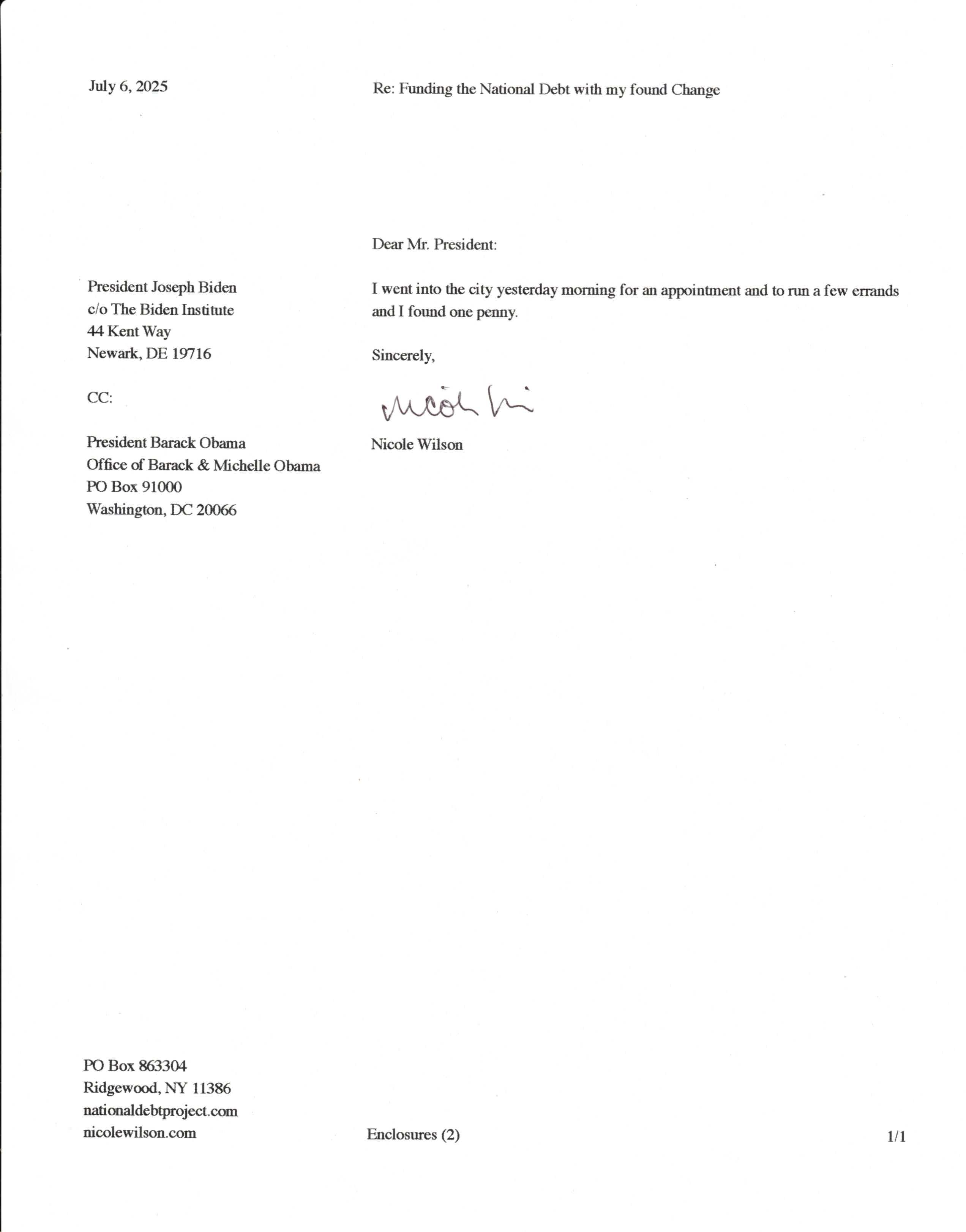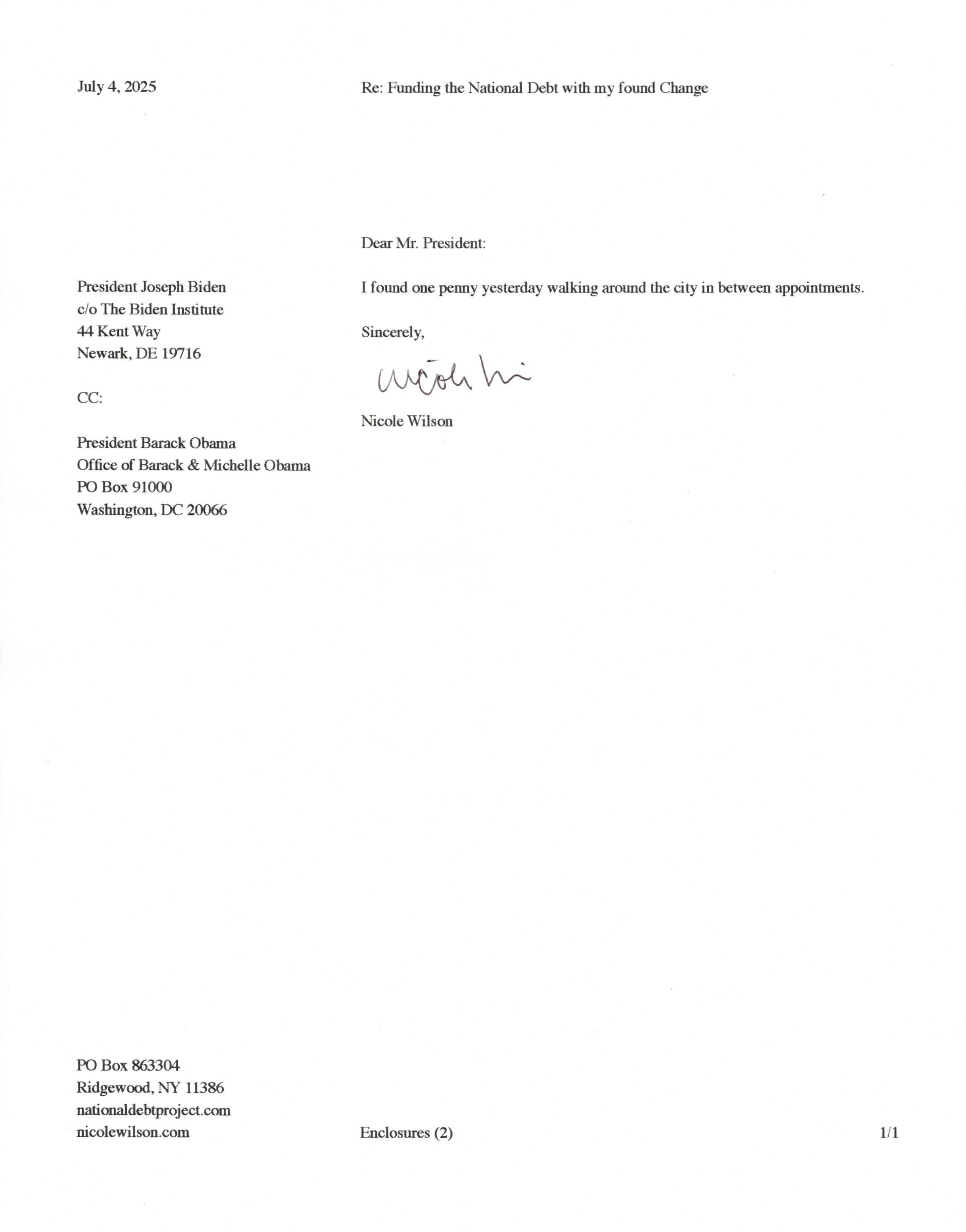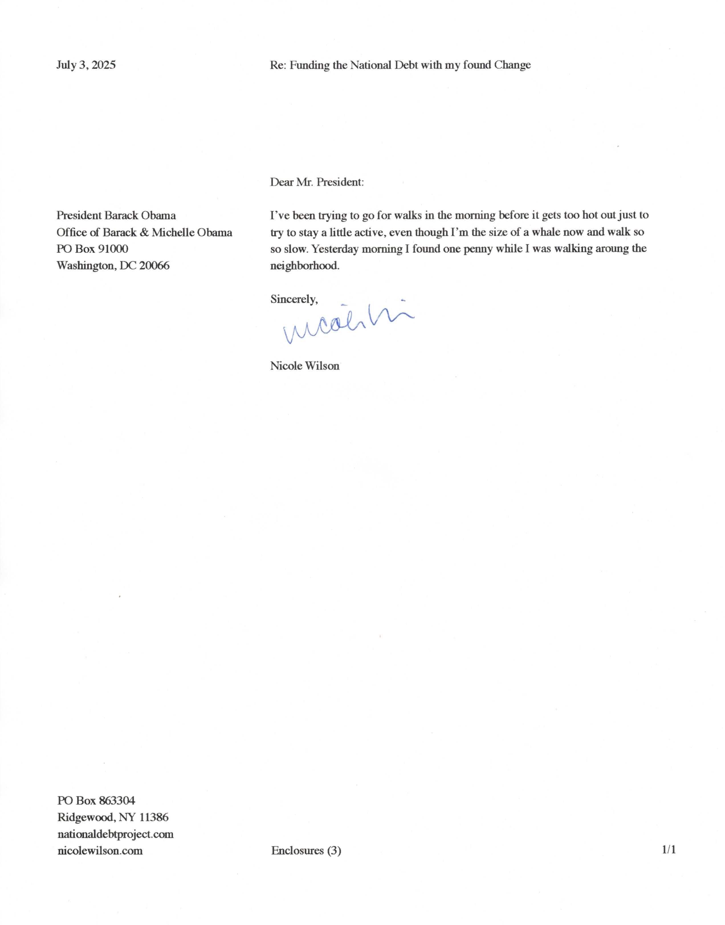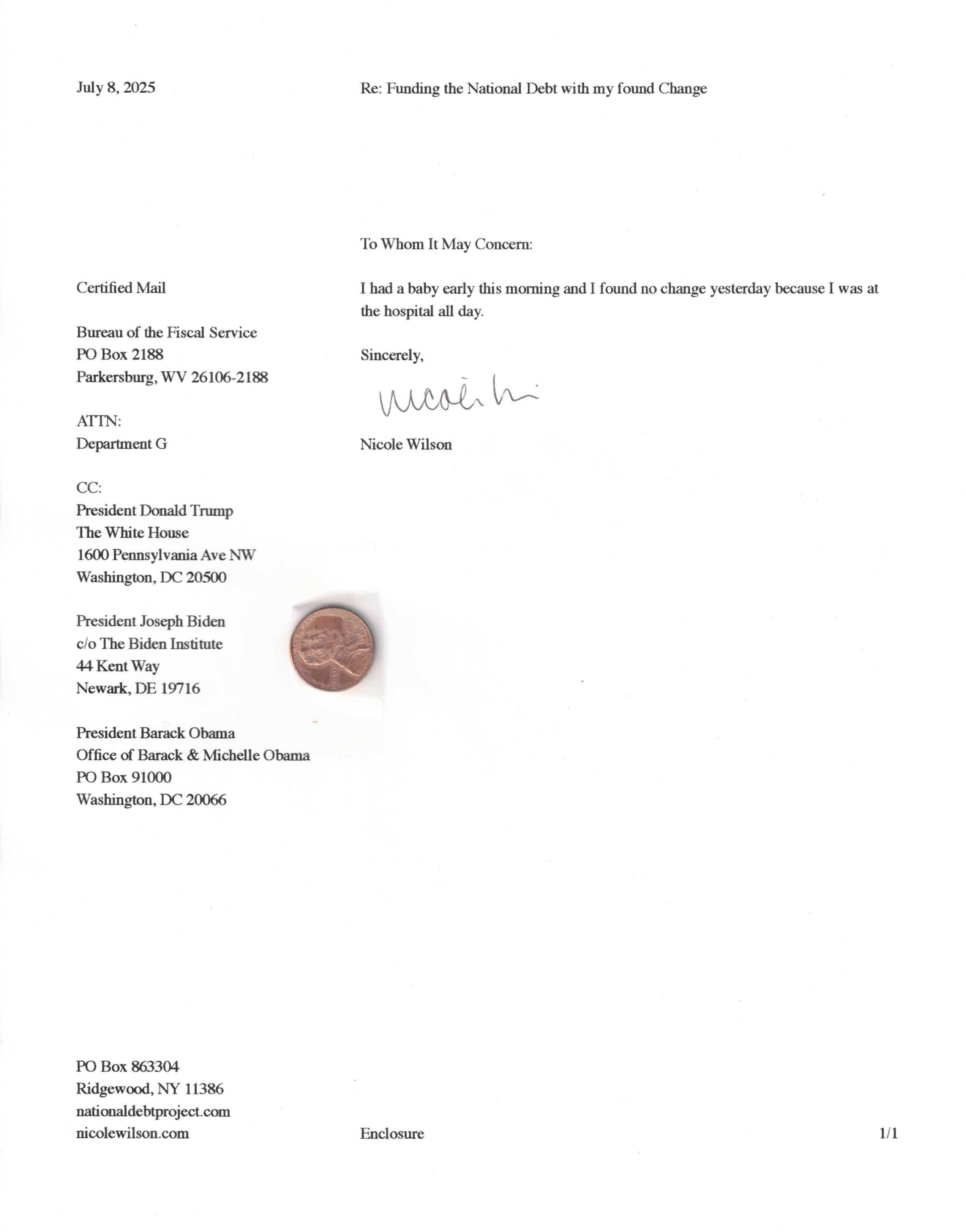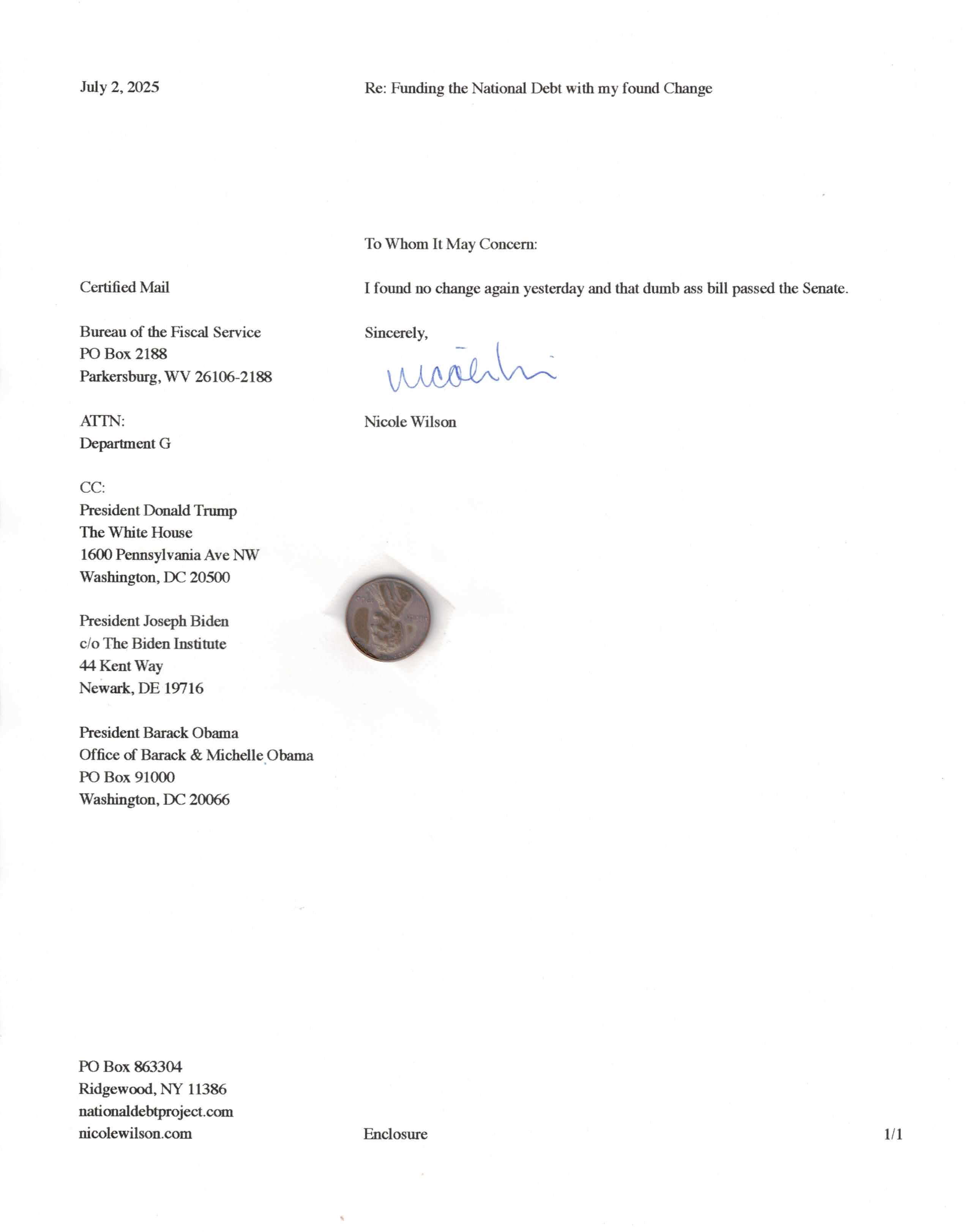 Yet, as I went through each day, I found at least one discarded penny. So, since August 31, 2009, I have sent my found change daily via certified mail to the Bureau of the Fiscal Service (previously the Bureau of the Public Debt), a sector of the Treasury Department whose purpose is to manage the deficit. If by some chance I do not find any change one day, then I send a penny of my own.