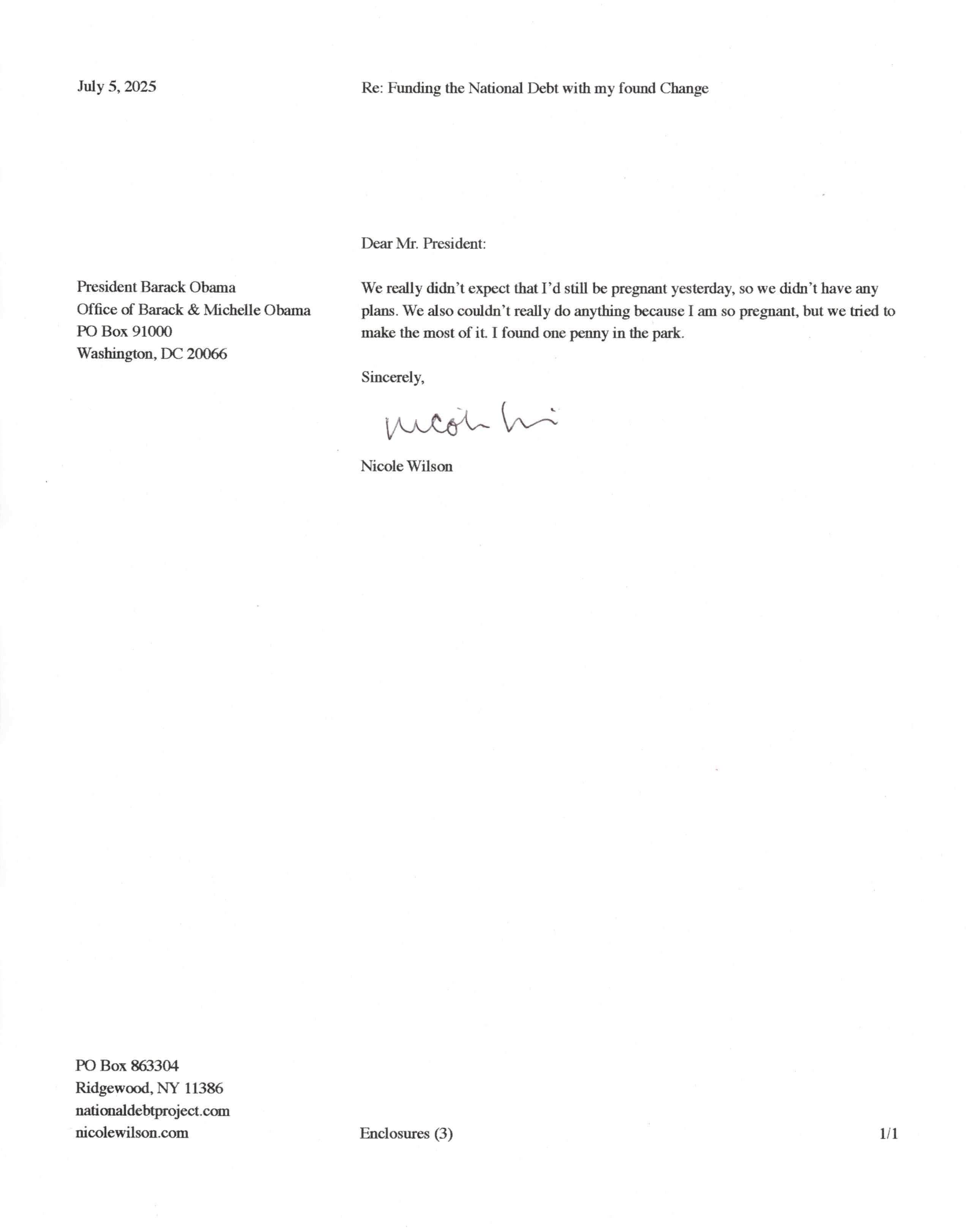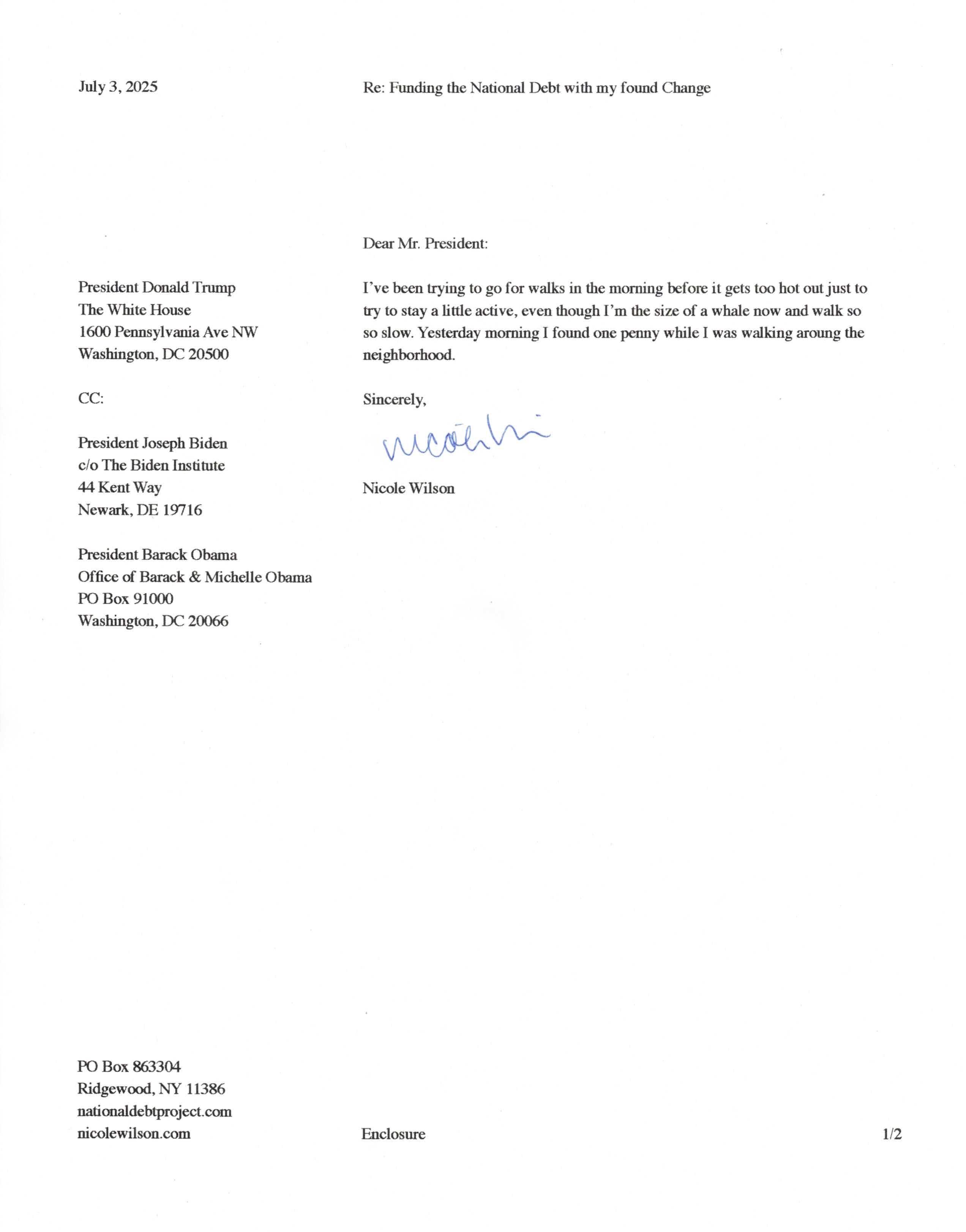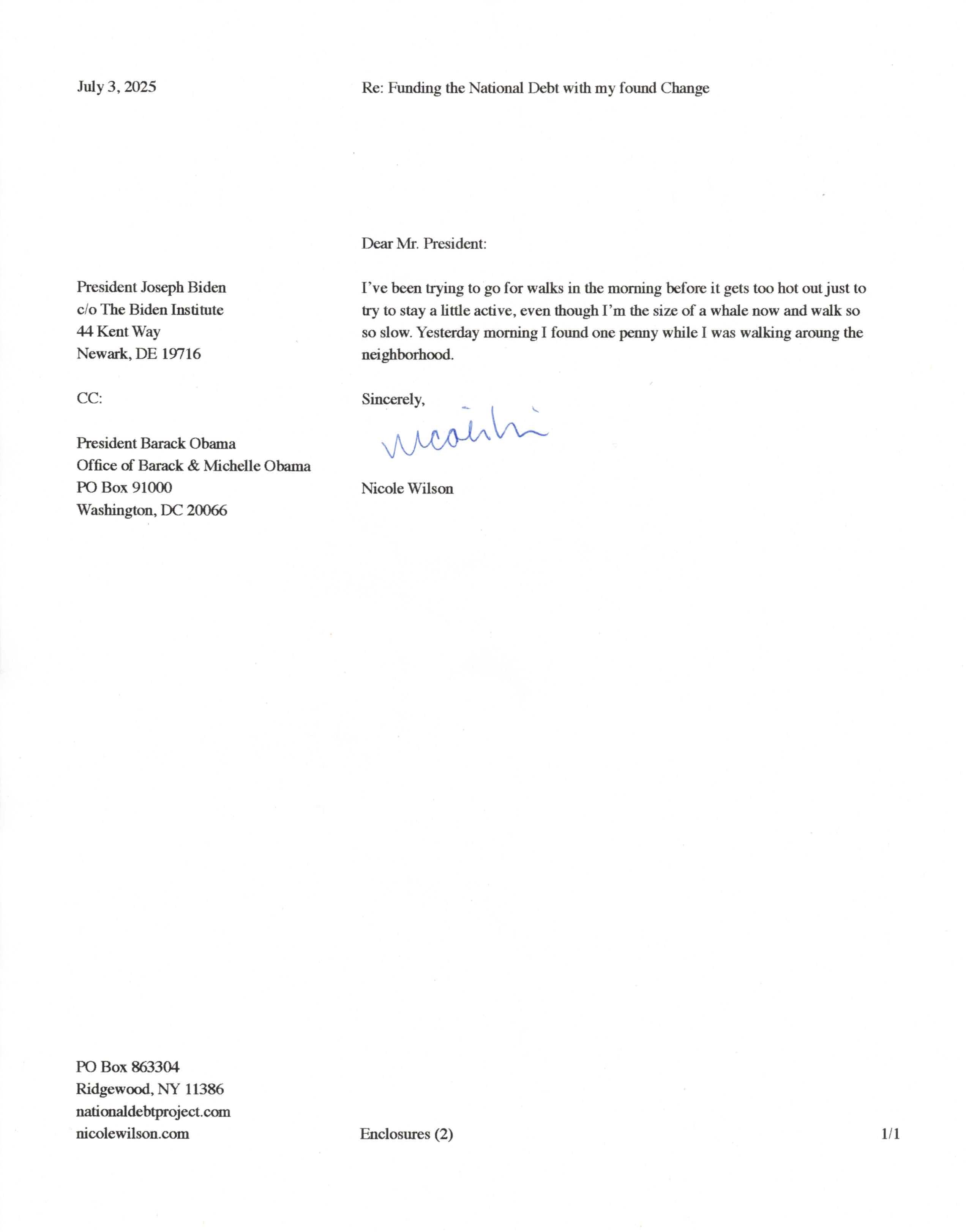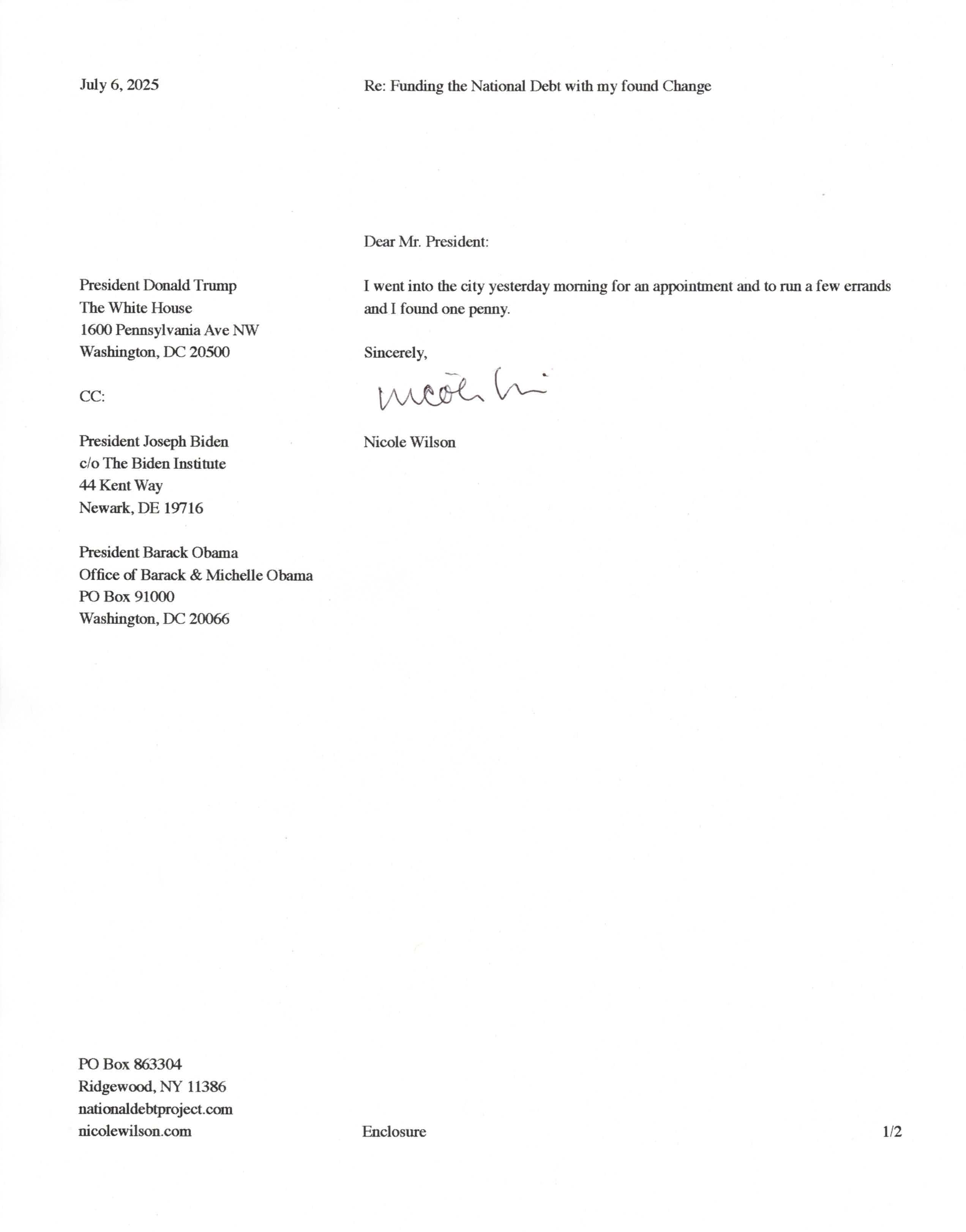 Yet, as I went through each day, I found at least one discarded penny. So, since August 31, 2009, I have sent my found change daily via certified mail to the Bureau of the Fiscal Service (previously the Bureau of the Public Debt), a sector of the Treasury Department whose purpose is to manage the deficit. If by some chance I do not find any change one day, then I send a penny of my own.