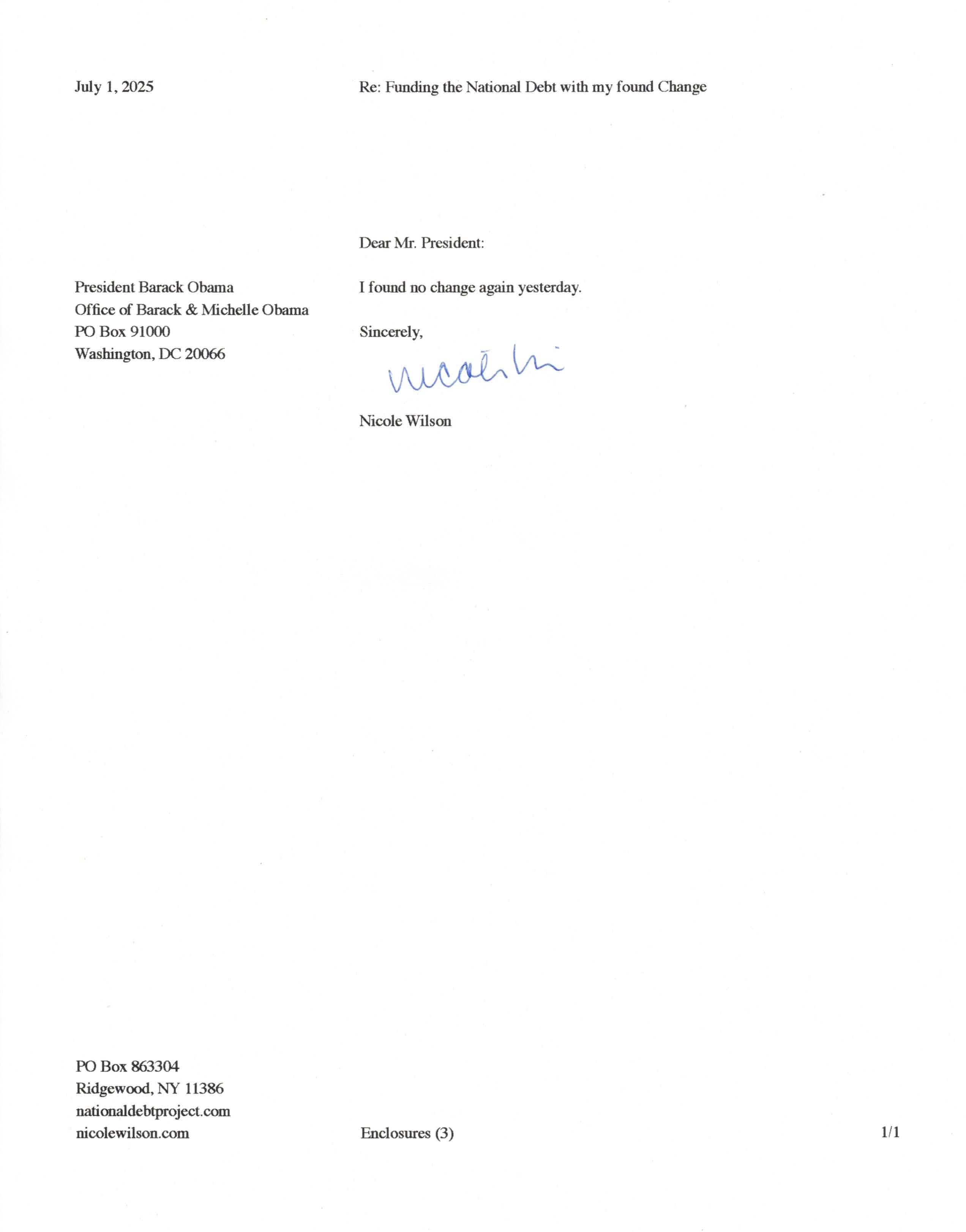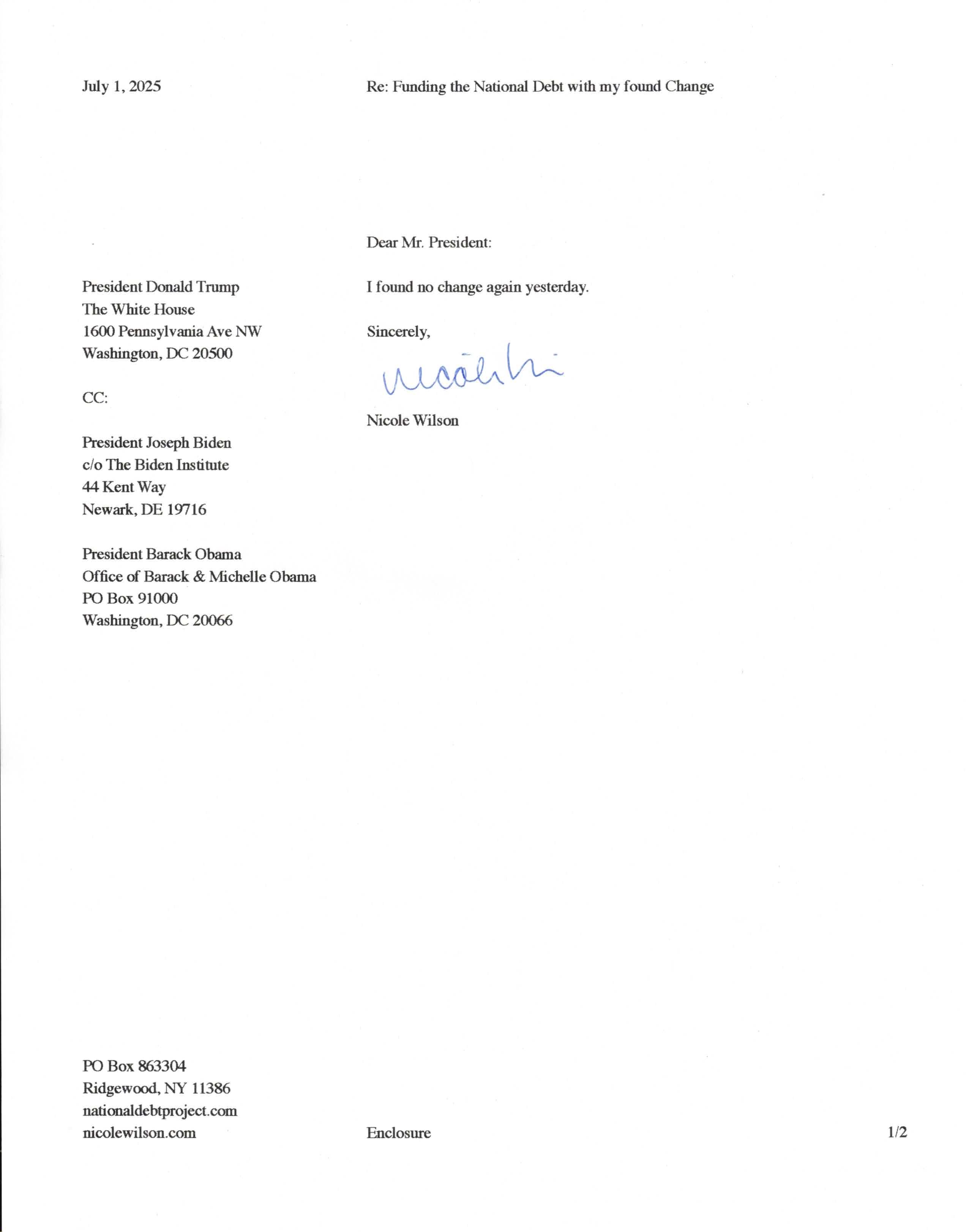 Yet, as I went through each day, I found at least one discarded penny. So, since August 31, 2009, I have sent my found change daily via certified mail to the Bureau of the Fiscal Service (previously the Bureau of the Public Debt), a sector of the Treasury Department whose purpose is to manage the deficit. If by some chance I do not find any change one day, then I send a penny of my own.
