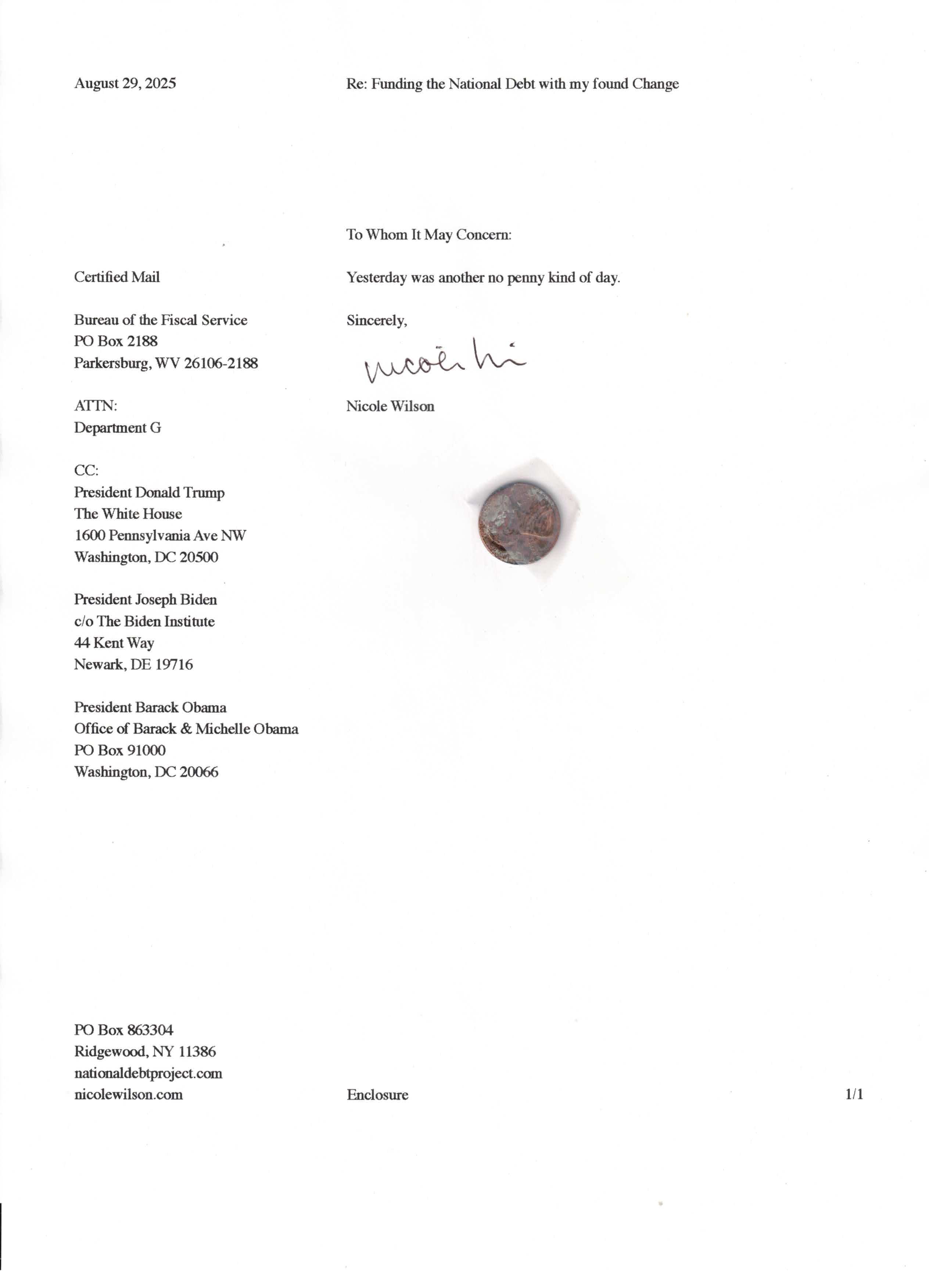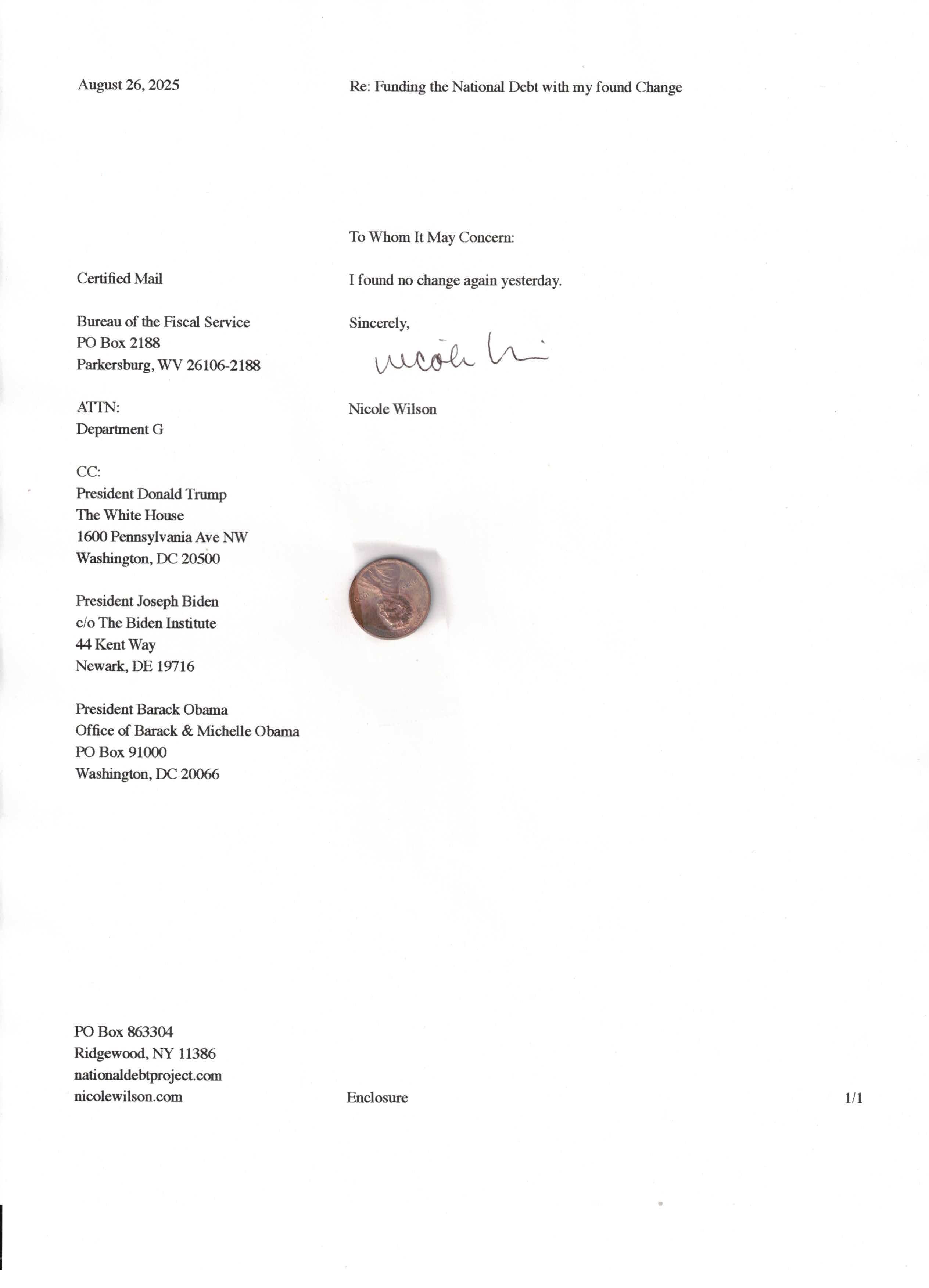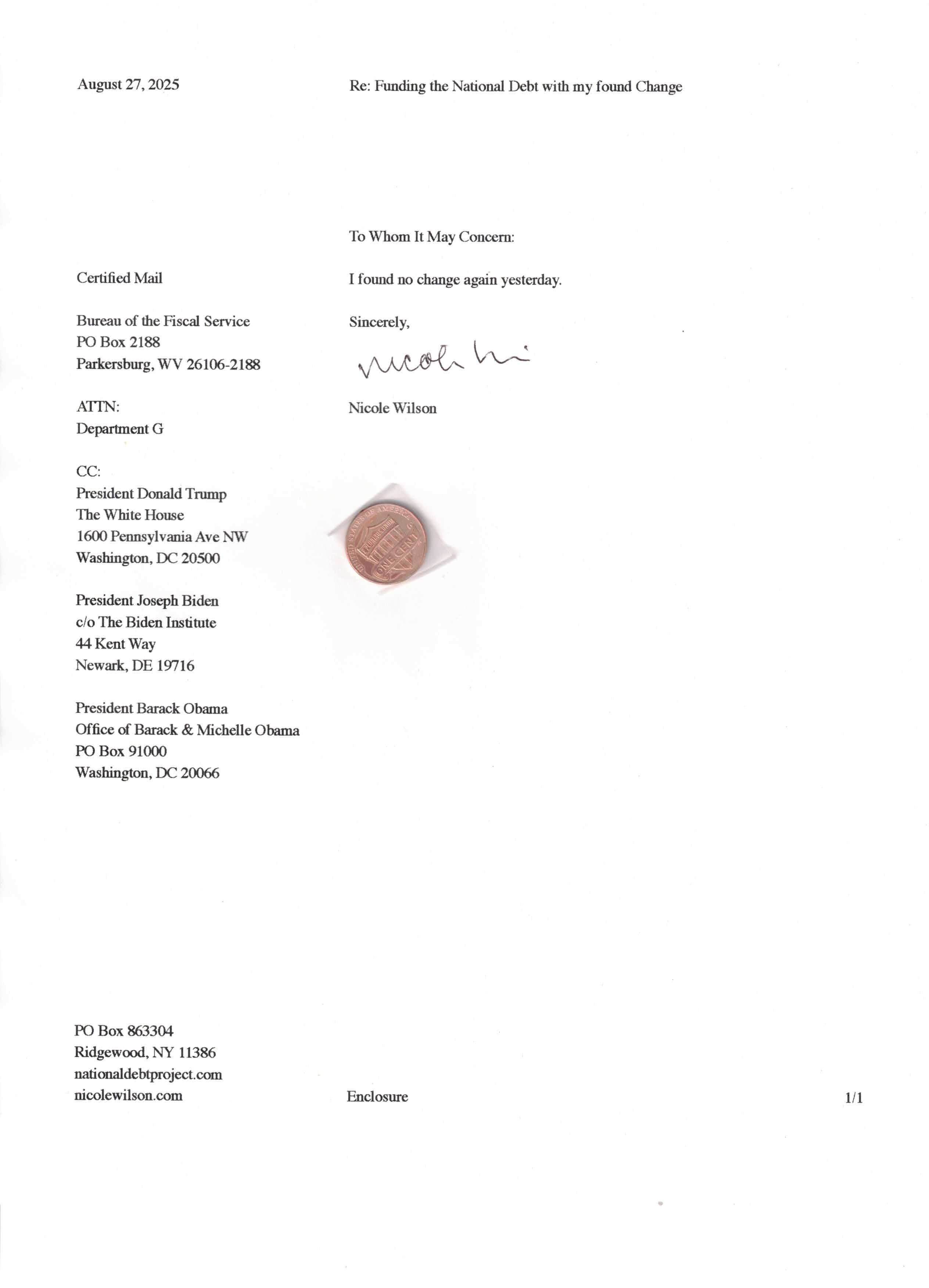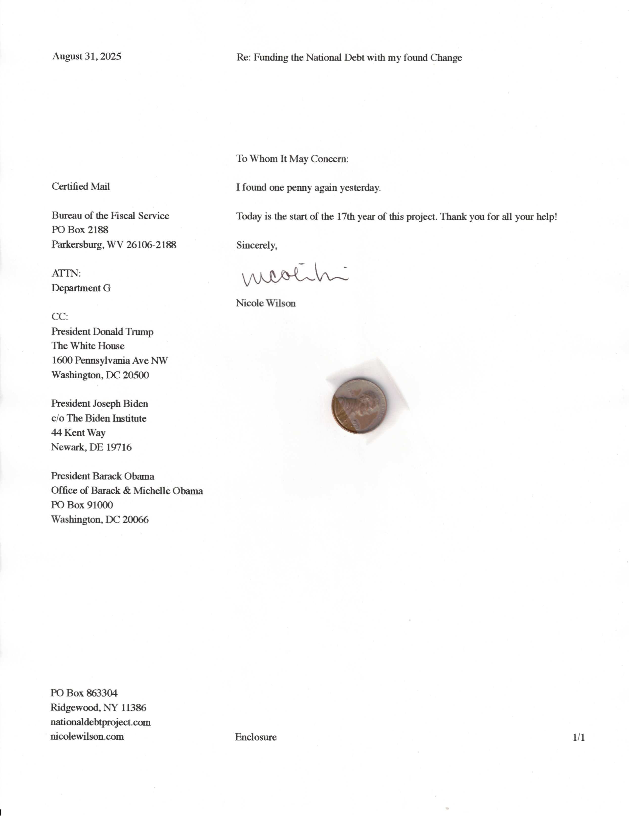 Yet, as I went through each day, I found at least one discarded penny. So, since August 31, 2009, I have sent my found change daily via certified mail to the Bureau of the Fiscal Service (previously the Bureau of the Public Debt), a sector of the Treasury Department whose purpose is to manage the deficit. If by some chance I do not find any change one day, then I send a penny of my own.