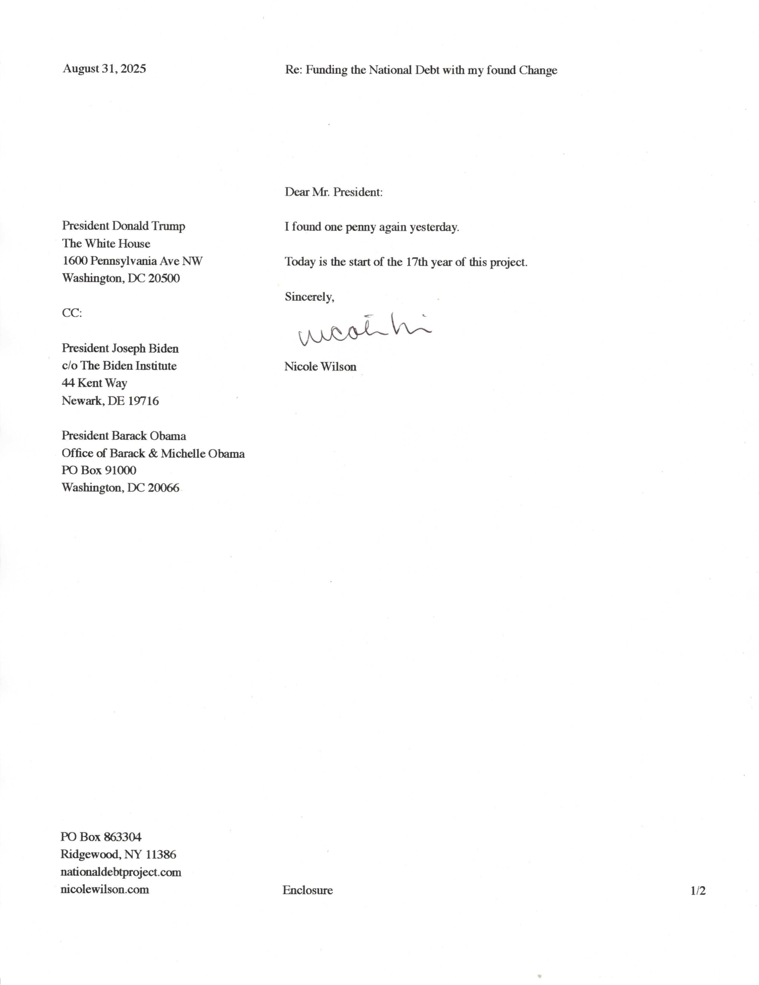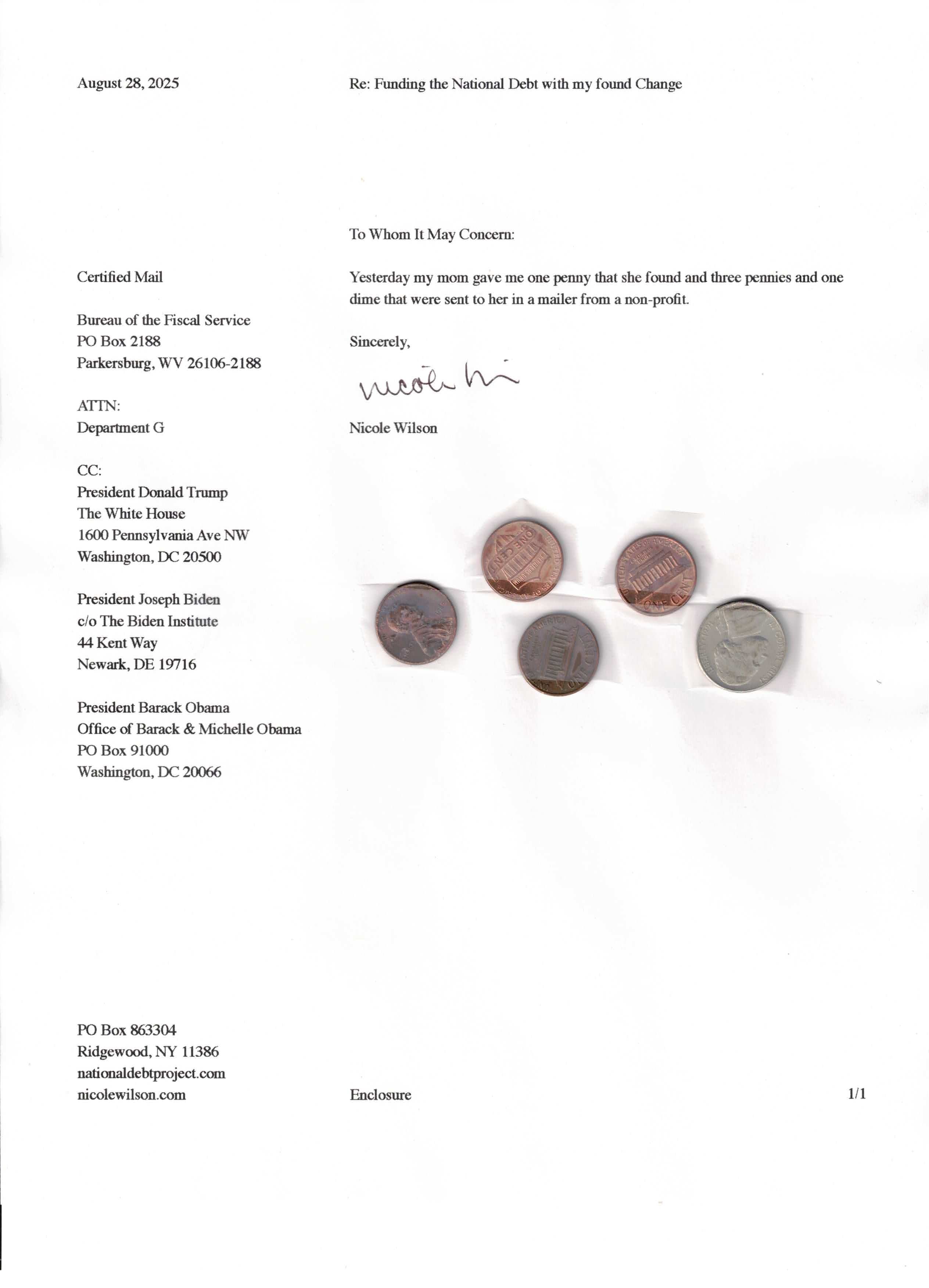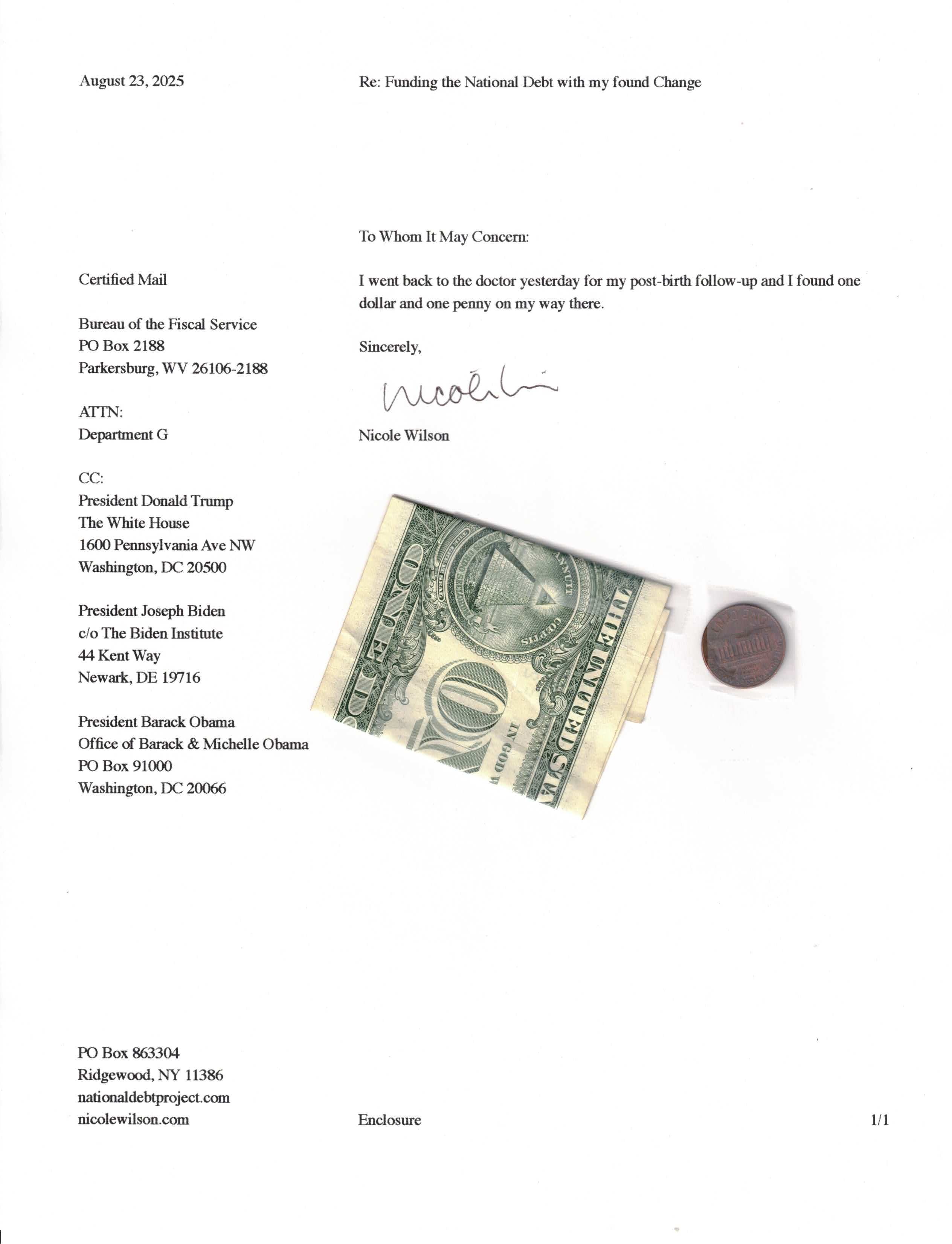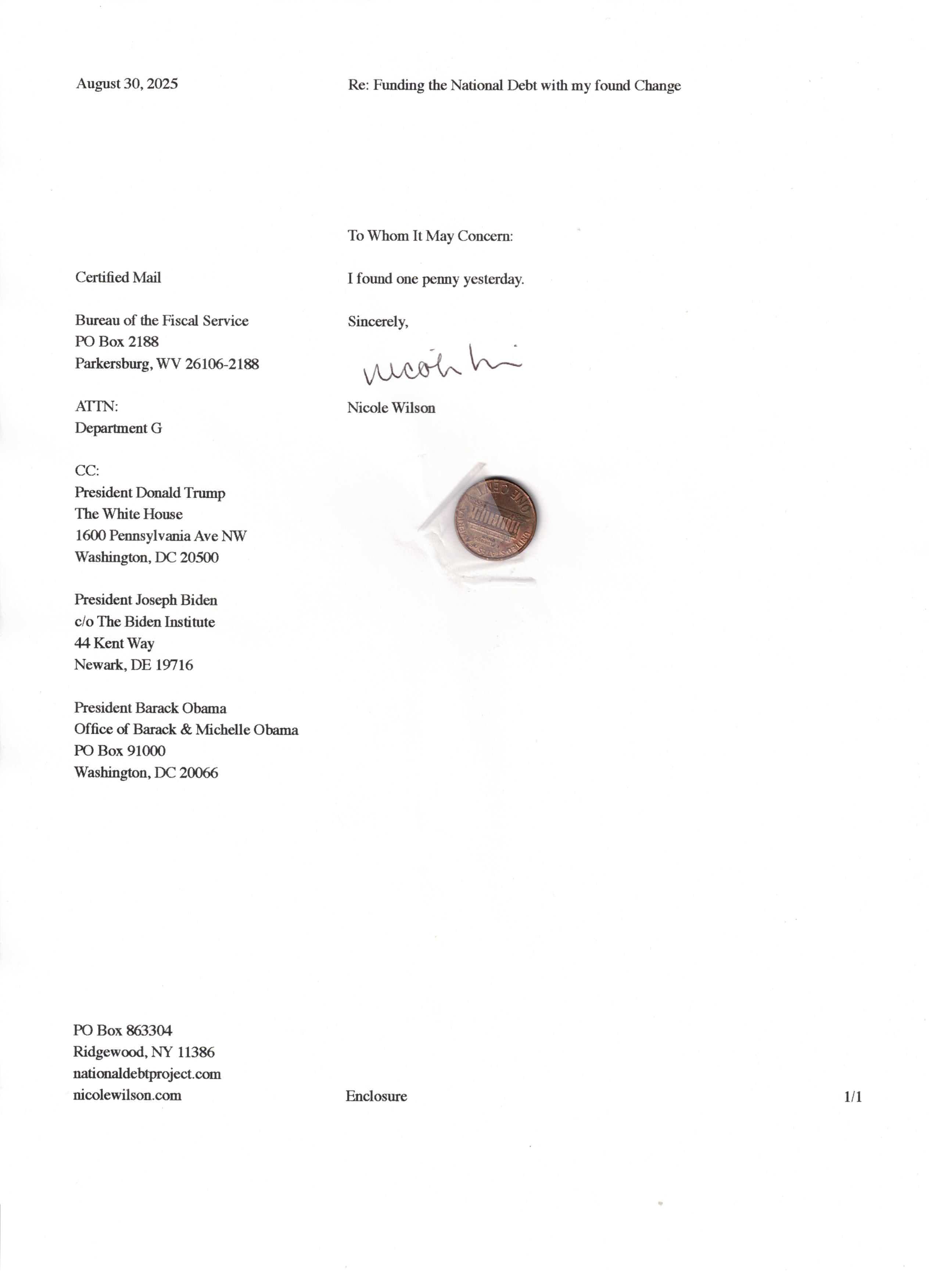 Yet, as I went through each day, I found at least one discarded penny. So, since August 31, 2009, I have sent my found change daily via certified mail to the Bureau of the Fiscal Service (previously the Bureau of the Public Debt), a sector of the Treasury Department whose purpose is to manage the deficit. If by some chance I do not find any change one day, then I send a penny of my own.