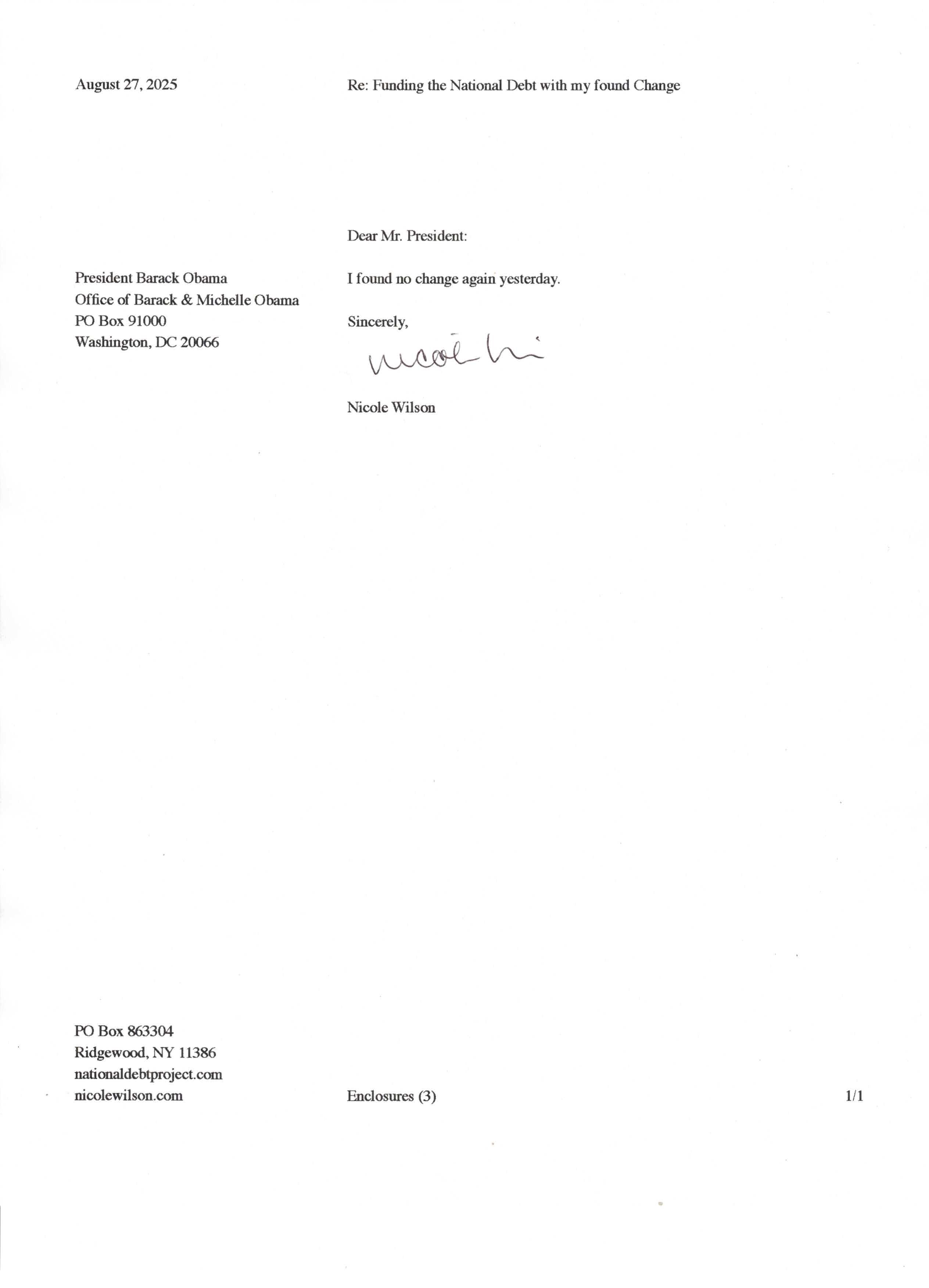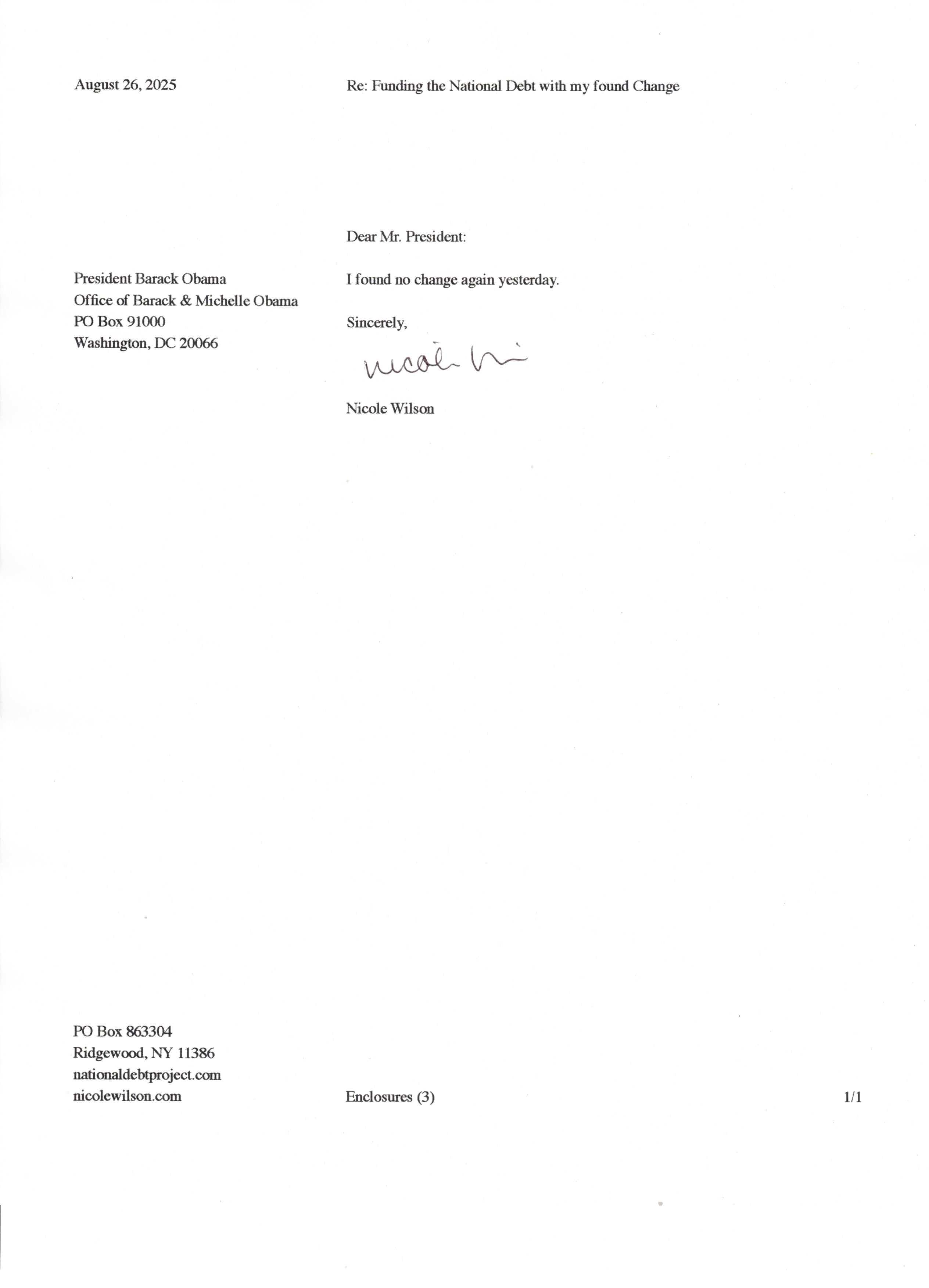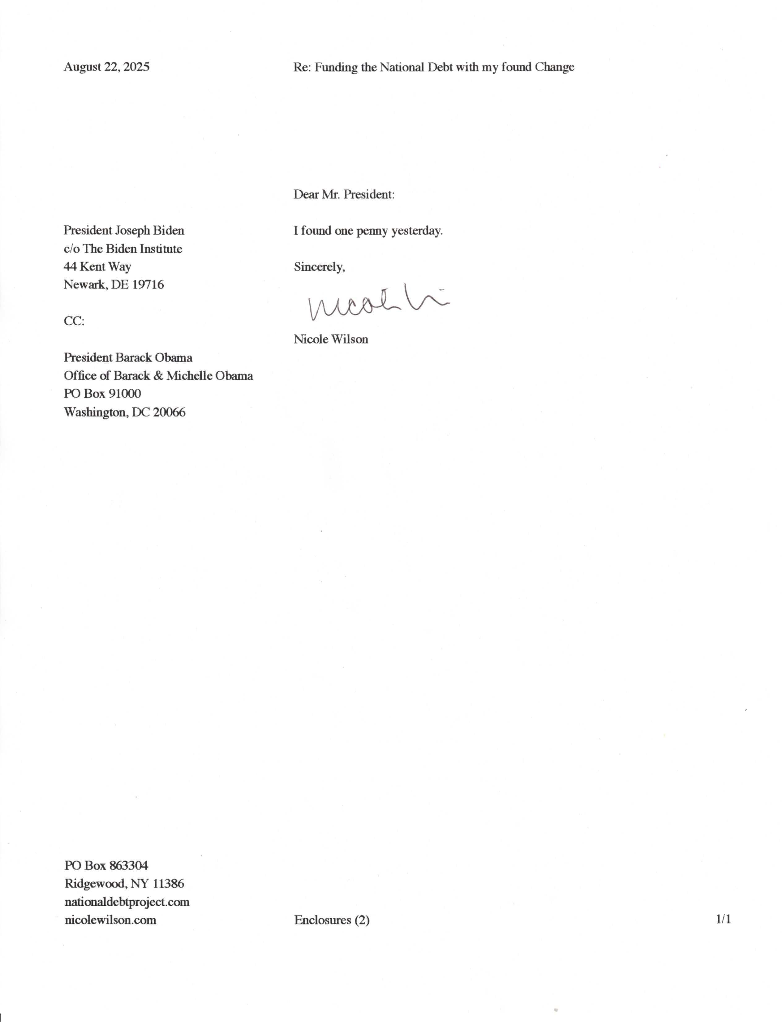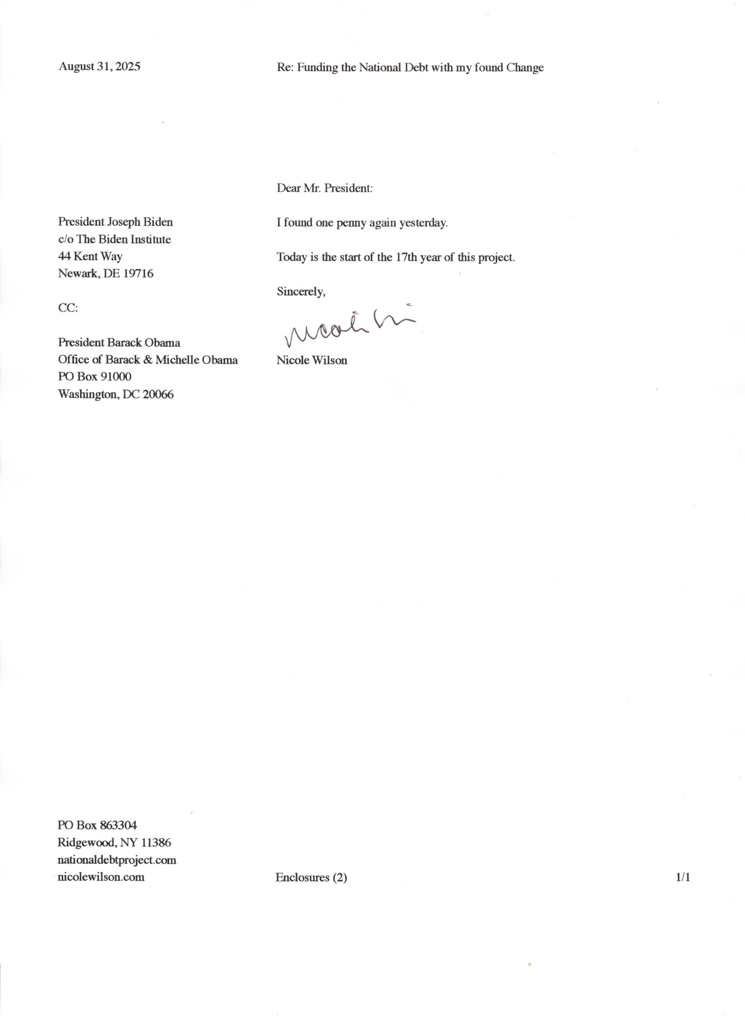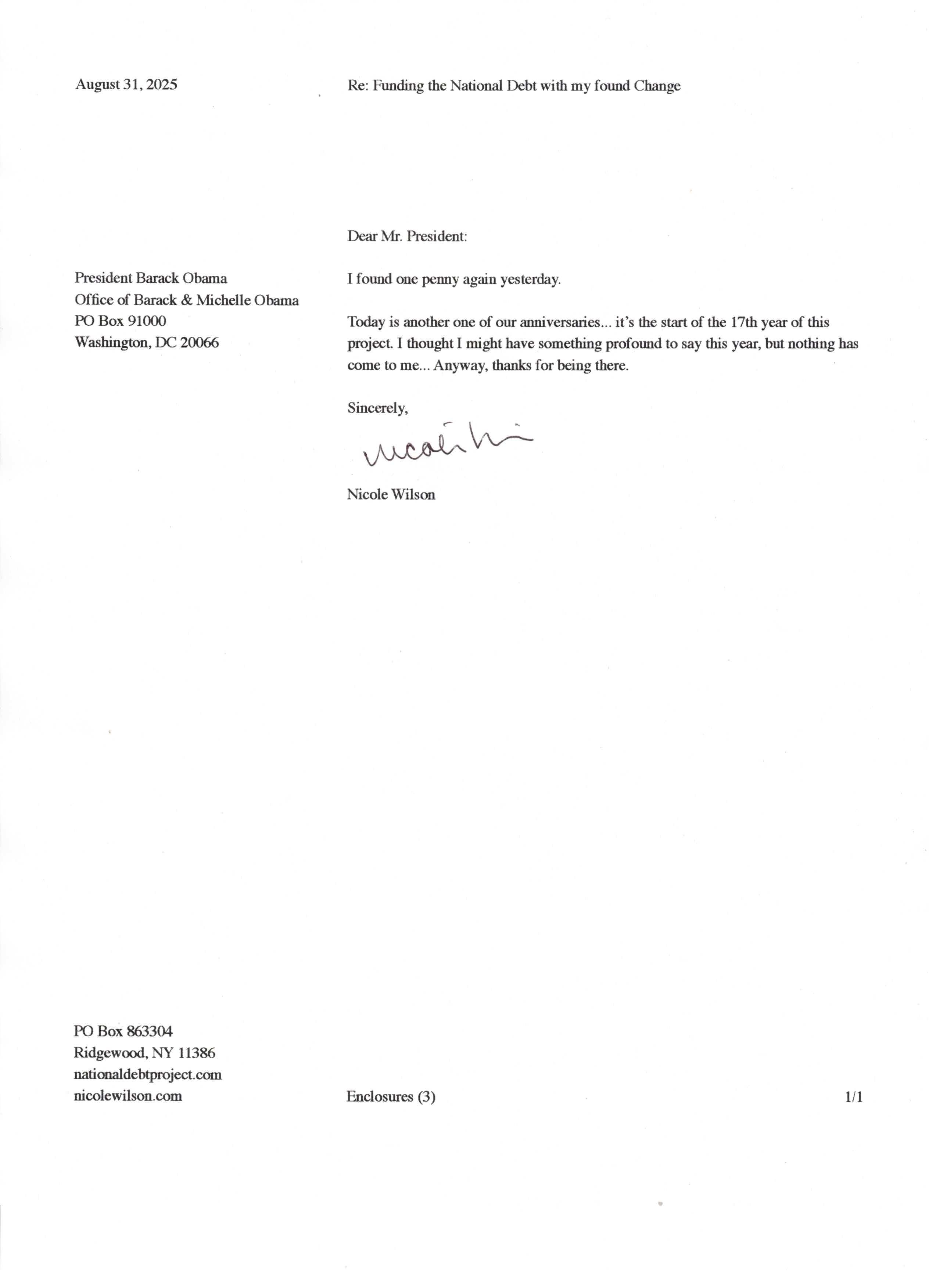Yet, as I went through each day, I found at least one discarded penny. So, since August 31, 2009, I have sent my found change daily via certified mail to the Bureau of the Fiscal Service (previously the Bureau of the Public Debt), a sector of the Treasury Department whose purpose is to manage the deficit. If by some chance I do not find any change one day, then I send a penny of my own.