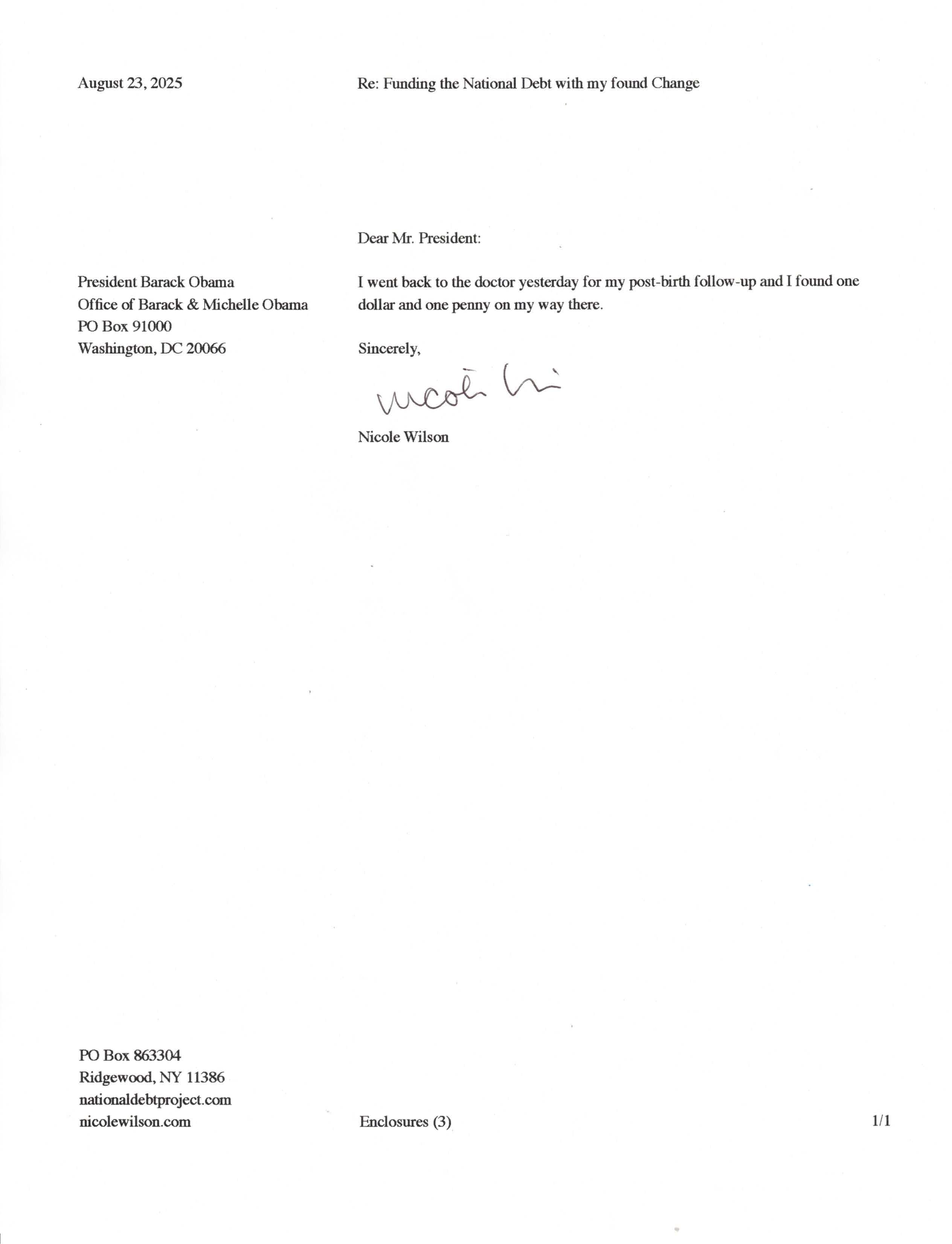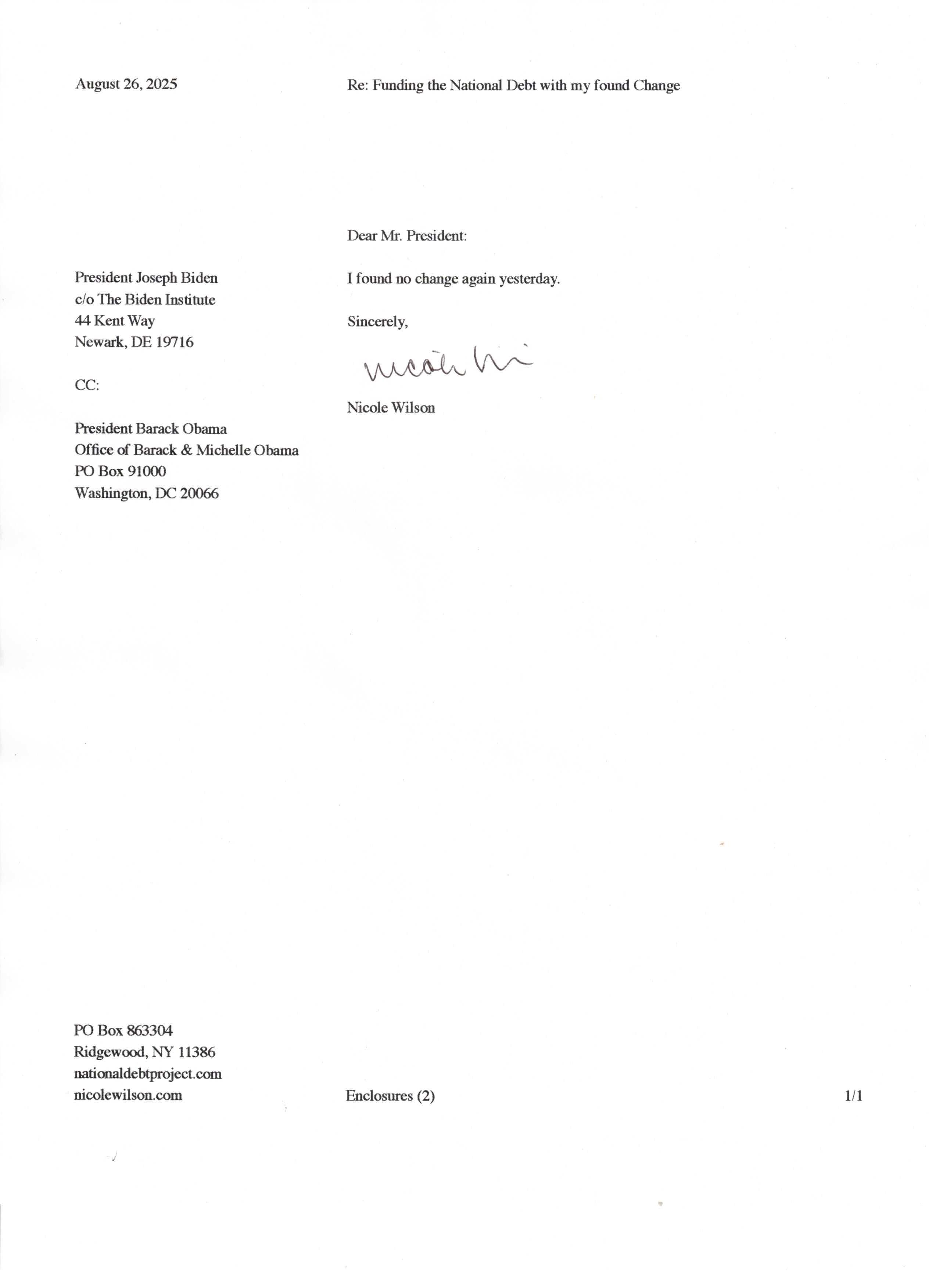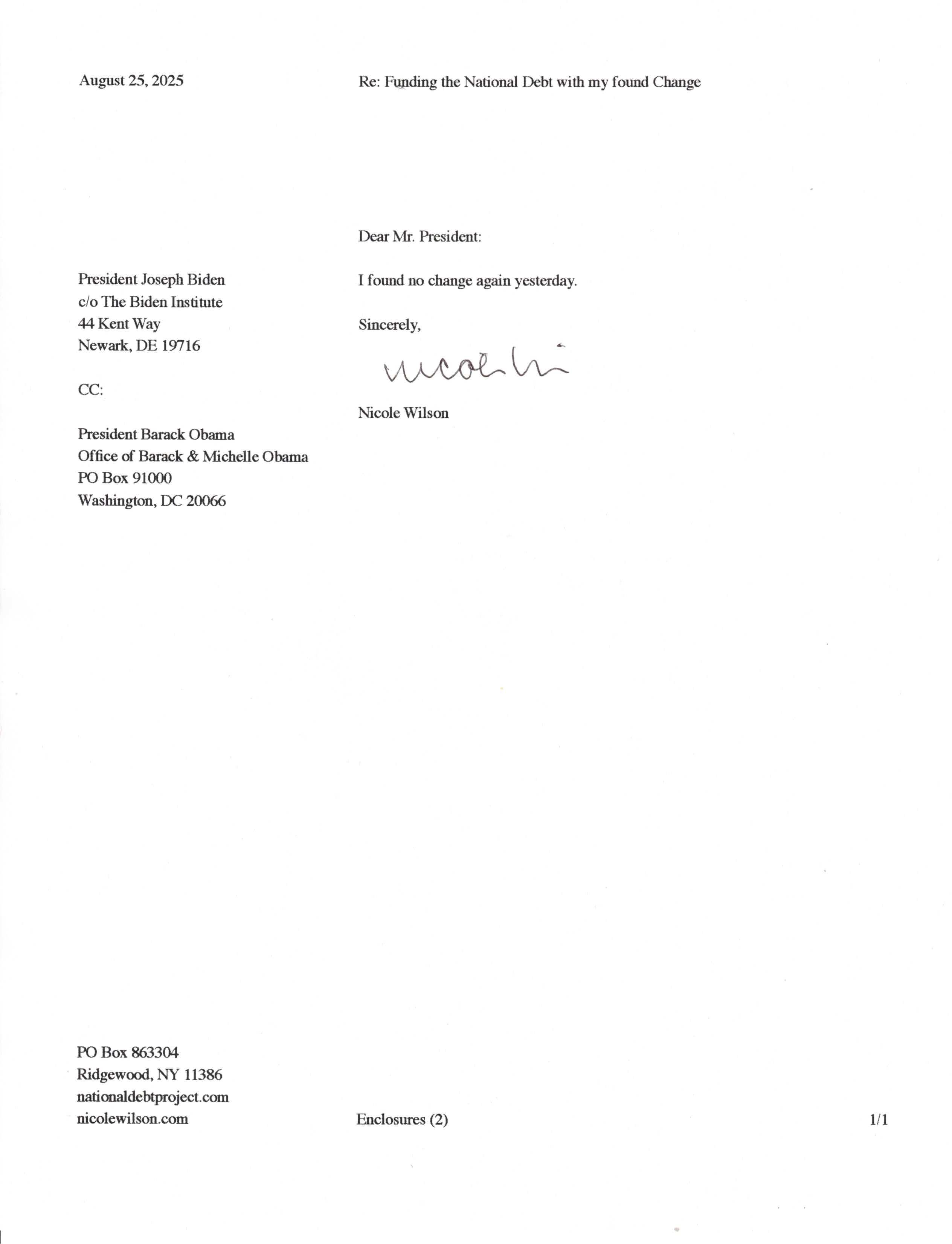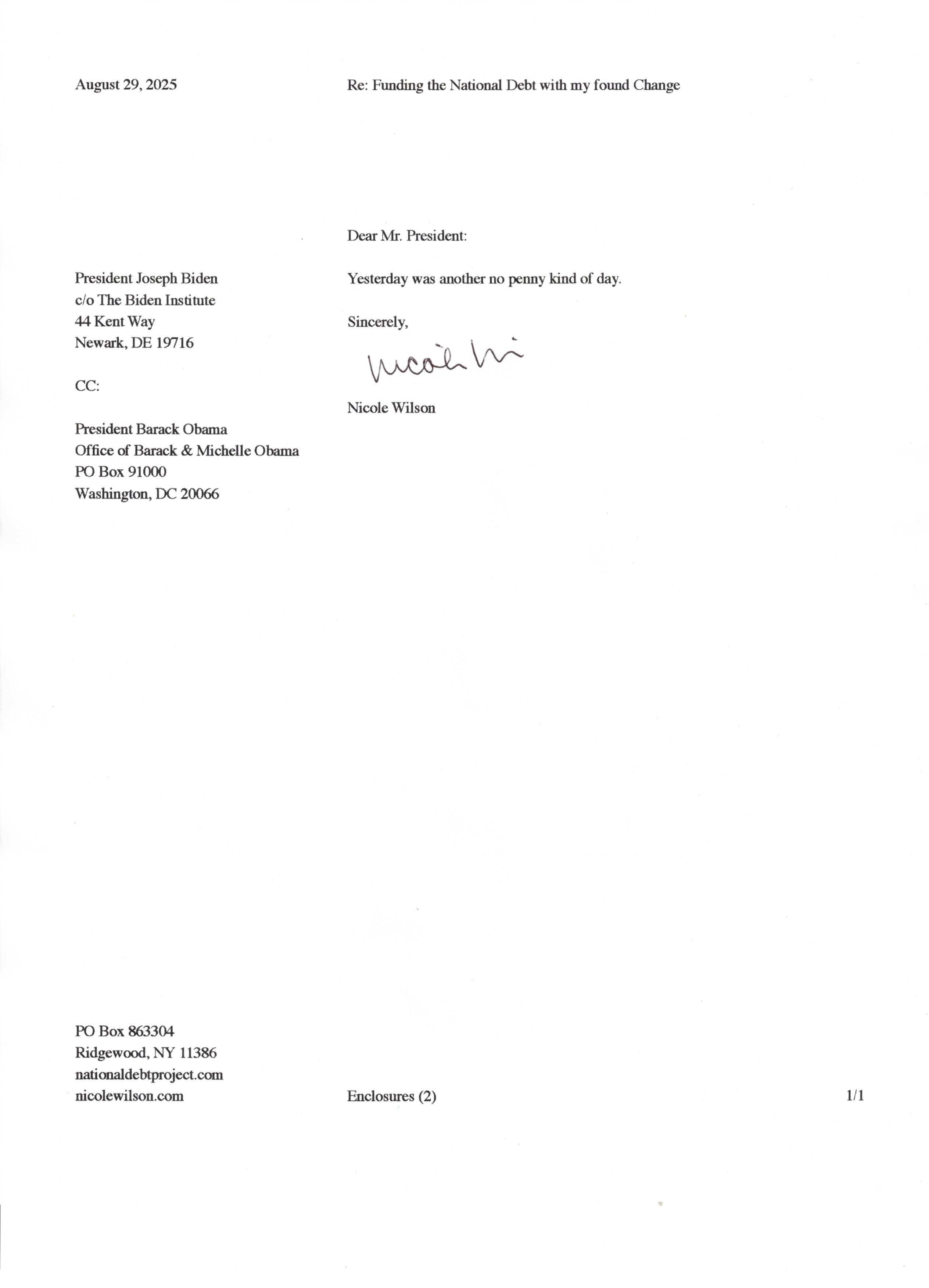 Yet, as I went through each day, I found at least one discarded penny. So, since August 31, 2009, I have sent my found change daily via certified mail to the Bureau of the Fiscal Service (previously the Bureau of the Public Debt), a sector of the Treasury Department whose purpose is to manage the deficit. If by some chance I do not find any change one day, then I send a penny of my own.