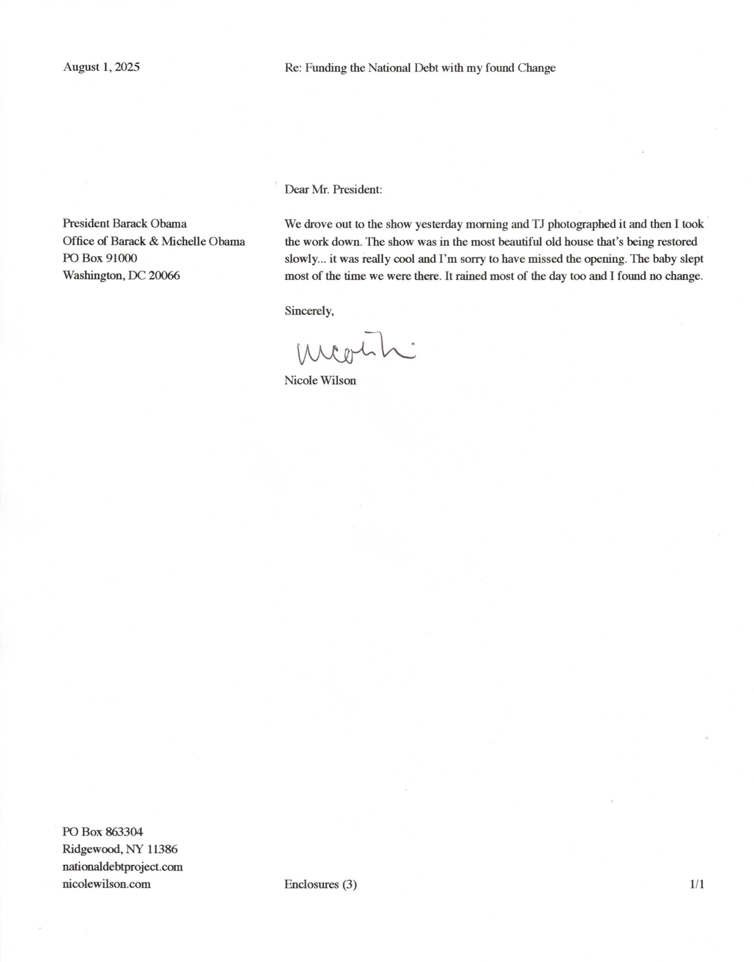 Yet, as I went through each day, I found at least one discarded penny. So, since August 31, 2009, I have sent my found change daily via certified mail to the Bureau of the Fiscal Service (previously the Bureau of the Public Debt), a sector of the Treasury Department whose purpose is to manage the deficit. If by some chance I do not find any change one day, then I send a penny of my own.