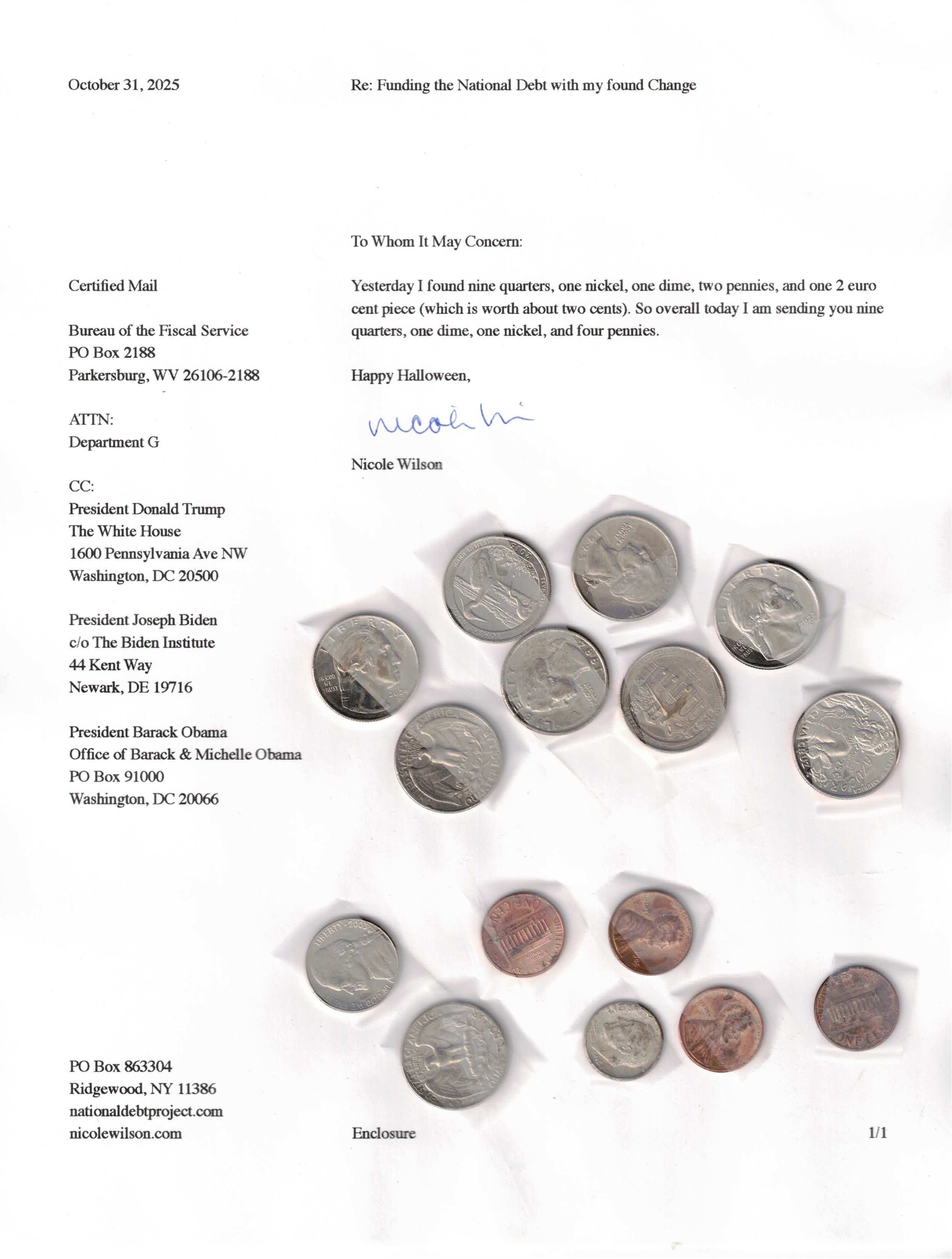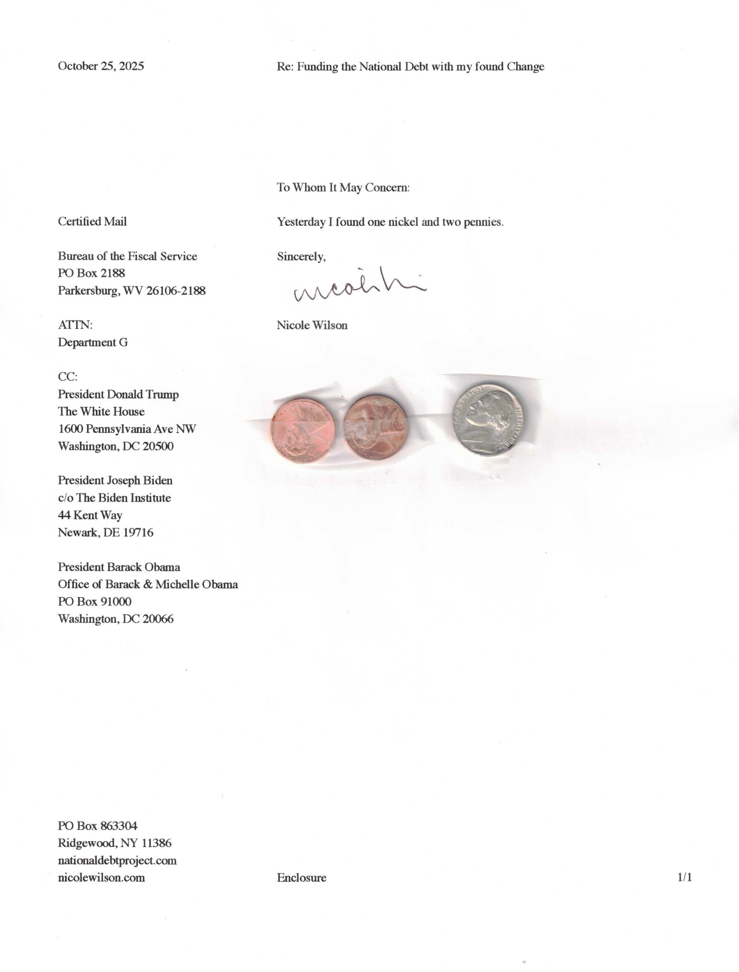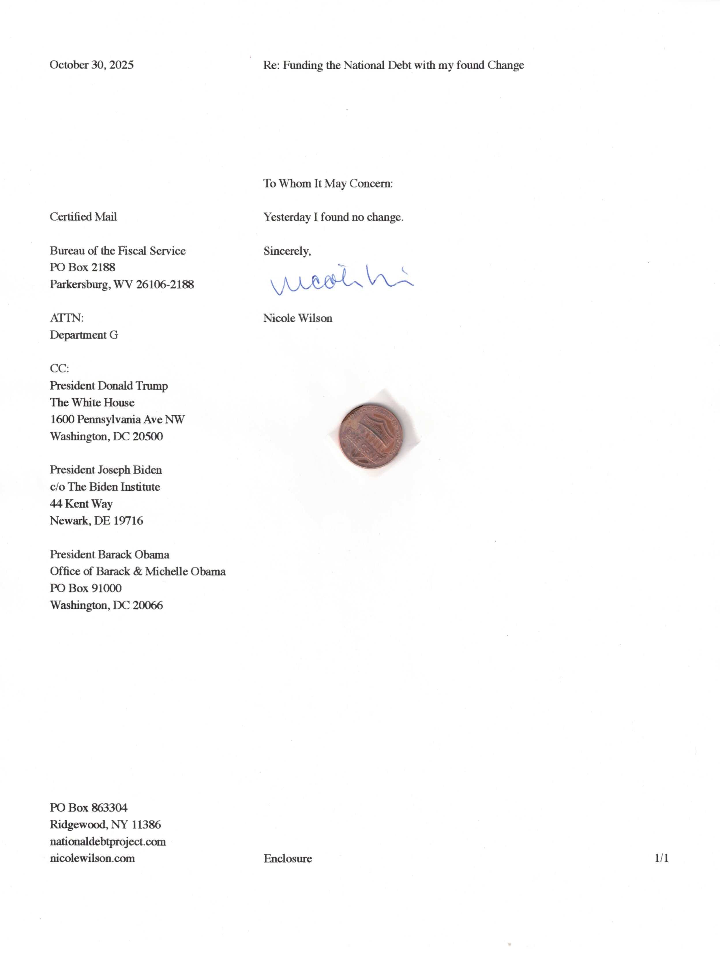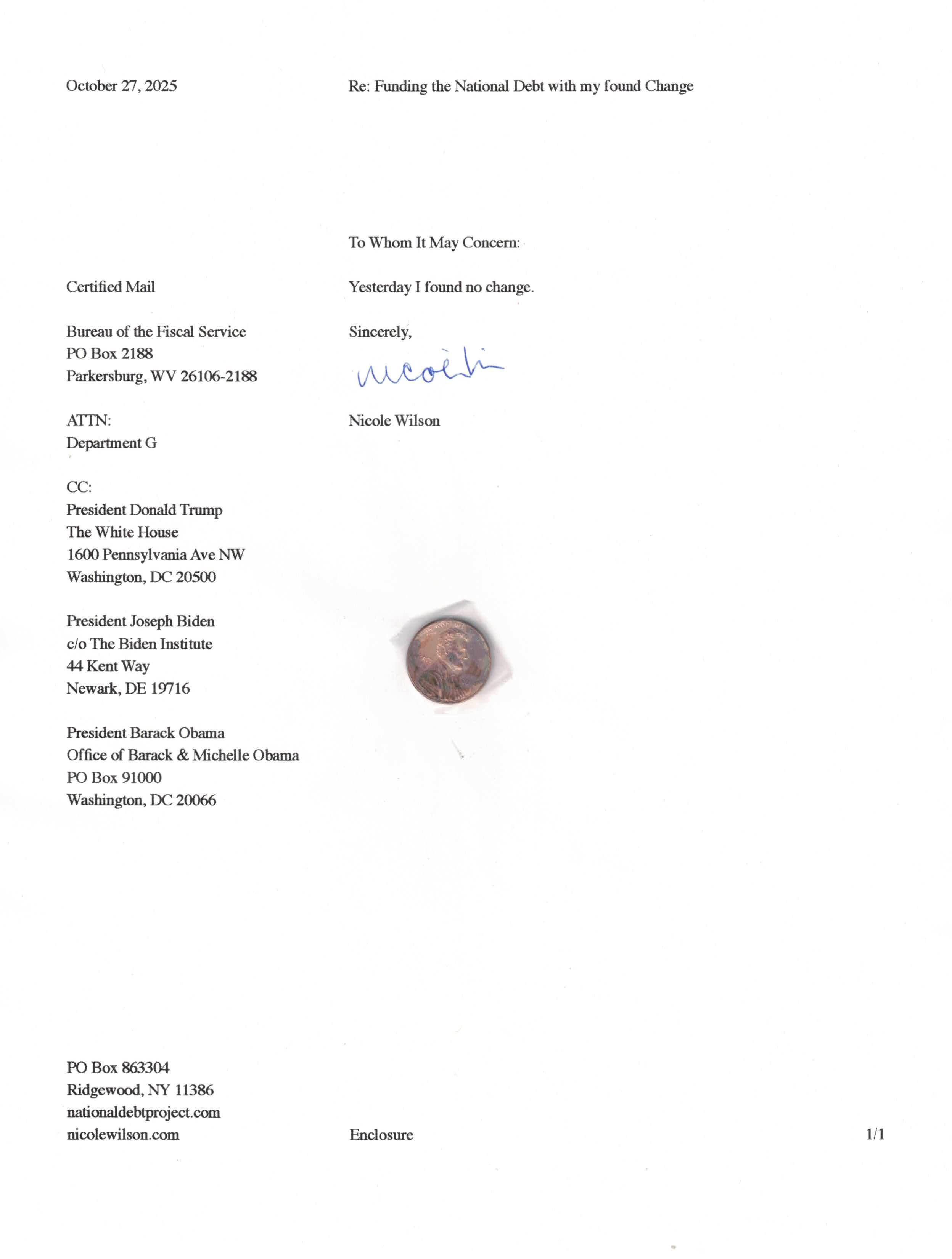 Yet, as I went through each day, I found at least one discarded penny. So, since August 31, 2009, I have sent my found change daily via certified mail to the Bureau of the Fiscal Service (previously the Bureau of the Public Debt), a sector of the Treasury Department whose purpose is to manage the deficit. If by some chance I do not find any change one day, then I send a penny of my own.