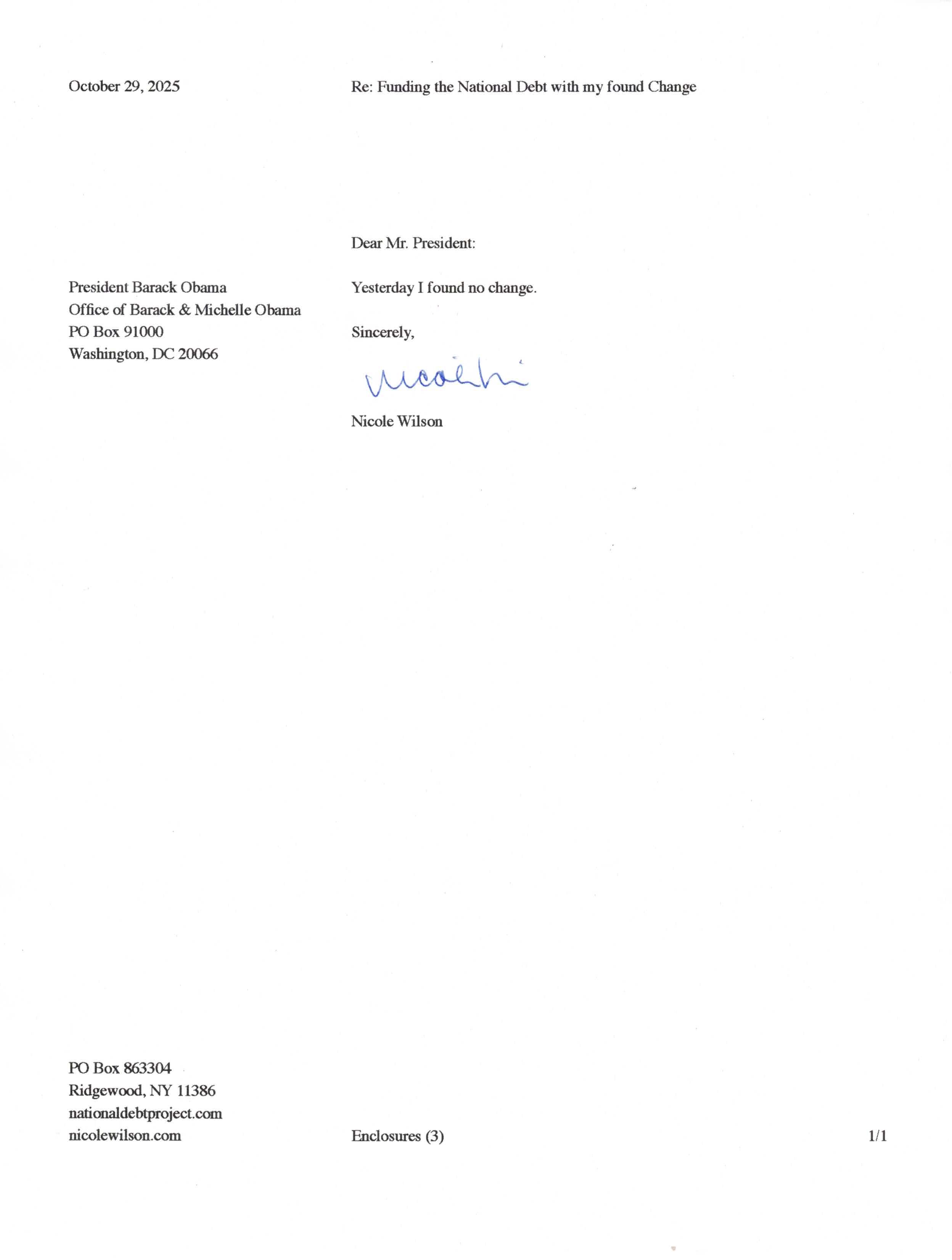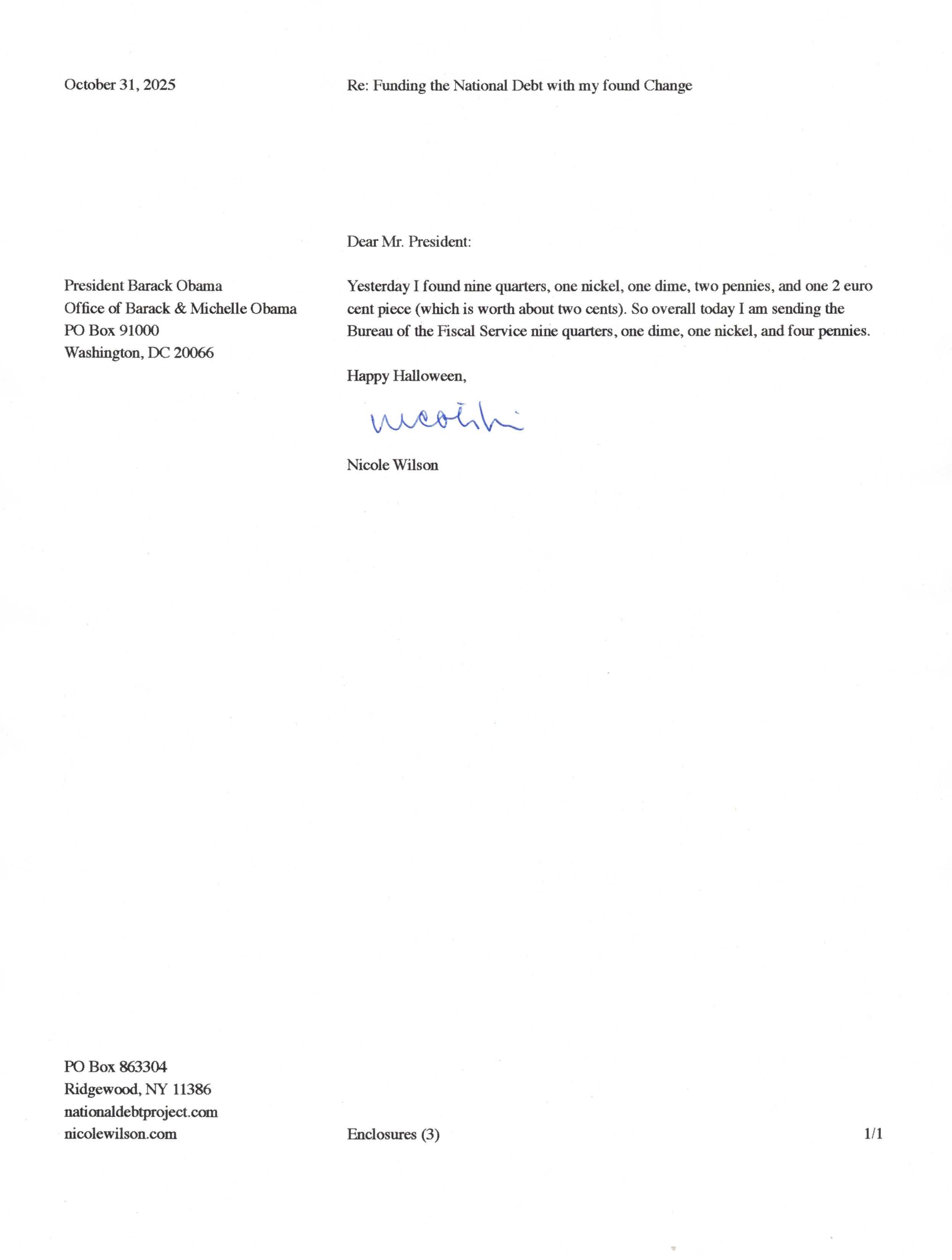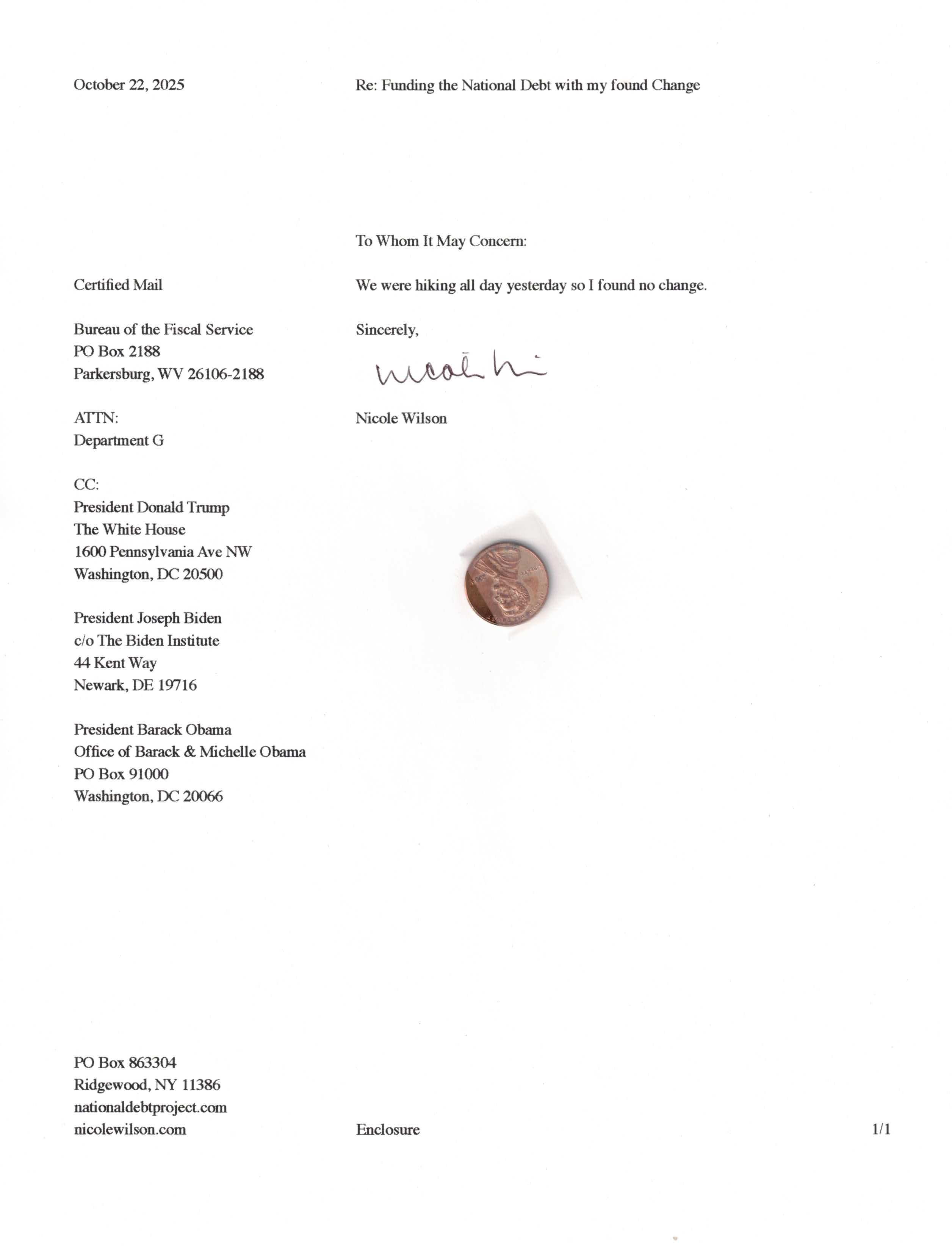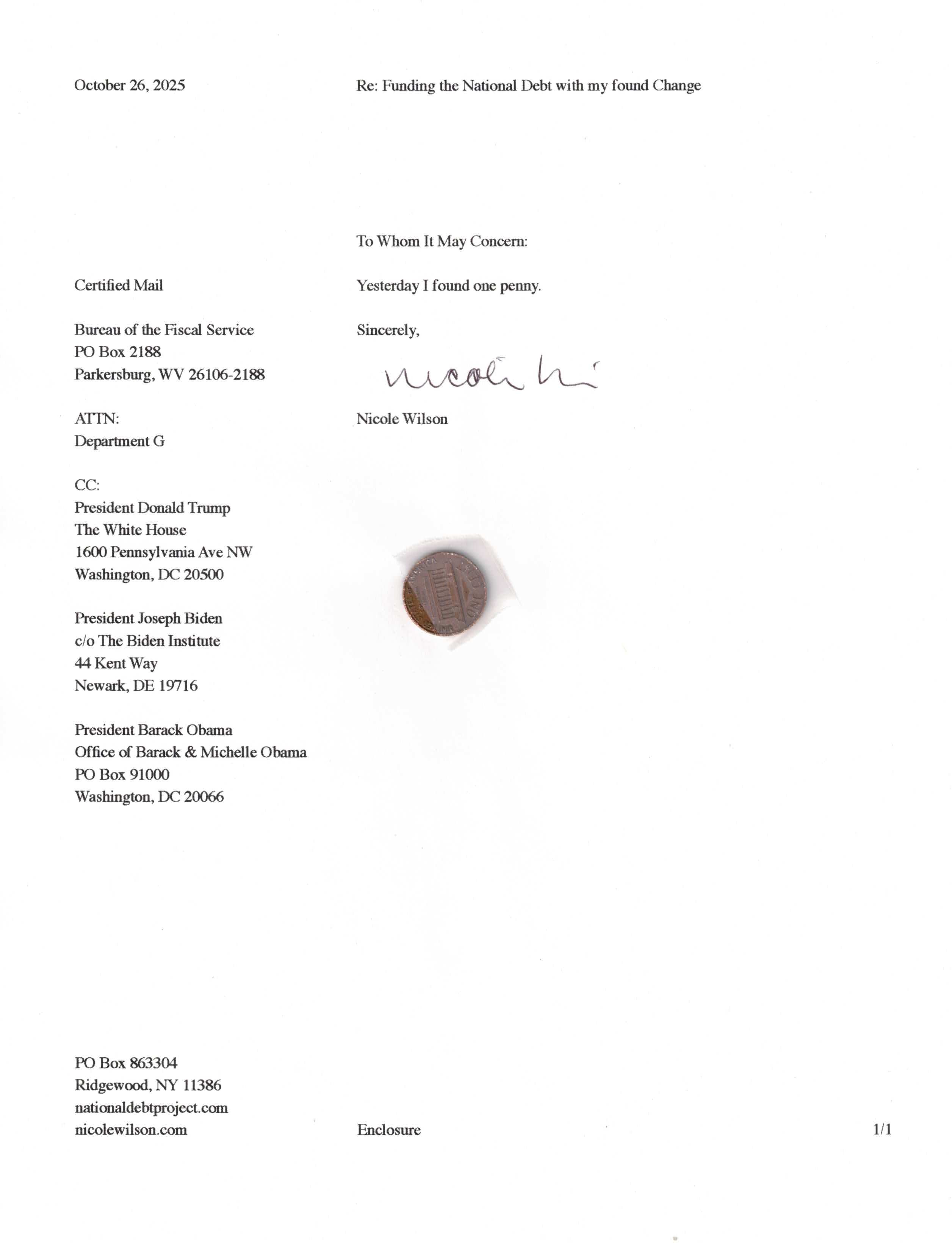 Yet, as I went through each day, I found at least one discarded penny. So, since August 31, 2009, I have sent my found change daily via certified mail to the Bureau of the Fiscal Service (previously the Bureau of the Public Debt), a sector of the Treasury Department whose purpose is to manage the deficit. If by some chance I do not find any change one day, then I send a penny of my own.