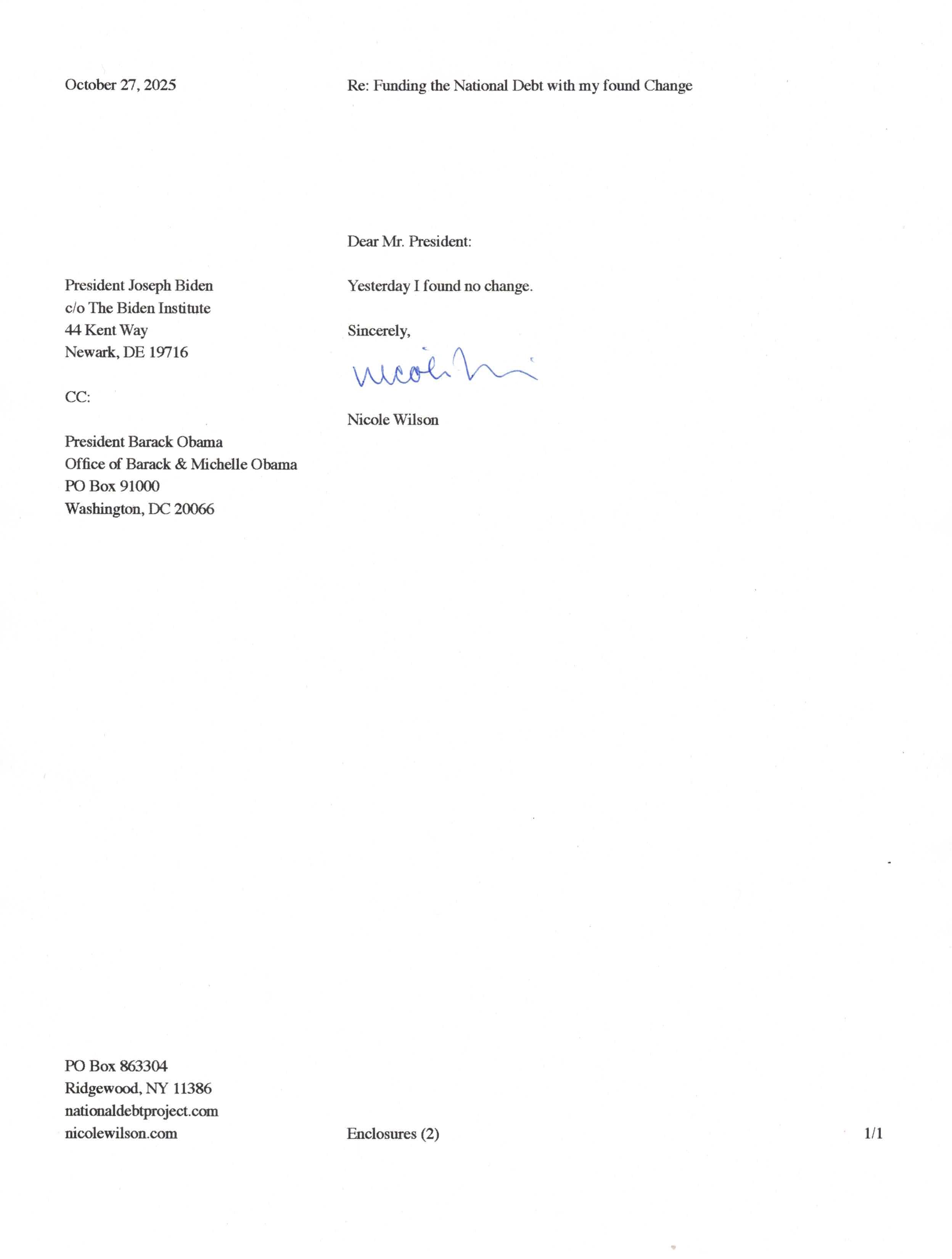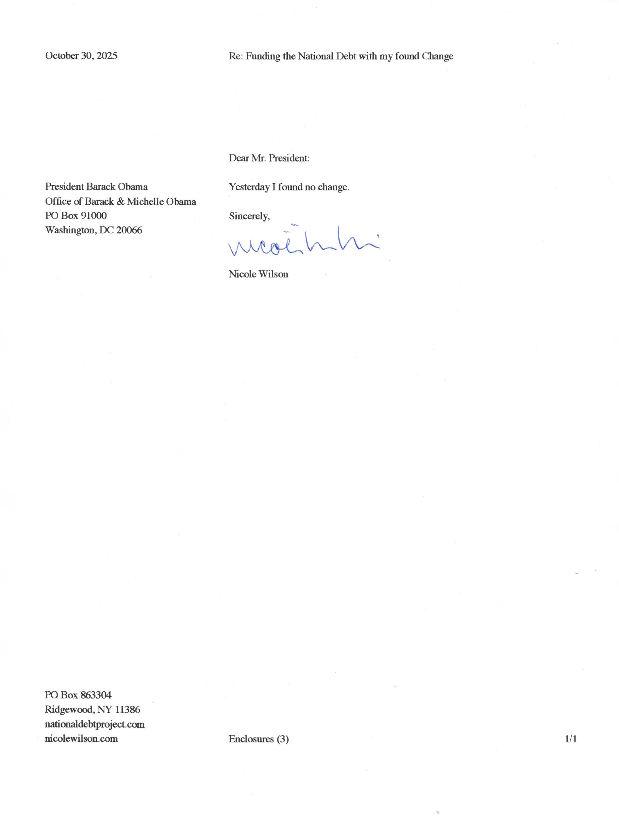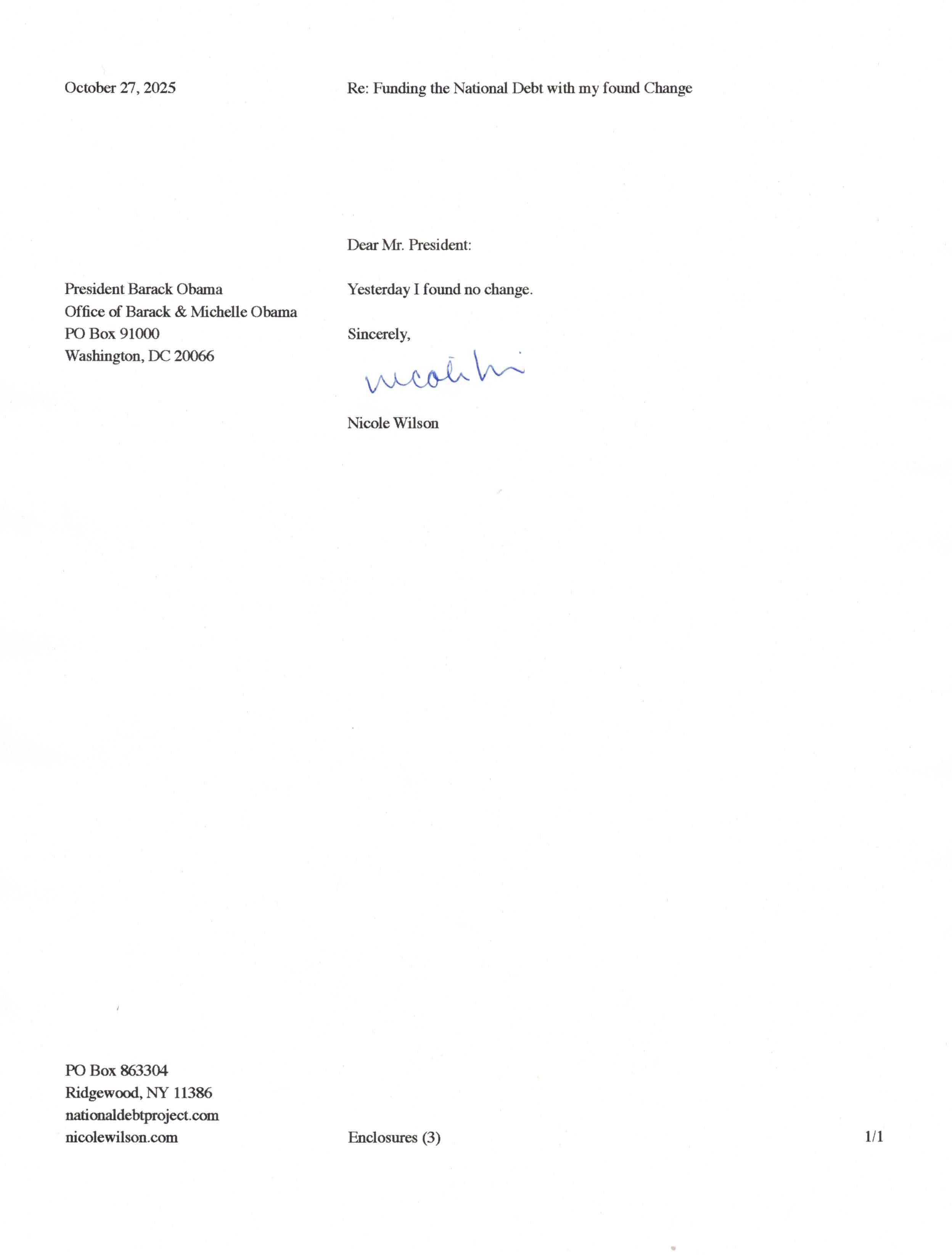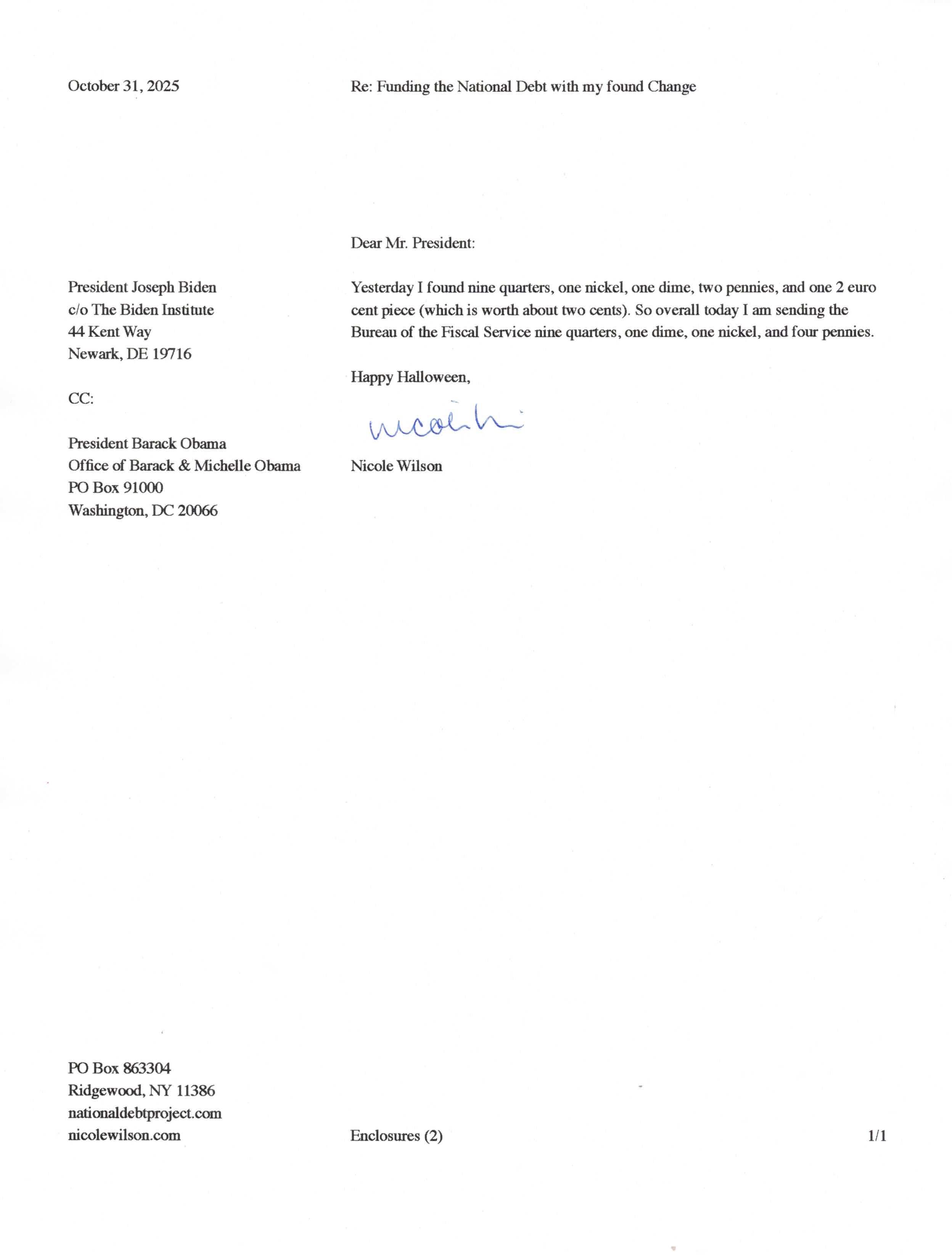 Yet, as I went through each day, I found at least one discarded penny. So, since August 31, 2009, I have sent my found change daily via certified mail to the Bureau of the Fiscal Service (previously the Bureau of the Public Debt), a sector of the Treasury Department whose purpose is to manage the deficit. If by some chance I do not find any change one day, then I send a penny of my own.