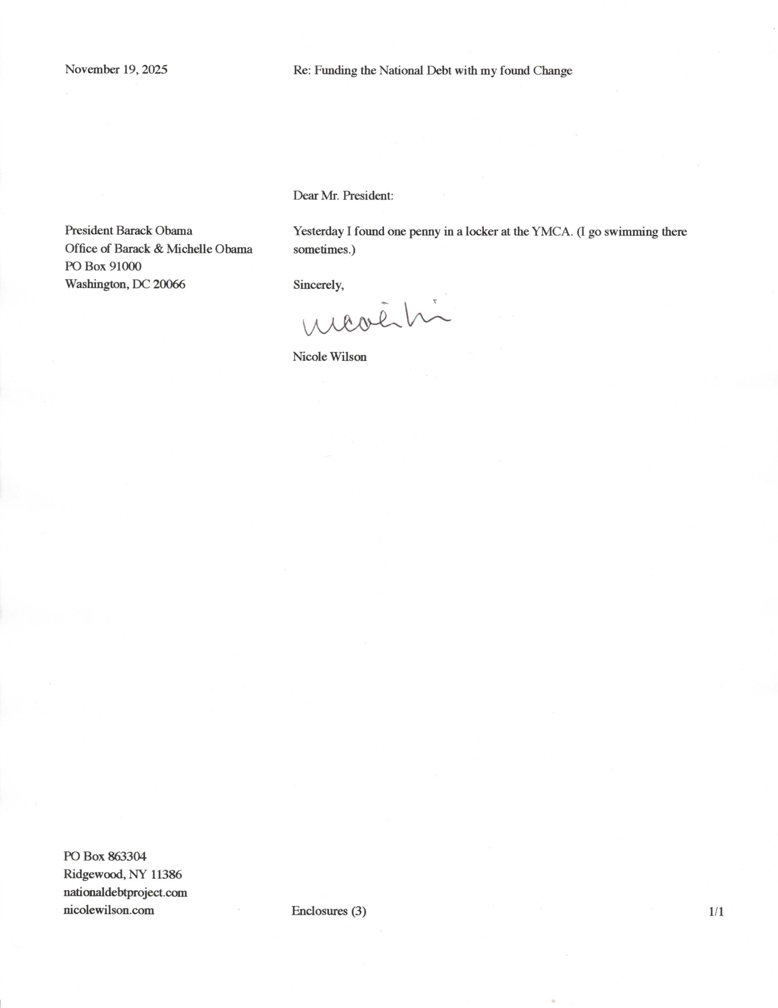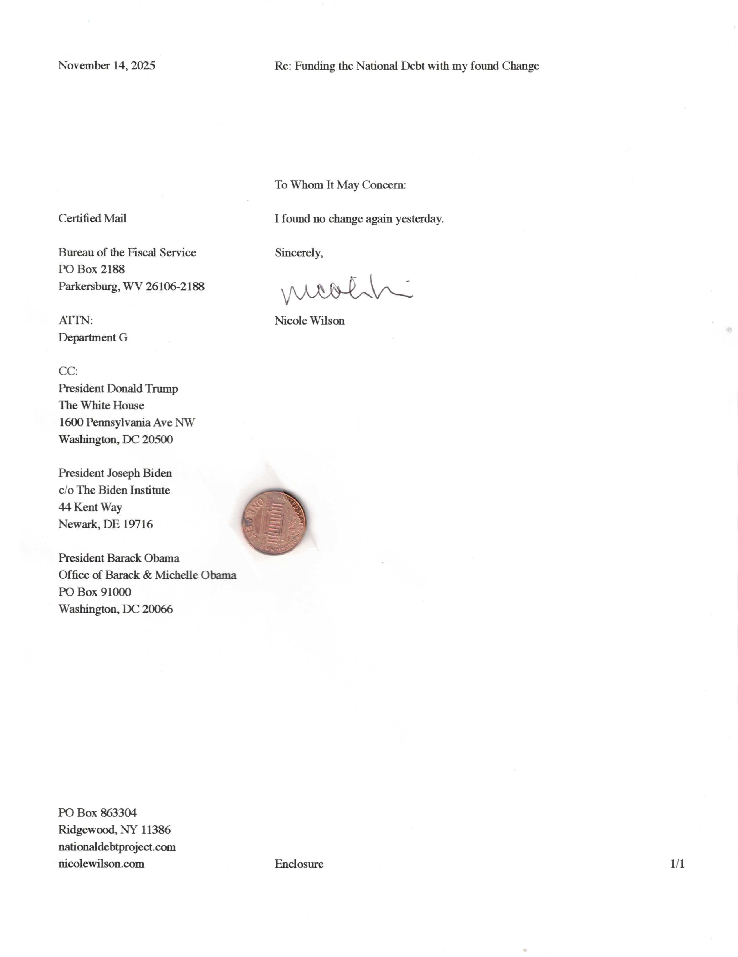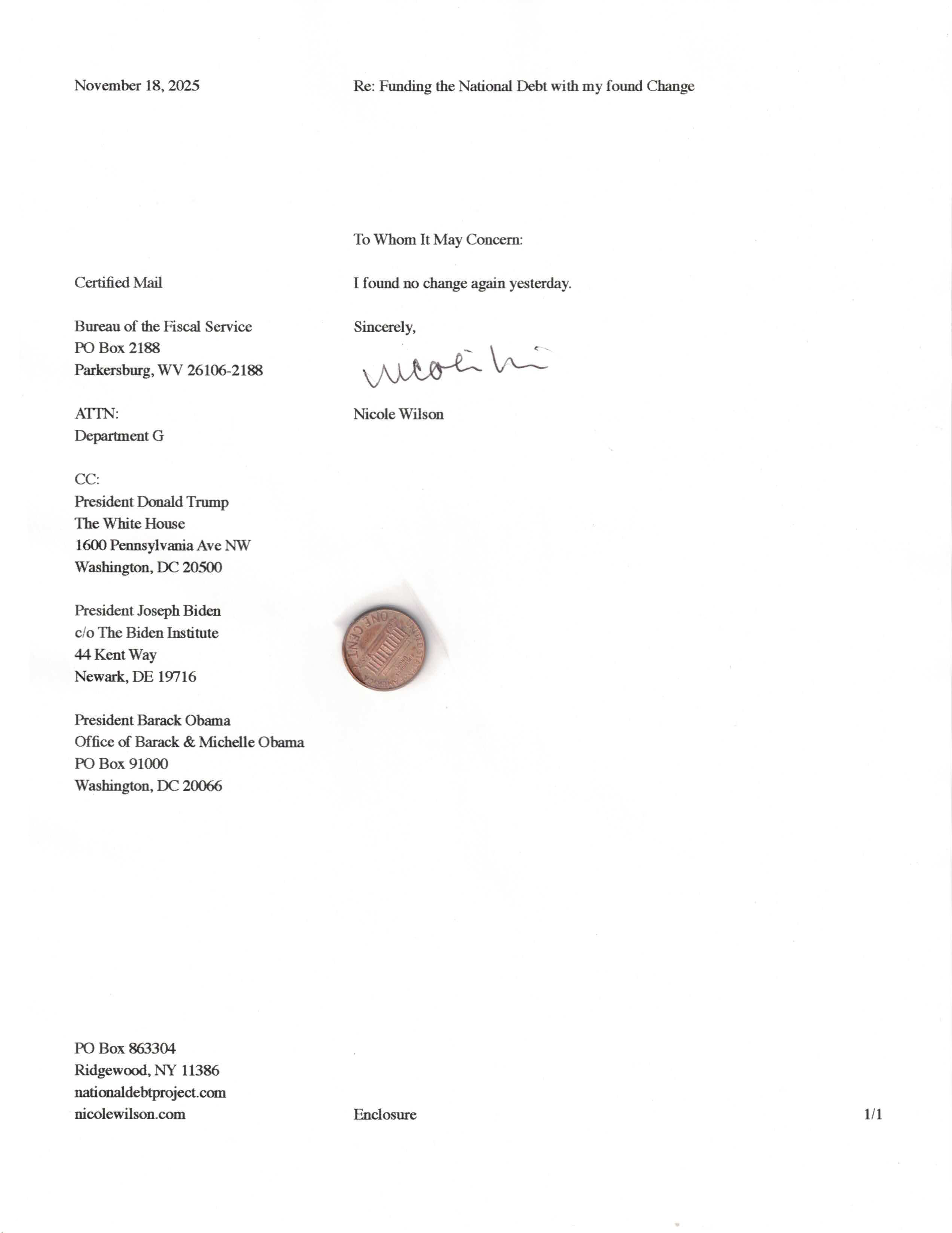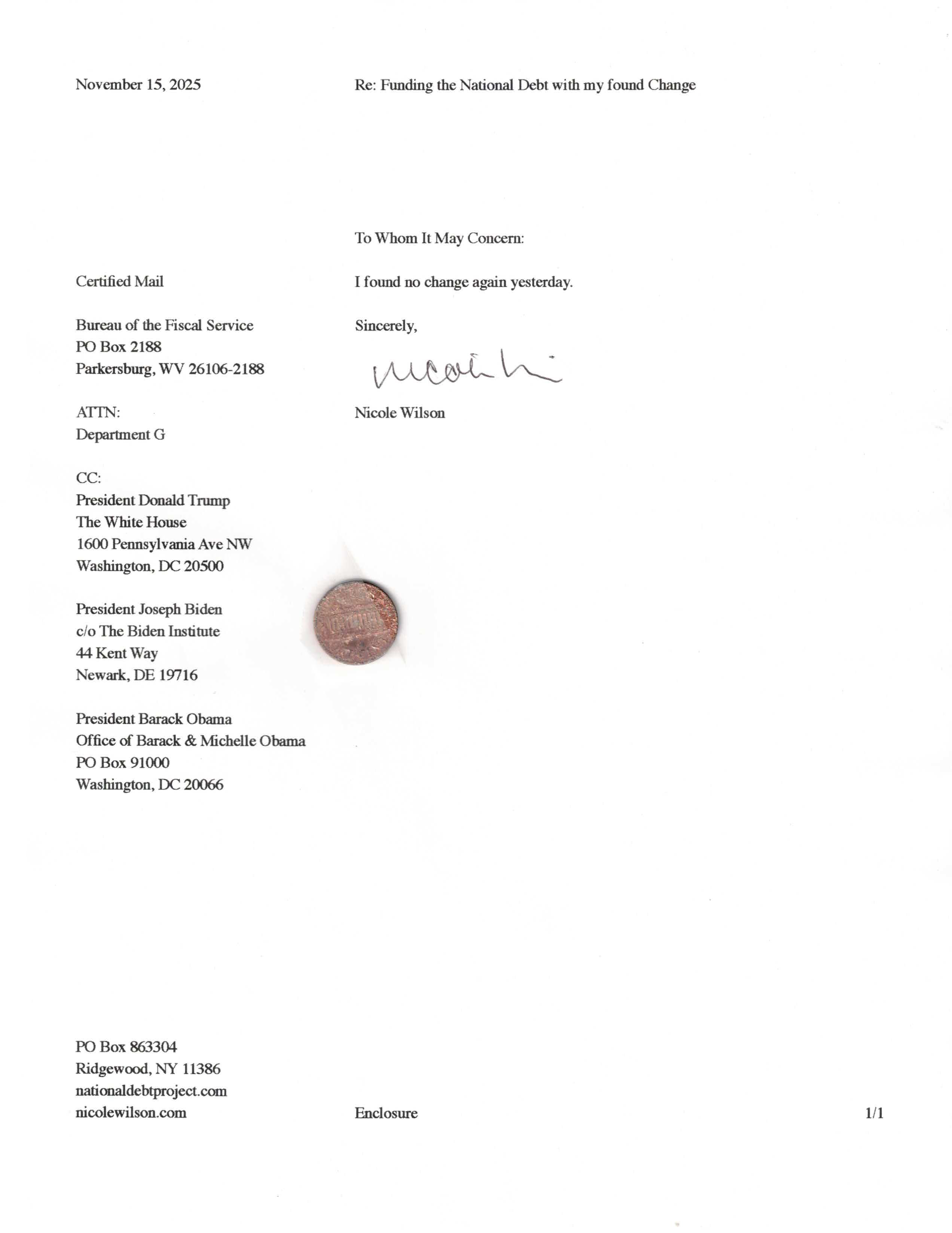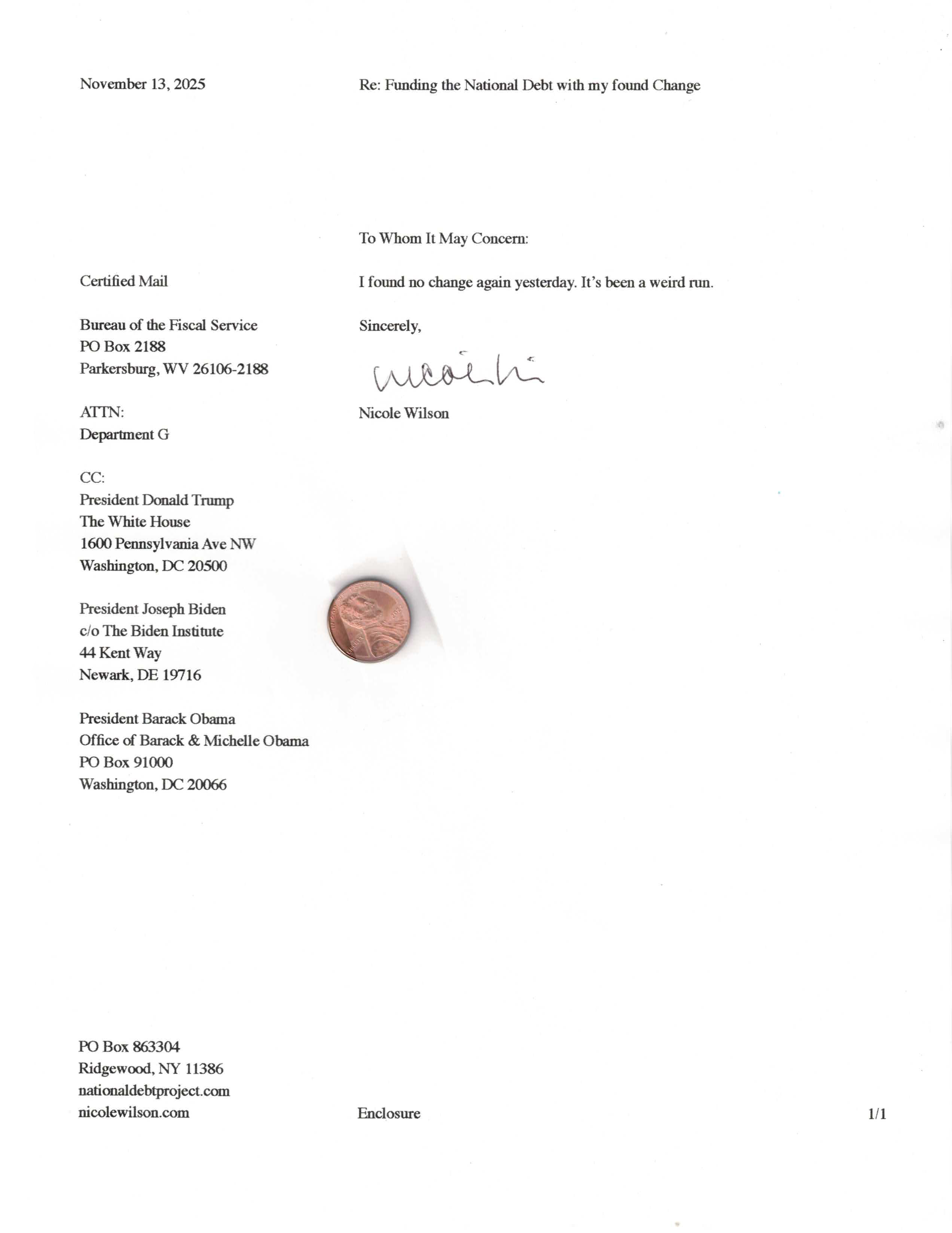 Yet, as I went through each day, I found at least one discarded penny. So, since August 31, 2009, I have sent my found change daily via certified mail to the Bureau of the Fiscal Service (previously the Bureau of the Public Debt), a sector of the Treasury Department whose purpose is to manage the deficit. If by some chance I do not find any change one day, then I send a penny of my own.