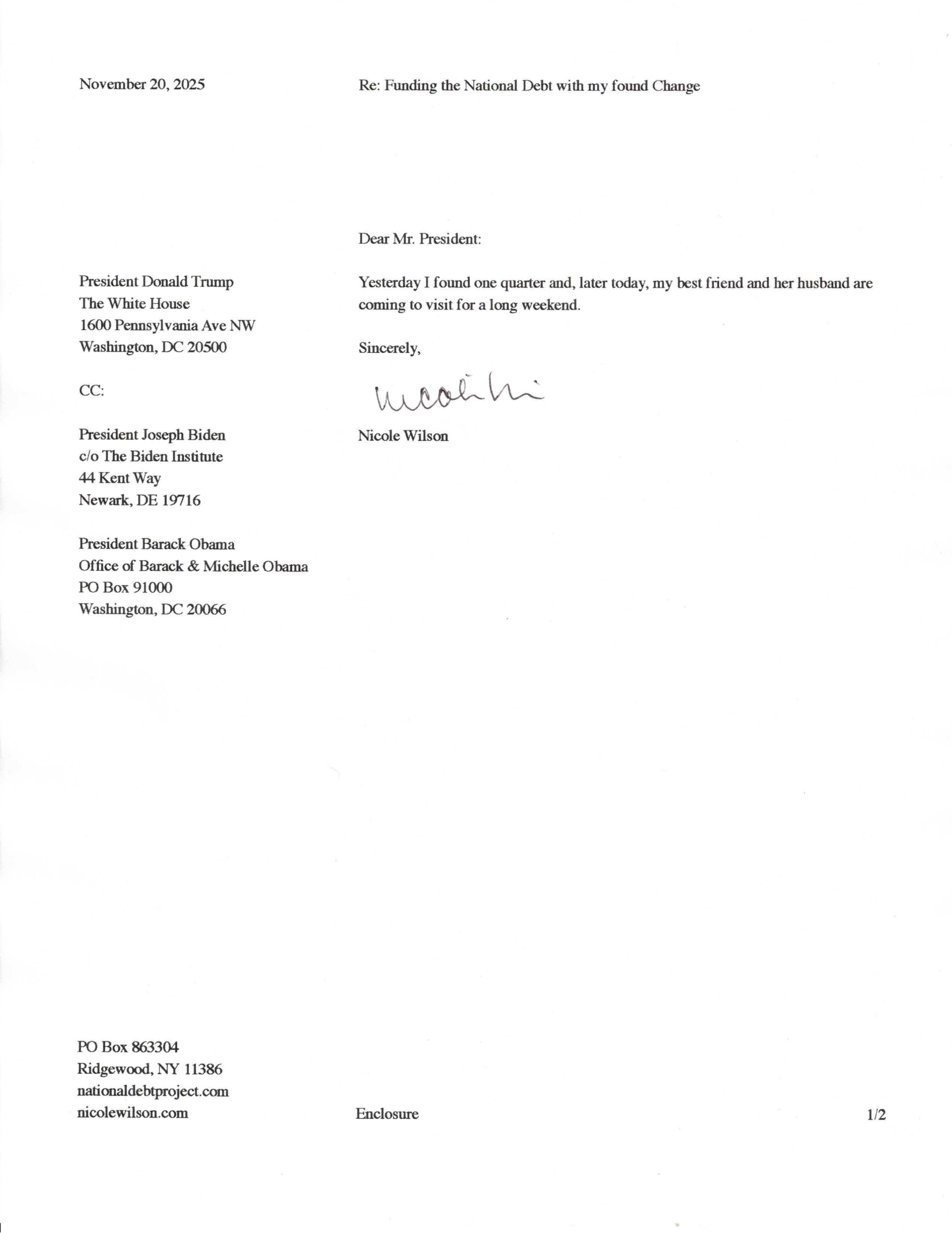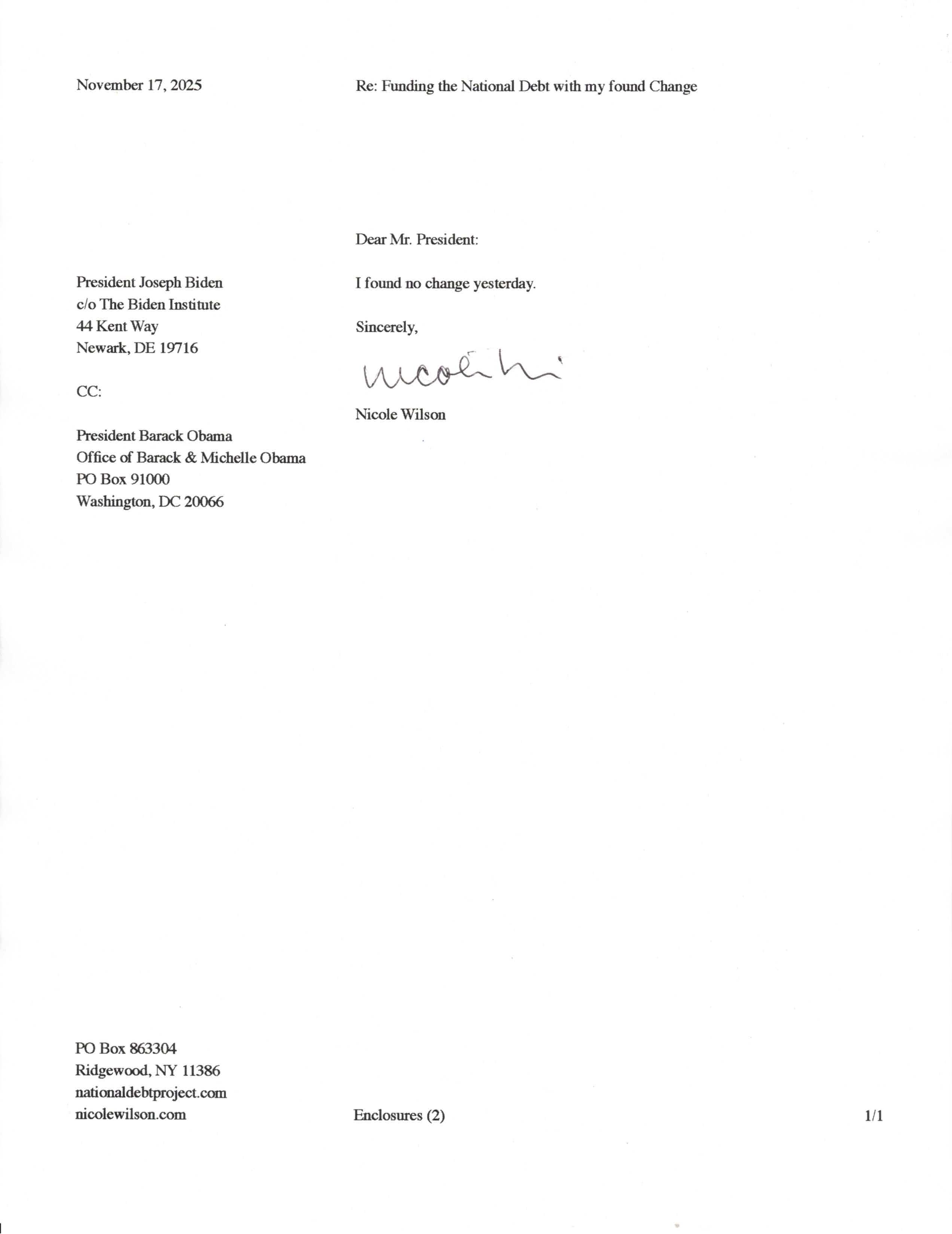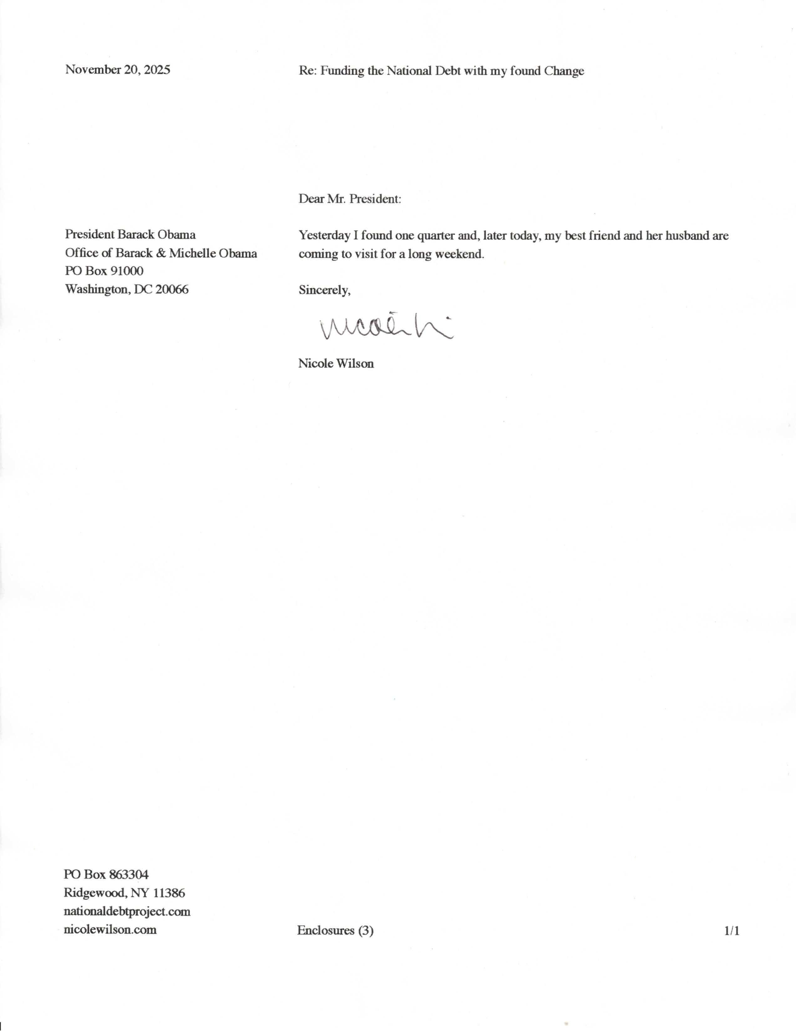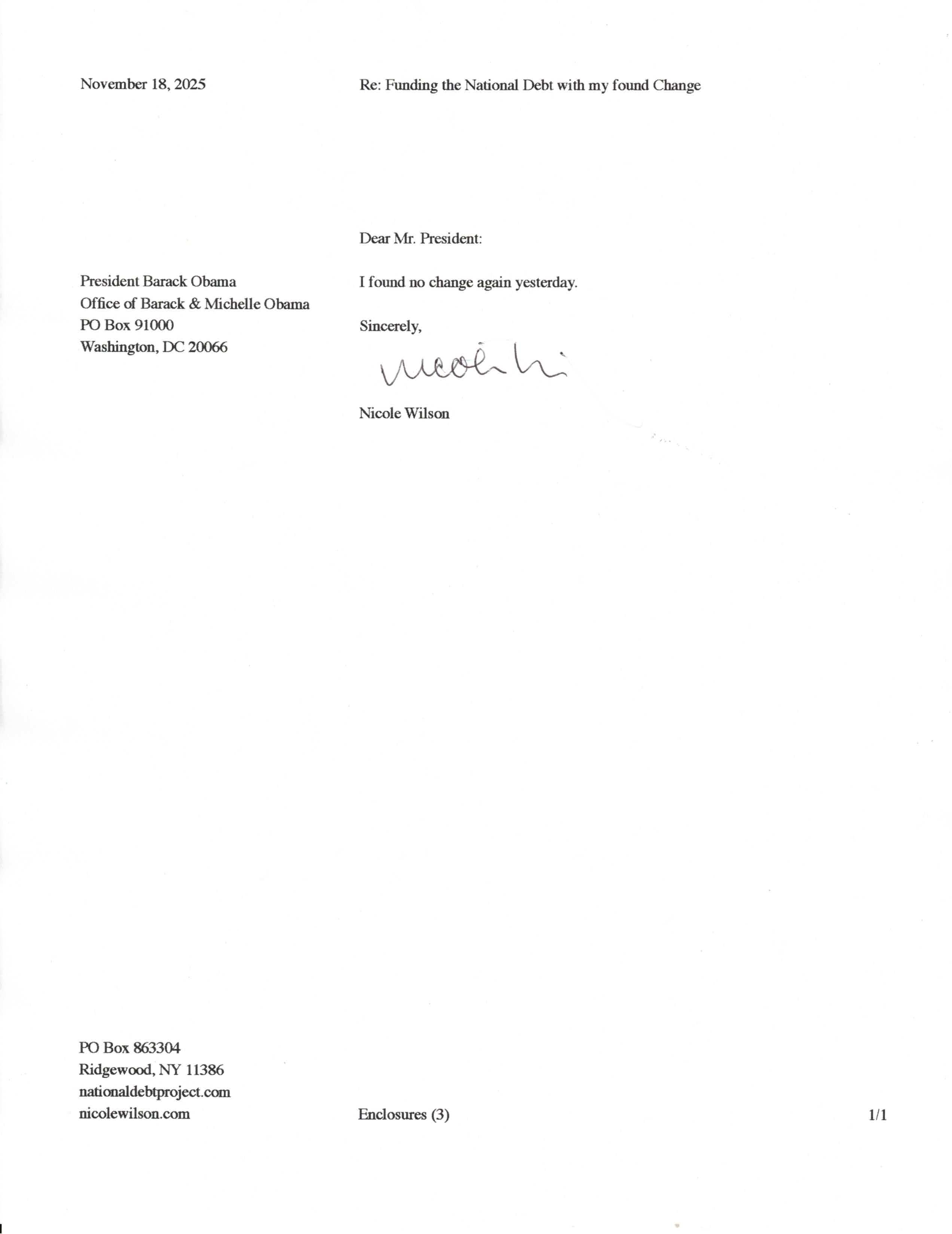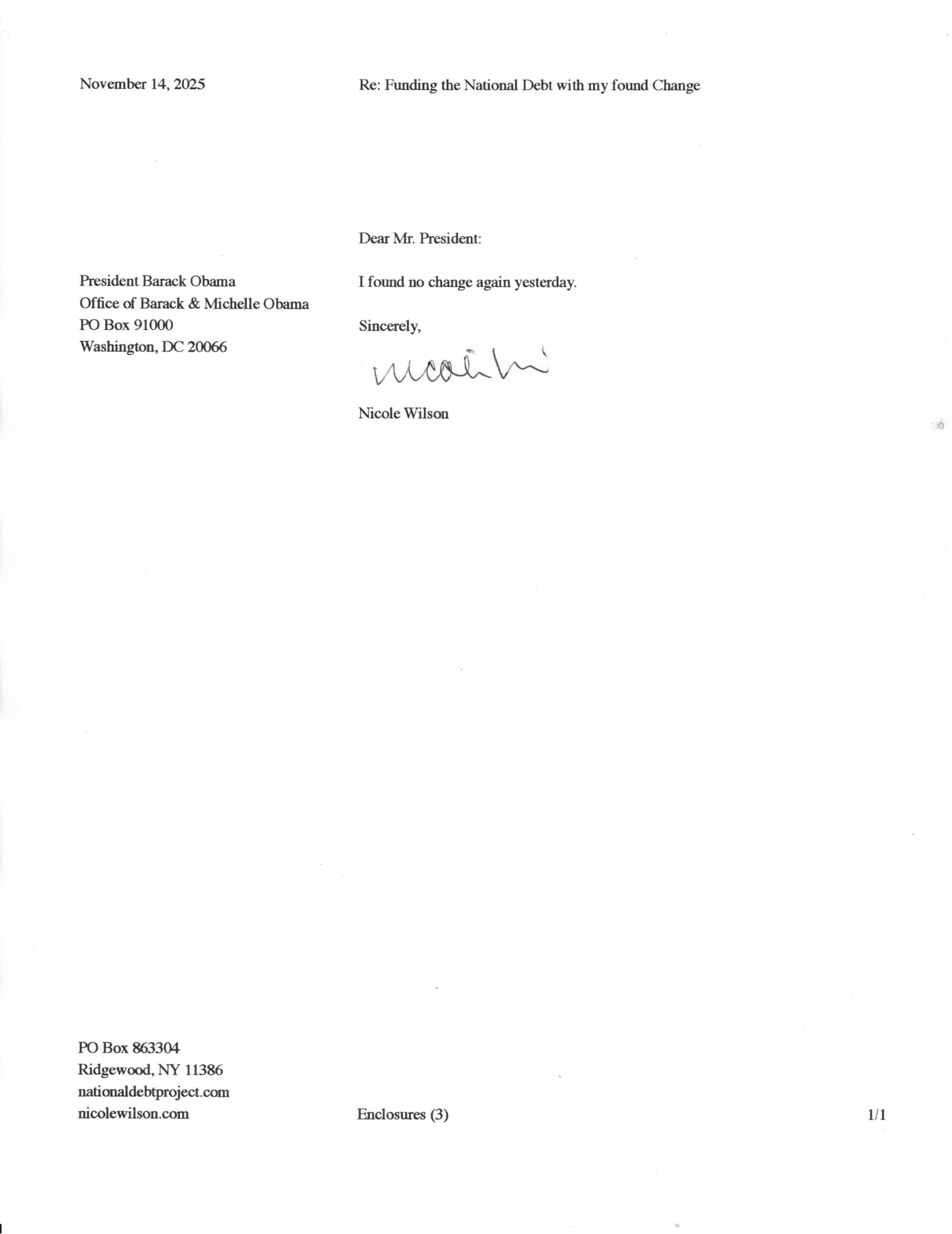 Yet, as I went through each day, I found at least one discarded penny. So, since August 31, 2009, I have sent my found change daily via certified mail to the Bureau of the Fiscal Service (previously the Bureau of the Public Debt), a sector of the Treasury Department whose purpose is to manage the deficit. If by some chance I do not find any change one day, then I send a penny of my own.
