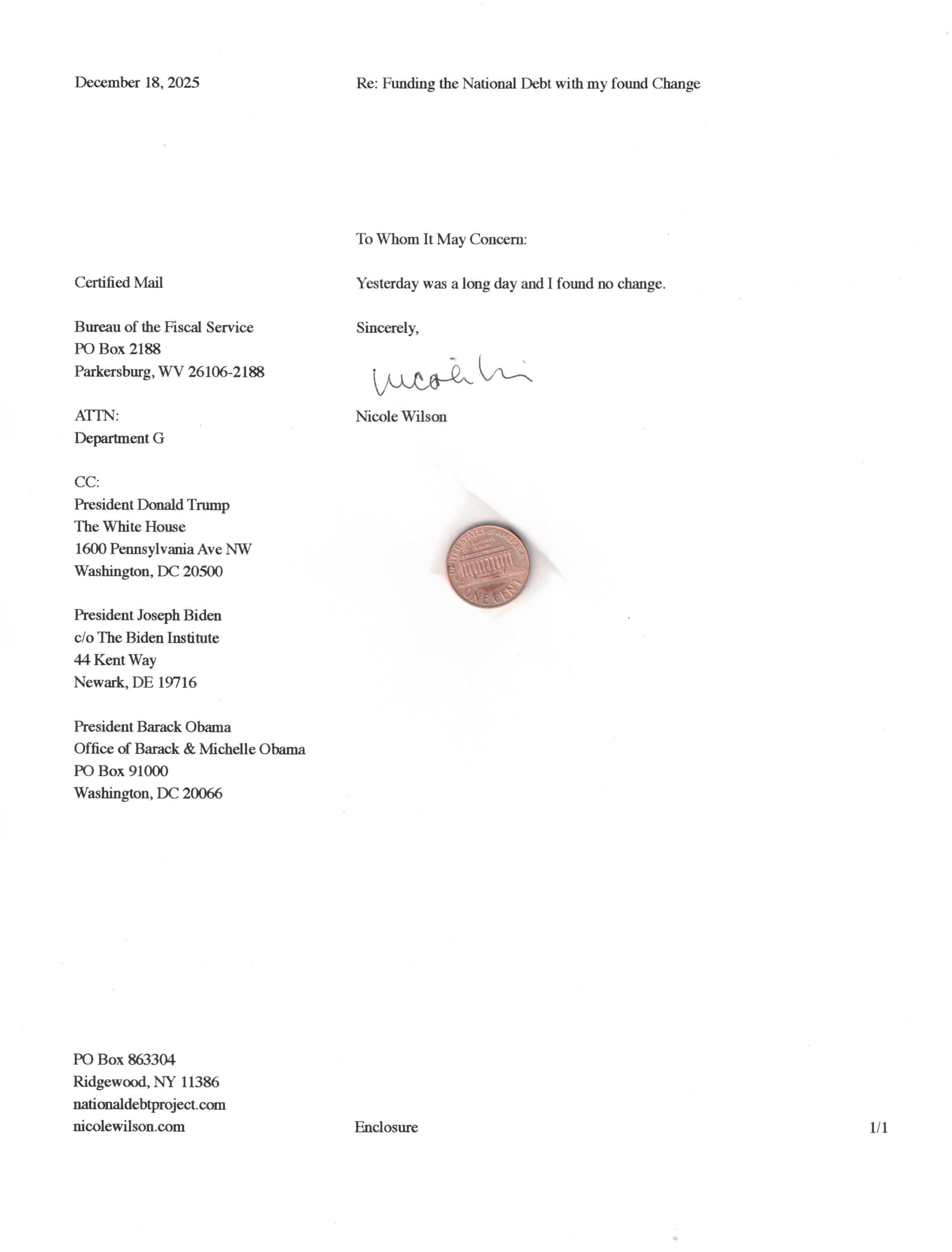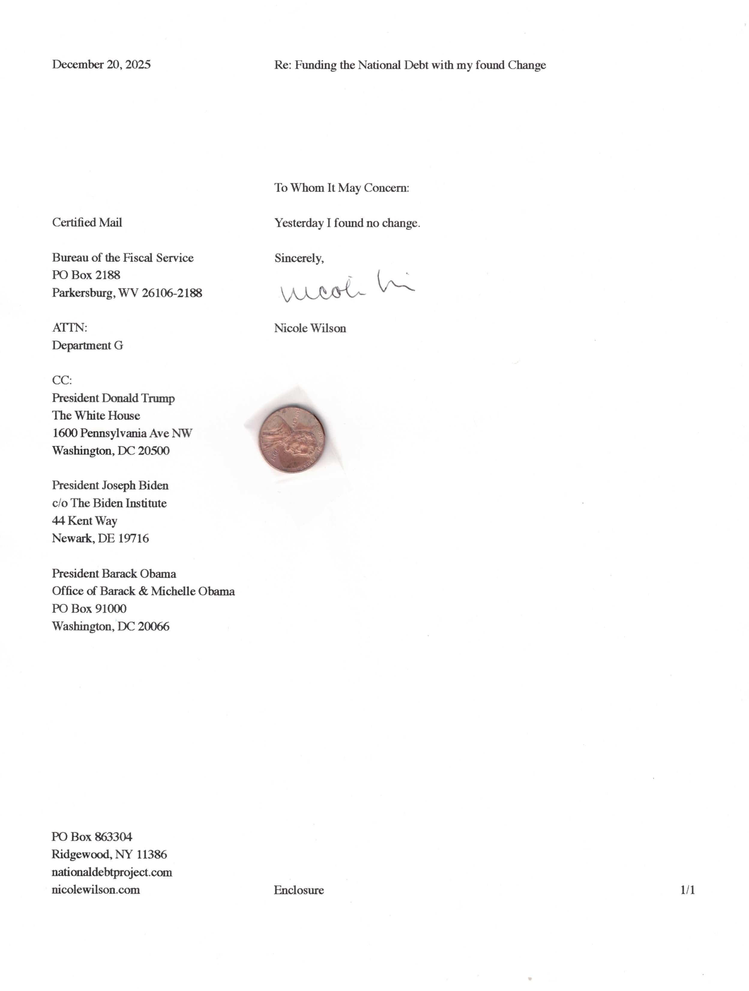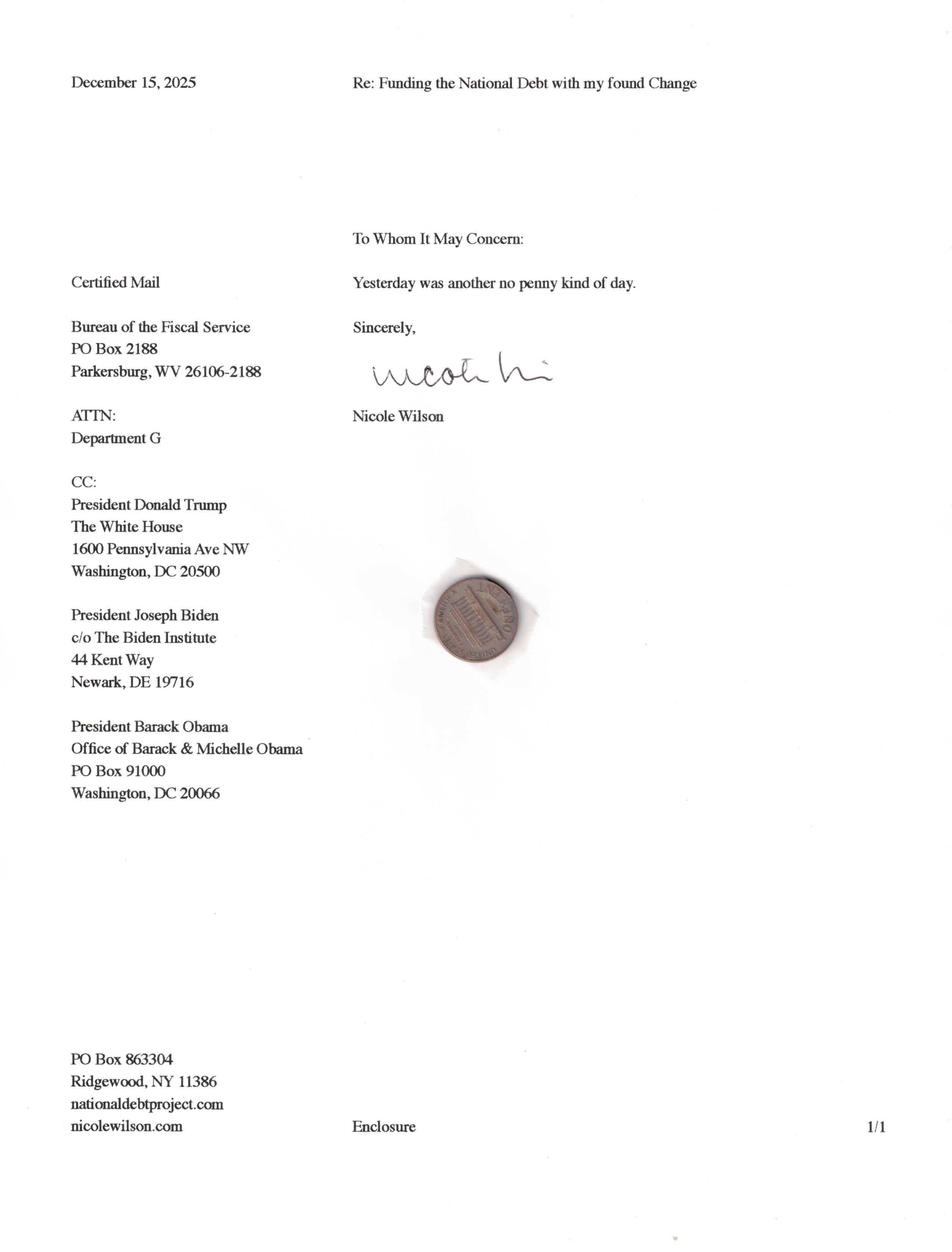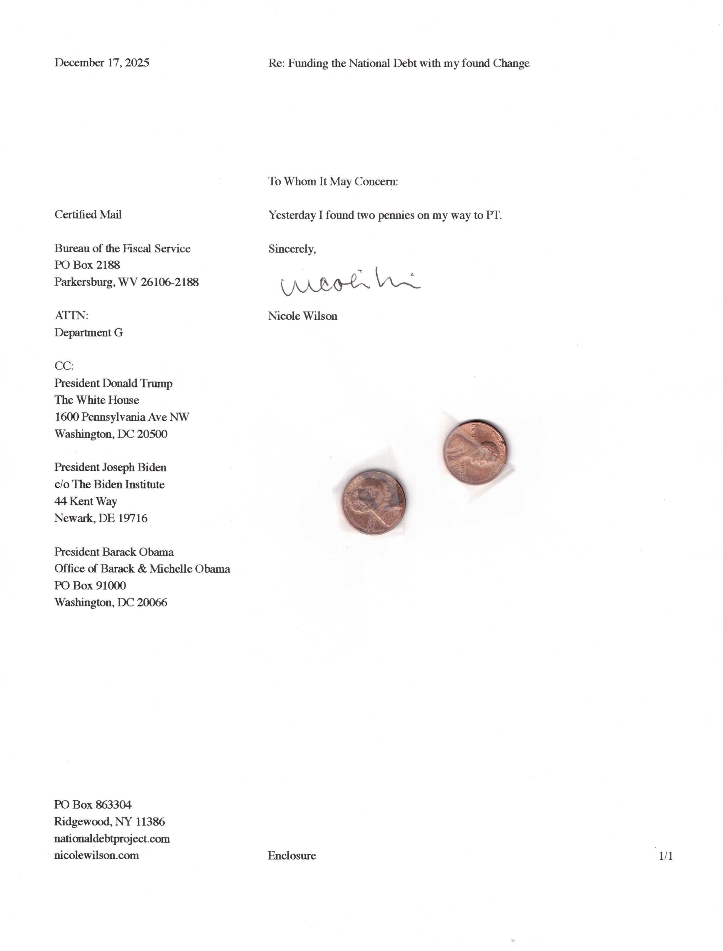 Yet, as I went through each day, I found at least one discarded penny. So, since August 31, 2009, I have sent my found change daily via certified mail to the Bureau of the Fiscal Service (previously the Bureau of the Public Debt), a sector of the Treasury Department whose purpose is to manage the deficit. If by some chance I do not find any change one day, then I send a penny of my own.