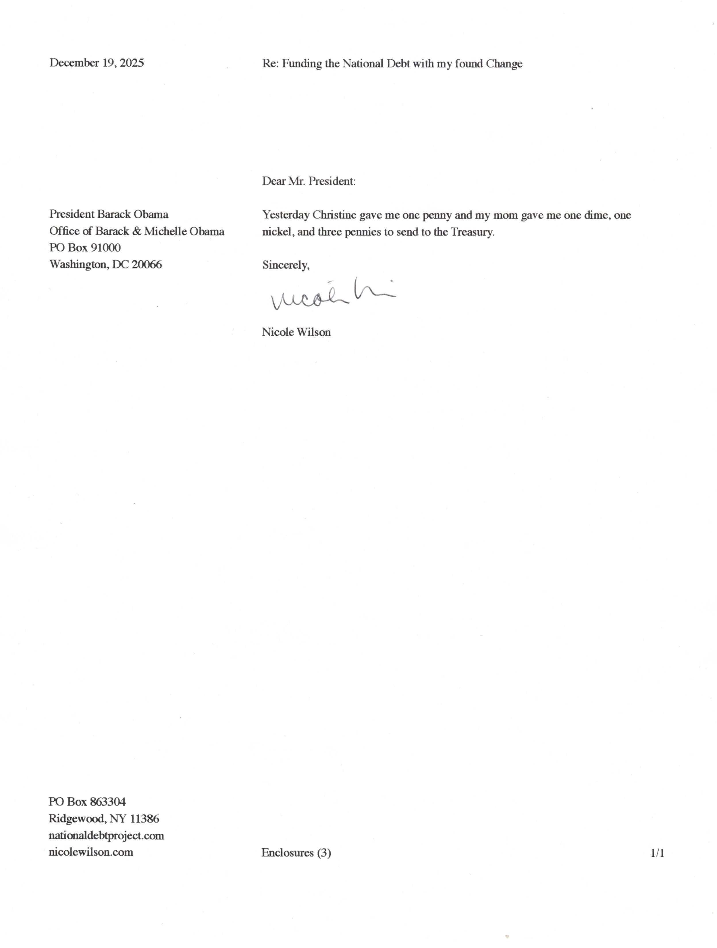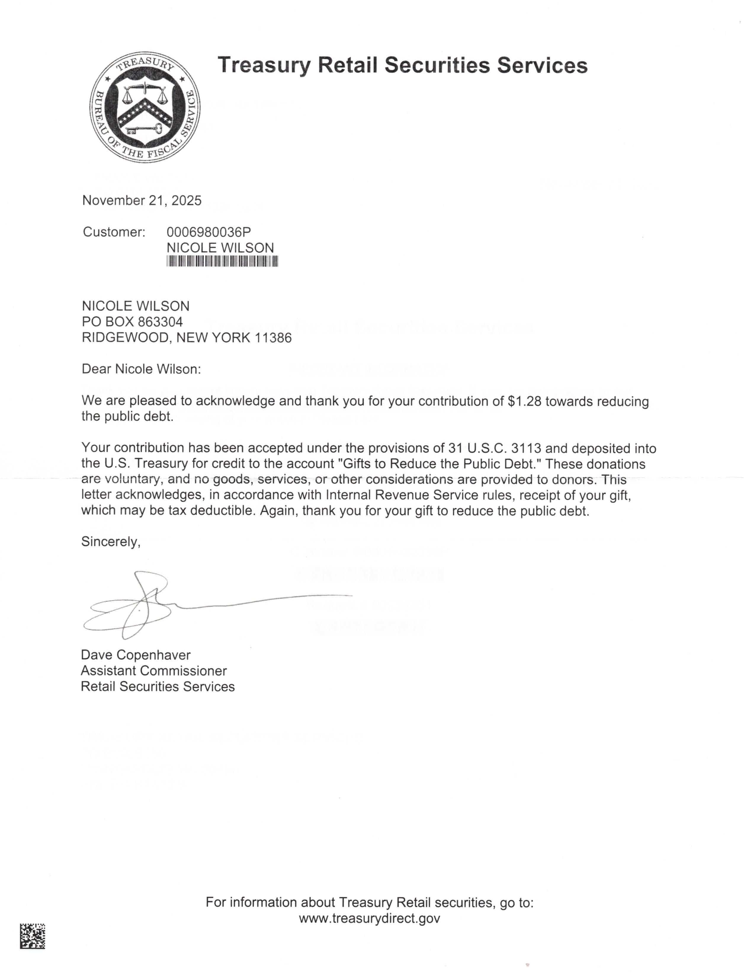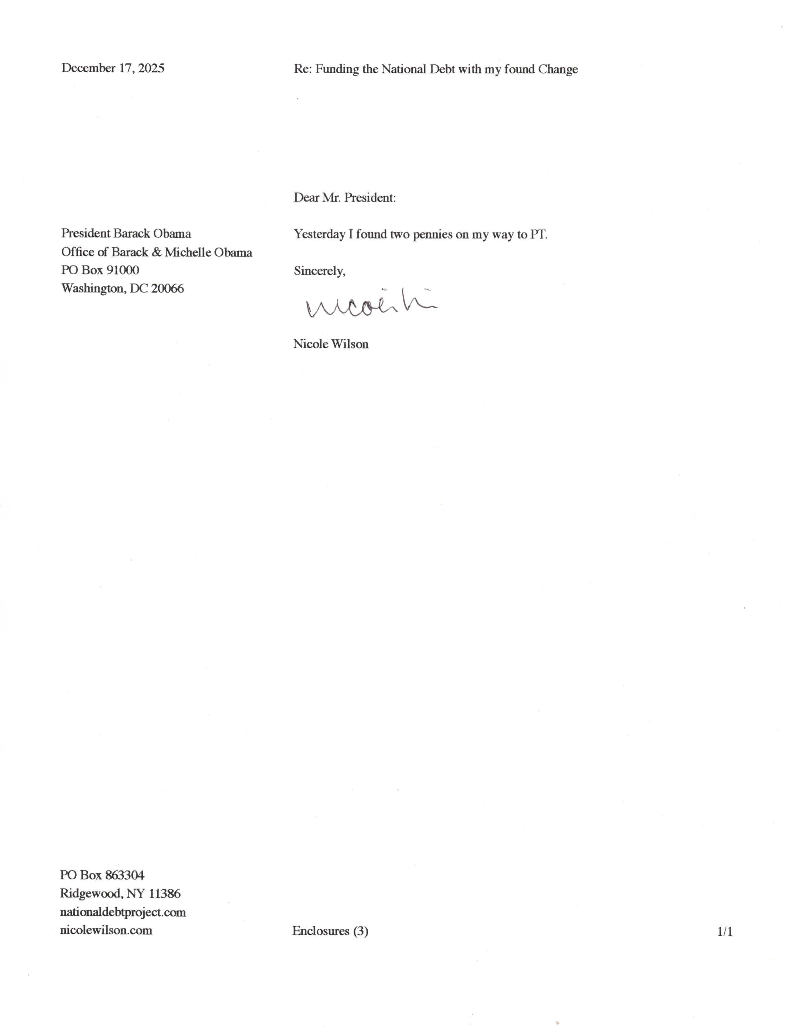 Yet, as I went through each day, I found at least one discarded penny. So, since August 31, 2009, I have sent my found change daily via certified mail to the Bureau of the Fiscal Service (previously the Bureau of the Public Debt), a sector of the Treasury Department whose purpose is to manage the deficit. If by some chance I do not find any change one day, then I send a penny of my own.