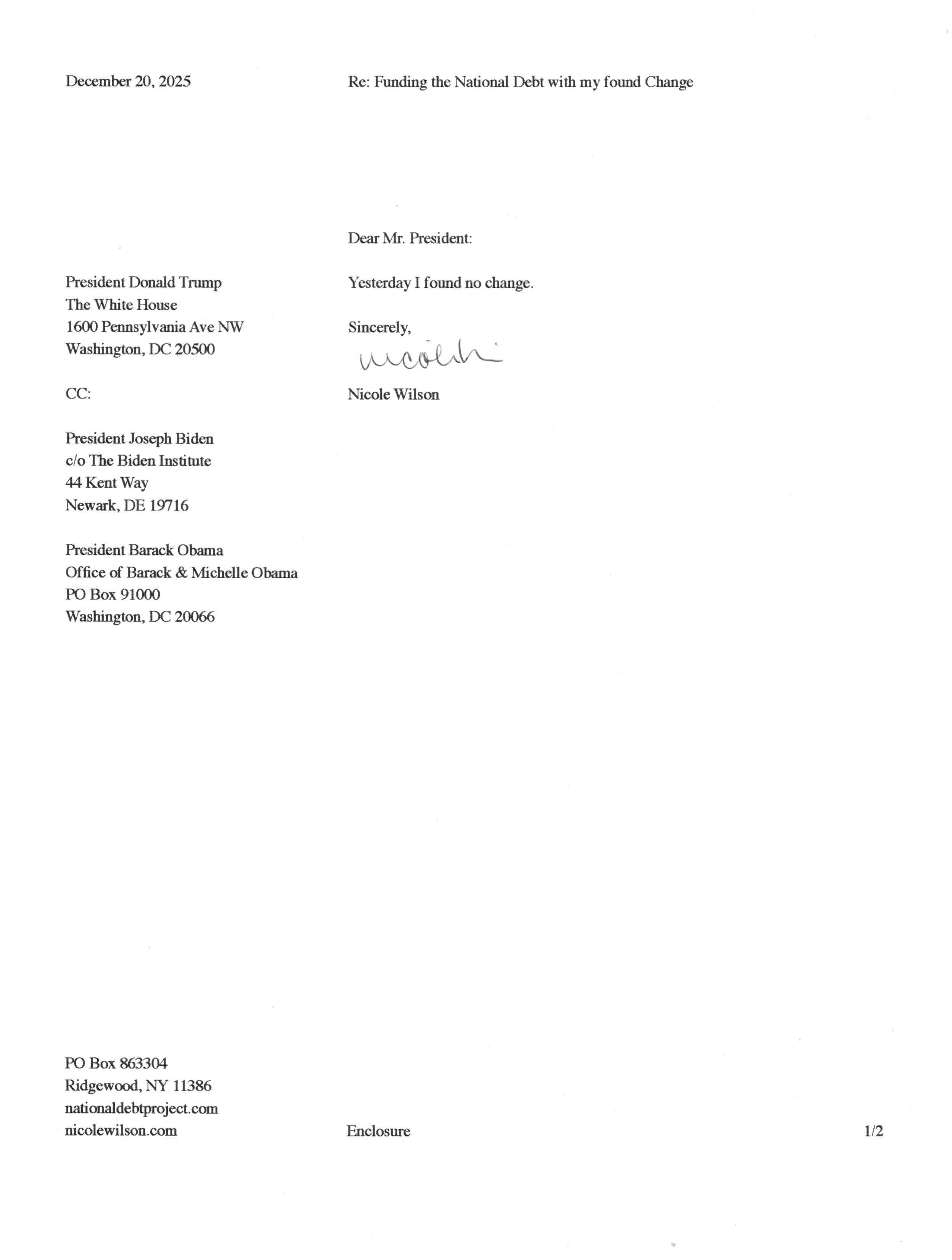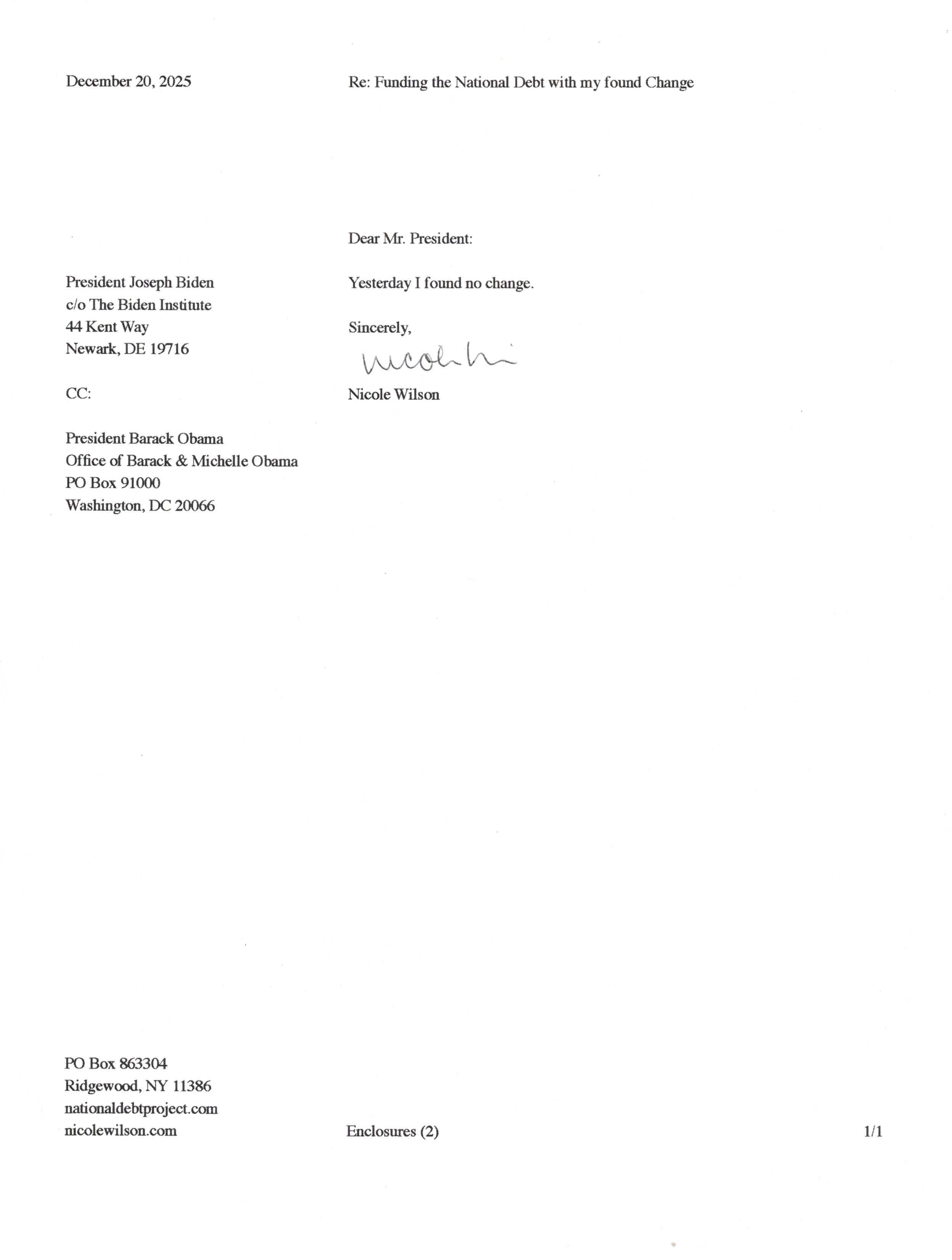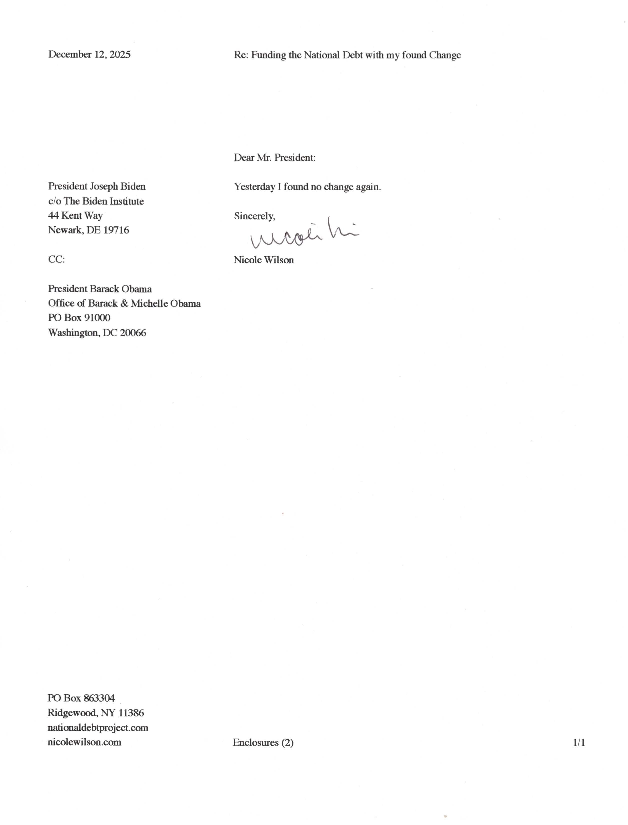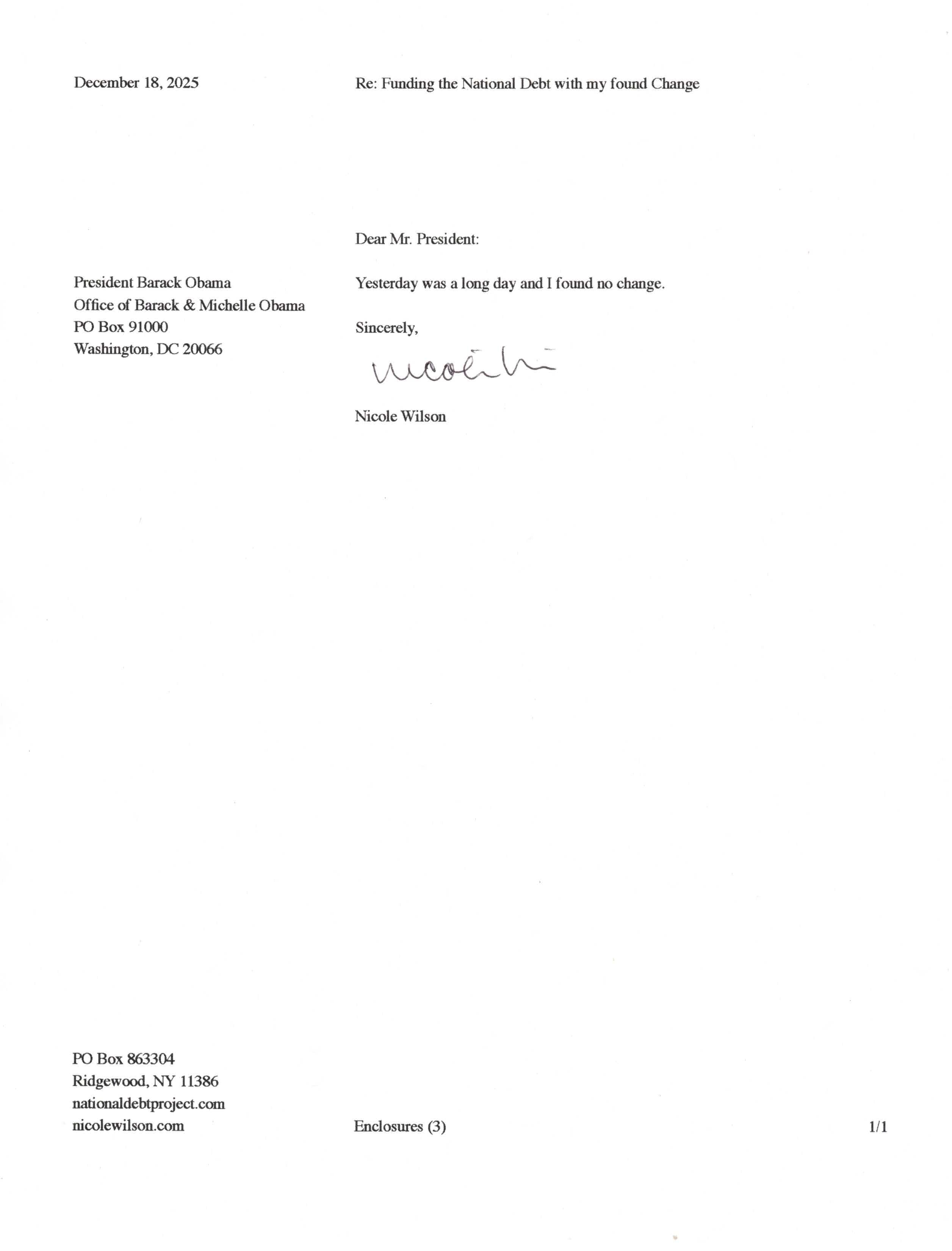 Yet, as I went through each day, I found at least one discarded penny. So, since August 31, 2009, I have sent my found change daily via certified mail to the Bureau of the Fiscal Service (previously the Bureau of the Public Debt), a sector of the Treasury Department whose purpose is to manage the deficit. If by some chance I do not find any change one day, then I send a penny of my own.