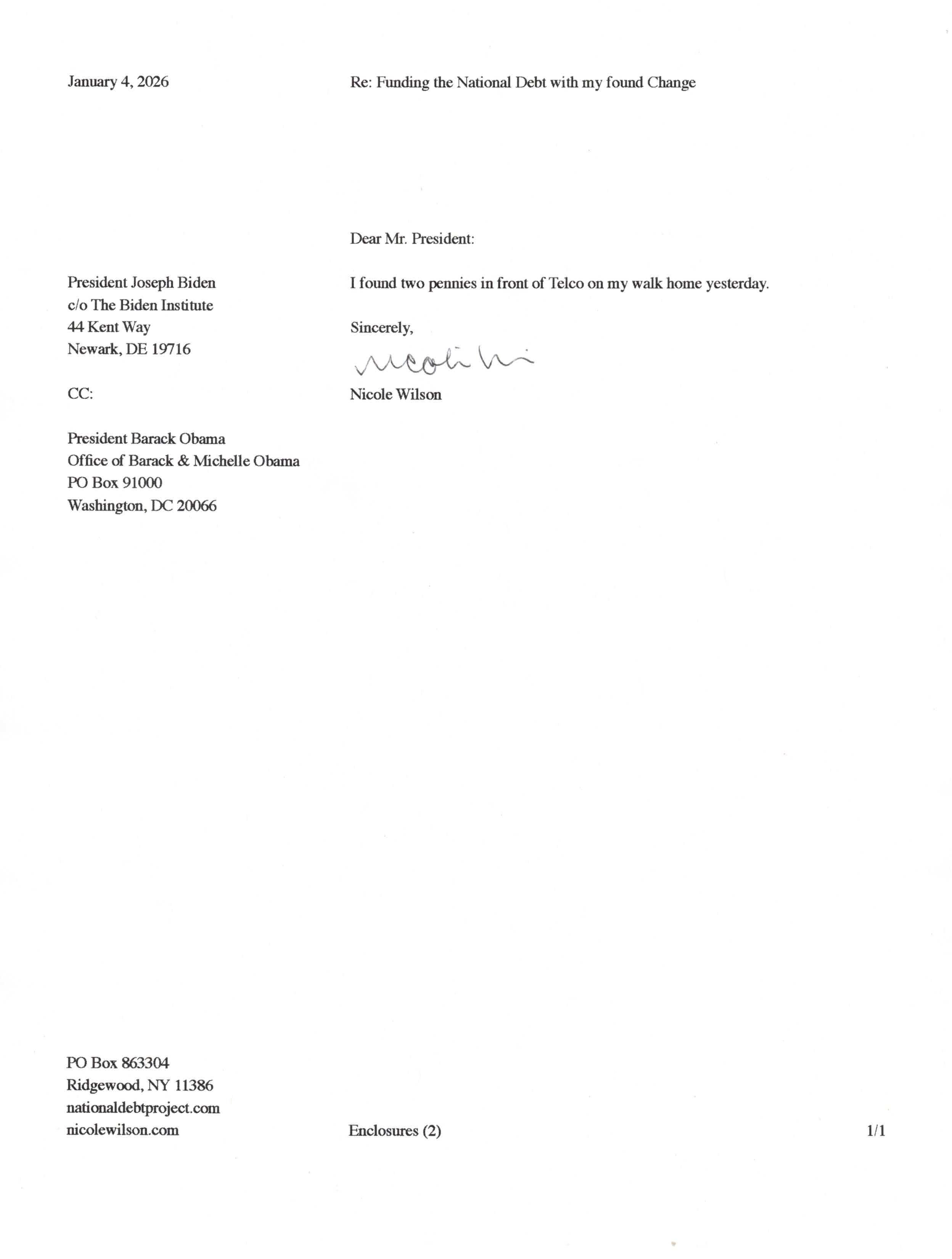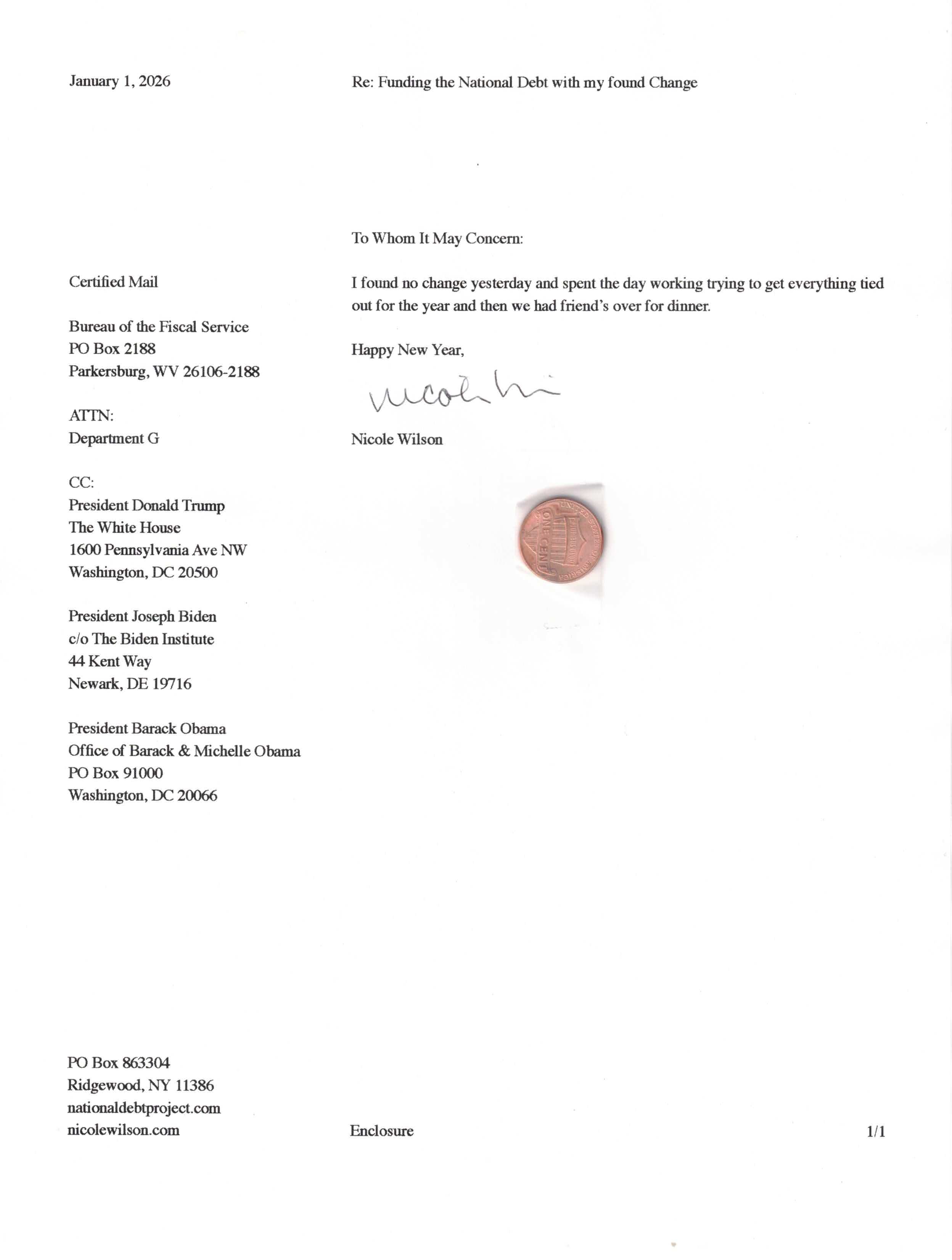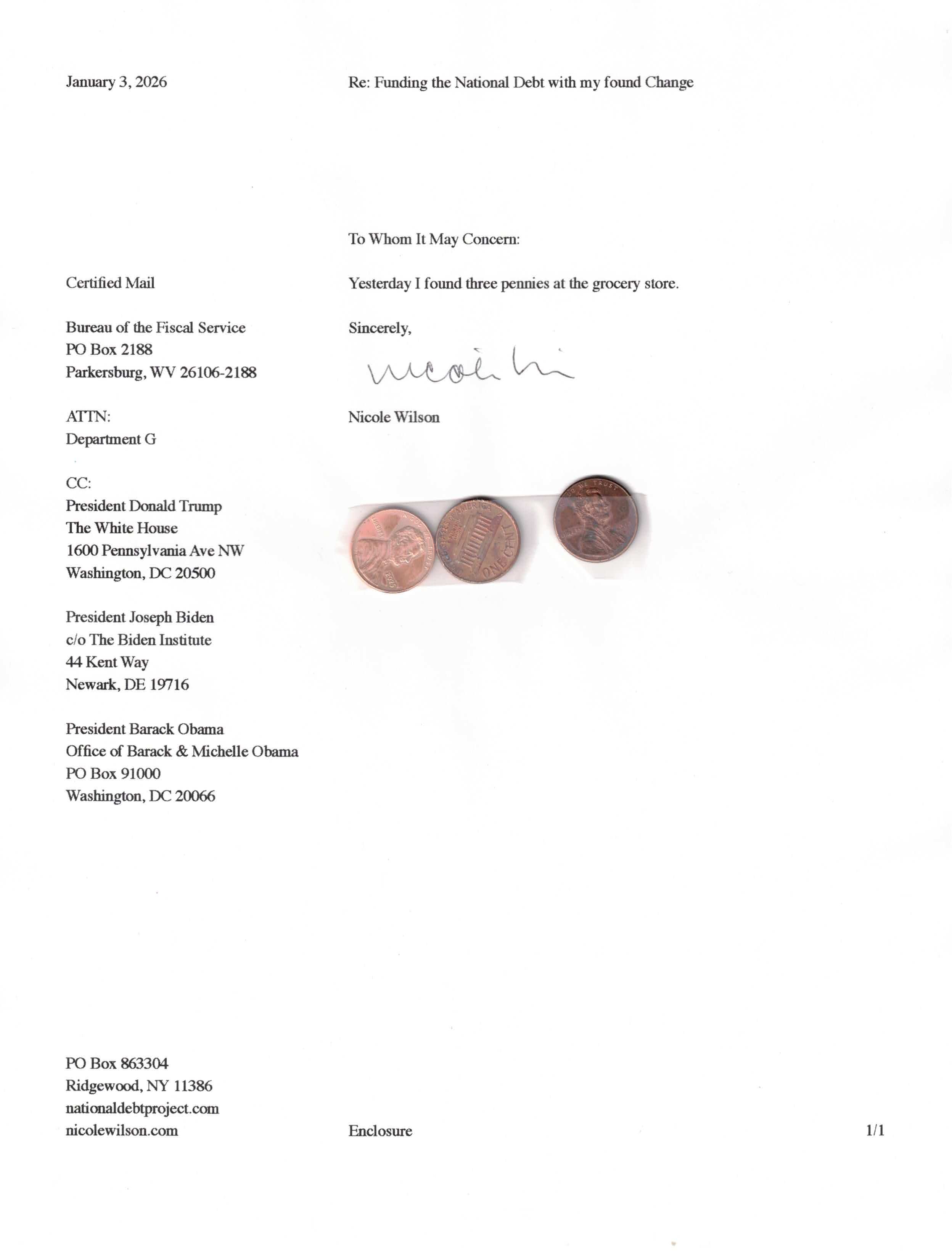 Yet, as I went through each day, I found at least one discarded penny. So, since August 31, 2009, I have sent my found change daily via certified mail to the Bureau of the Fiscal Service (previously the Bureau of the Public Debt), a sector of the Treasury Department whose purpose is to manage the deficit. If by some chance I do not find any change one day, then I send a penny of my own.
