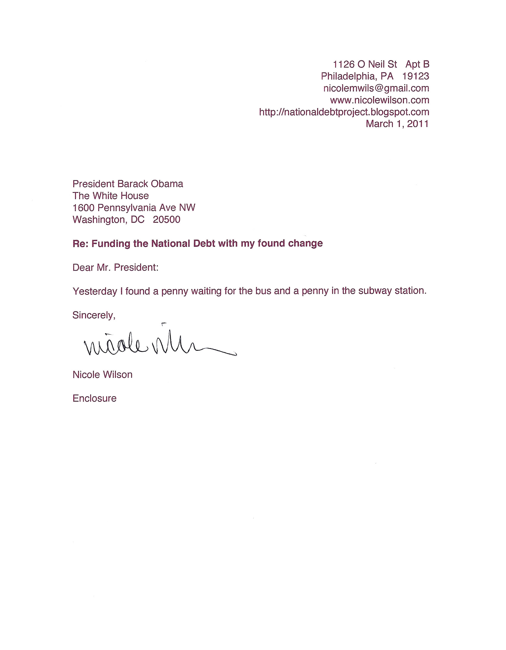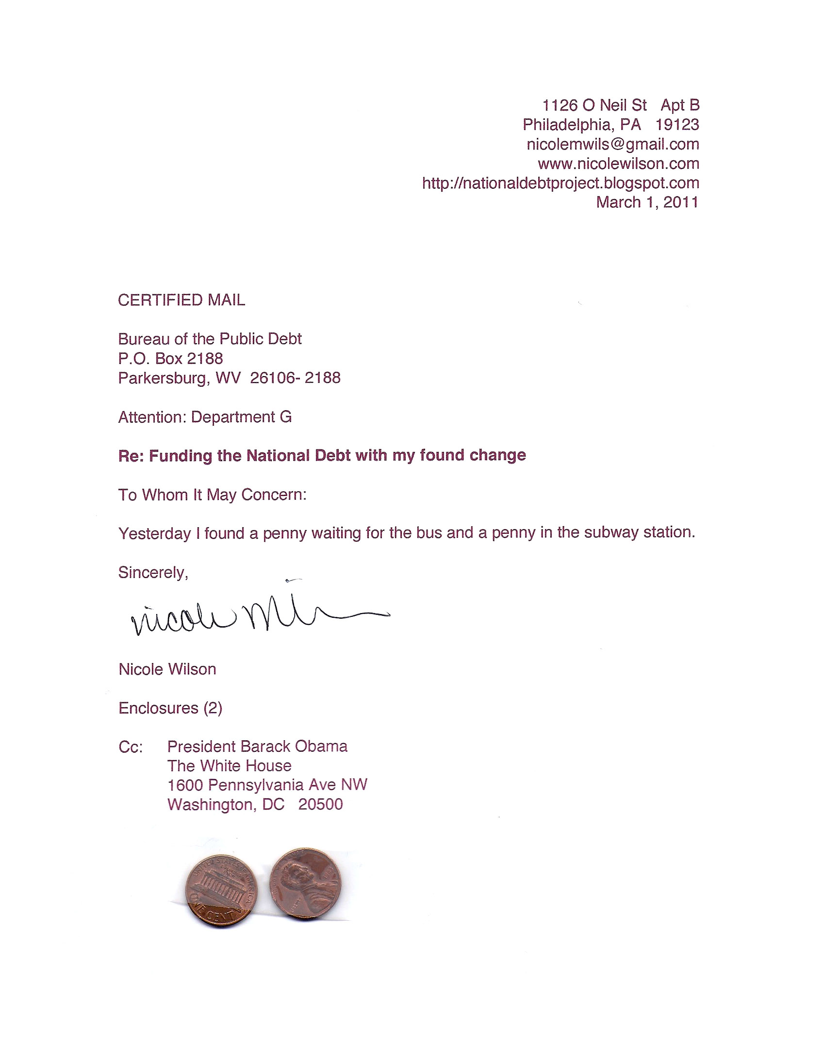 Yet, as I went through each day, I found at least one discarded penny. So, since August 31, 2009, I have sent my found change daily via certified mail to the Bureau of the Fiscal Service (previously the Bureau of the Public Debt), a sector of the Treasury Department whose purpose is to manage the deficit. If by some chance I do not find any change one day, then I send a penny of my own.