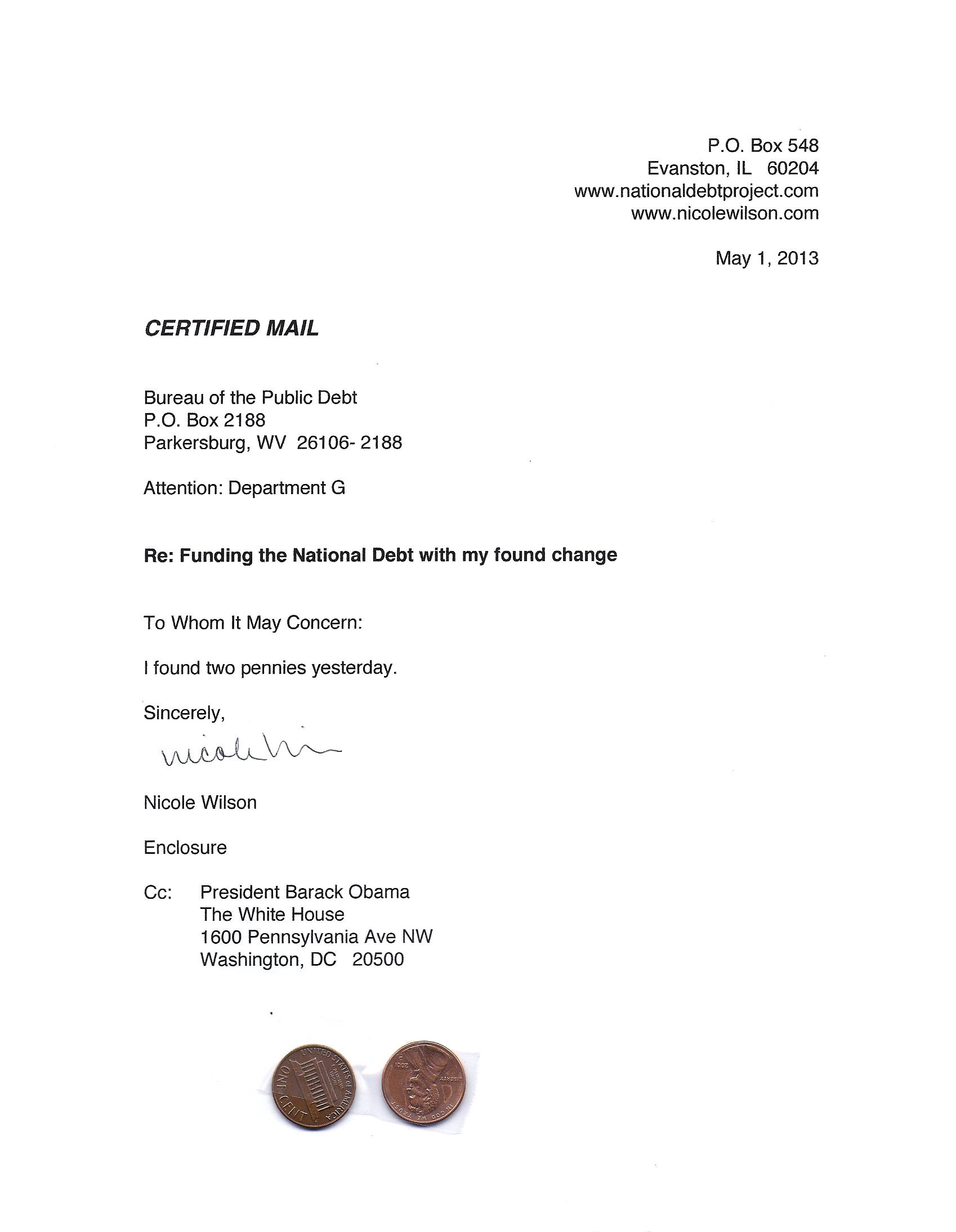 Yet, as I went through each day, I found at least one discarded penny. So, since August 31, 2009, I have sent my found change daily via certified mail to the Bureau of the Fiscal Service (previously the Bureau of the Public Debt), a sector of the Treasury Department whose purpose is to manage the deficit. If by some chance I do not find any change one day, then I send a penny of my own.