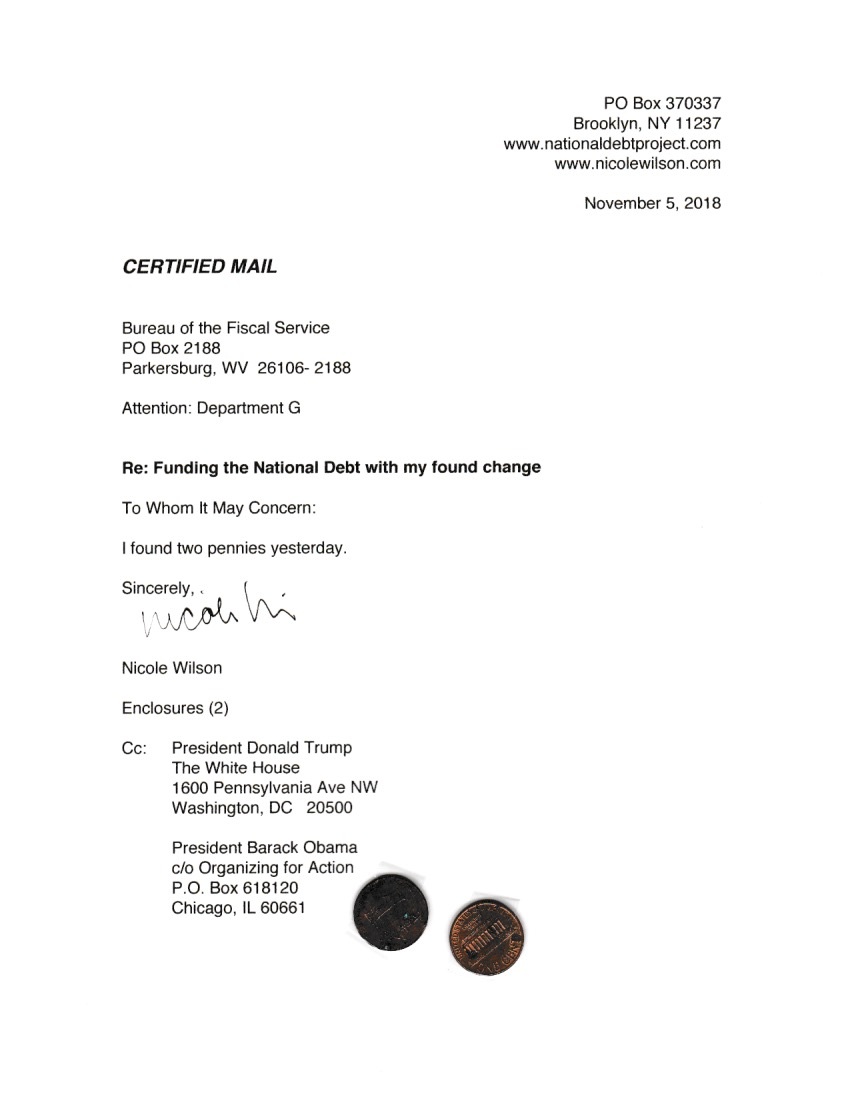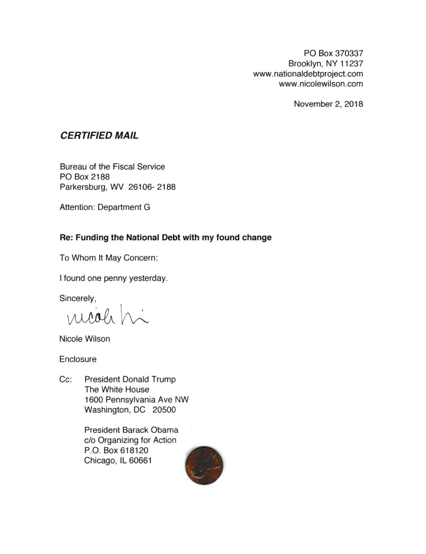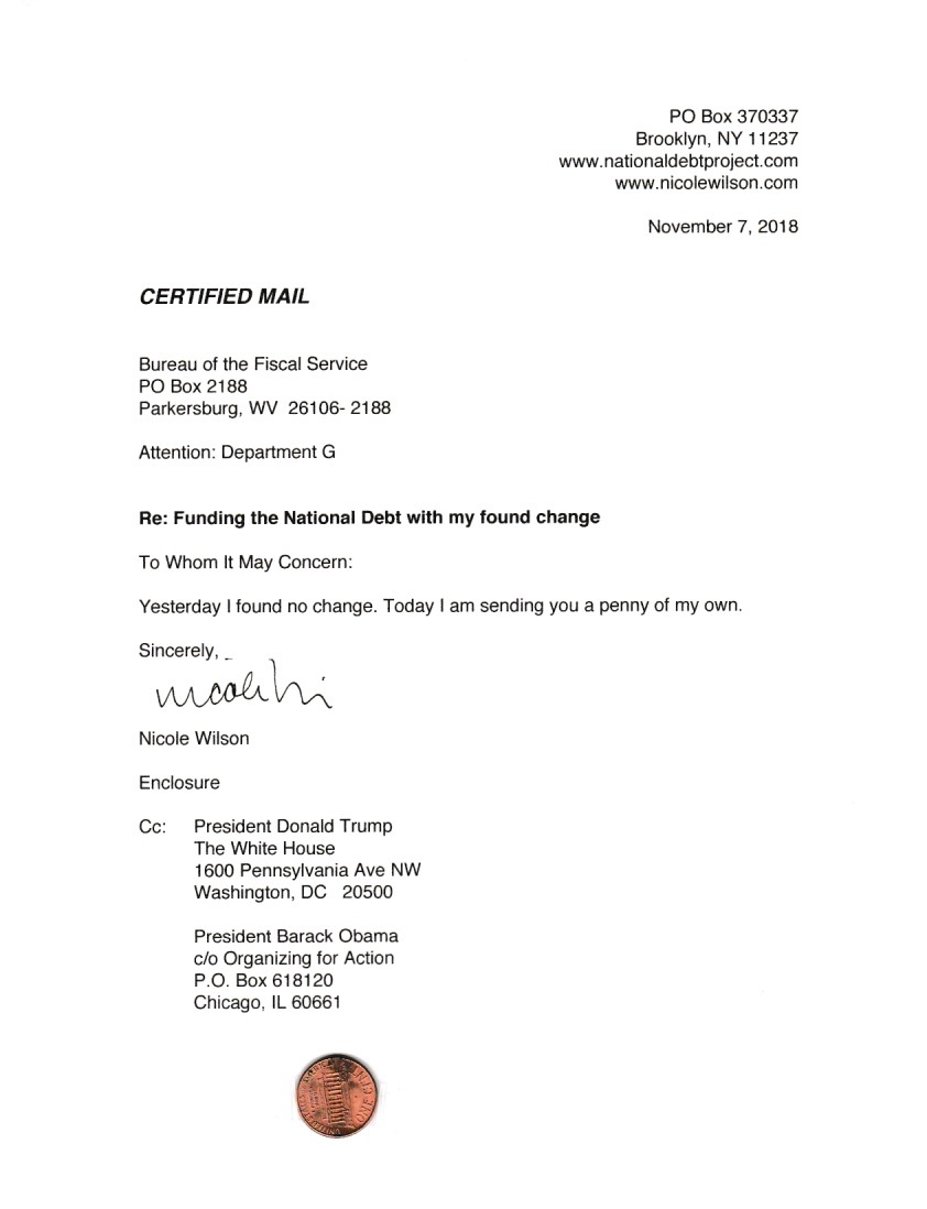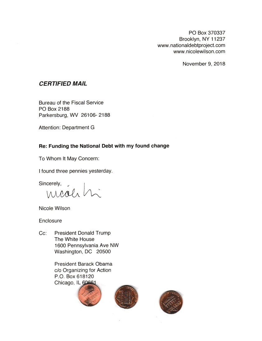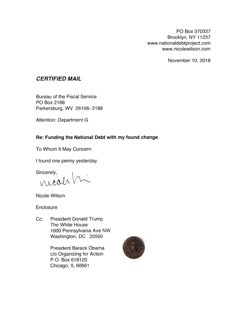 Yet, as I went through each day, I found at least one discarded penny. So, since August 31, 2009, I have sent my found change daily via certified mail to the Bureau of the Fiscal Service (previously the Bureau of the Public Debt), a sector of the Treasury Department whose purpose is to manage the deficit. If by some chance I do not find any change one day, then I send a penny of my own.