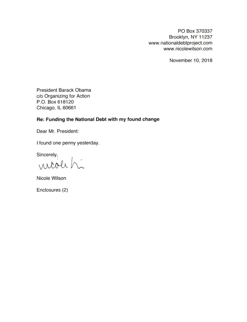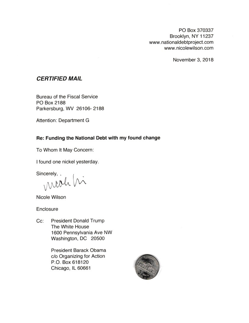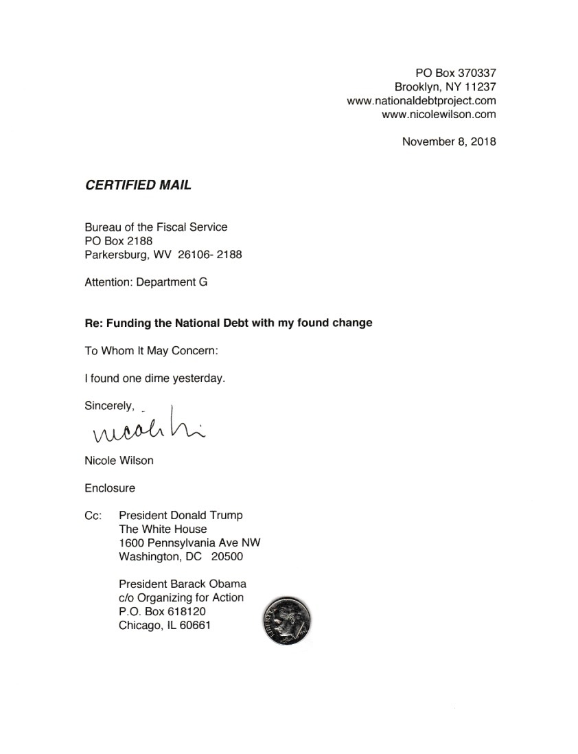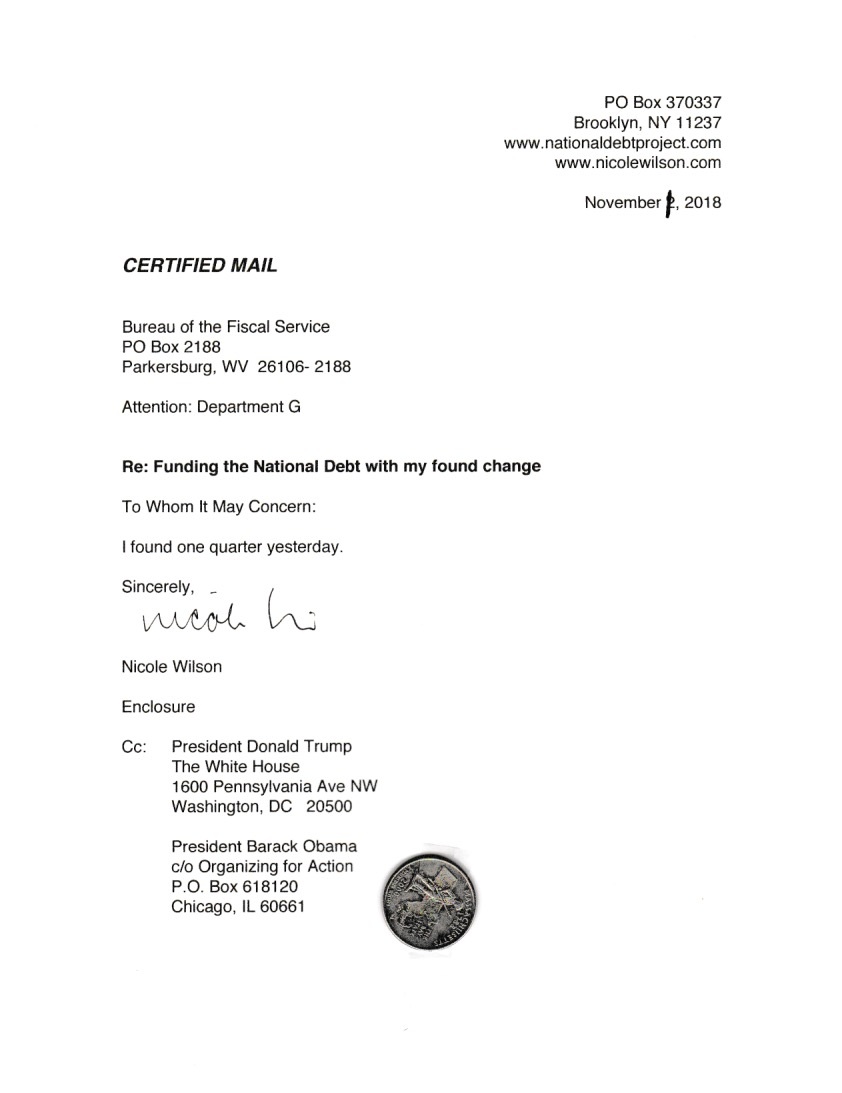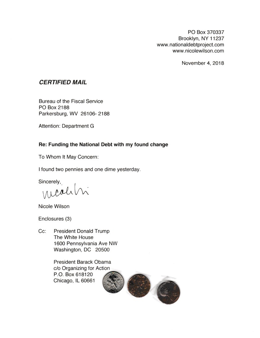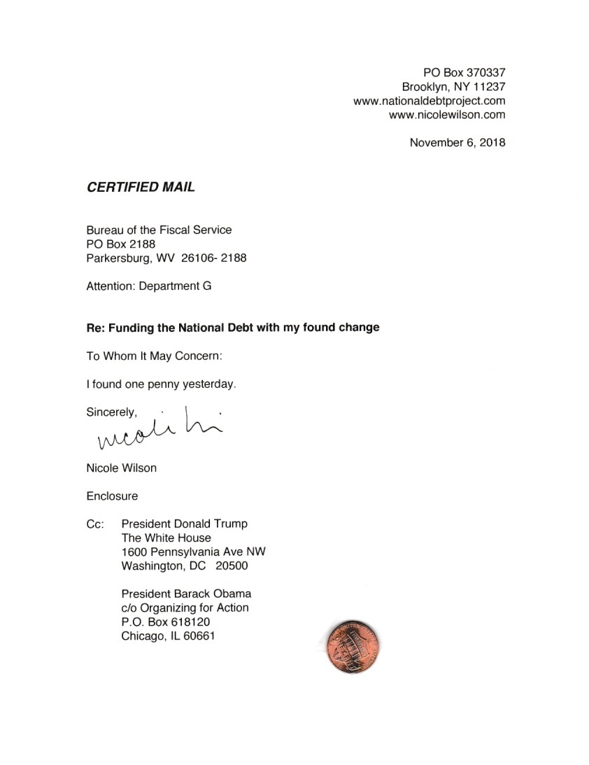 Yet, as I went through each day, I found at least one discarded penny. So, since August 31, 2009, I have sent my found change daily via certified mail to the Bureau of the Fiscal Service (previously the Bureau of the Public Debt), a sector of the Treasury Department whose purpose is to manage the deficit. If by some chance I do not find any change one day, then I send a penny of my own.