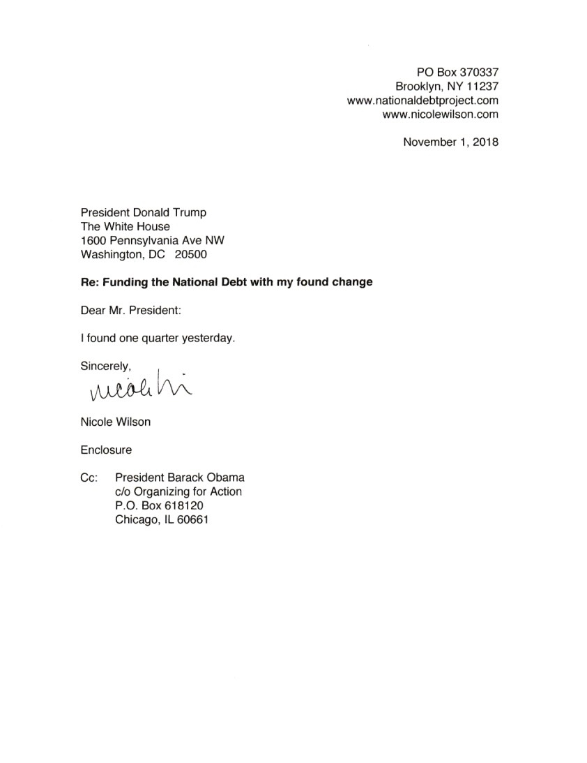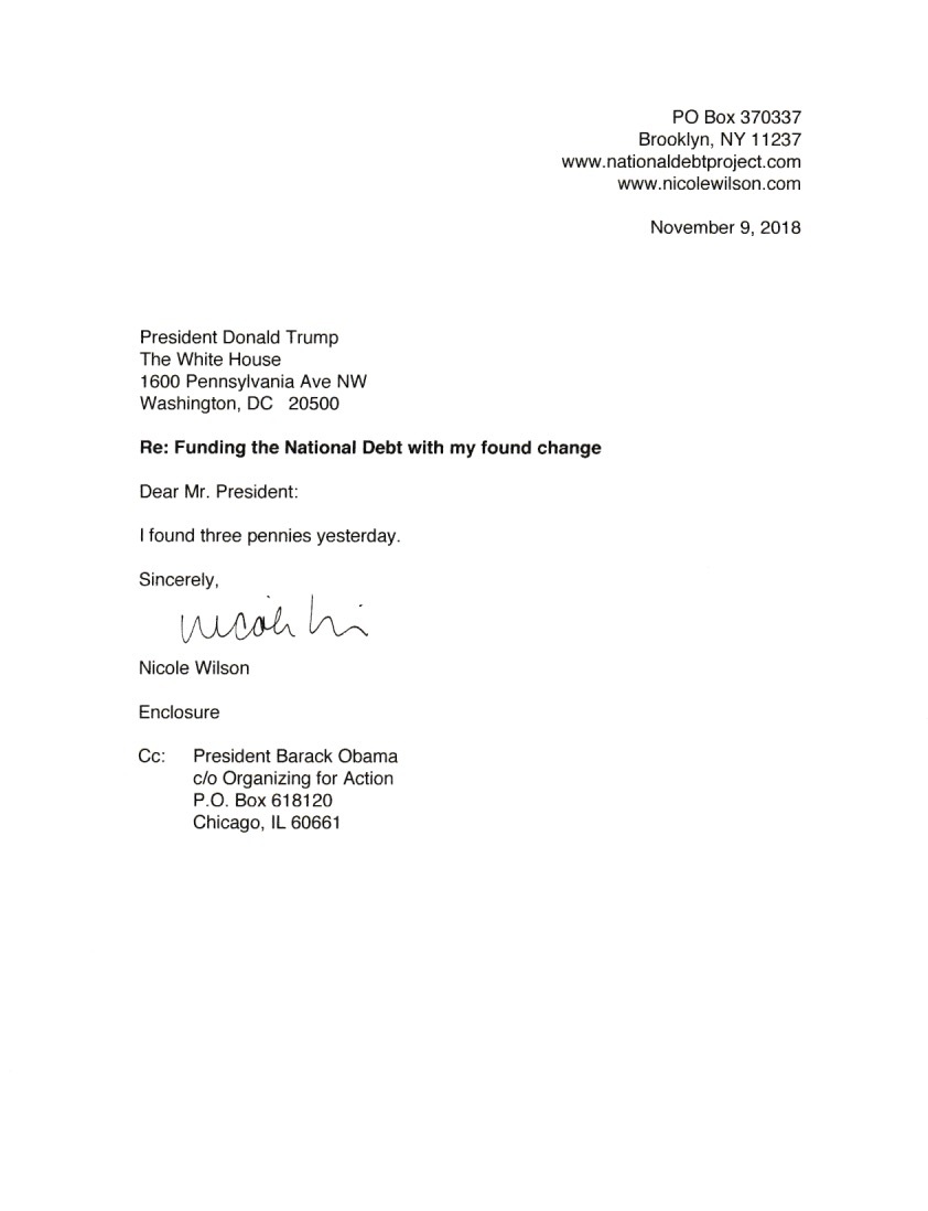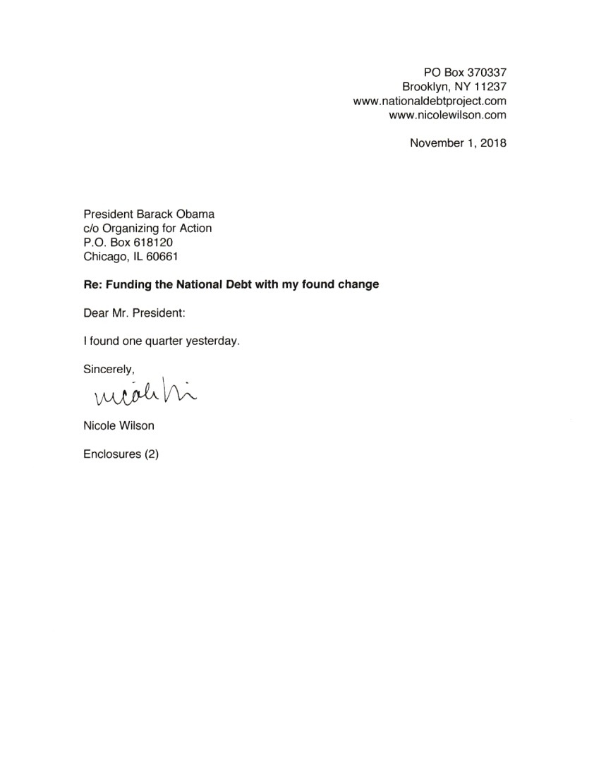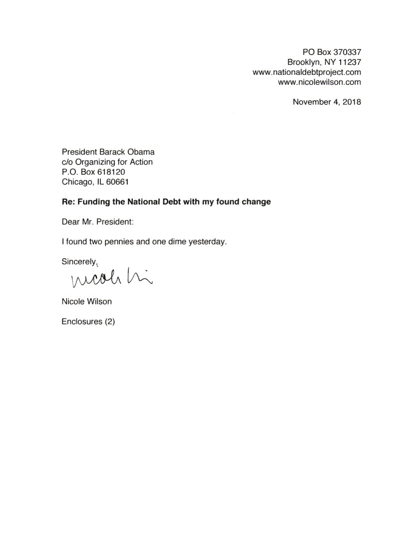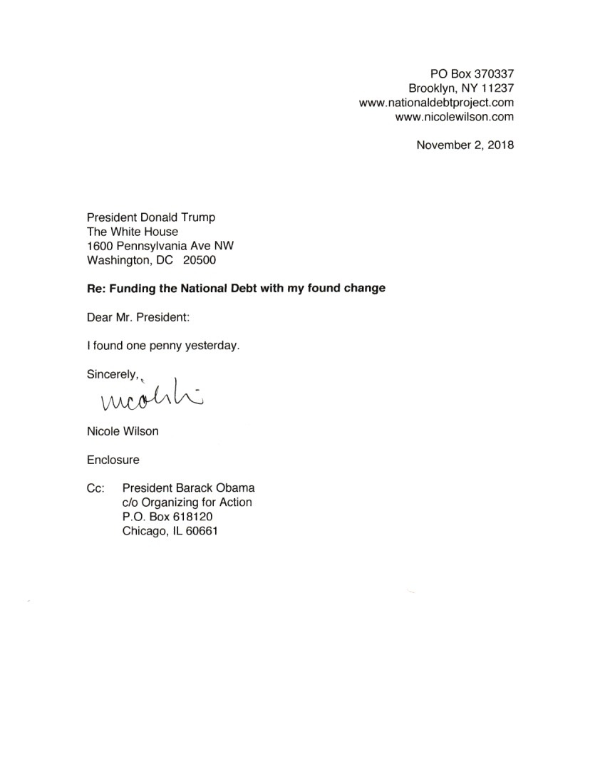 Yet, as I went through each day, I found at least one discarded penny. So, since August 31, 2009, I have sent my found change daily via certified mail to the Bureau of the Fiscal Service (previously the Bureau of the Public Debt), a sector of the Treasury Department whose purpose is to manage the deficit. If by some chance I do not find any change one day, then I send a penny of my own.