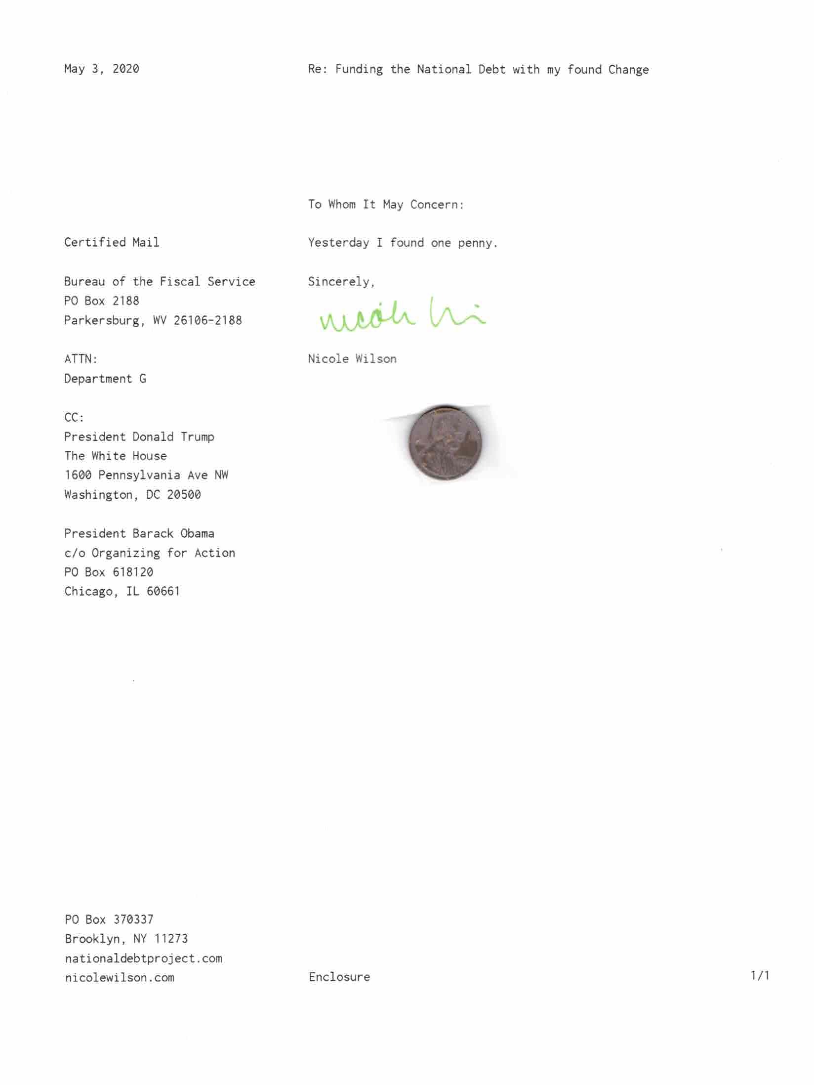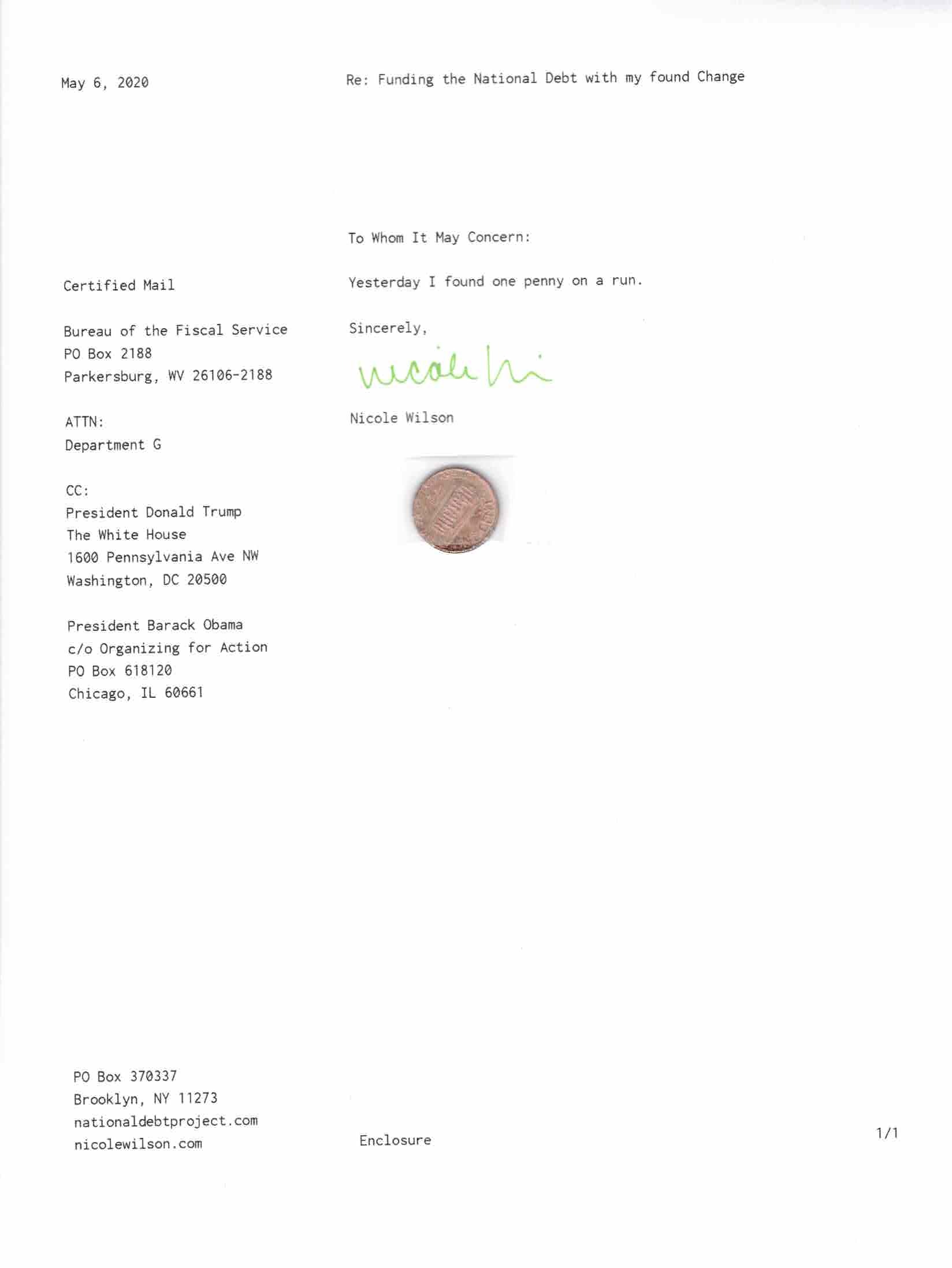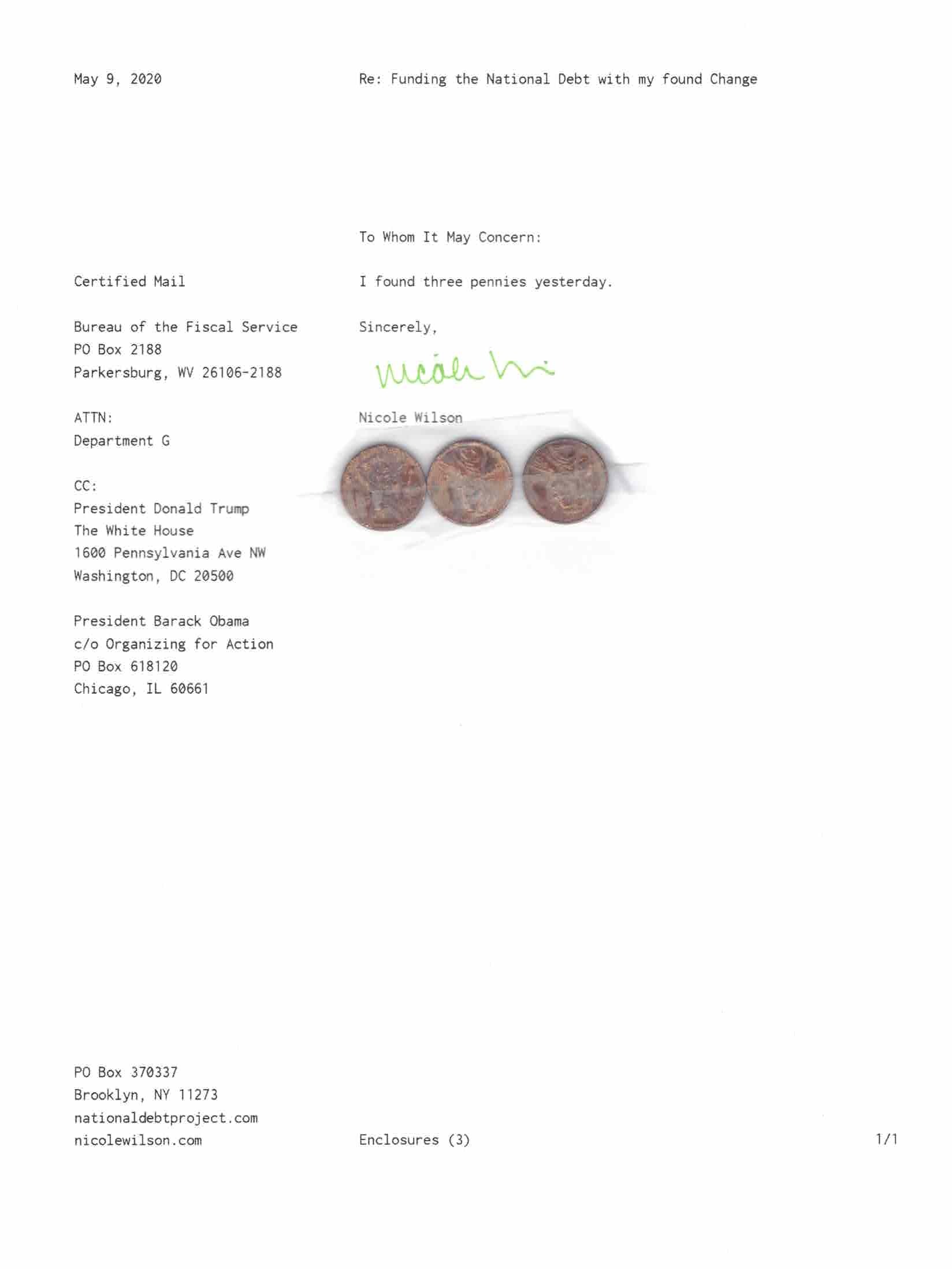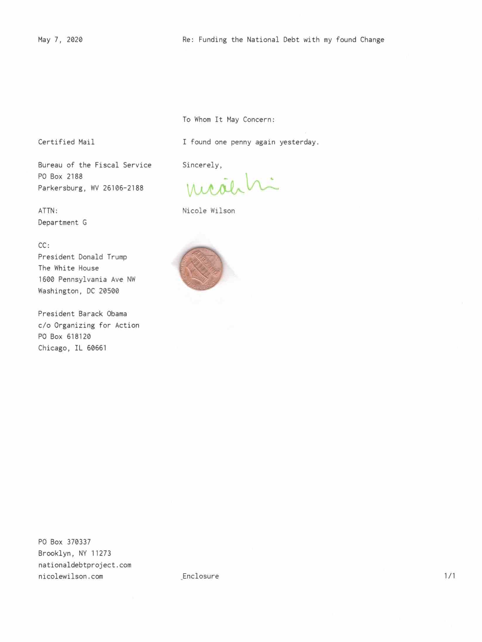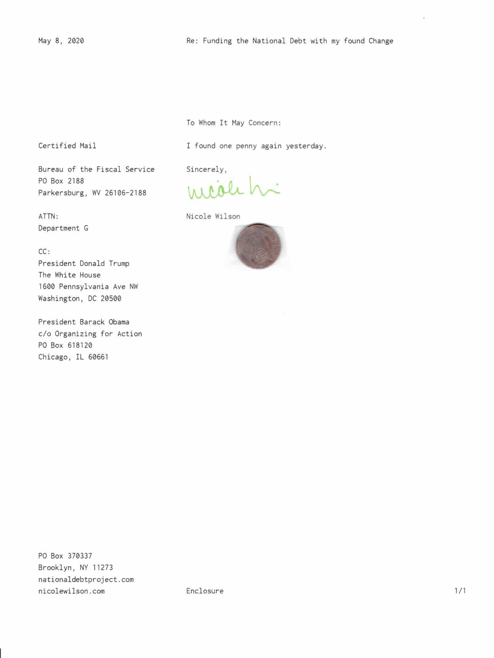 Yet, as I went through each day, I found at least one discarded penny. So, since August 31, 2009, I have sent my found change daily via certified mail to the Bureau of the Fiscal Service (previously the Bureau of the Public Debt), a sector of the Treasury Department whose purpose is to manage the deficit. If by some chance I do not find any change one day, then I send a penny of my own.