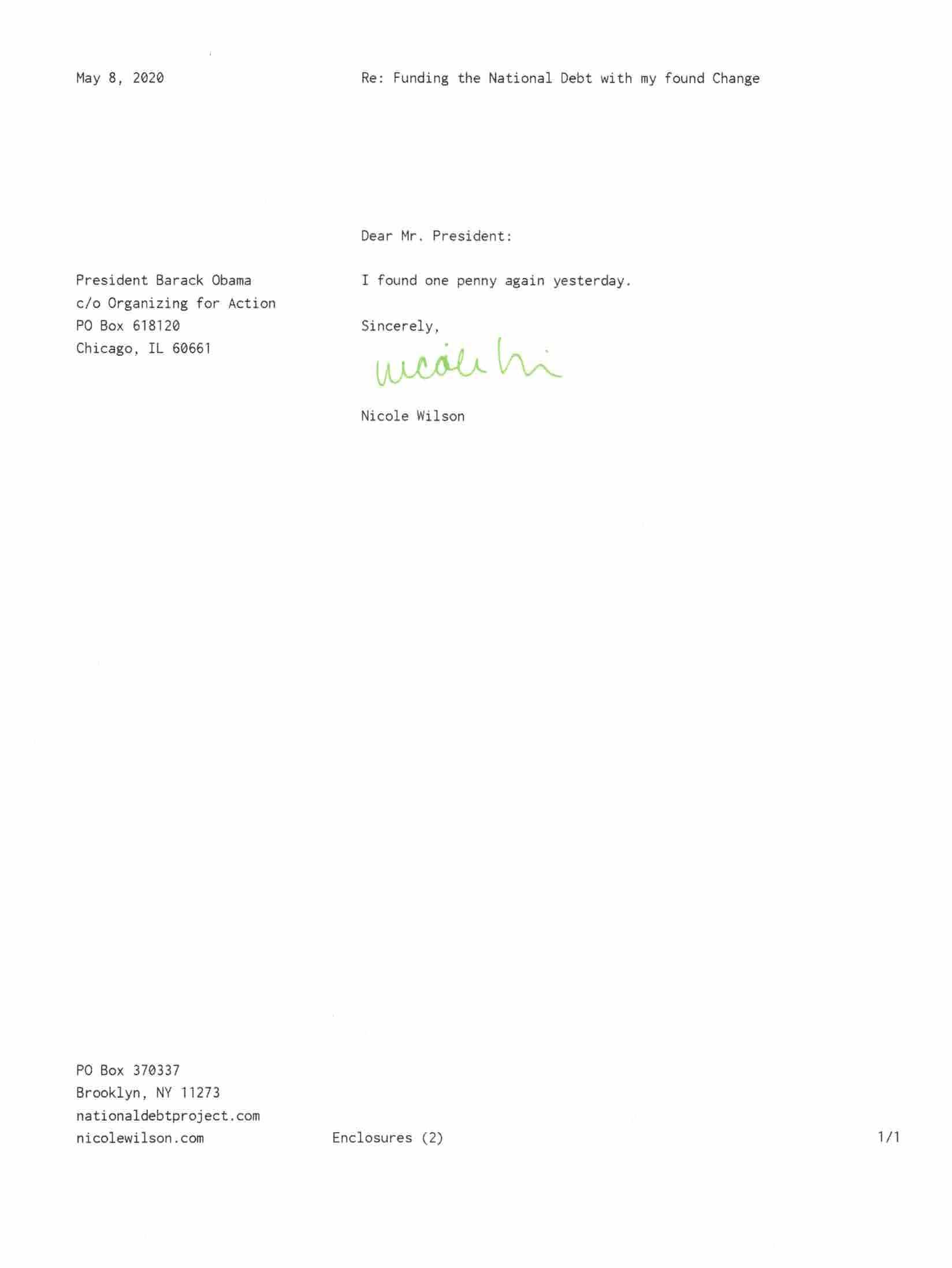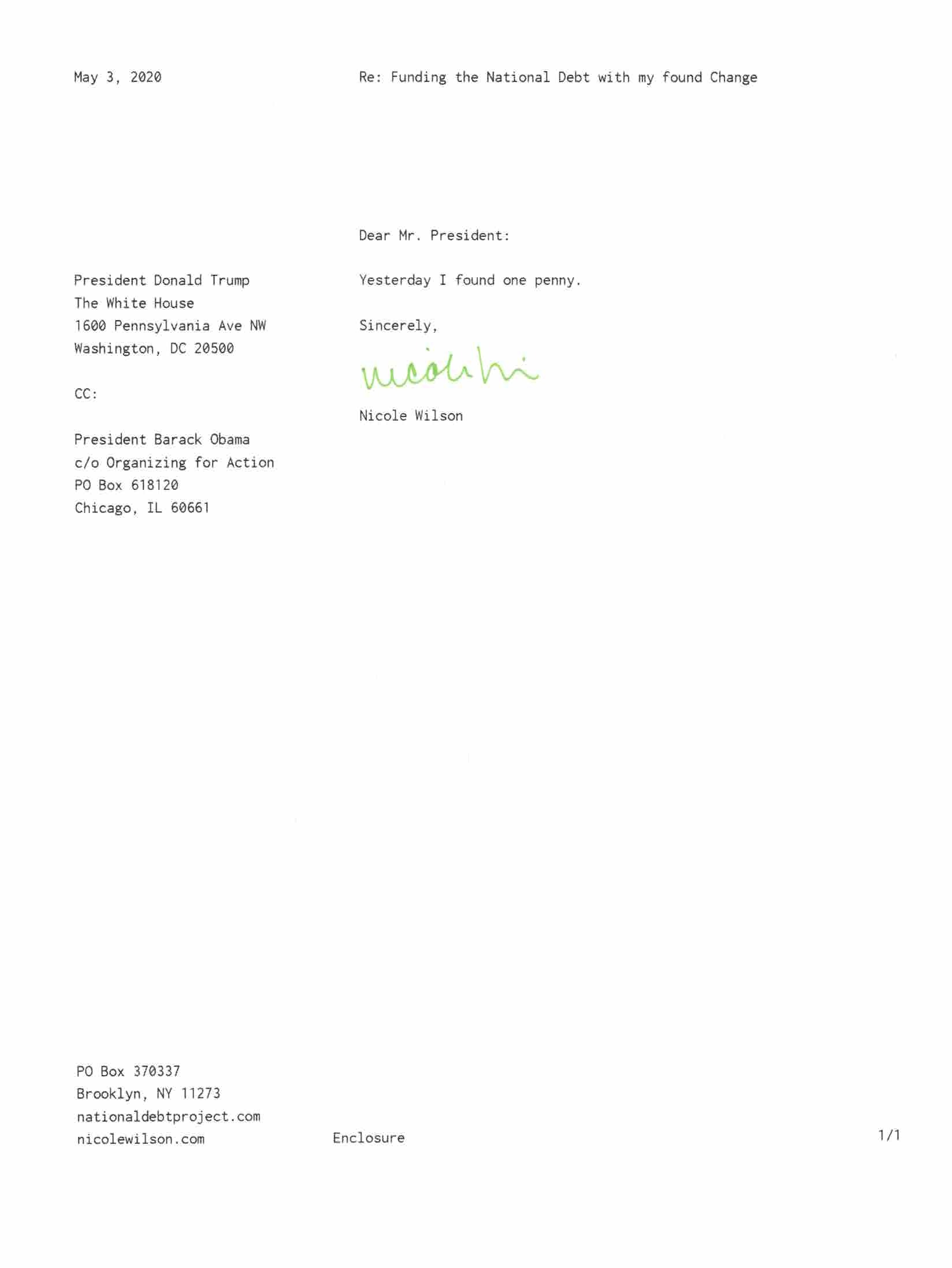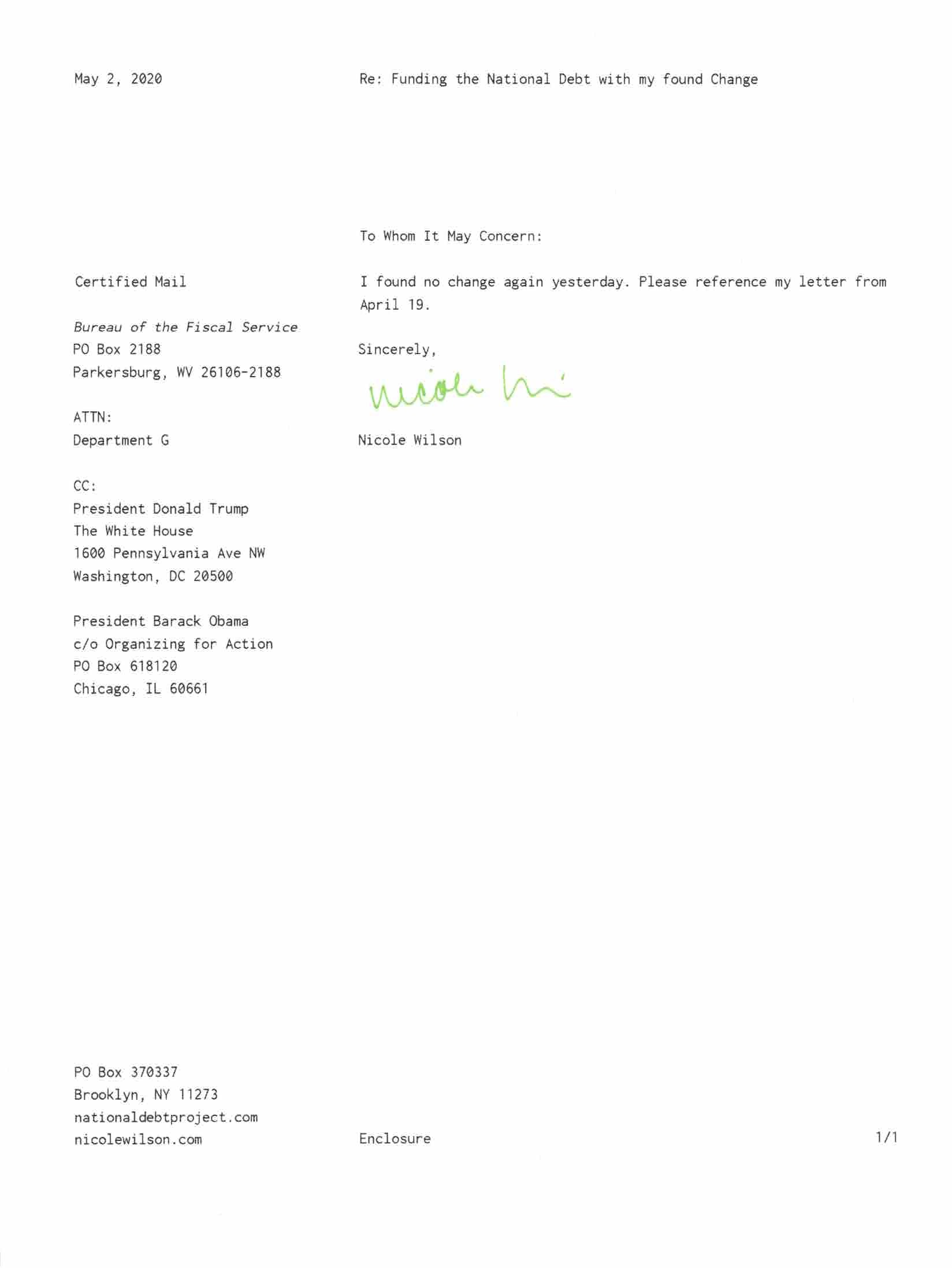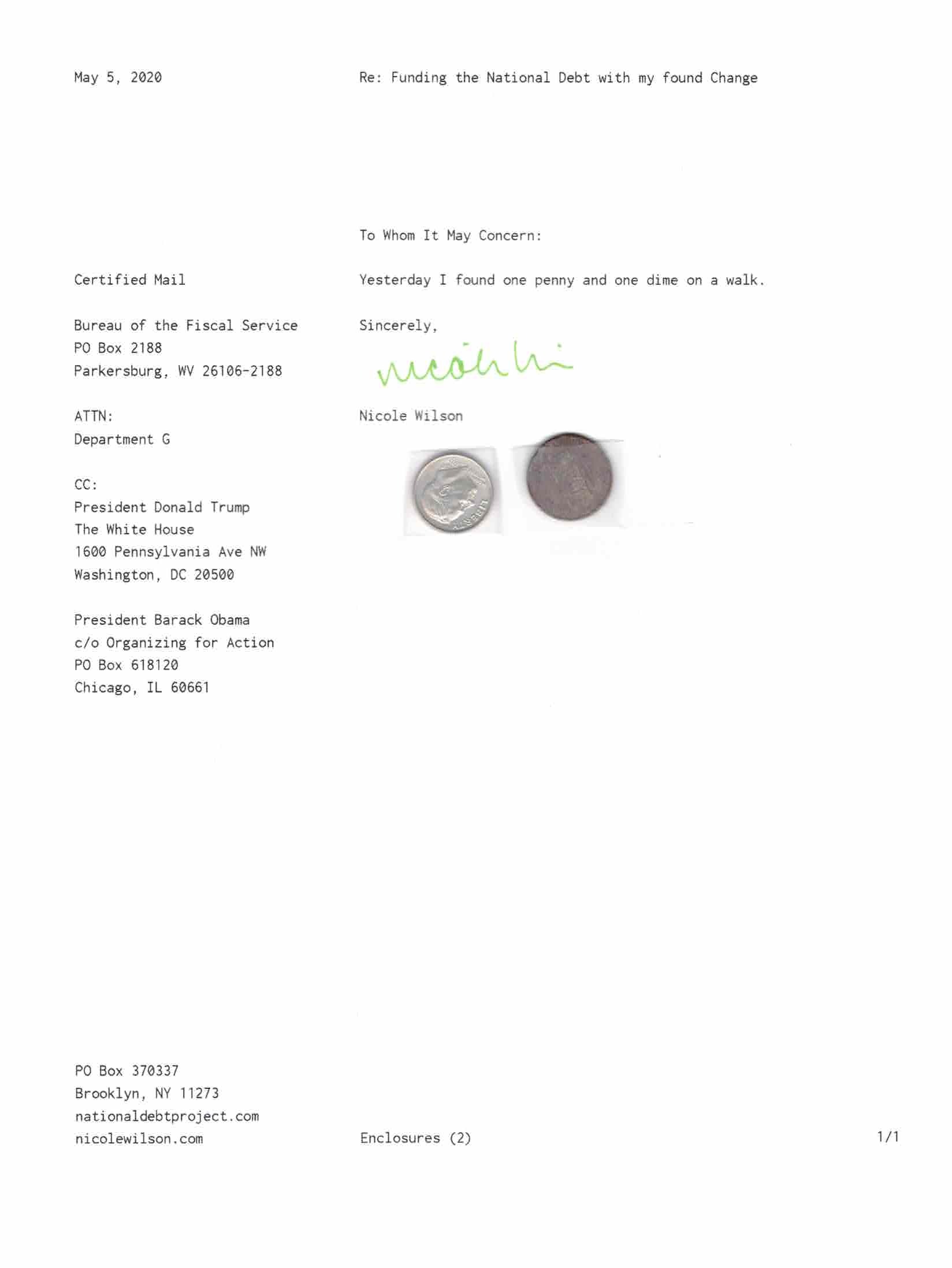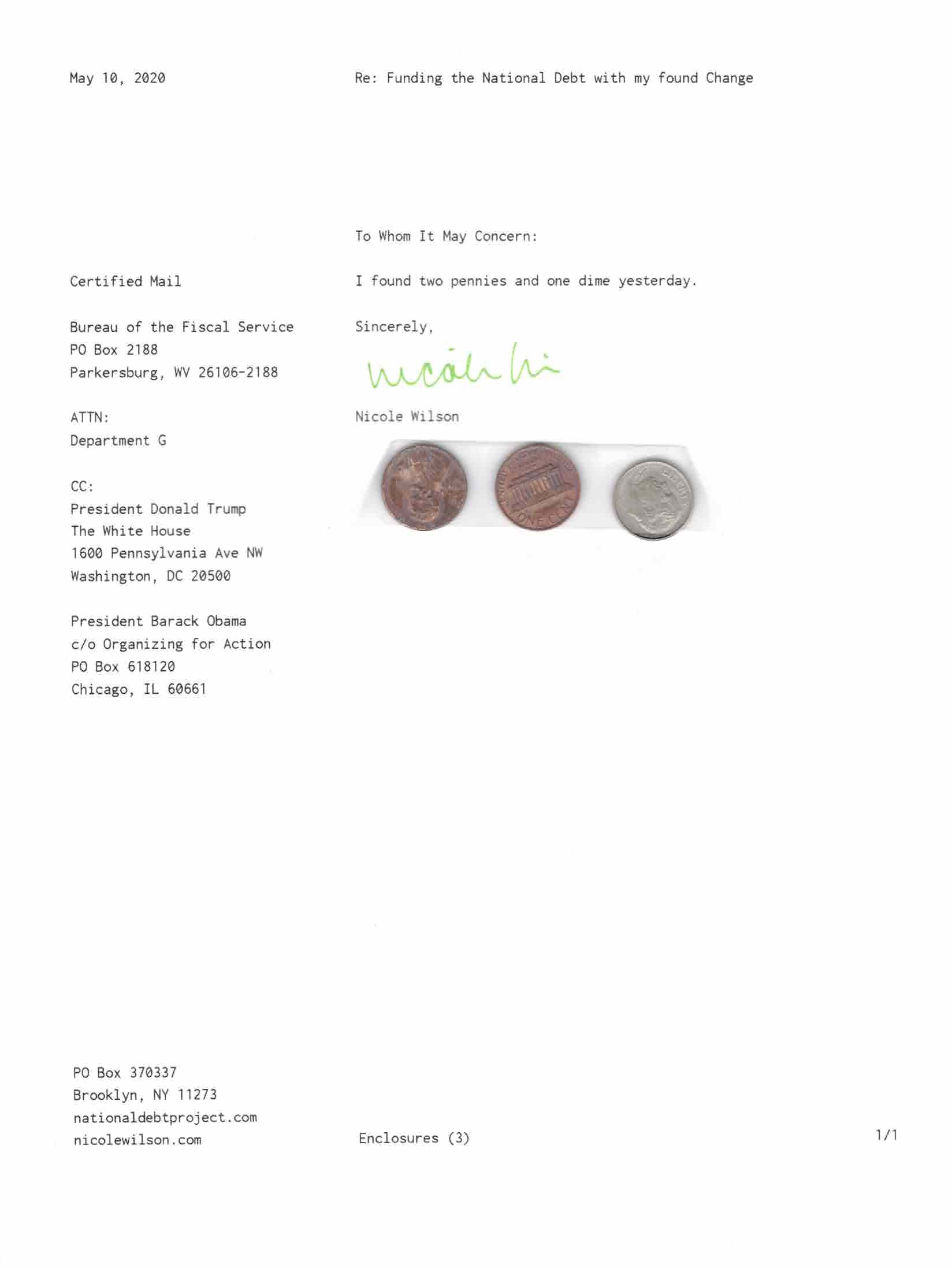 Yet, as I went through each day, I found at least one discarded penny. So, since August 31, 2009, I have sent my found change daily via certified mail to the Bureau of the Fiscal Service (previously the Bureau of the Public Debt), a sector of the Treasury Department whose purpose is to manage the deficit. If by some chance I do not find any change one day, then I send a penny of my own.