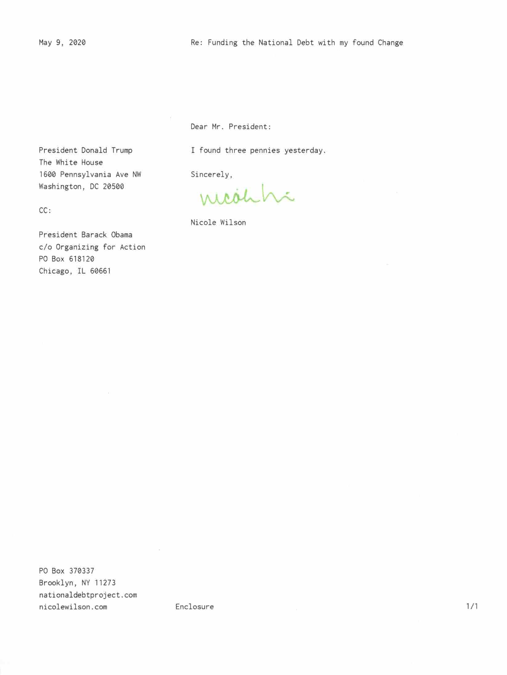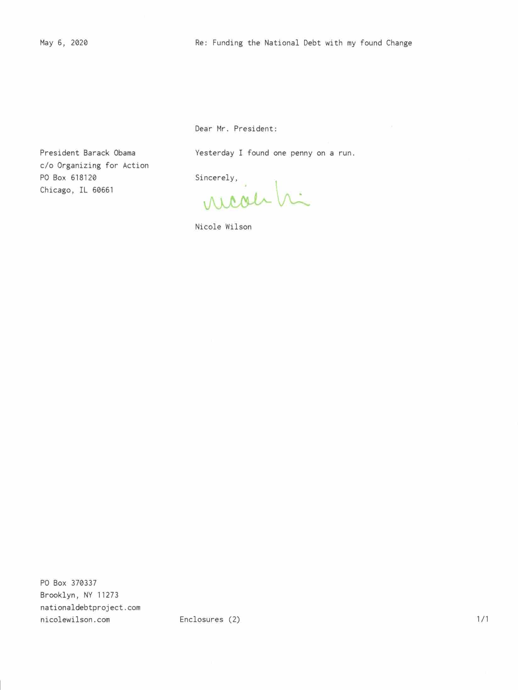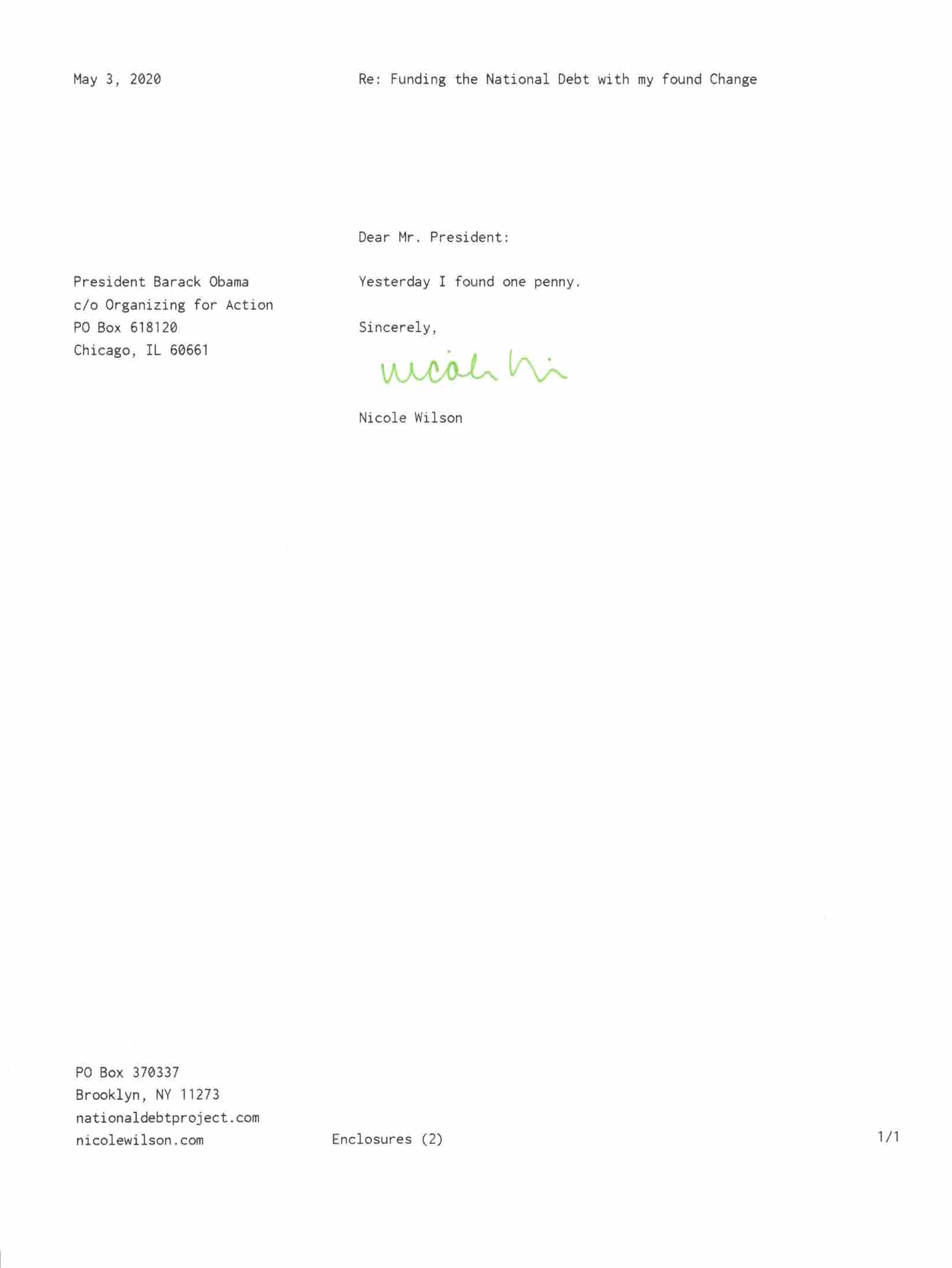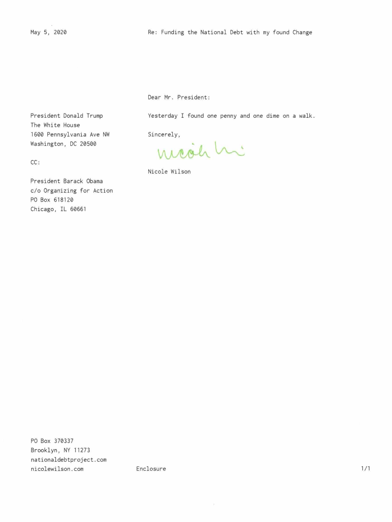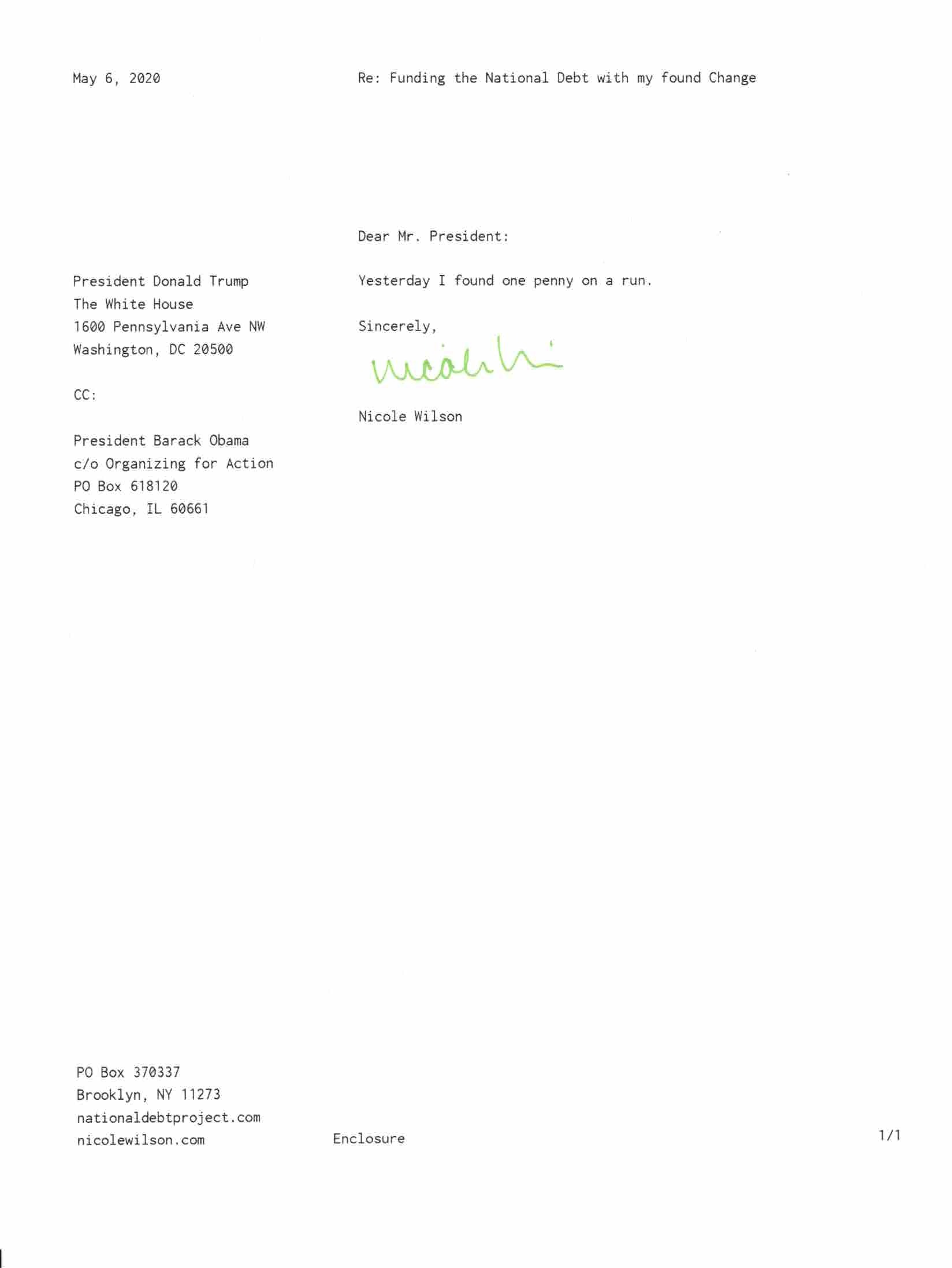 Yet, as I went through each day, I found at least one discarded penny. So, since August 31, 2009, I have sent my found change daily via certified mail to the Bureau of the Fiscal Service (previously the Bureau of the Public Debt), a sector of the Treasury Department whose purpose is to manage the deficit. If by some chance I do not find any change one day, then I send a penny of my own.