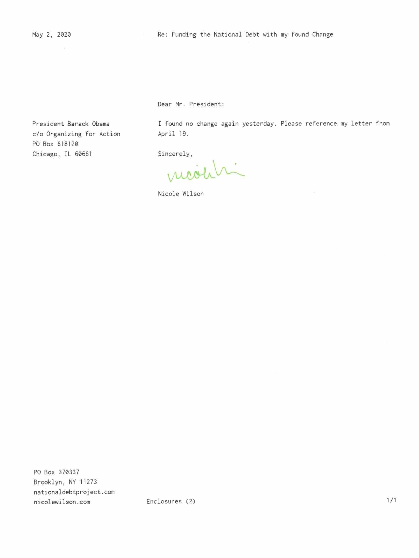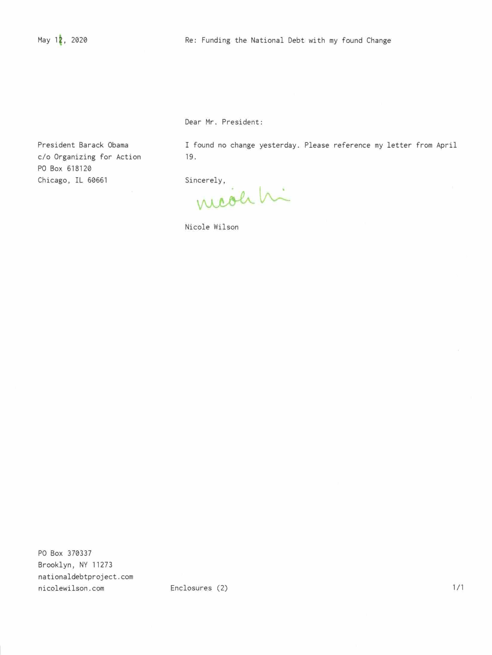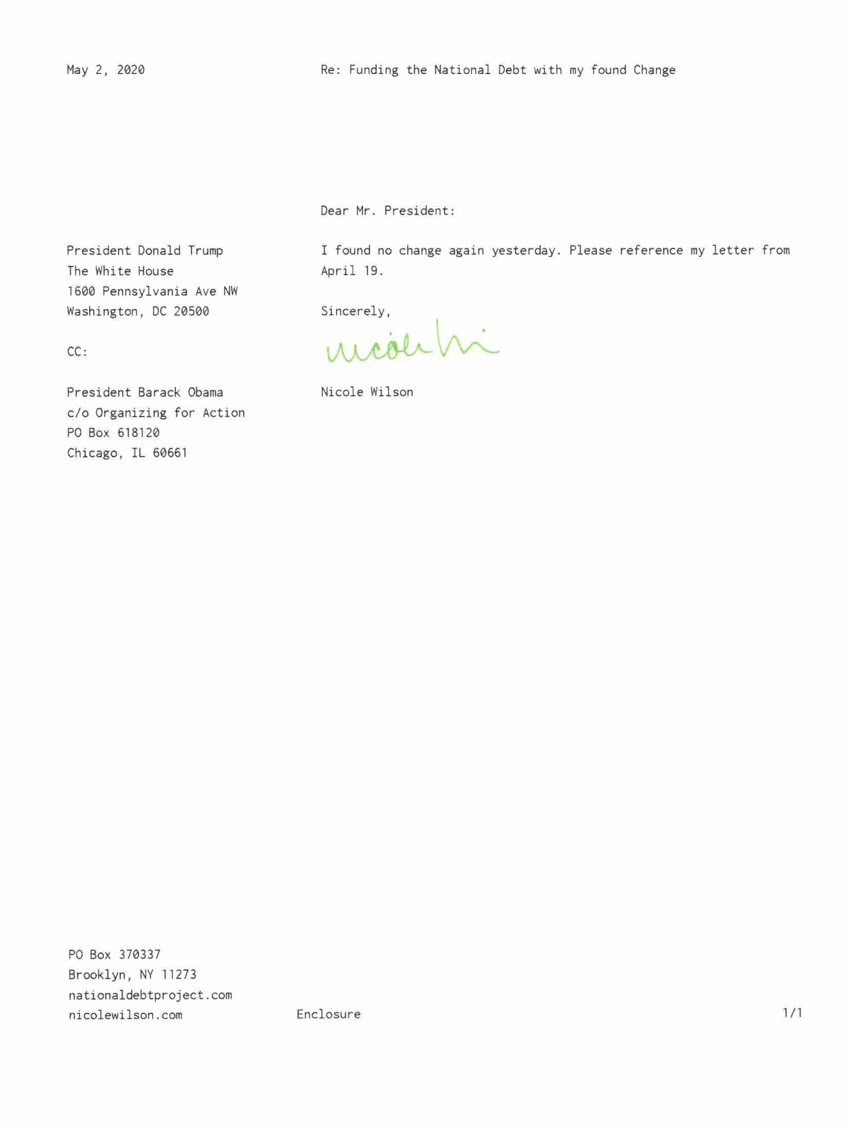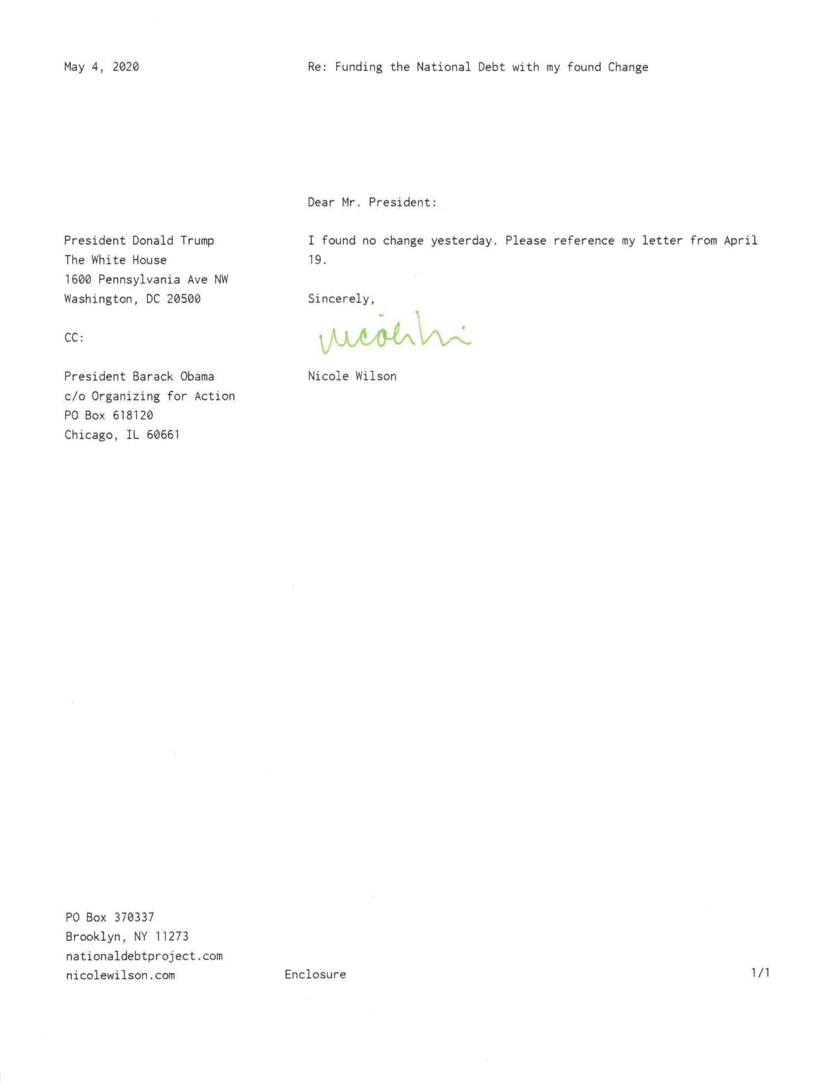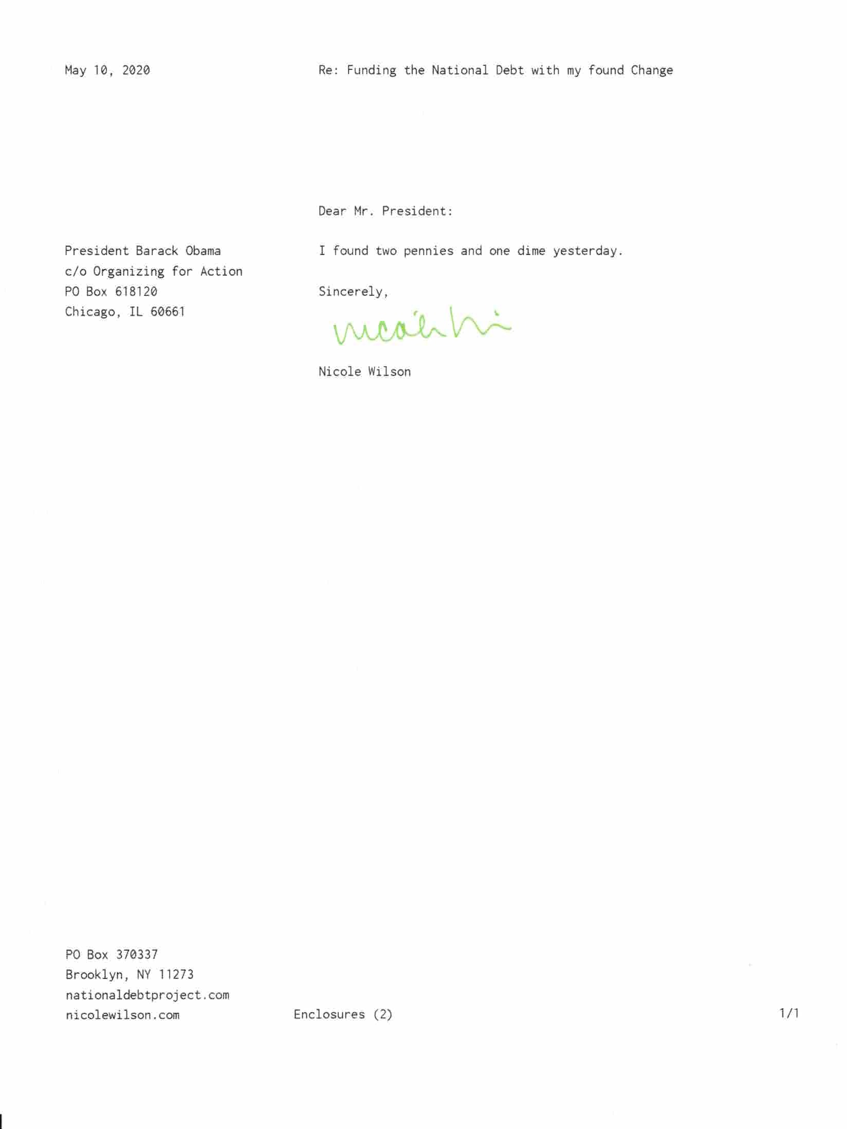 Yet, as I went through each day, I found at least one discarded penny. So, since August 31, 2009, I have sent my found change daily via certified mail to the Bureau of the Fiscal Service (previously the Bureau of the Public Debt), a sector of the Treasury Department whose purpose is to manage the deficit. If by some chance I do not find any change one day, then I send a penny of my own.