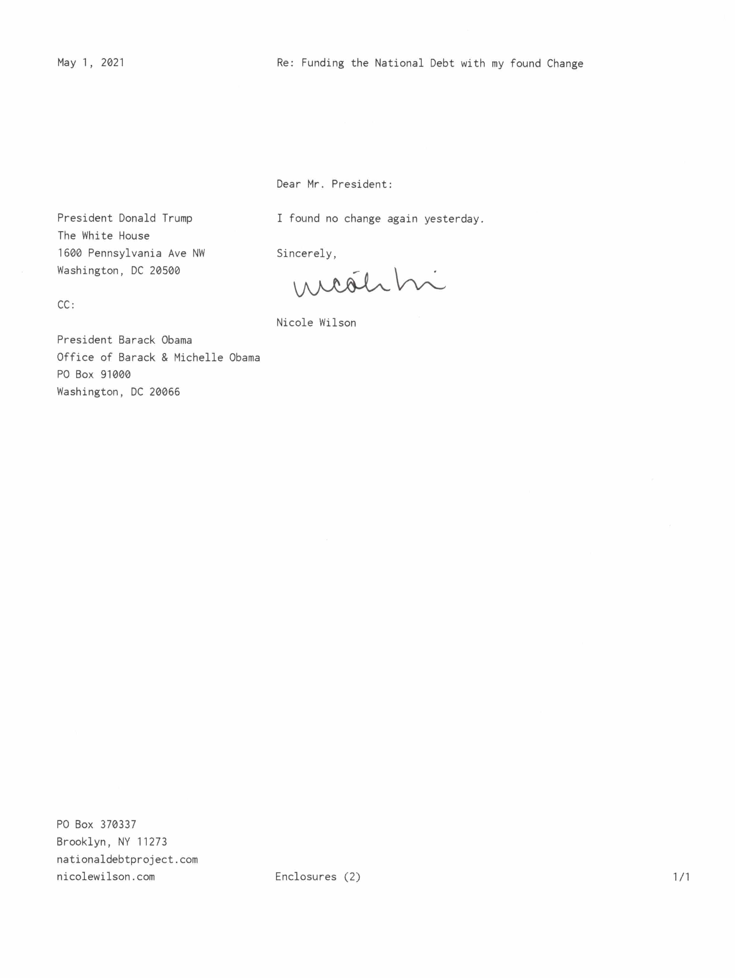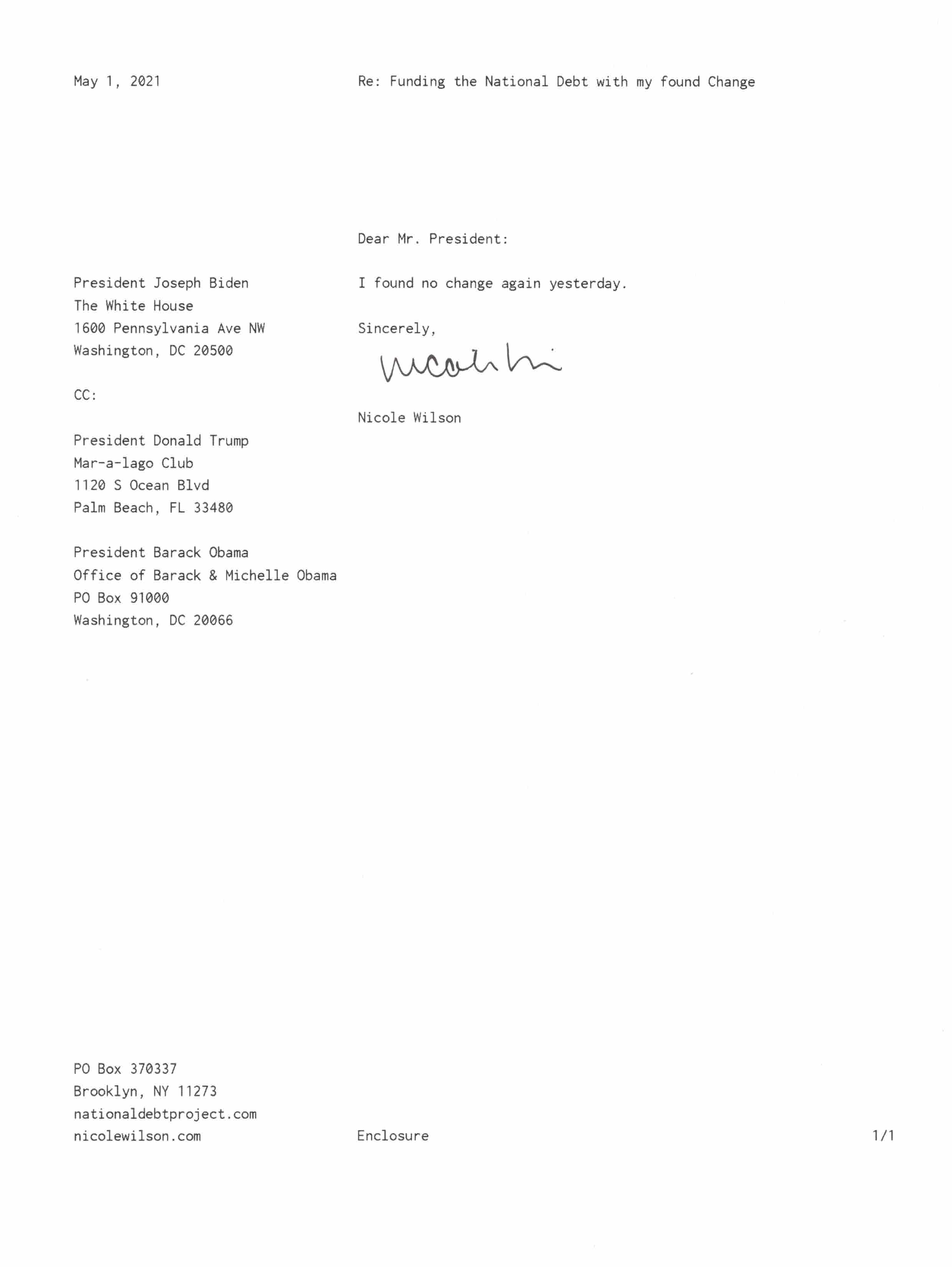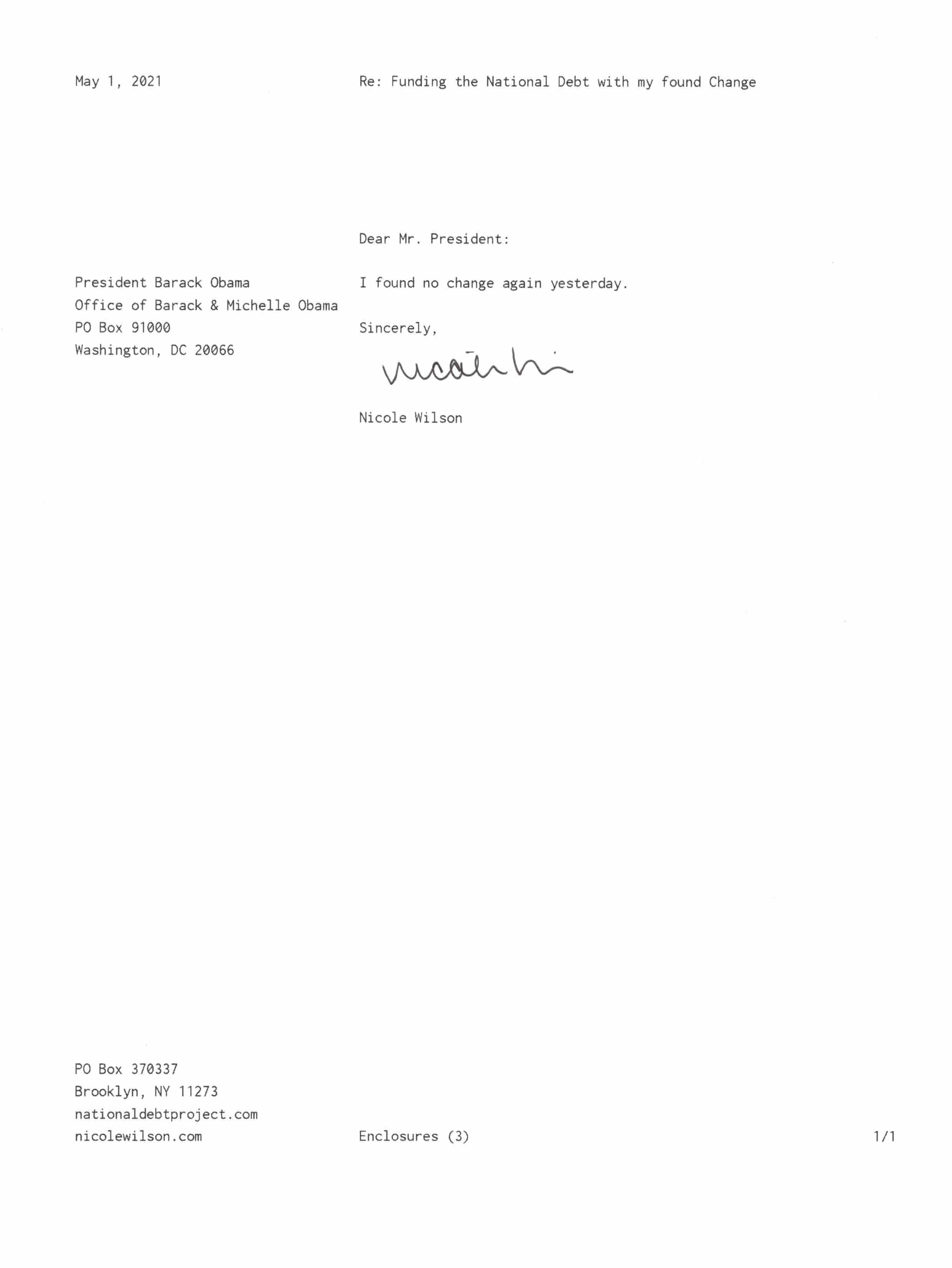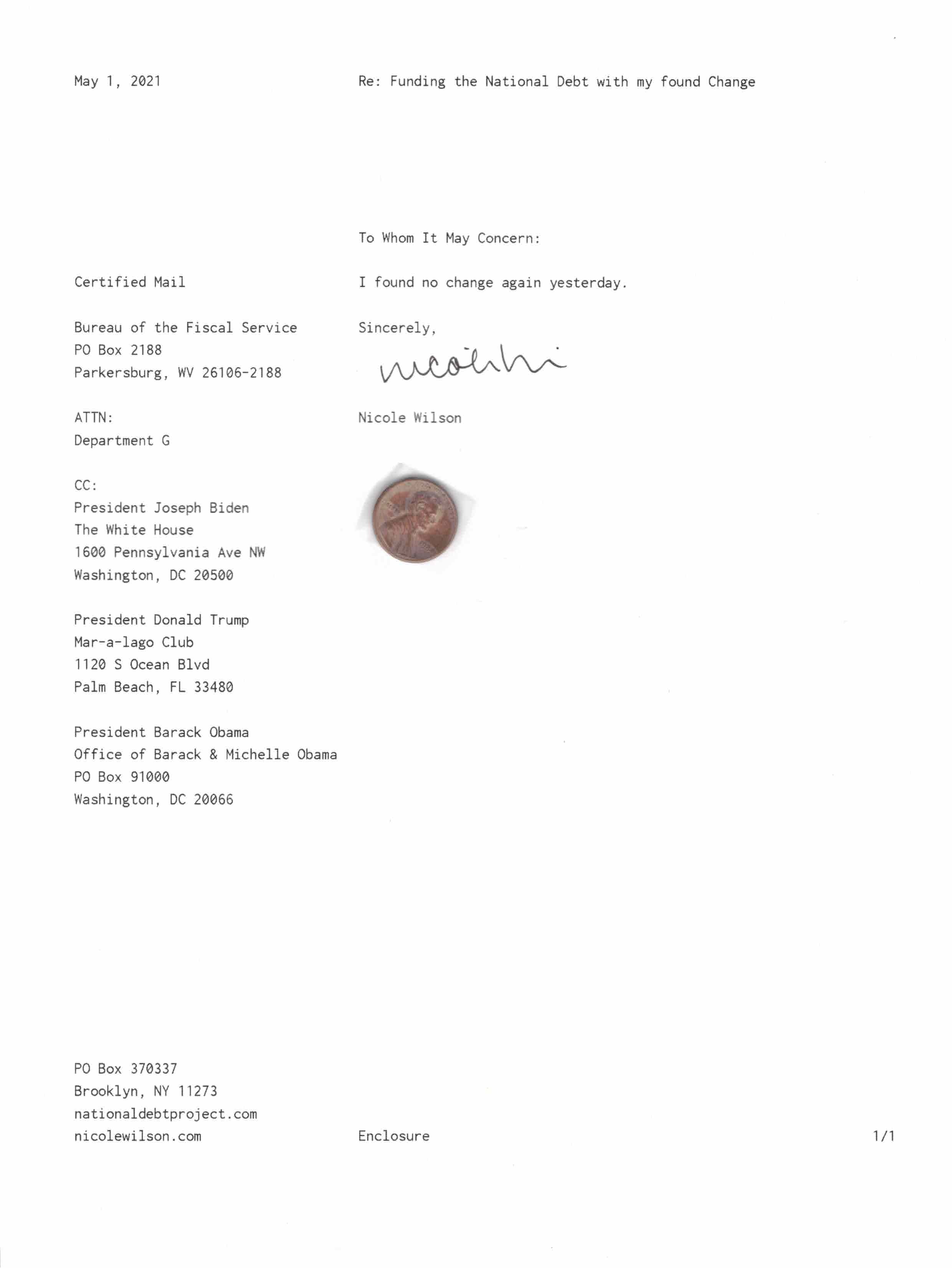 Yet, as I went through each day, I found at least one discarded penny. So, since August 31, 2009, I have sent my found change daily via certified mail to the Bureau of the Fiscal Service (previously the Bureau of the Public Debt), a sector of the Treasury Department whose purpose is to manage the deficit. If by some chance I do not find any change one day, then I send a penny of my own.
