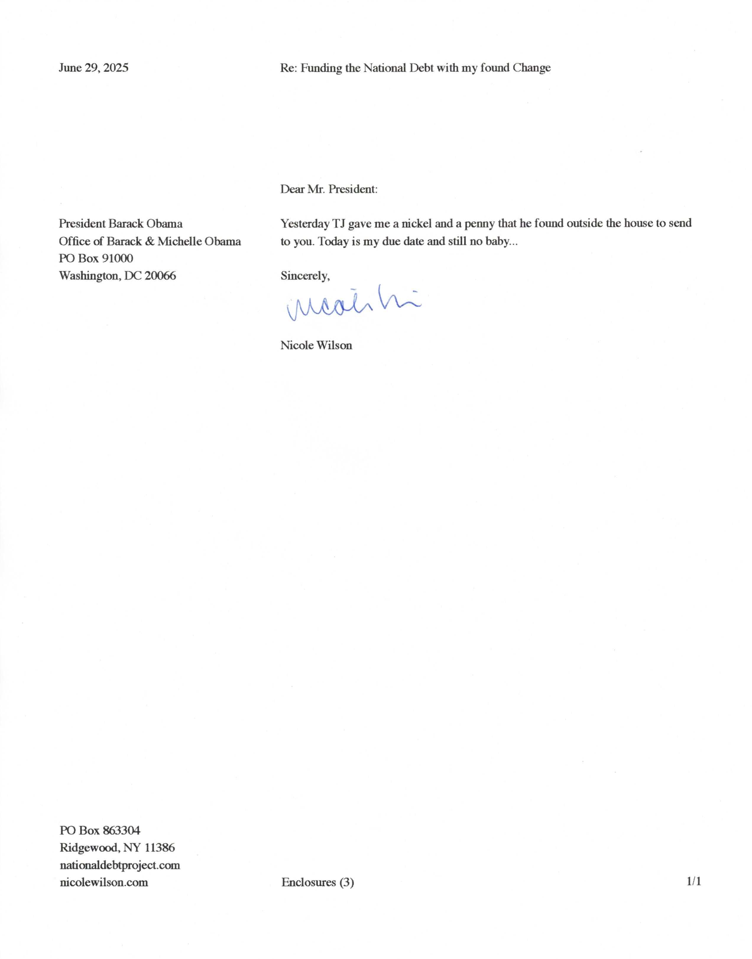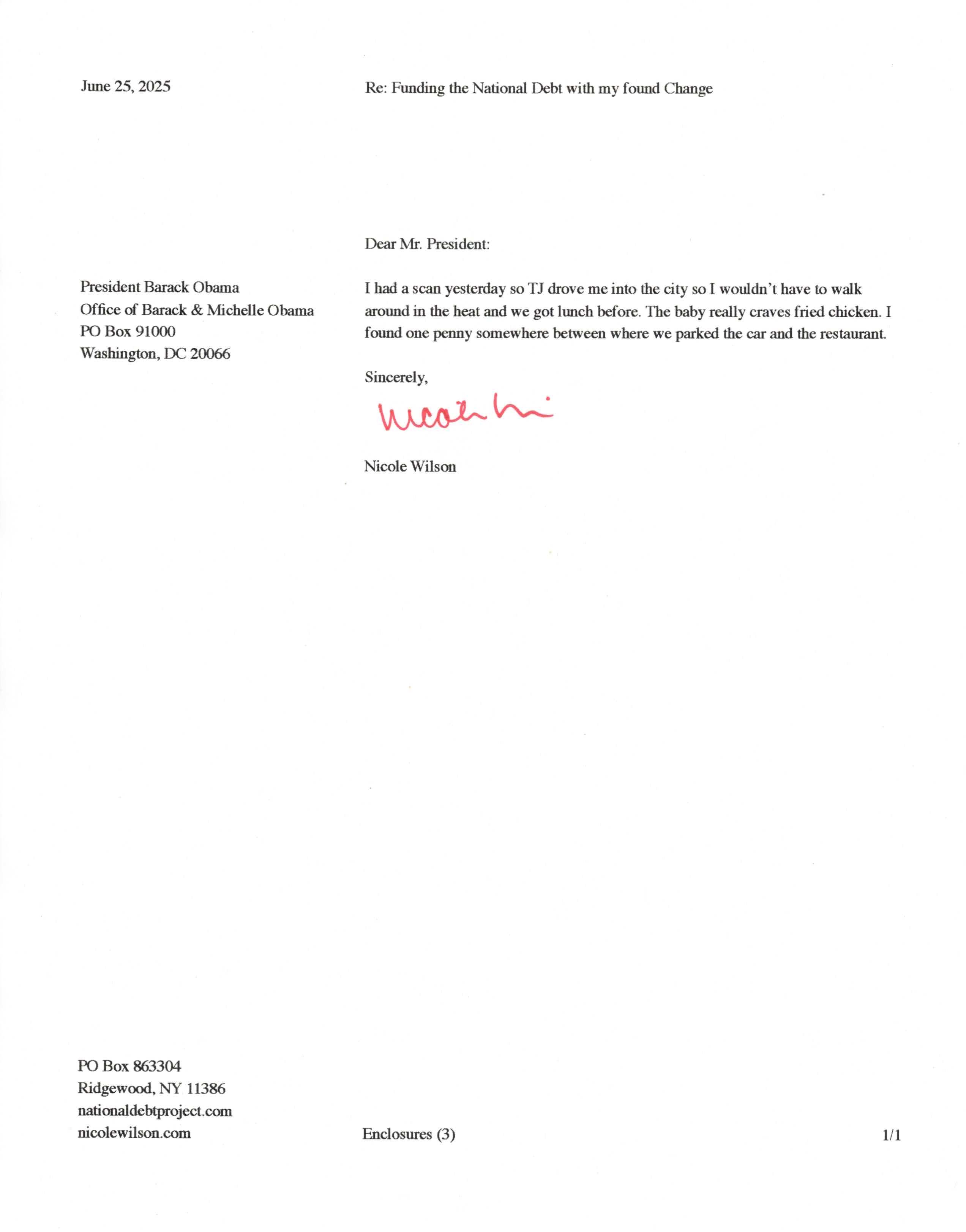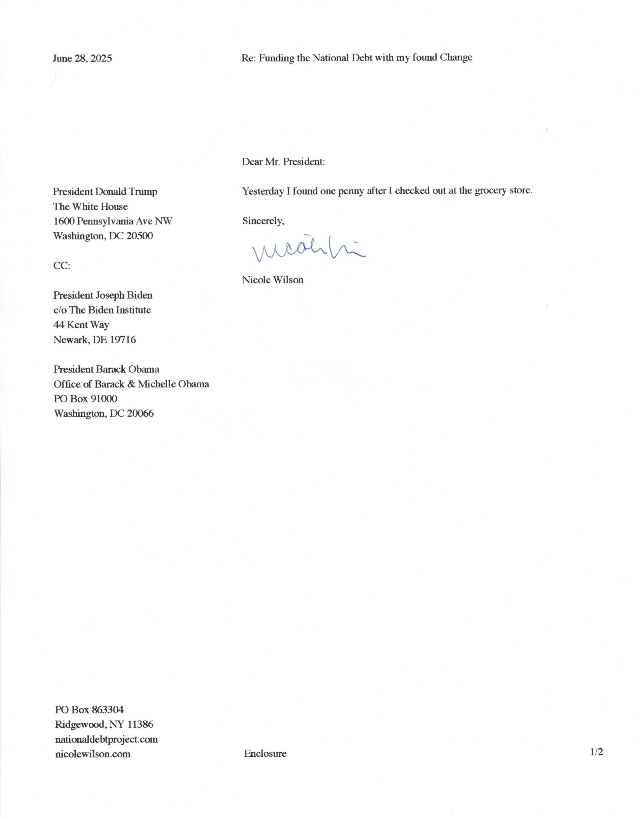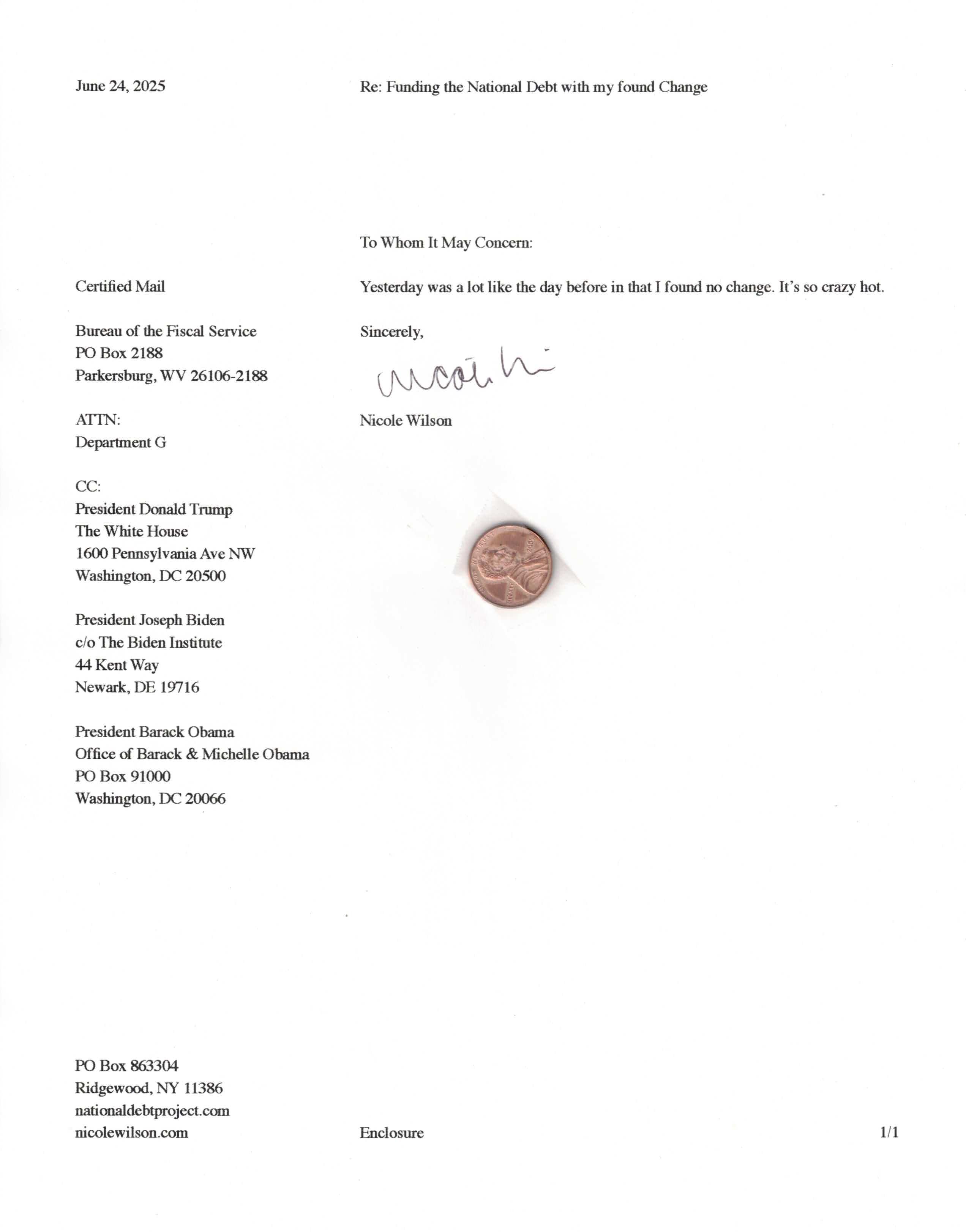 Yet, as I went through each day, I found at least one discarded penny. So, since August 31, 2009, I have sent my found change daily via certified mail to the Bureau of the Fiscal Service (previously the Bureau of the Public Debt), a sector of the Treasury Department whose purpose is to manage the deficit. If by some chance I do not find any change one day, then I send a penny of my own.