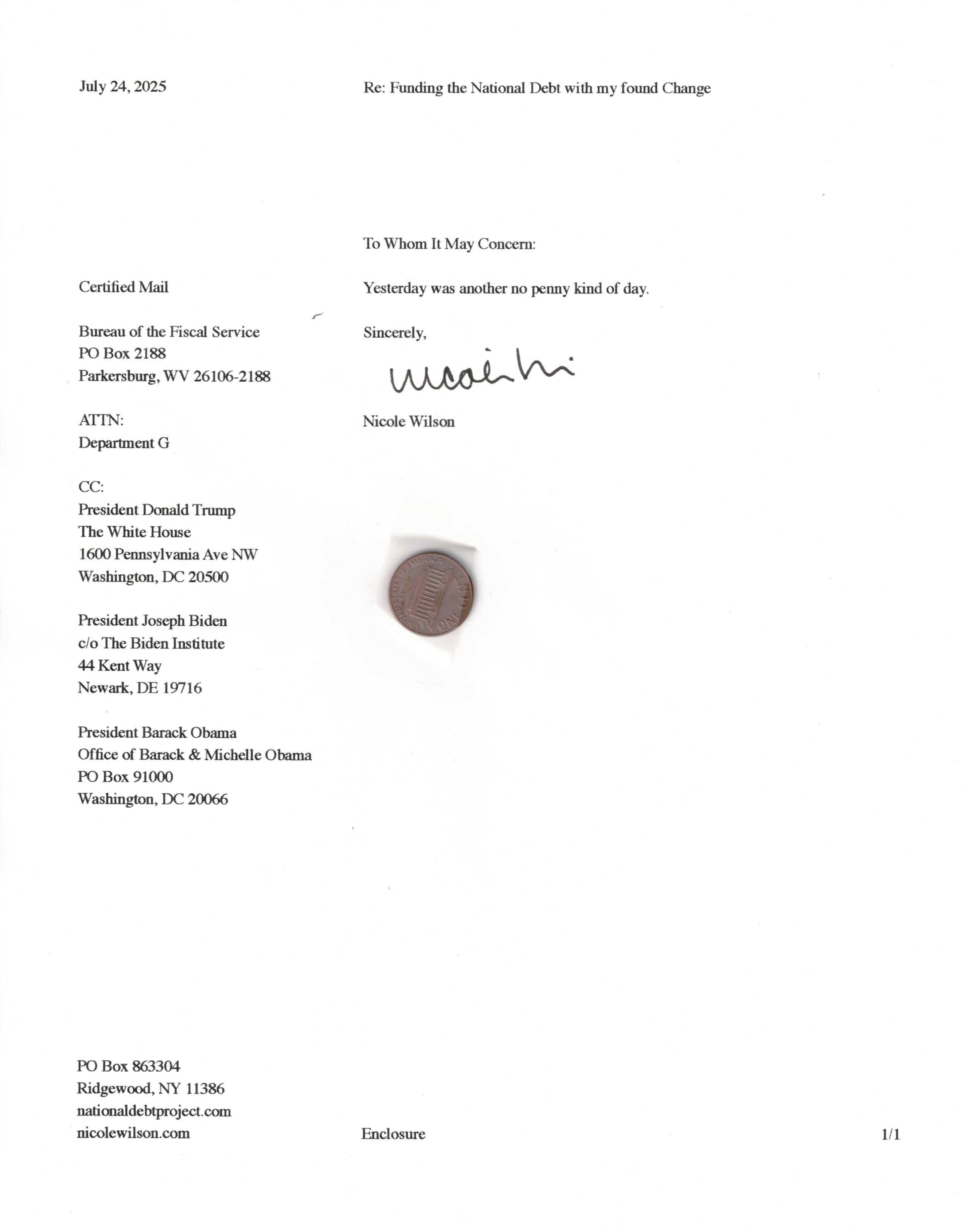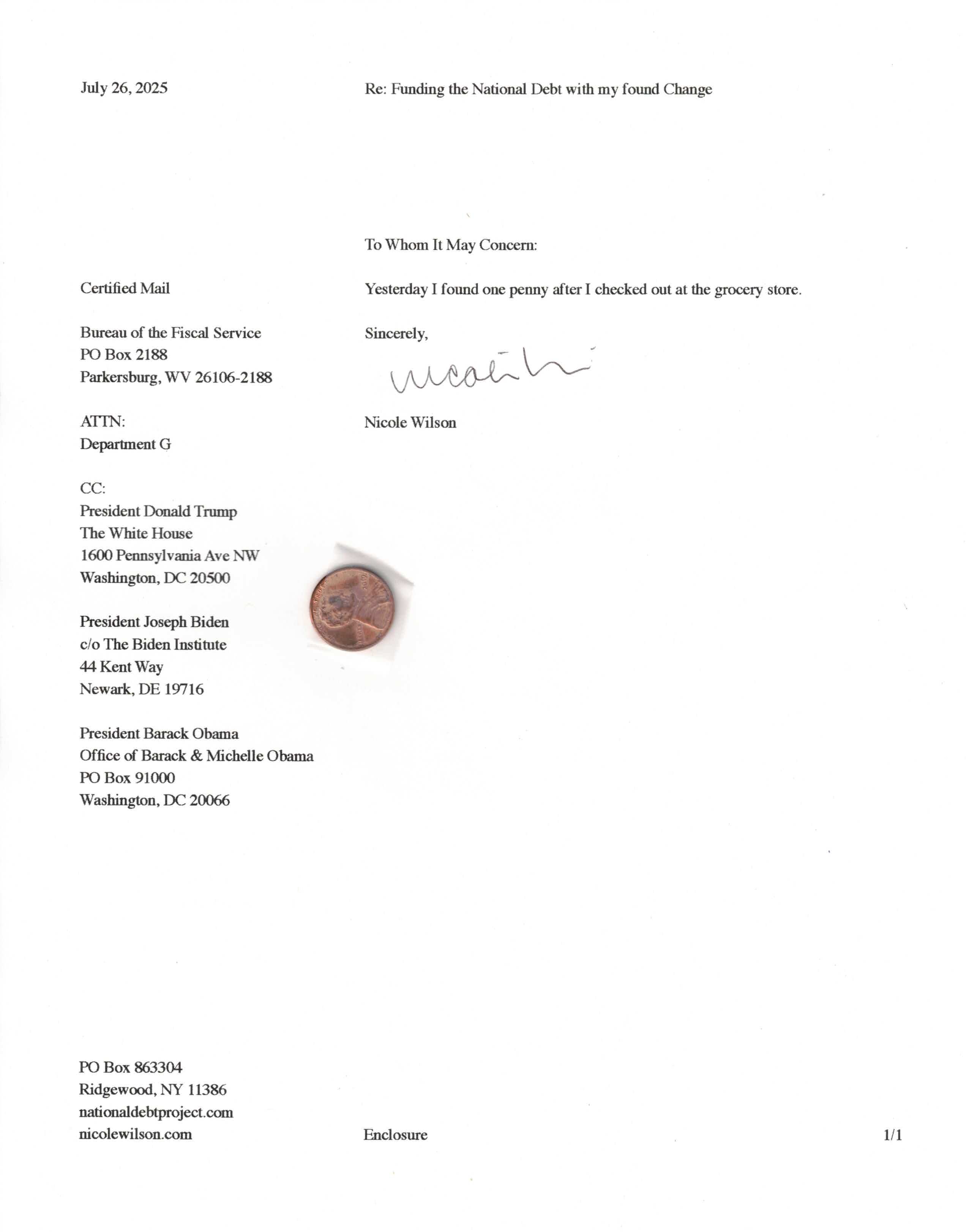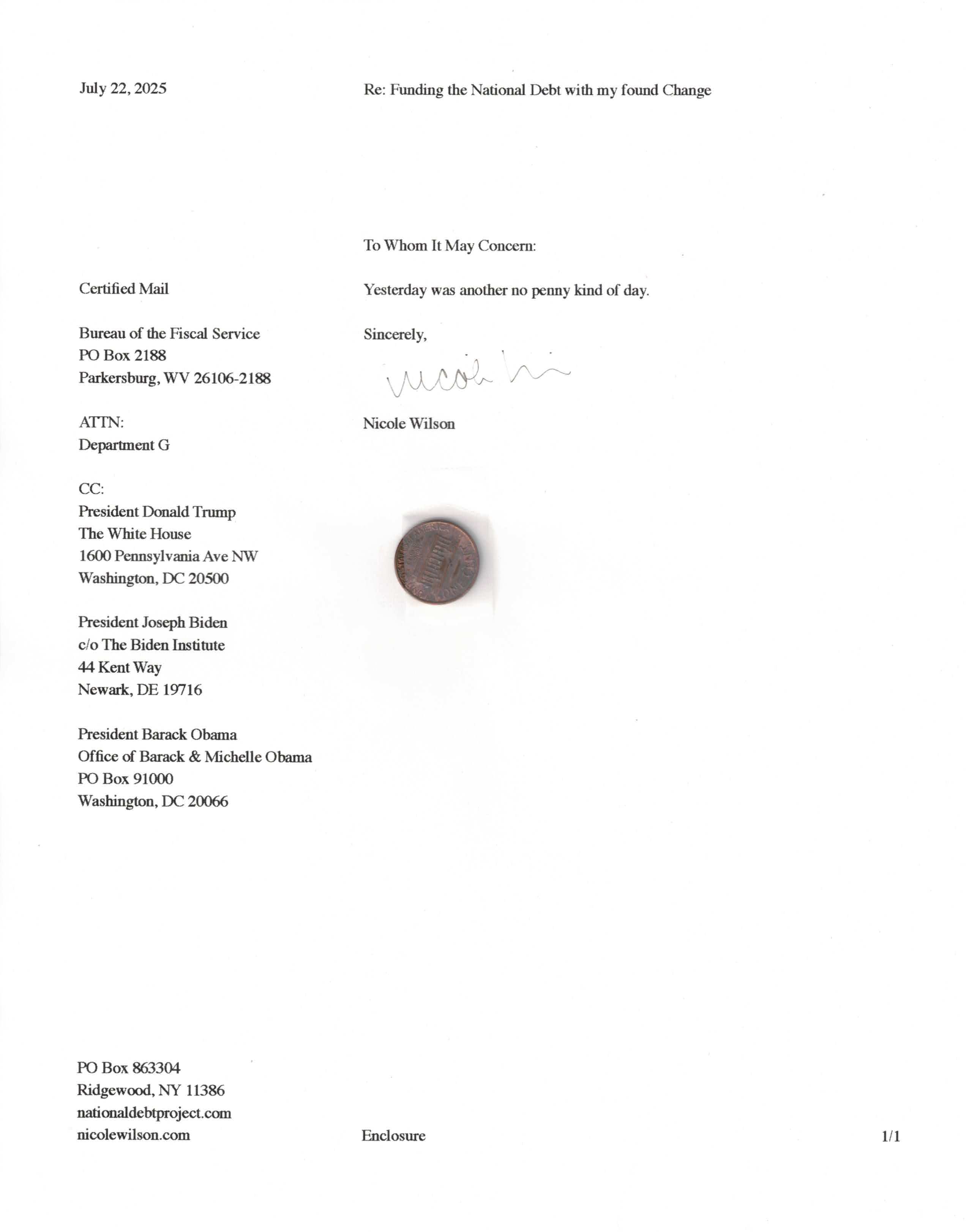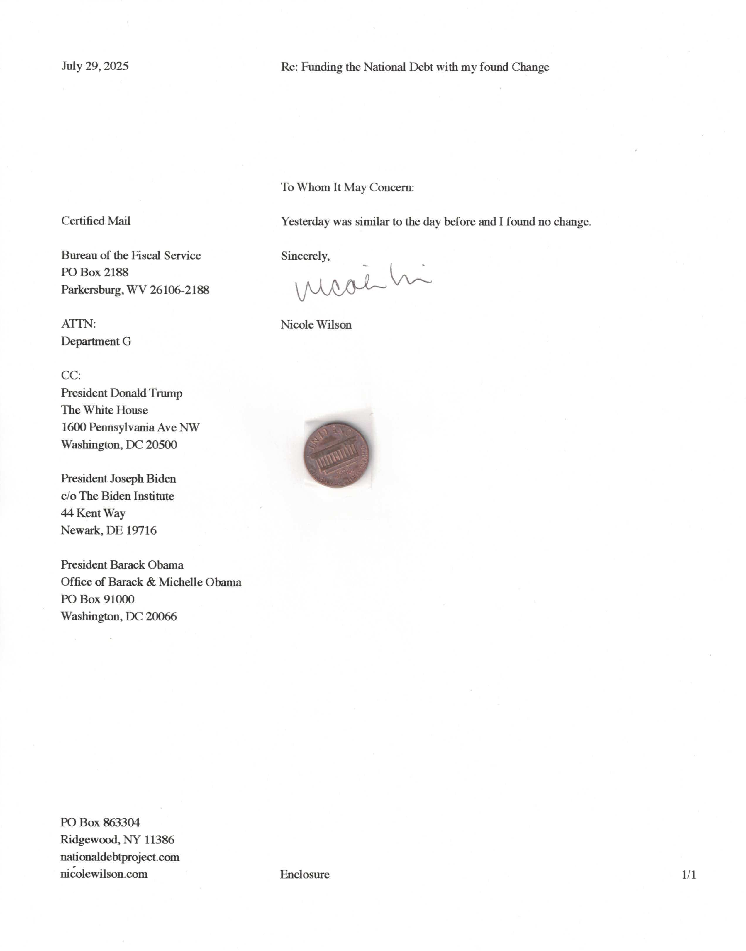 Yet, as I went through each day, I found at least one discarded penny. So, since August 31, 2009, I have sent my found change daily via certified mail to the Bureau of the Fiscal Service (previously the Bureau of the Public Debt), a sector of the Treasury Department whose purpose is to manage the deficit. If by some chance I do not find any change one day, then I send a penny of my own.