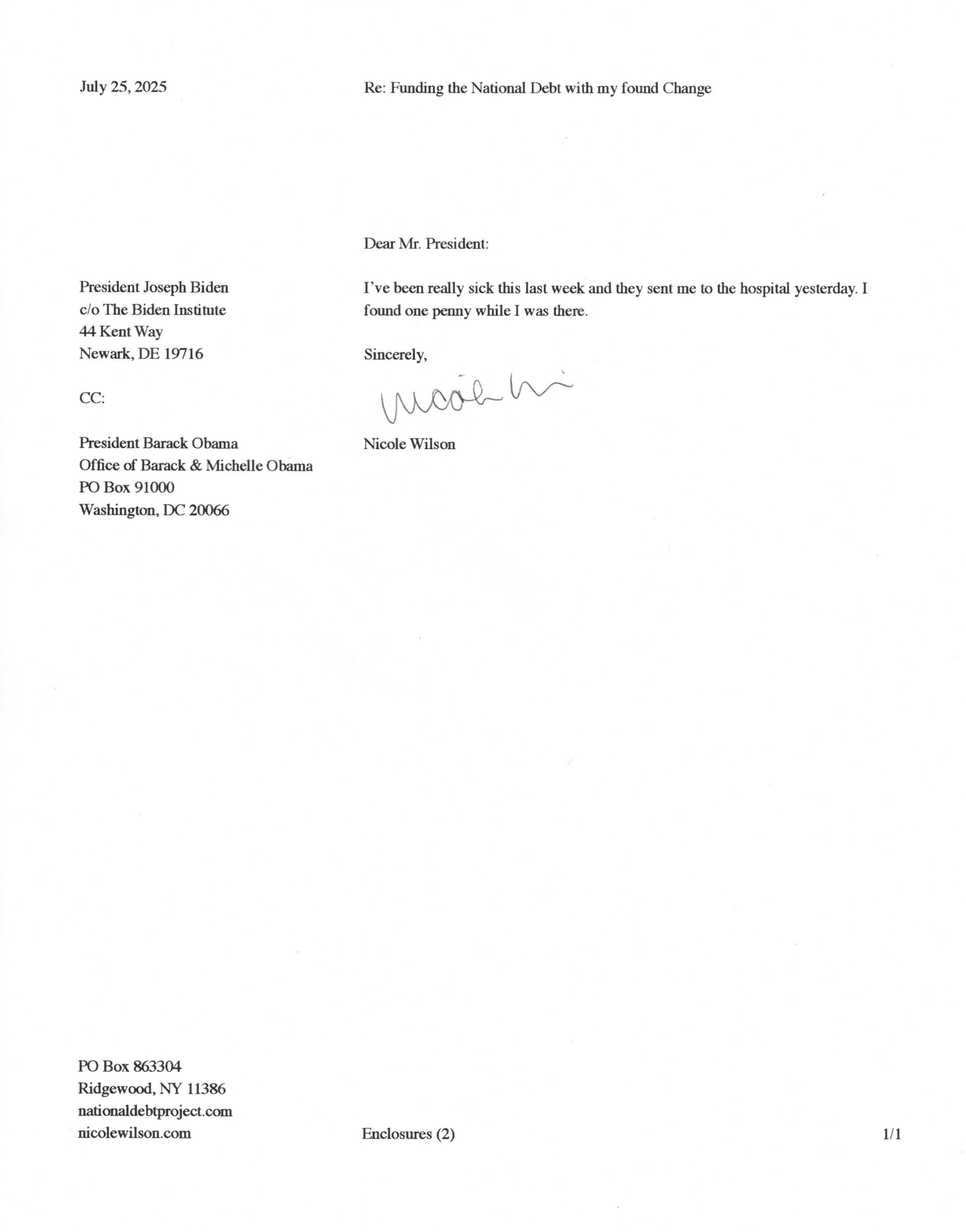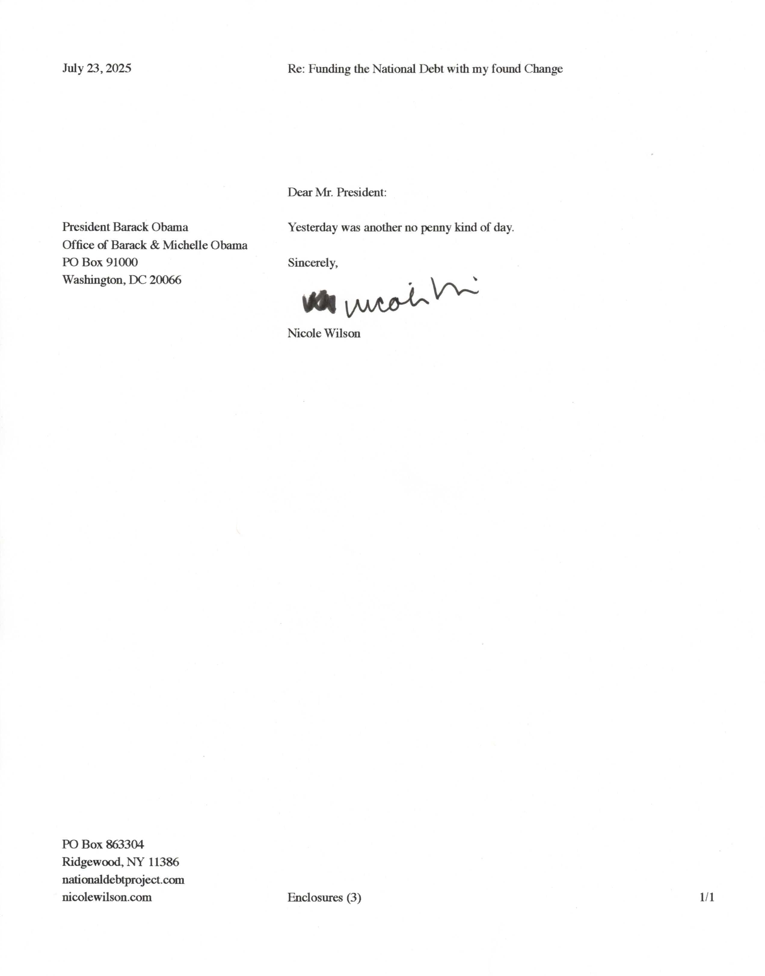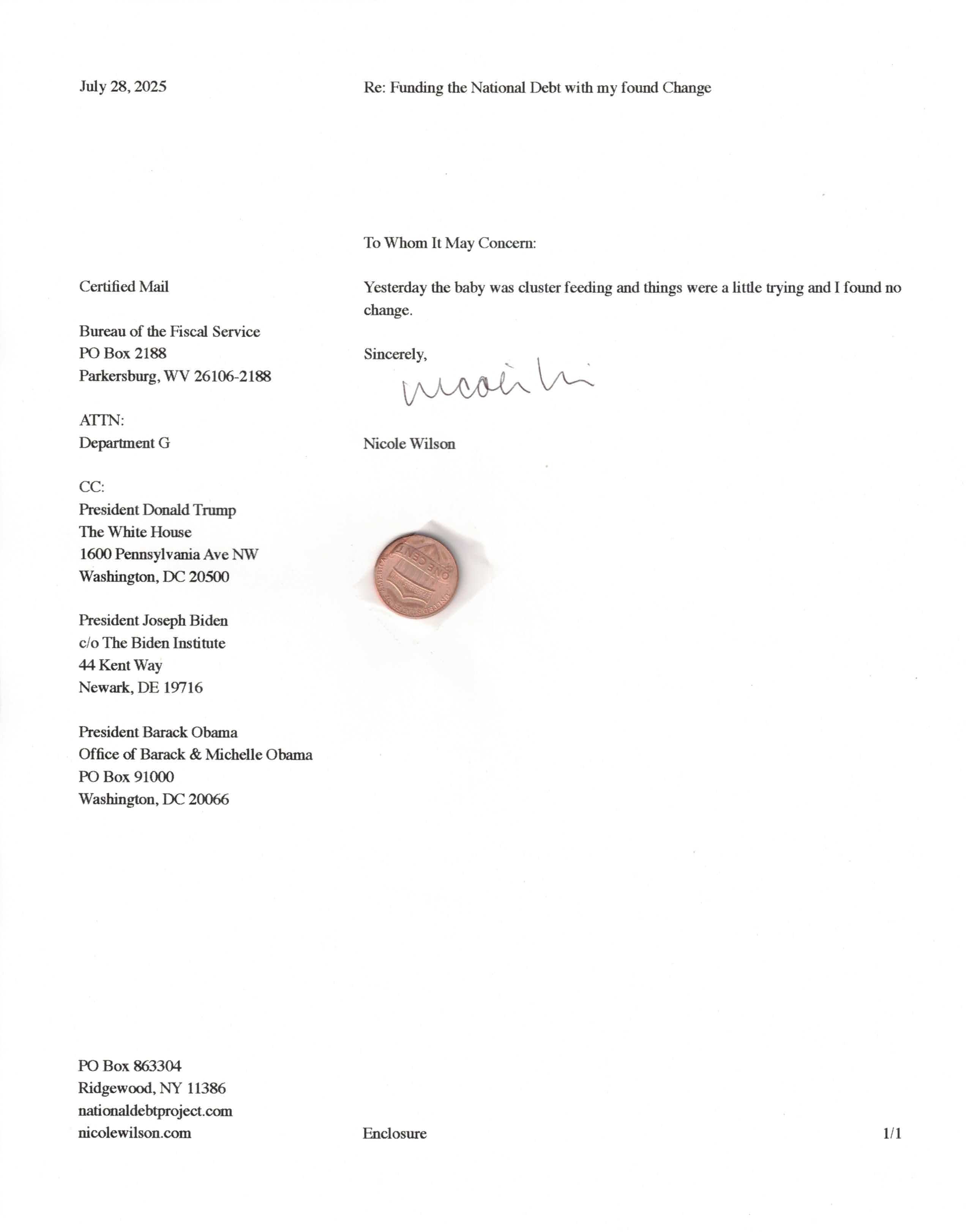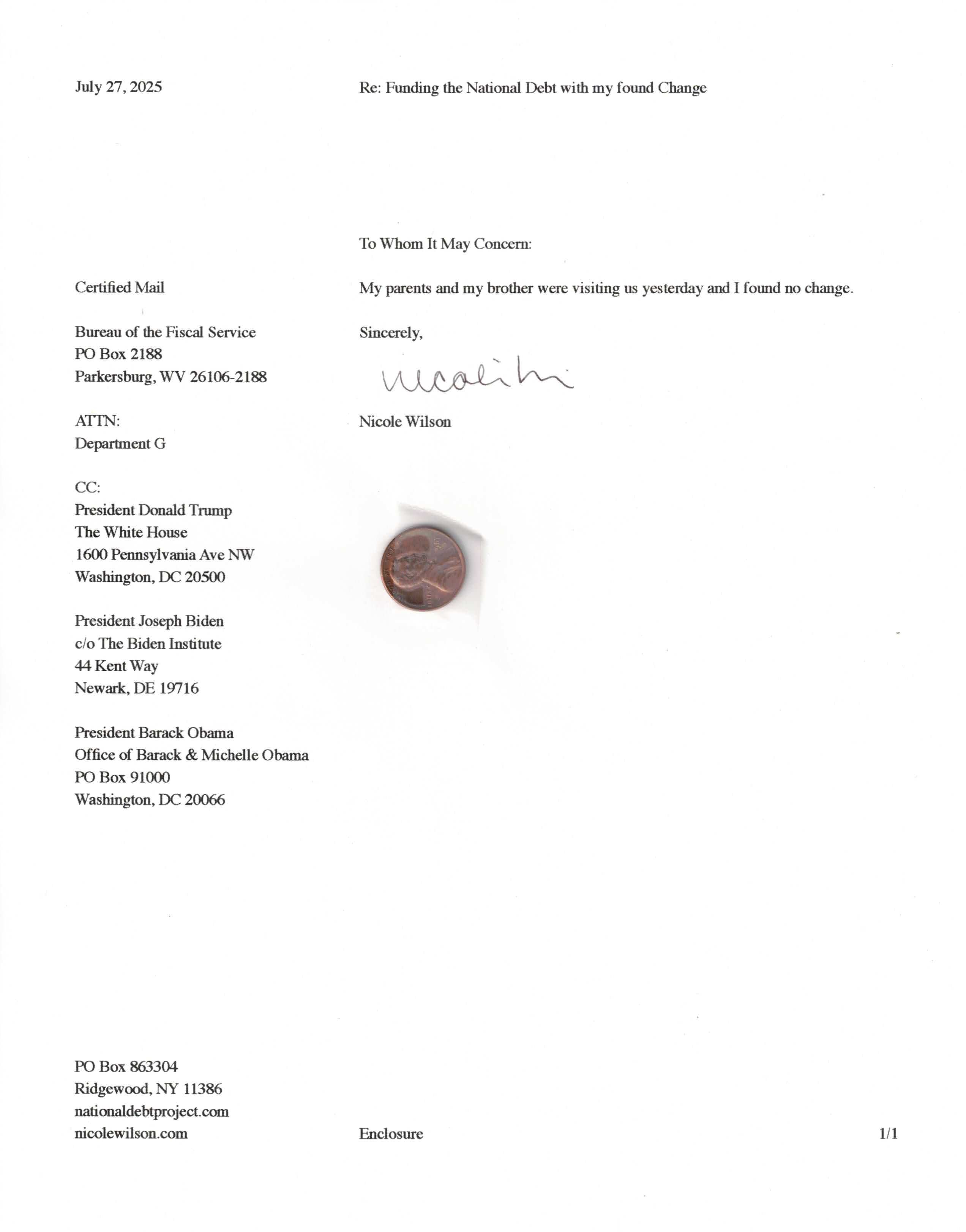 Yet, as I went through each day, I found at least one discarded penny. So, since August 31, 2009, I have sent my found change daily via certified mail to the Bureau of the Fiscal Service (previously the Bureau of the Public Debt), a sector of the Treasury Department whose purpose is to manage the deficit. If by some chance I do not find any change one day, then I send a penny of my own.