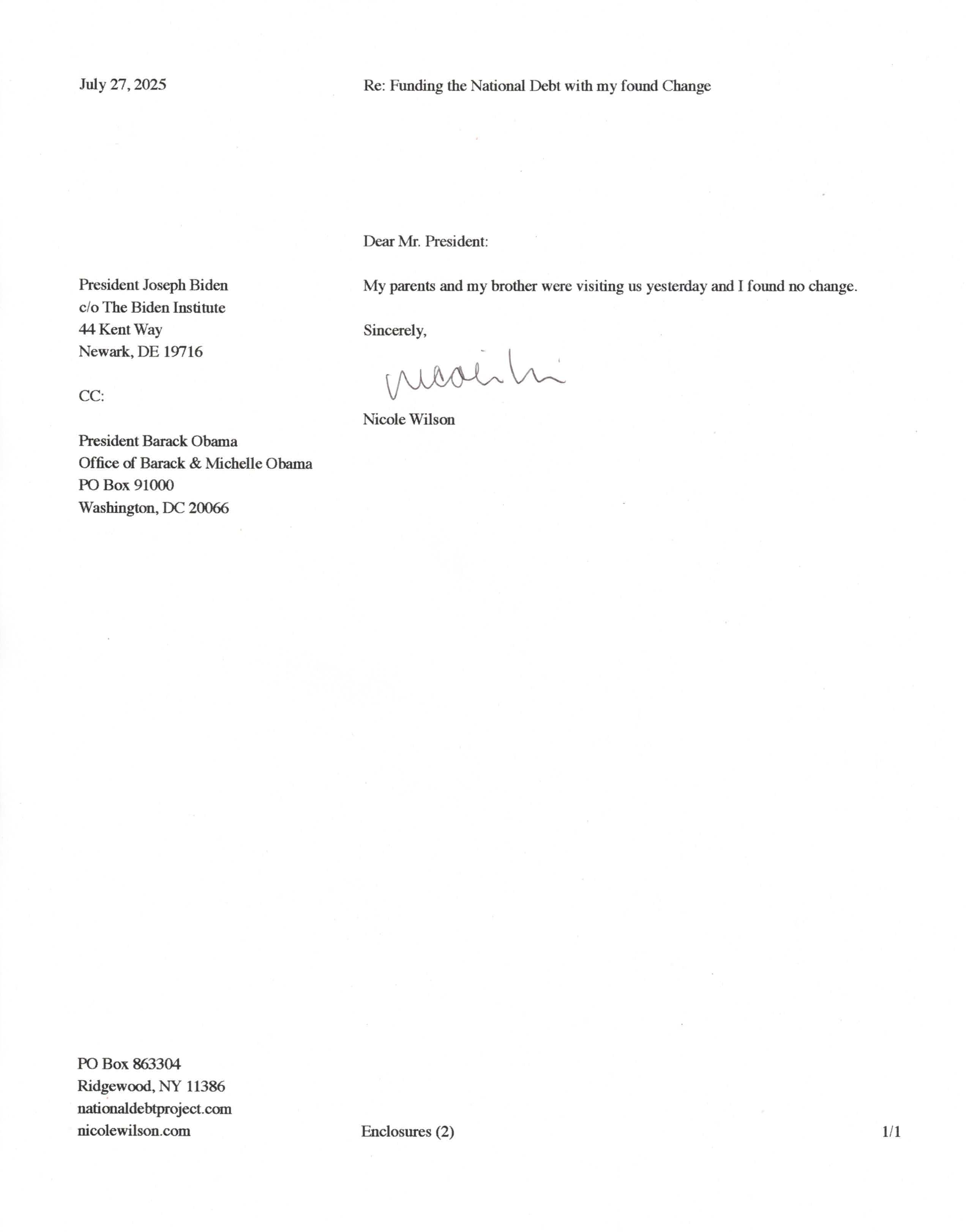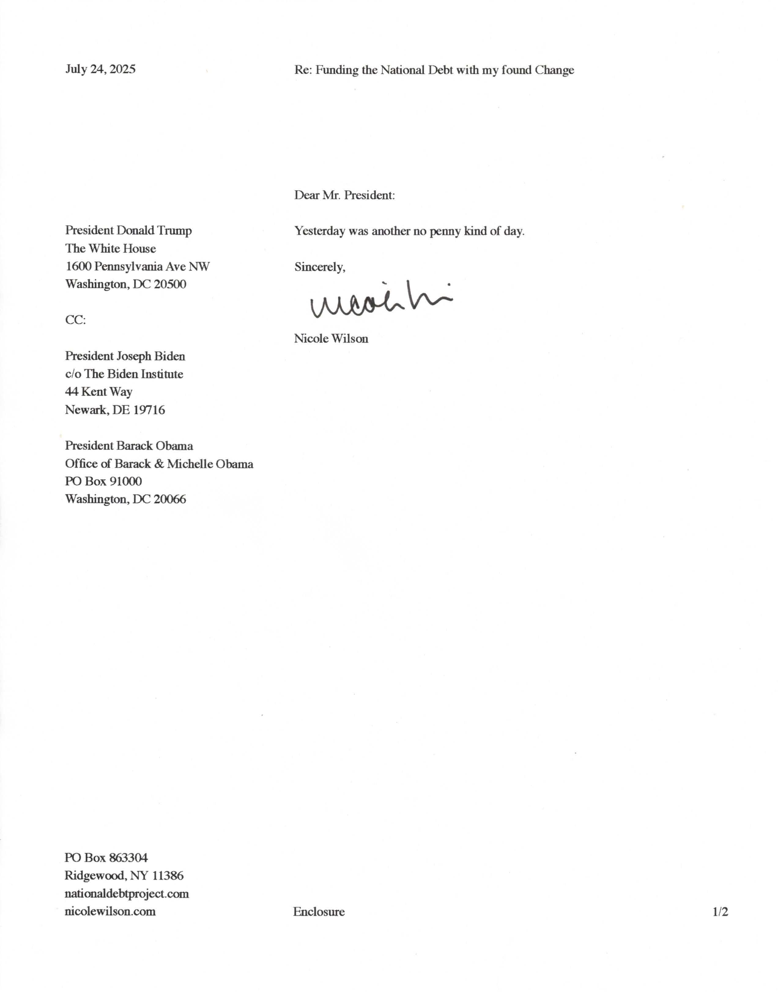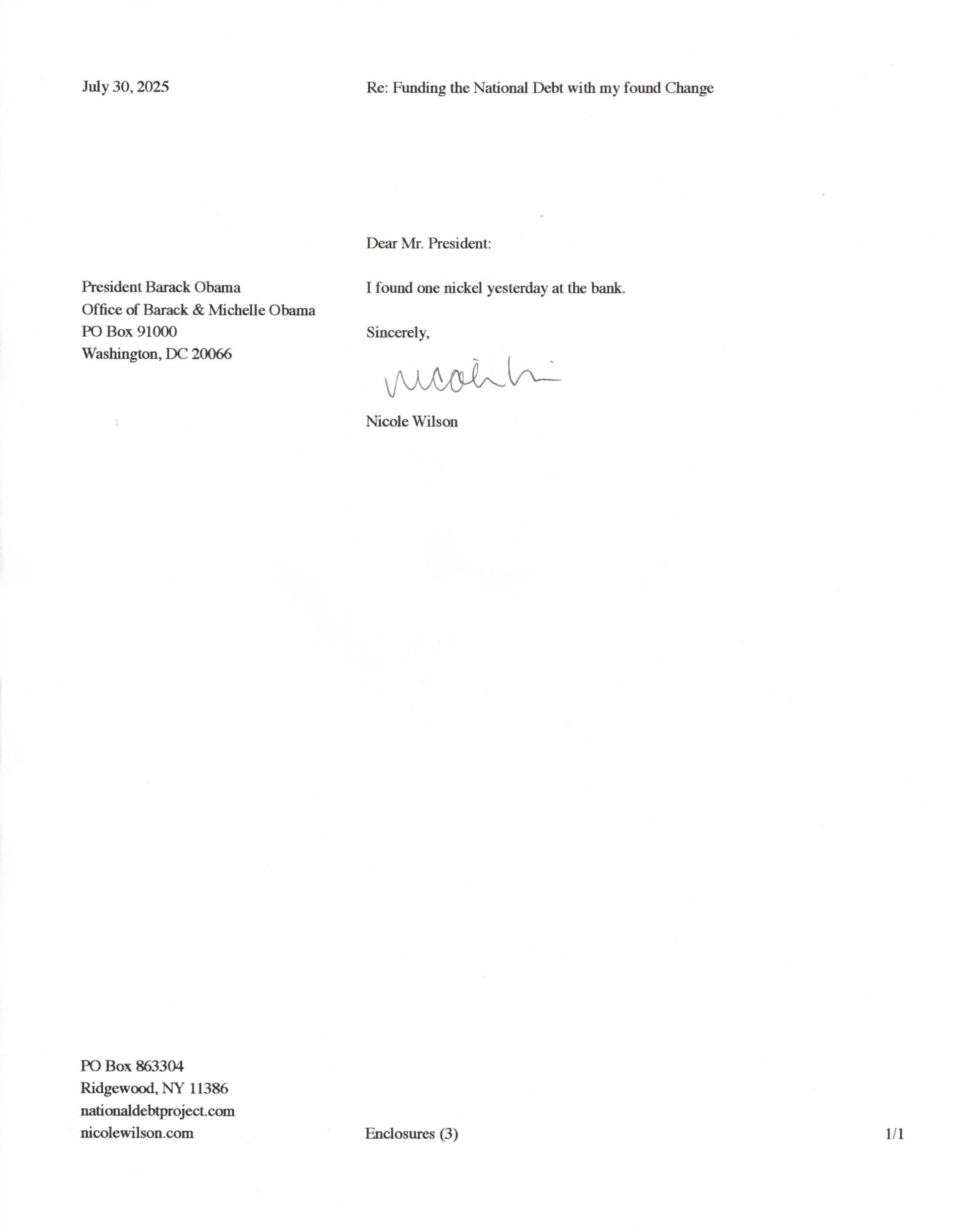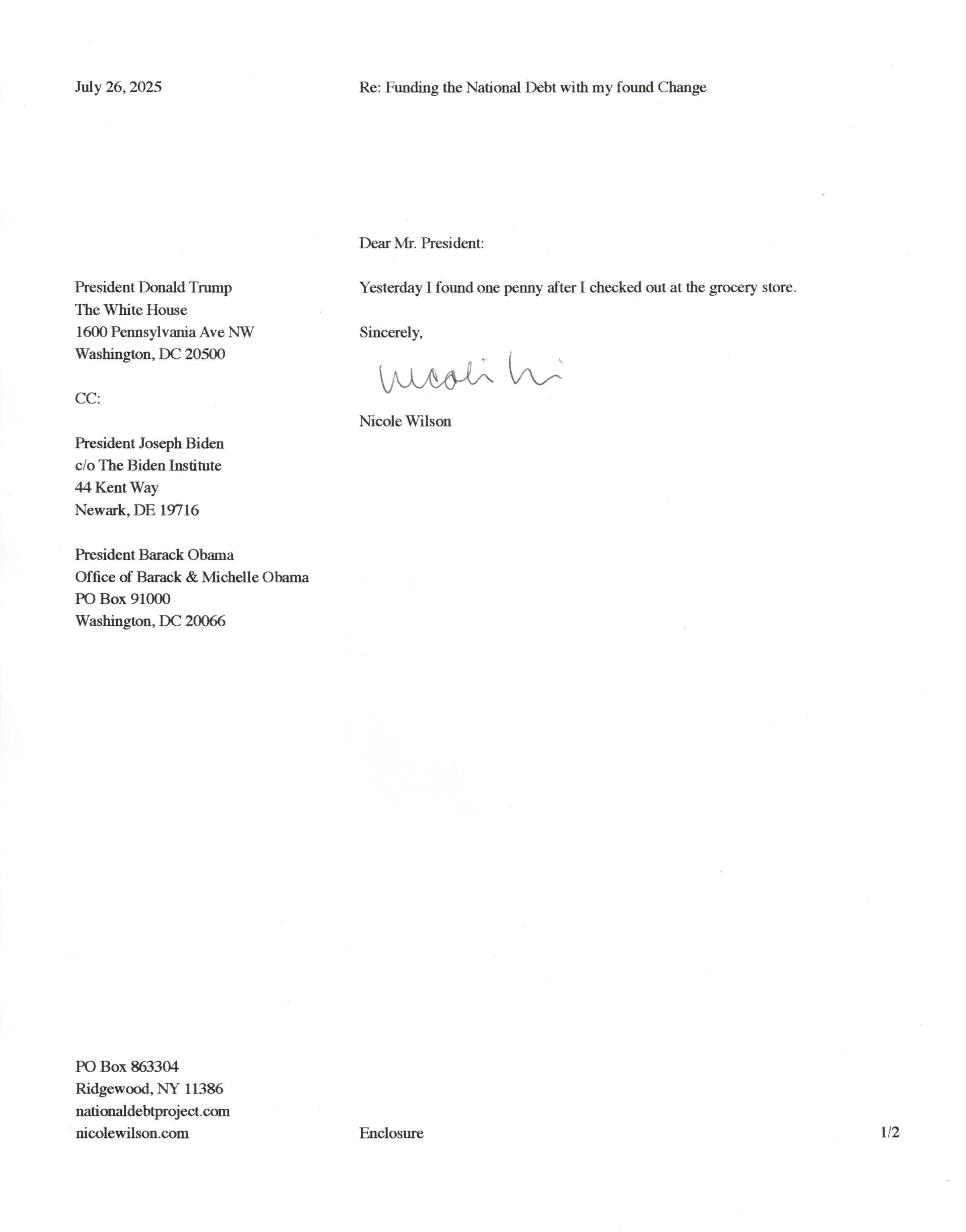 Yet, as I went through each day, I found at least one discarded penny. So, since August 31, 2009, I have sent my found change daily via certified mail to the Bureau of the Fiscal Service (previously the Bureau of the Public Debt), a sector of the Treasury Department whose purpose is to manage the deficit. If by some chance I do not find any change one day, then I send a penny of my own.