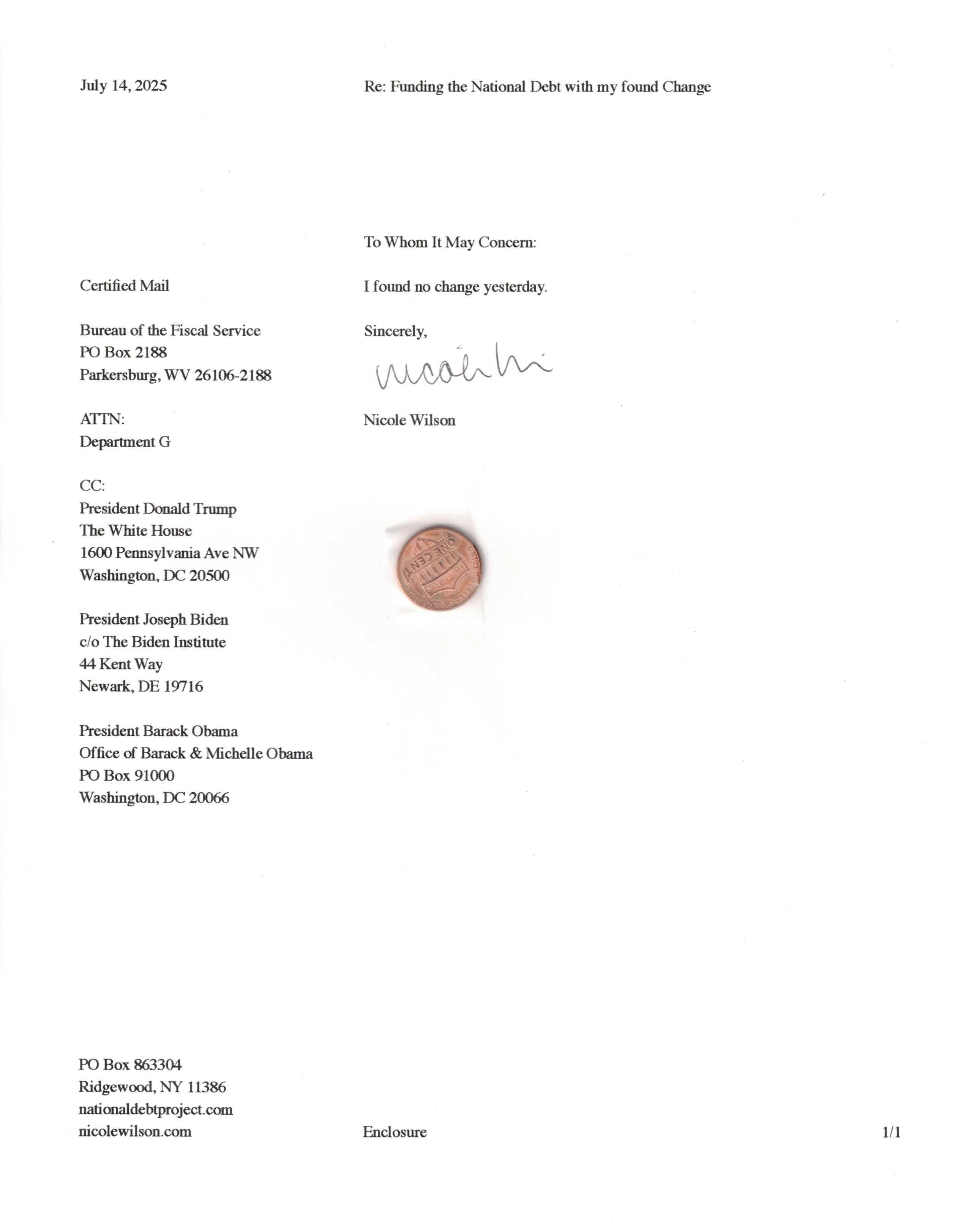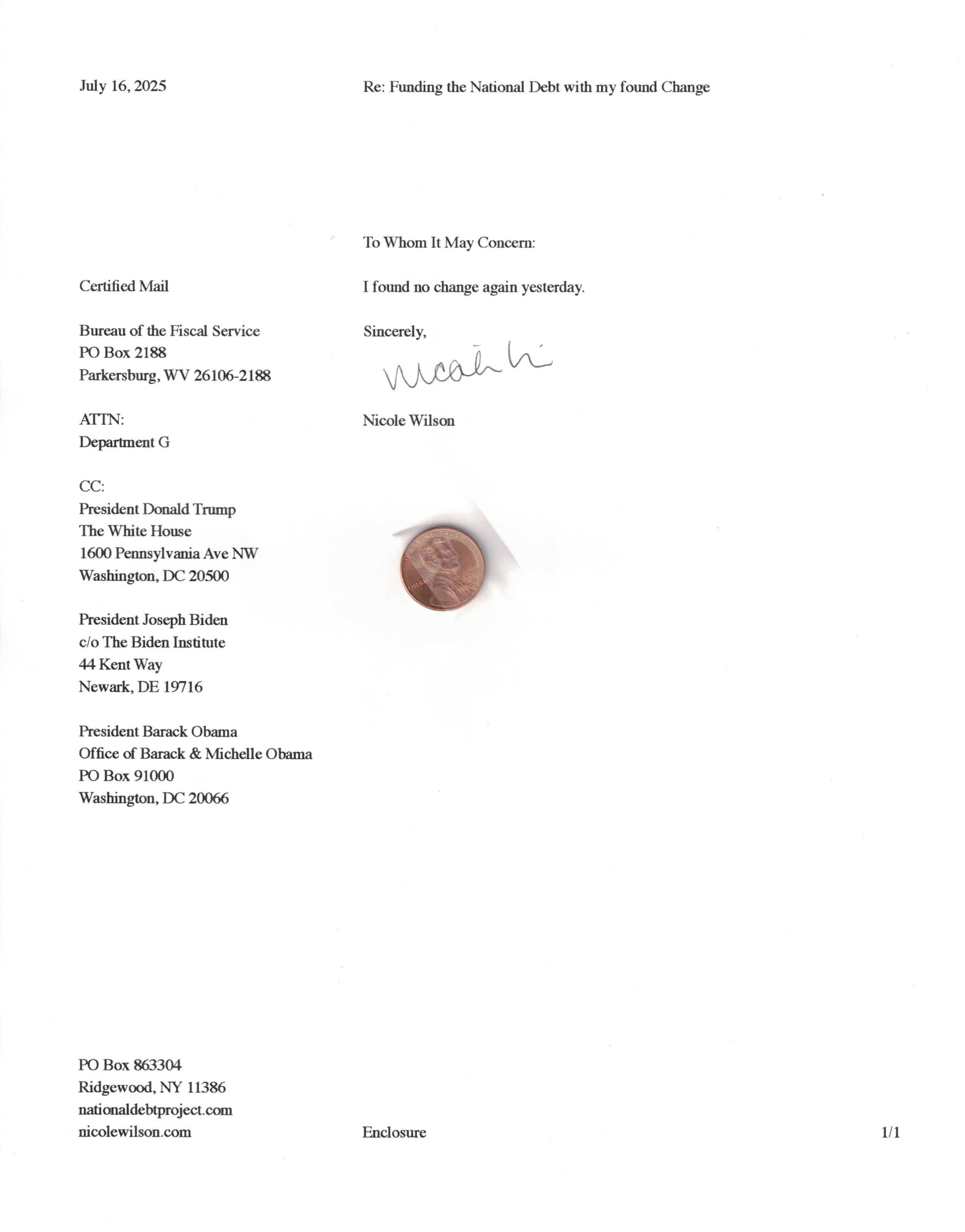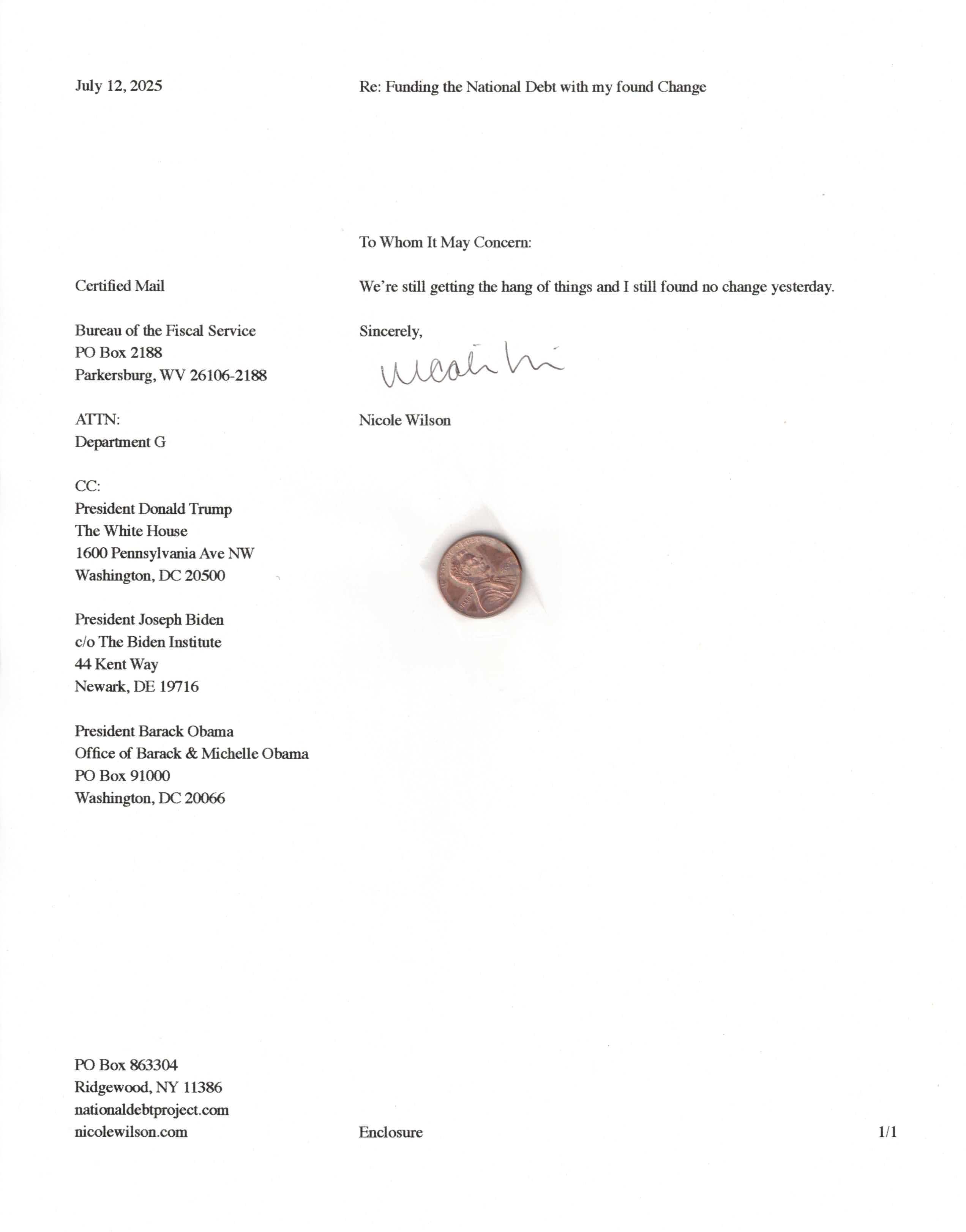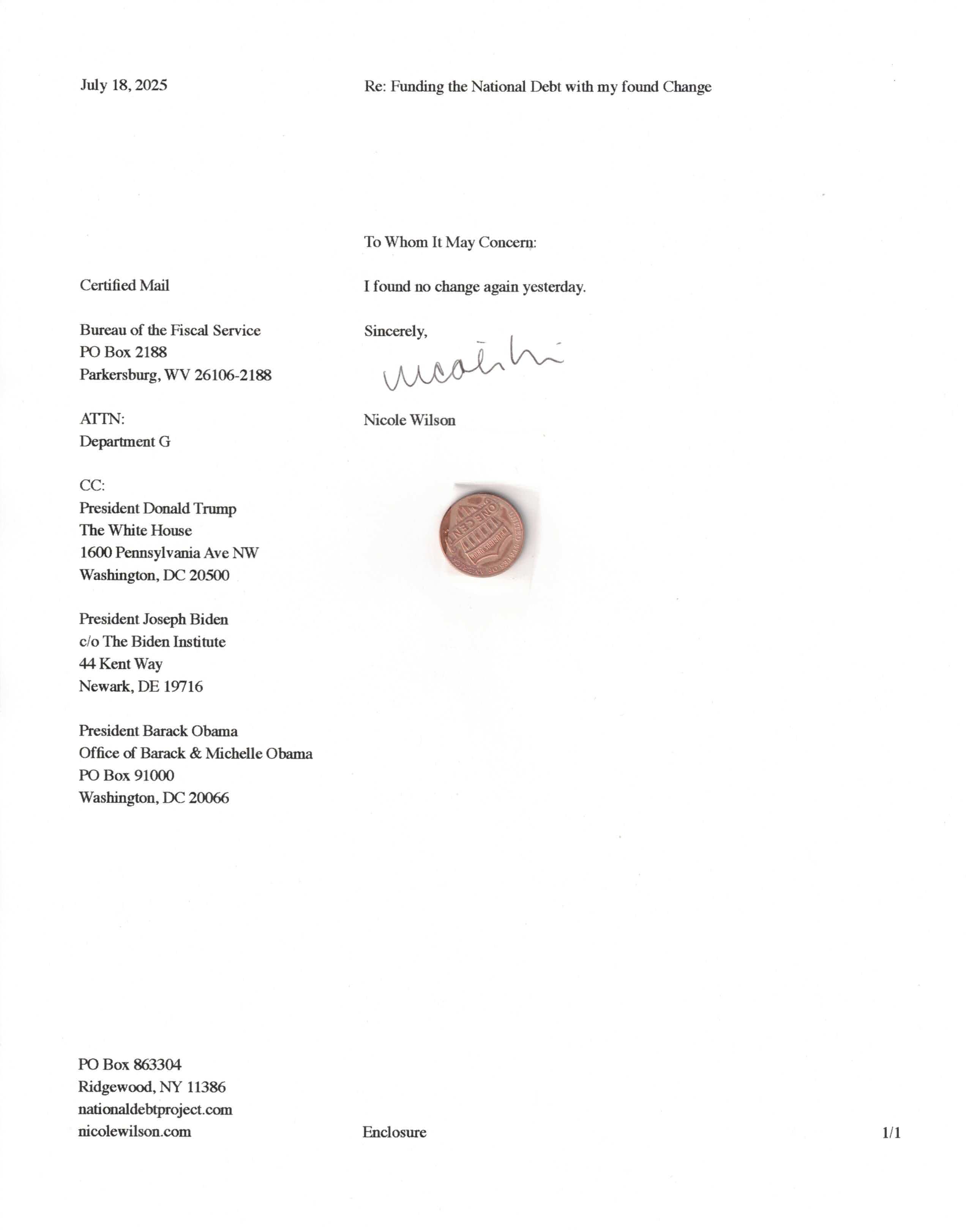 Yet, as I went through each day, I found at least one discarded penny. So, since August 31, 2009, I have sent my found change daily via certified mail to the Bureau of the Fiscal Service (previously the Bureau of the Public Debt), a sector of the Treasury Department whose purpose is to manage the deficit. If by some chance I do not find any change one day, then I send a penny of my own.