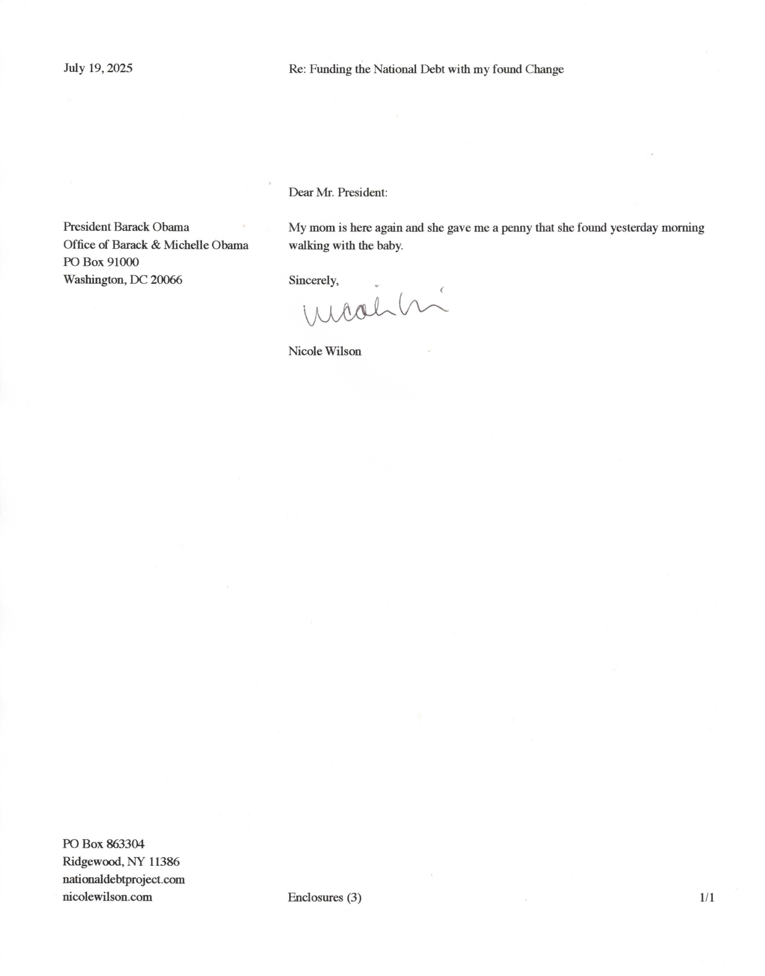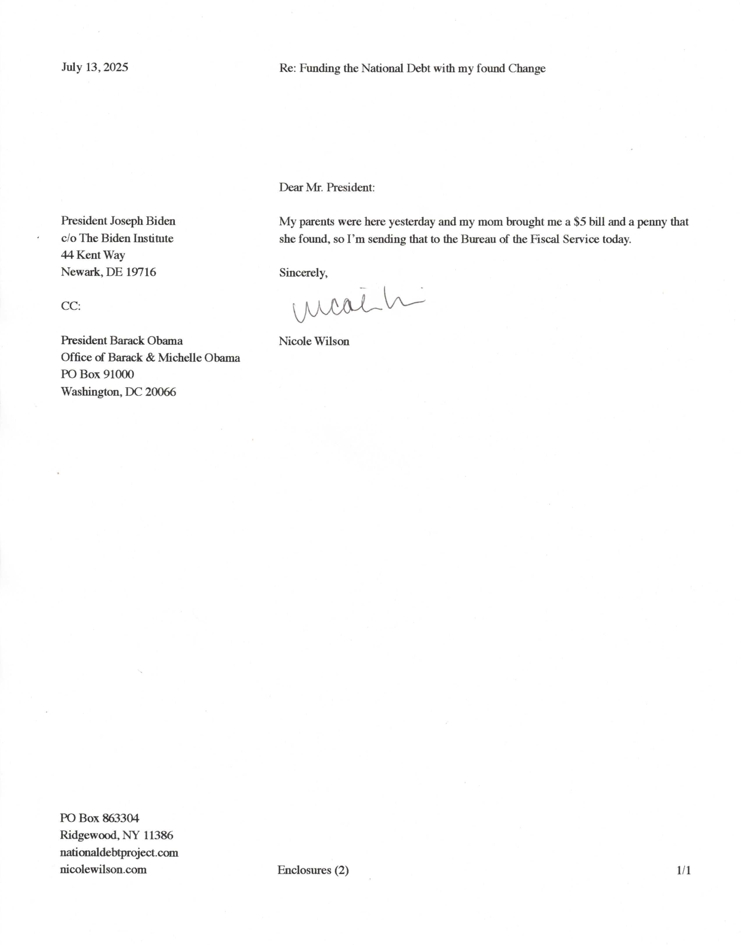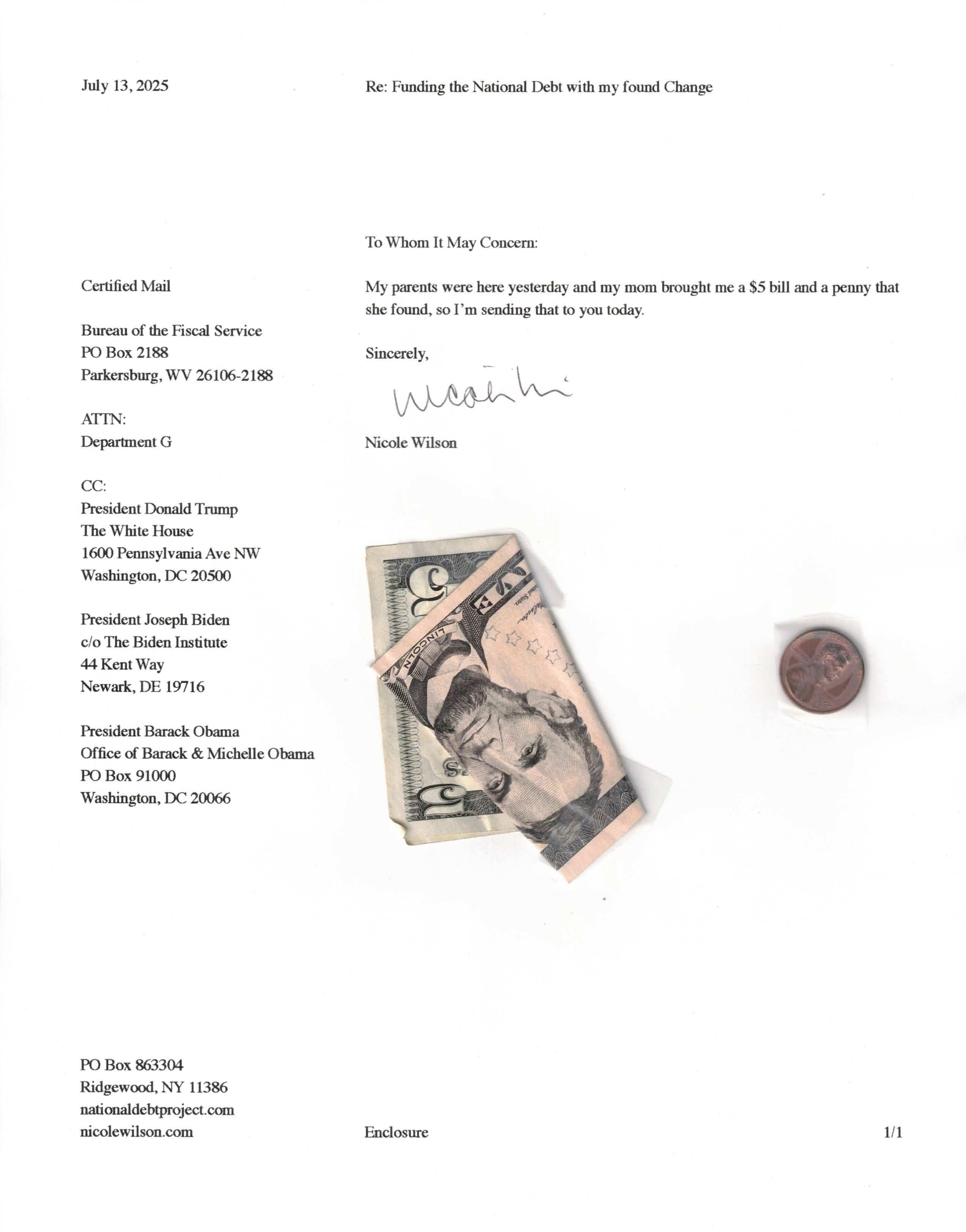 Yet, as I went through each day, I found at least one discarded penny. So, since August 31, 2009, I have sent my found change daily via certified mail to the Bureau of the Fiscal Service (previously the Bureau of the Public Debt), a sector of the Treasury Department whose purpose is to manage the deficit. If by some chance I do not find any change one day, then I send a penny of my own.