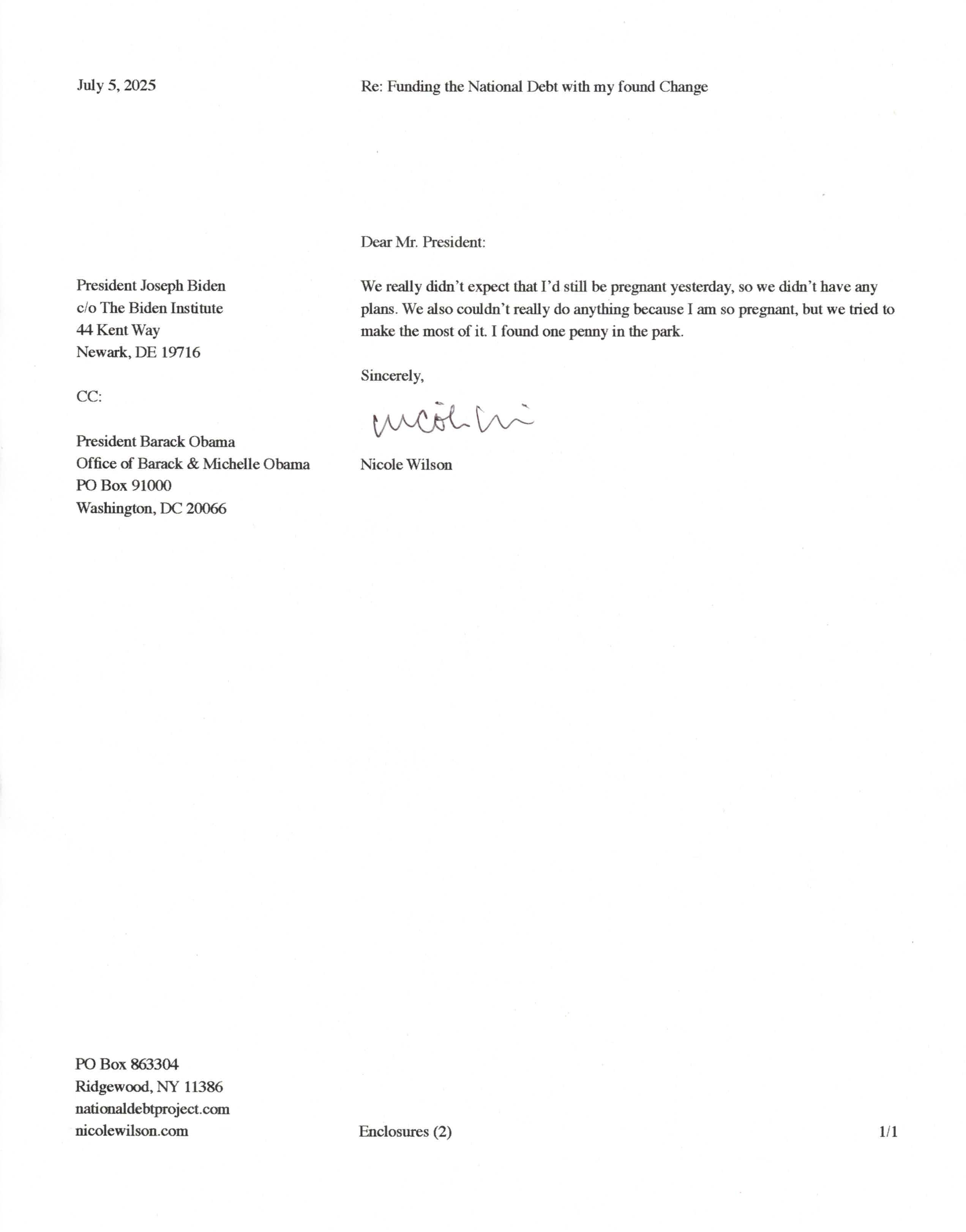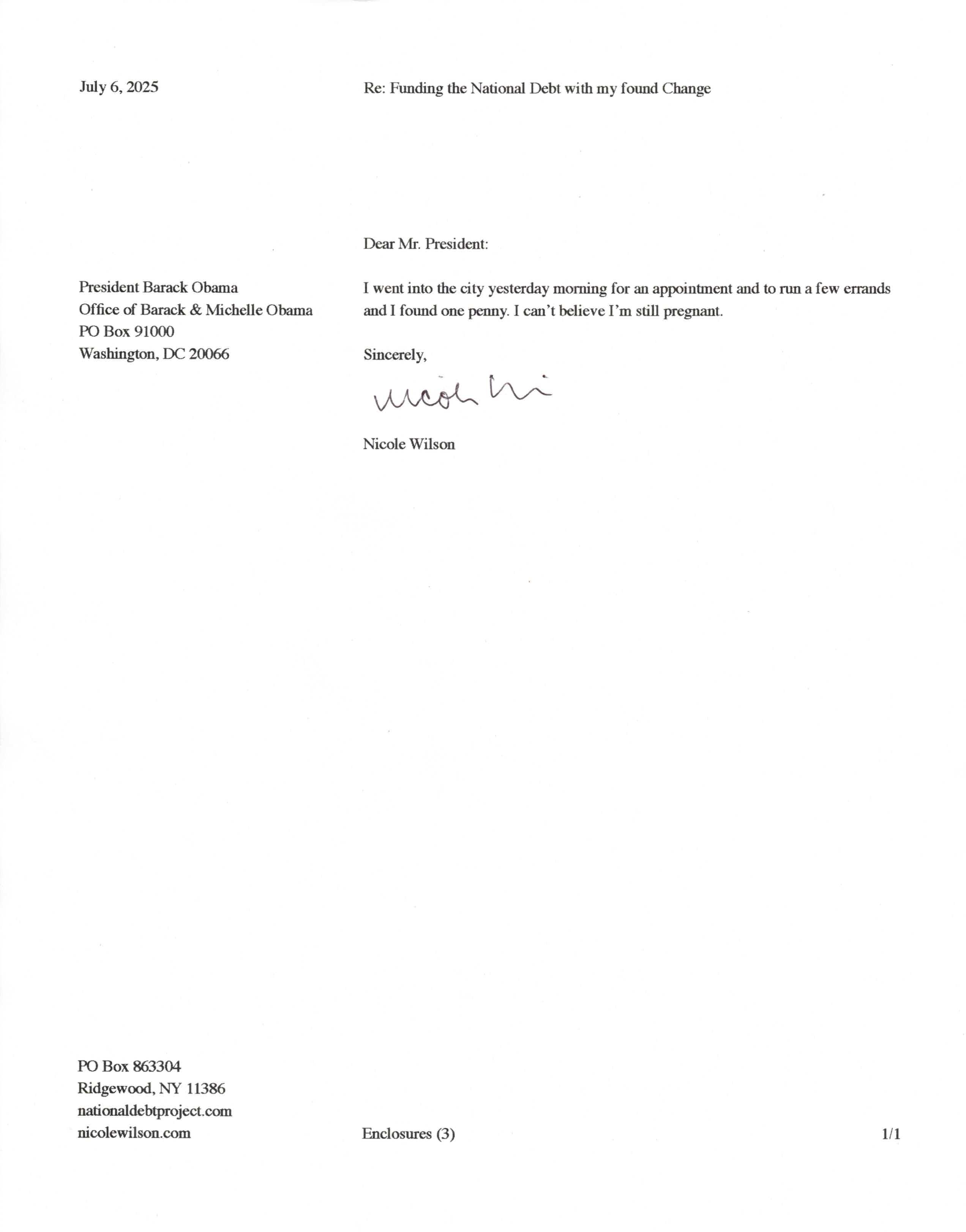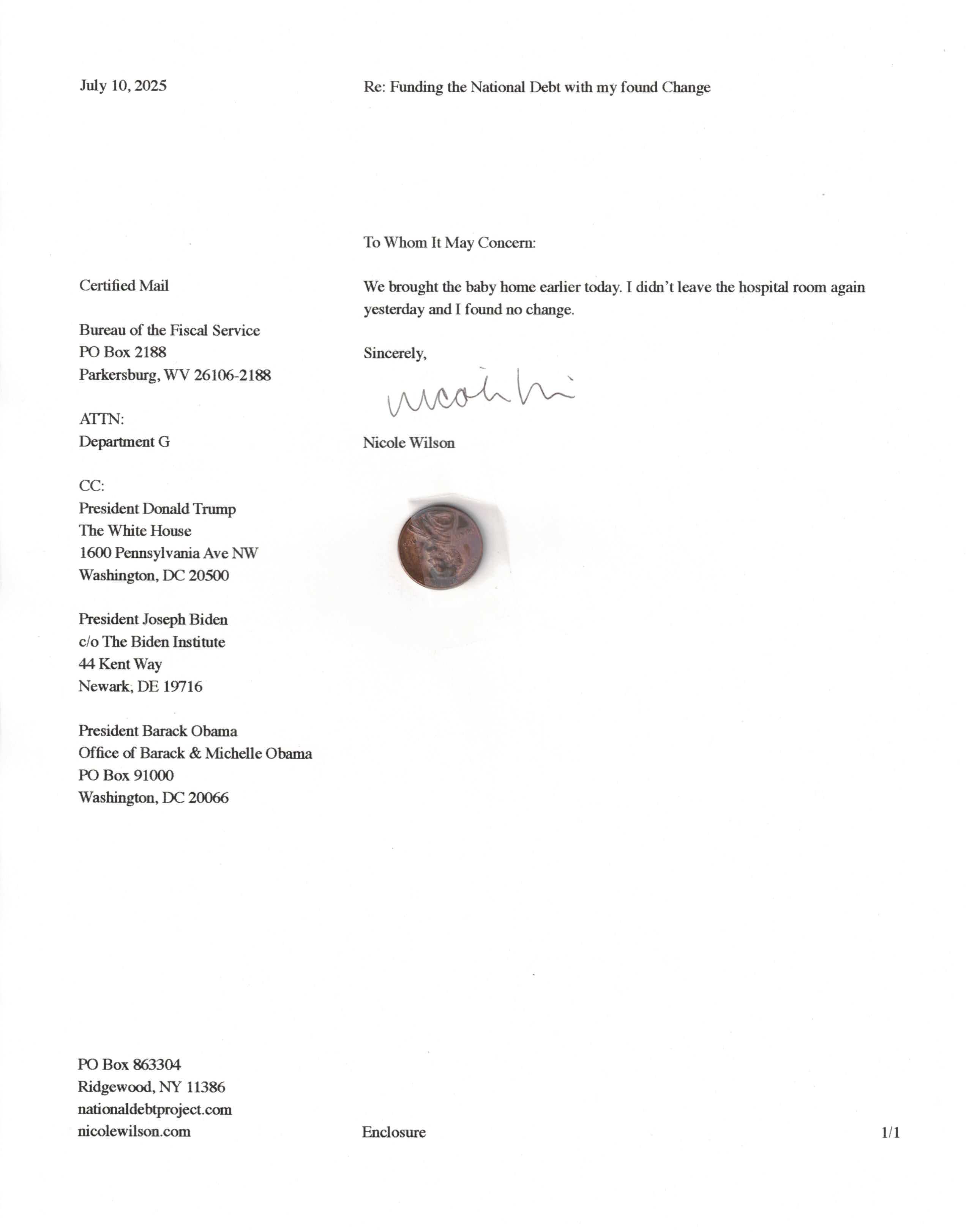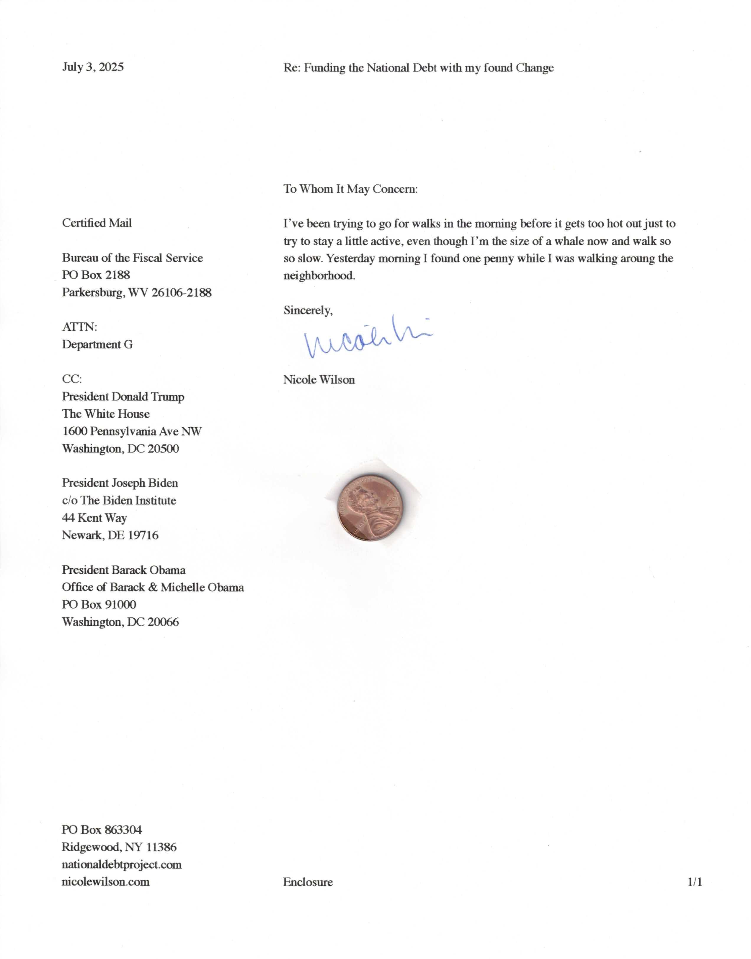 Yet, as I went through each day, I found at least one discarded penny. So, since August 31, 2009, I have sent my found change daily via certified mail to the Bureau of the Fiscal Service (previously the Bureau of the Public Debt), a sector of the Treasury Department whose purpose is to manage the deficit. If by some chance I do not find any change one day, then I send a penny of my own.