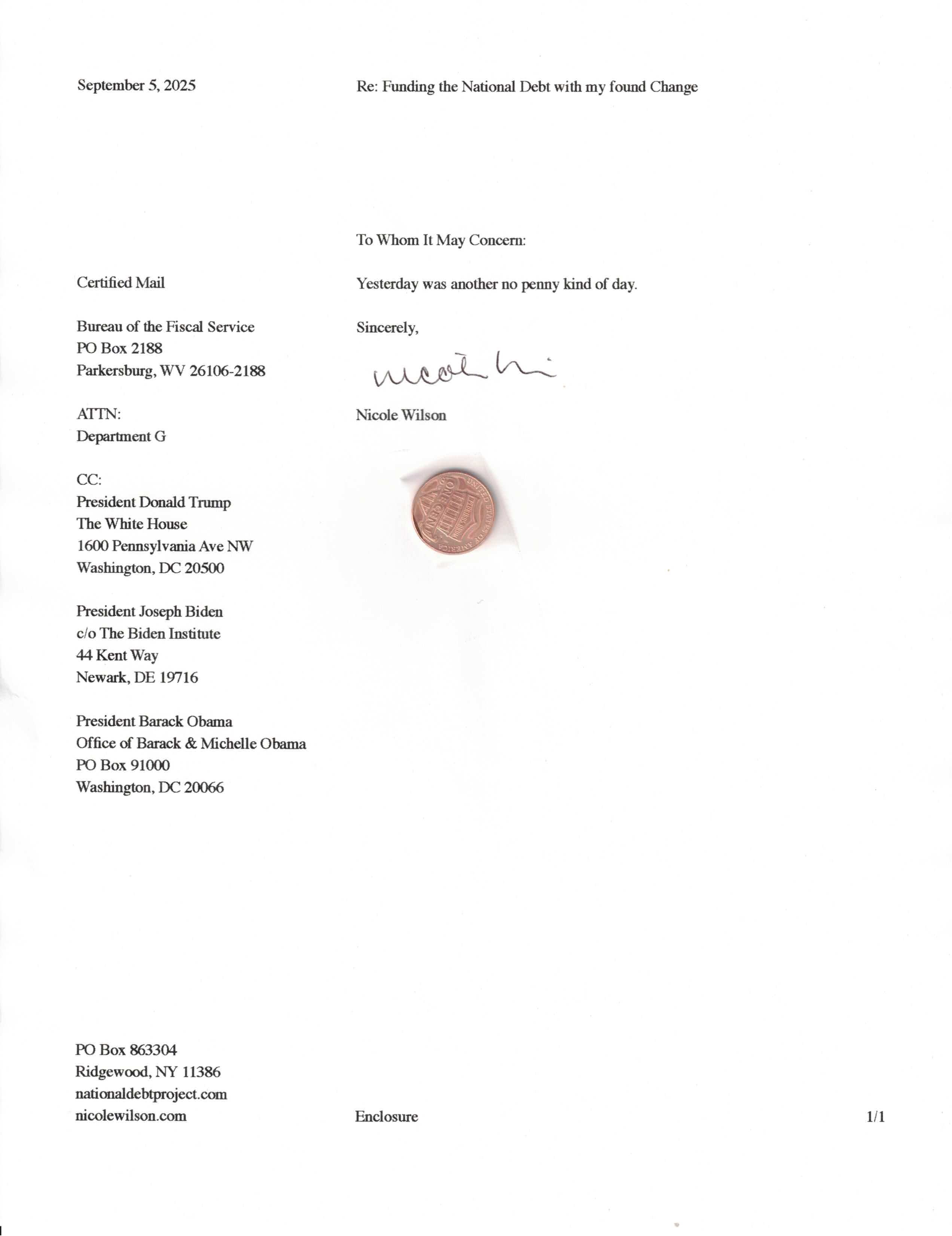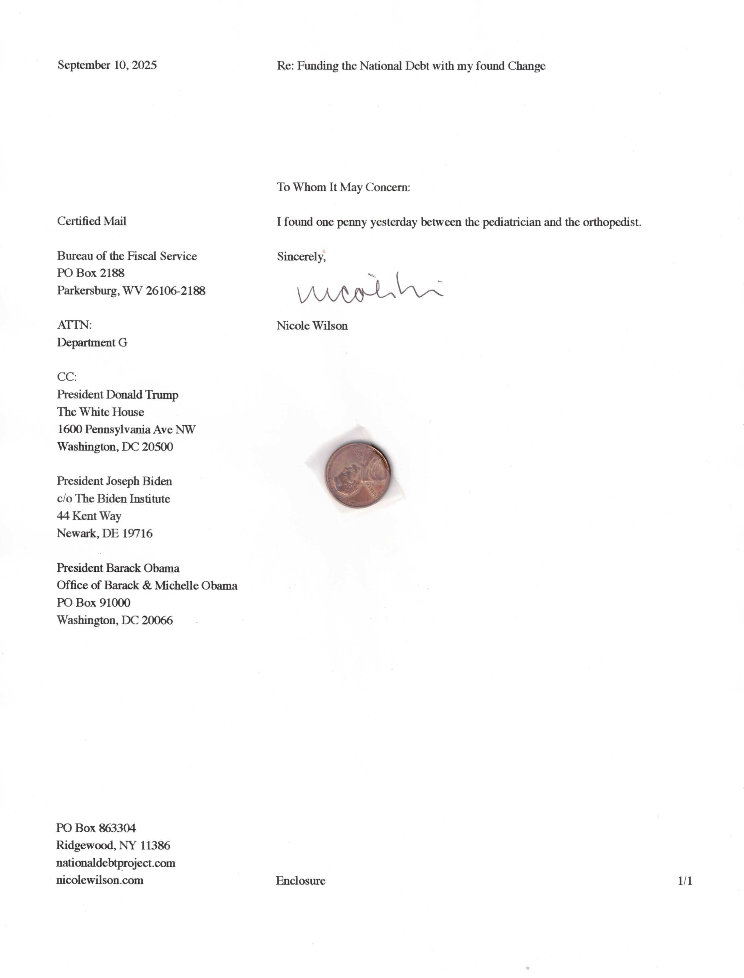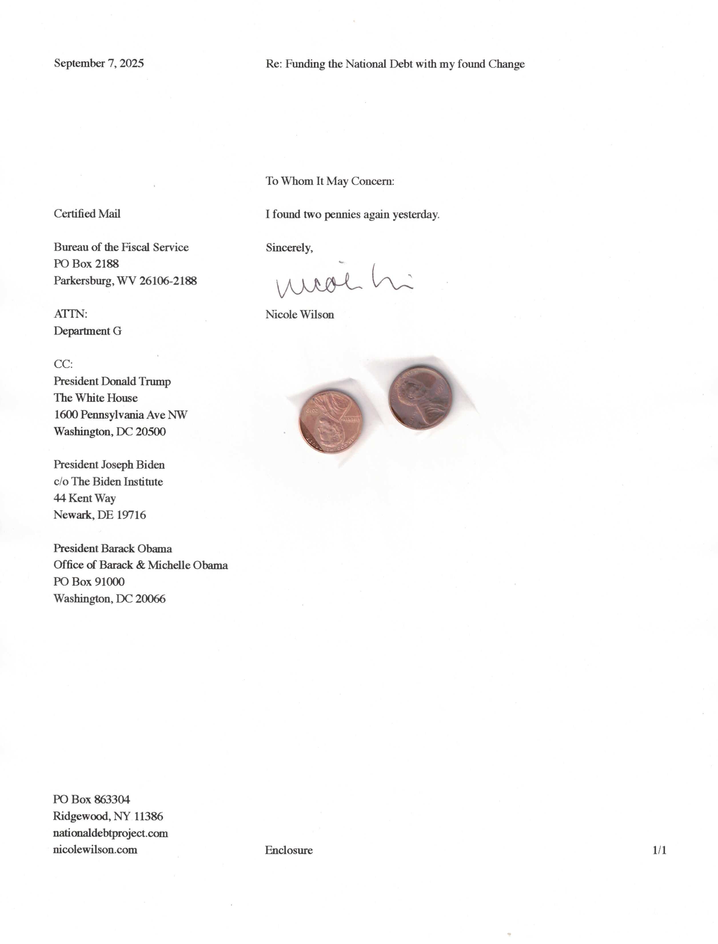Yet, as I went through each day, I found at least one discarded penny. So, since August 31, 2009, I have sent my found change daily via certified mail to the Bureau of the Fiscal Service (previously the Bureau of the Public Debt), a sector of the Treasury Department whose purpose is to manage the deficit. If by some chance I do not find any change one day, then I send a penny of my own.
