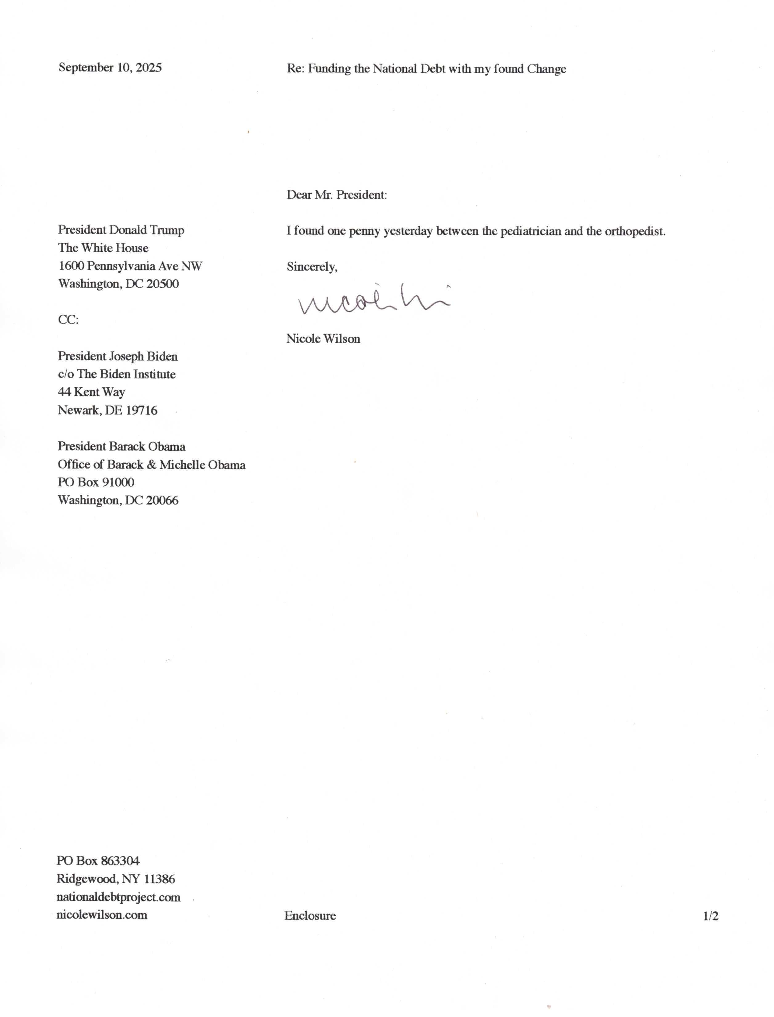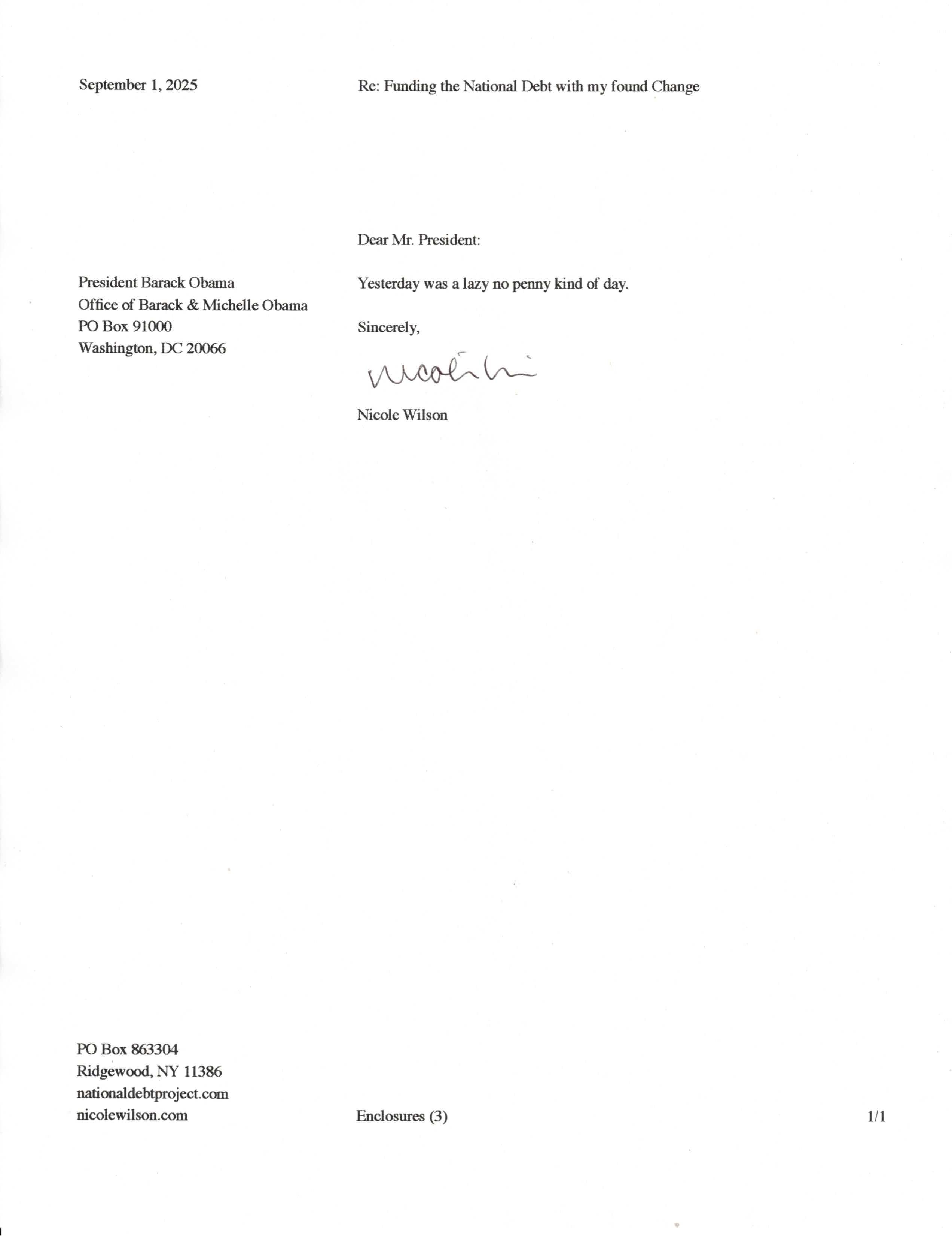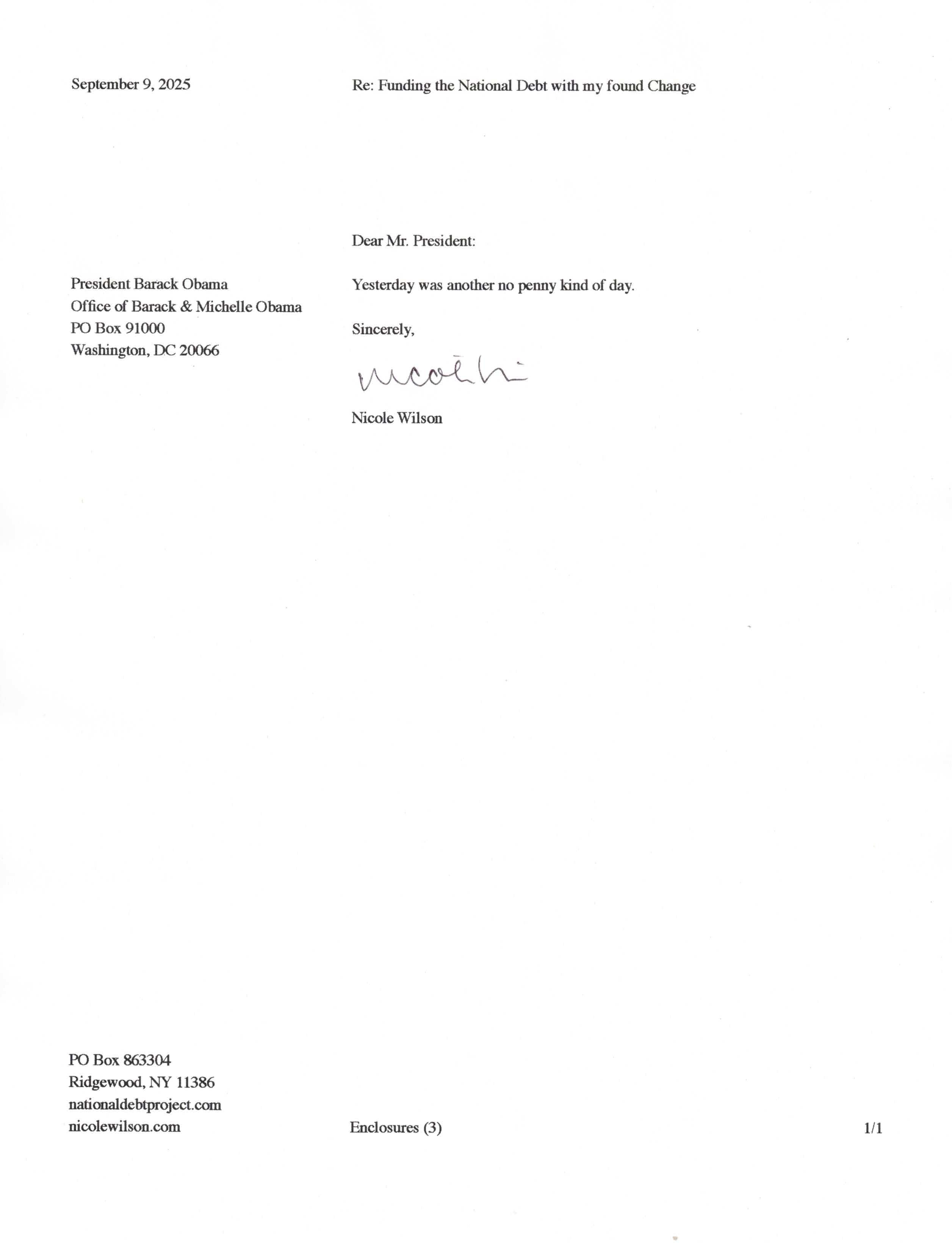 Yet, as I went through each day, I found at least one discarded penny. So, since August 31, 2009, I have sent my found change daily via certified mail to the Bureau of the Fiscal Service (previously the Bureau of the Public Debt), a sector of the Treasury Department whose purpose is to manage the deficit. If by some chance I do not find any change one day, then I send a penny of my own.