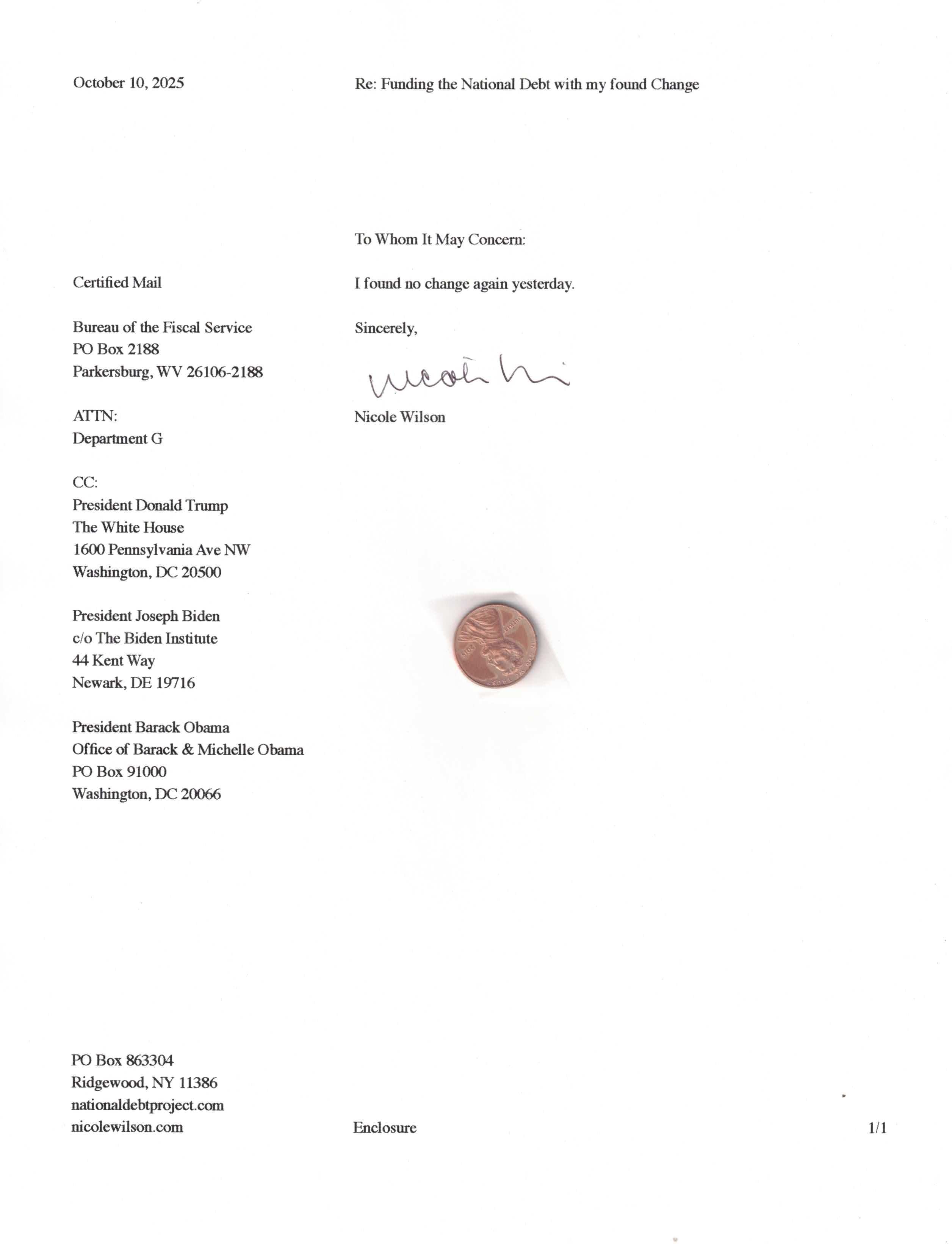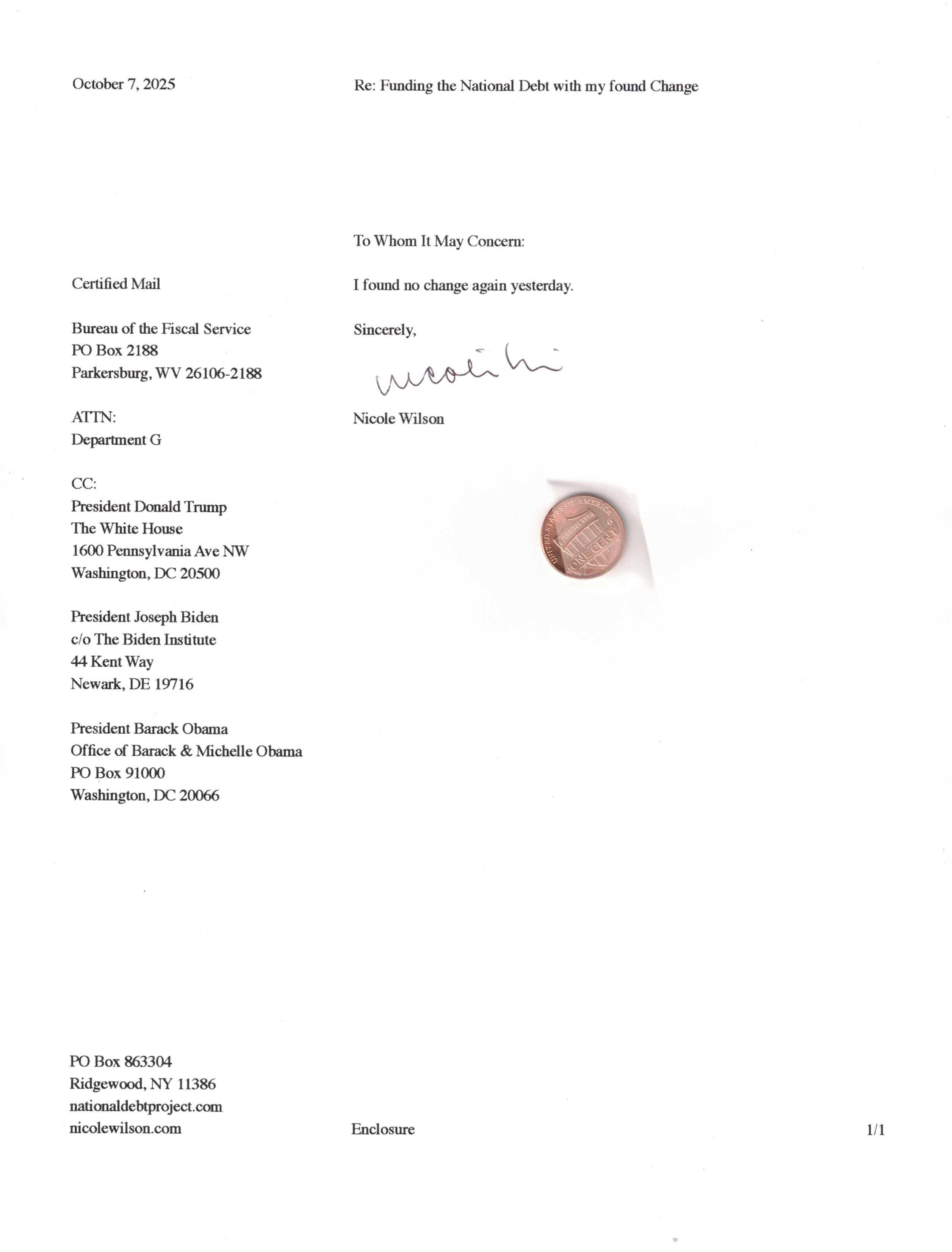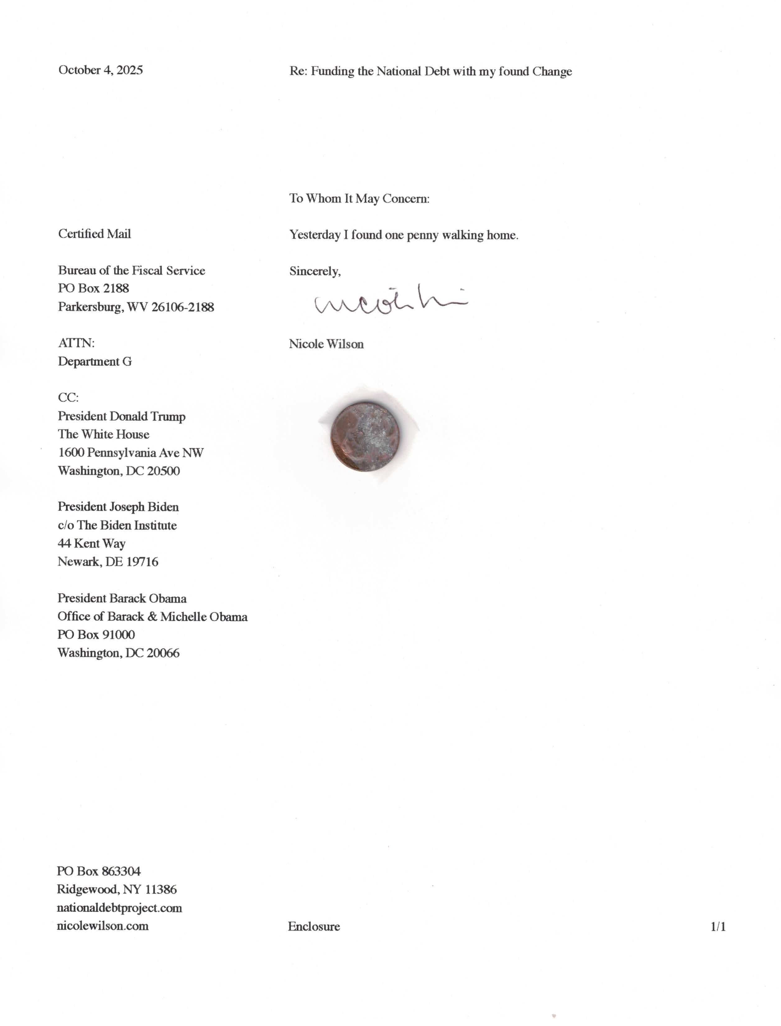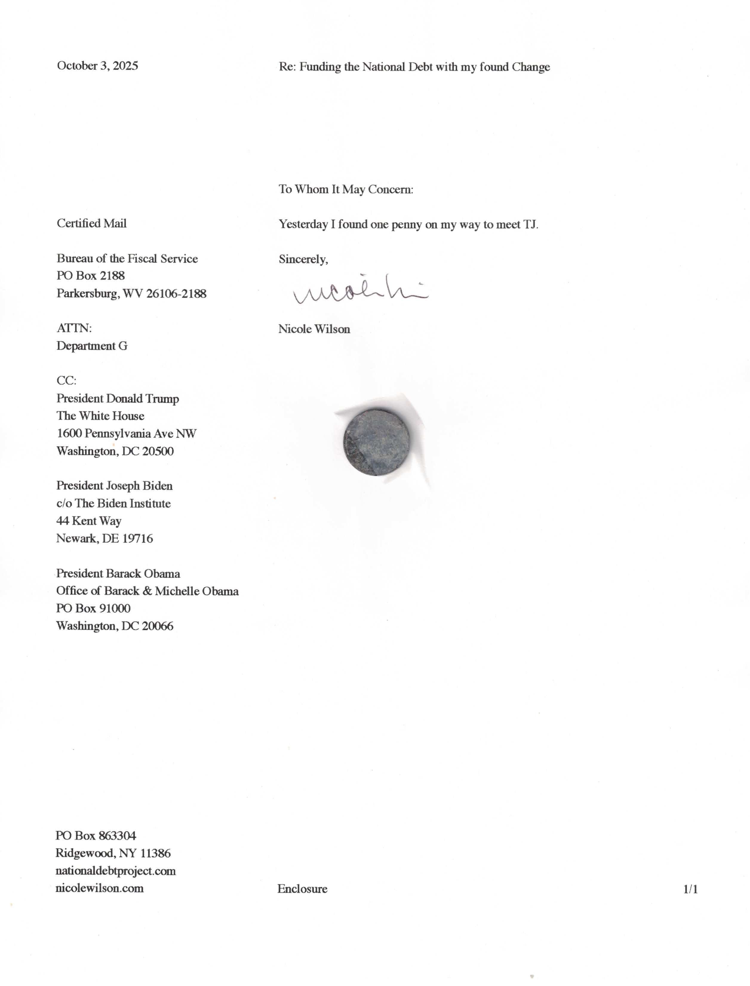 Yet, as I went through each day, I found at least one discarded penny. So, since August 31, 2009, I have sent my found change daily via certified mail to the Bureau of the Fiscal Service (previously the Bureau of the Public Debt), a sector of the Treasury Department whose purpose is to manage the deficit. If by some chance I do not find any change one day, then I send a penny of my own.
