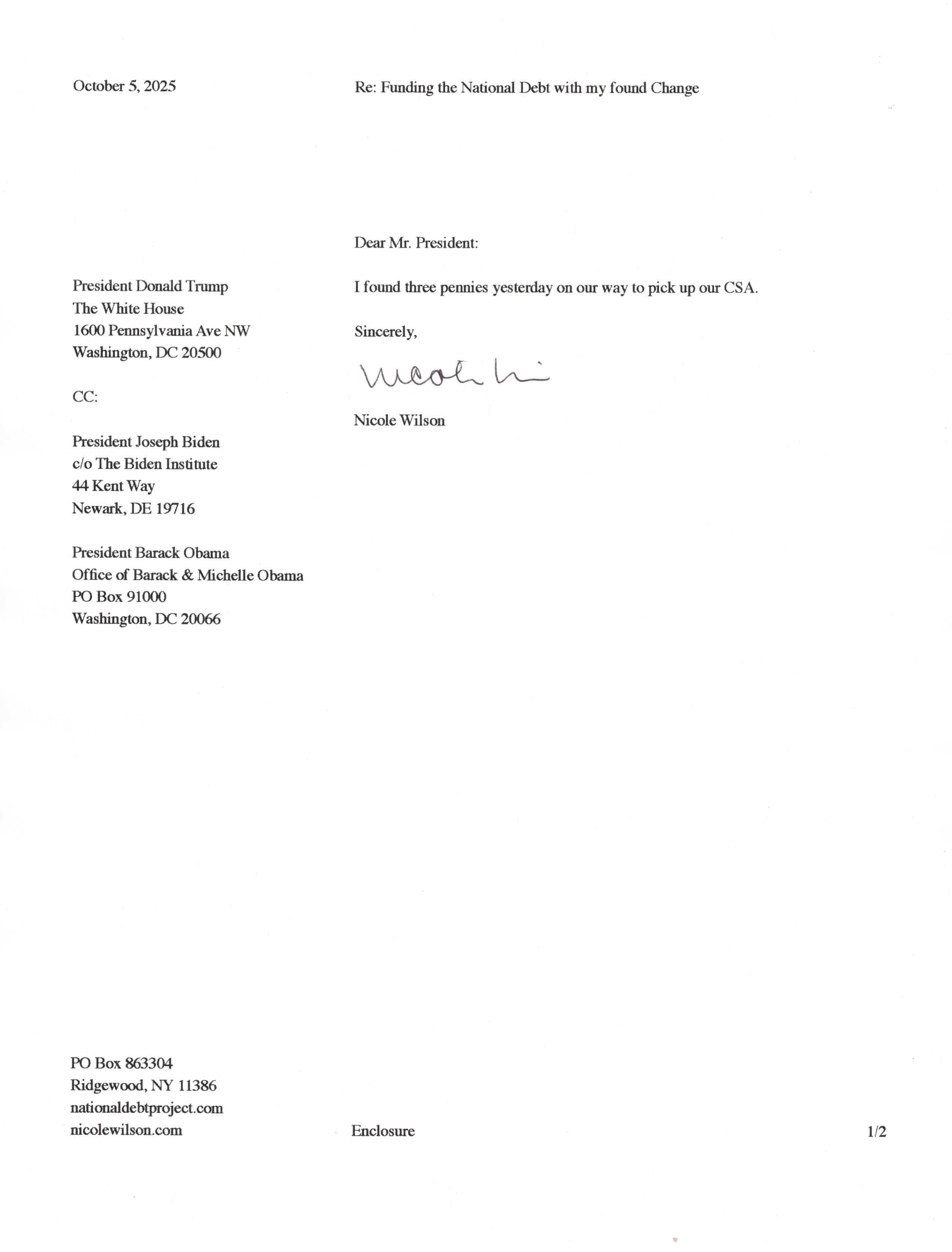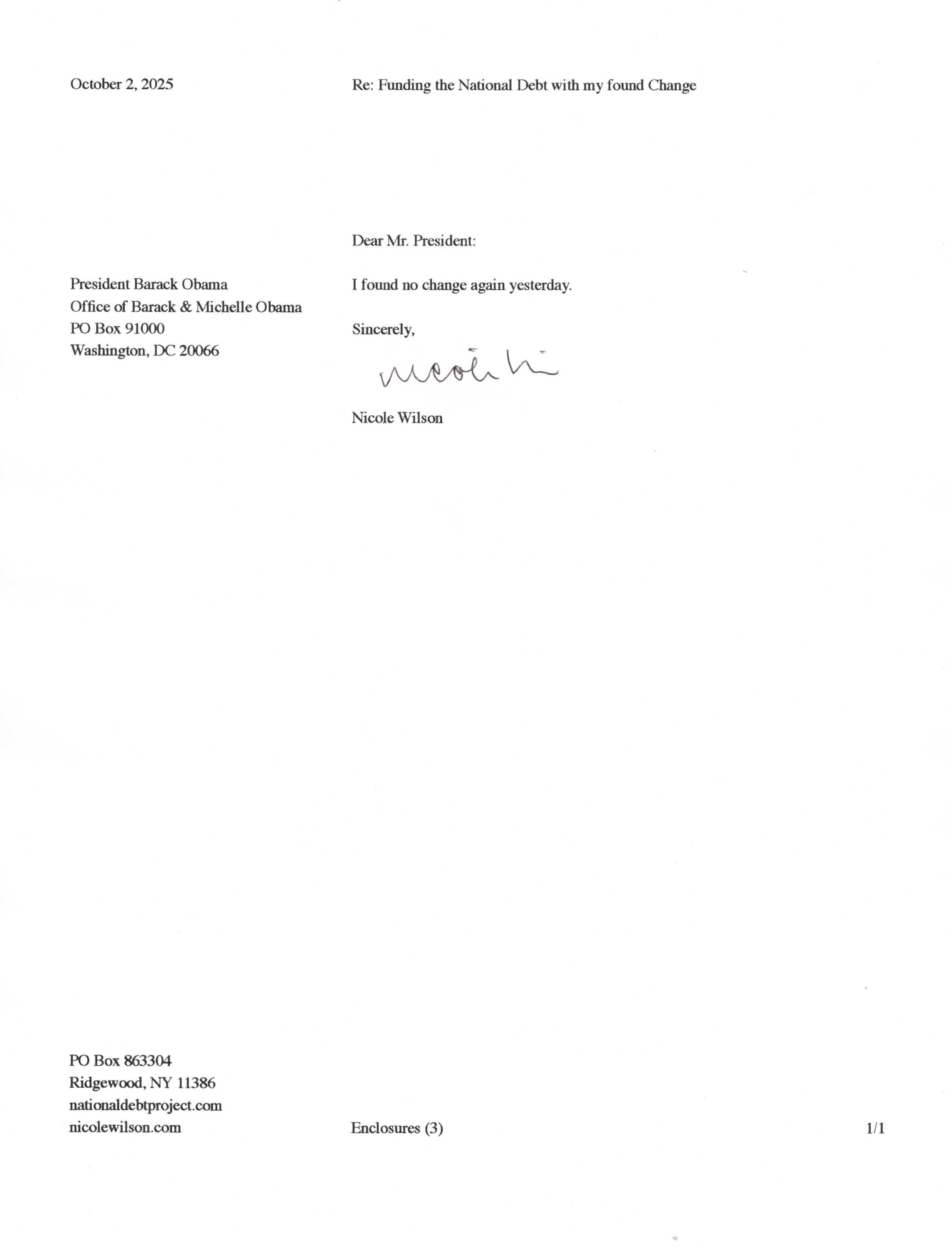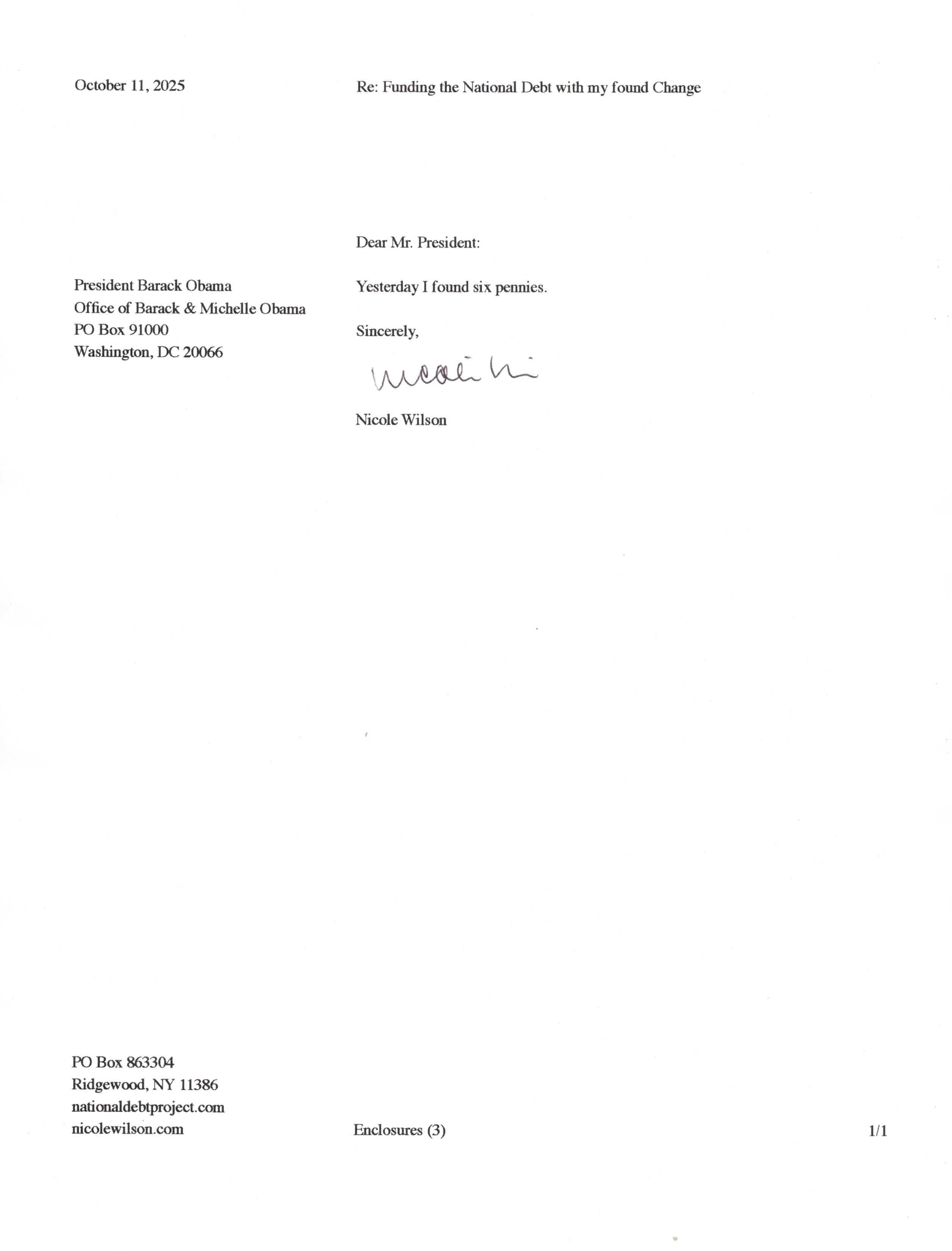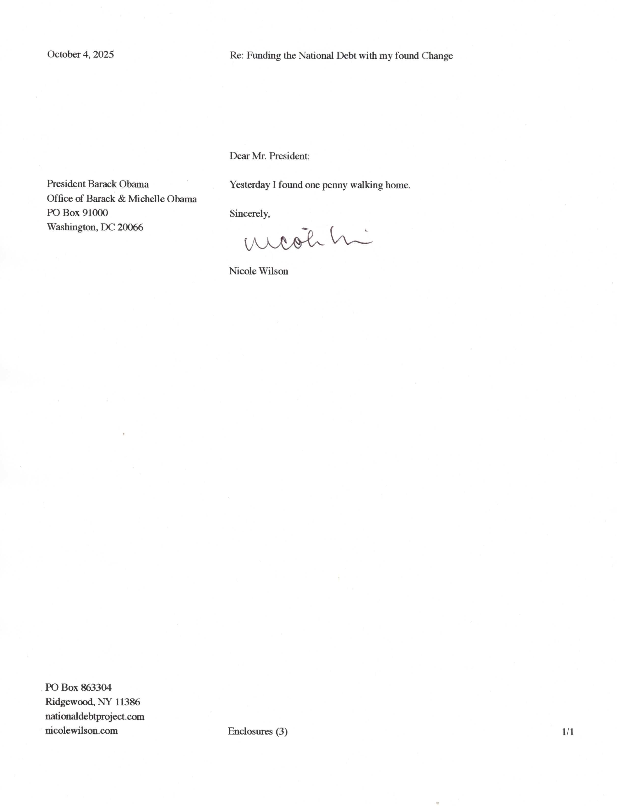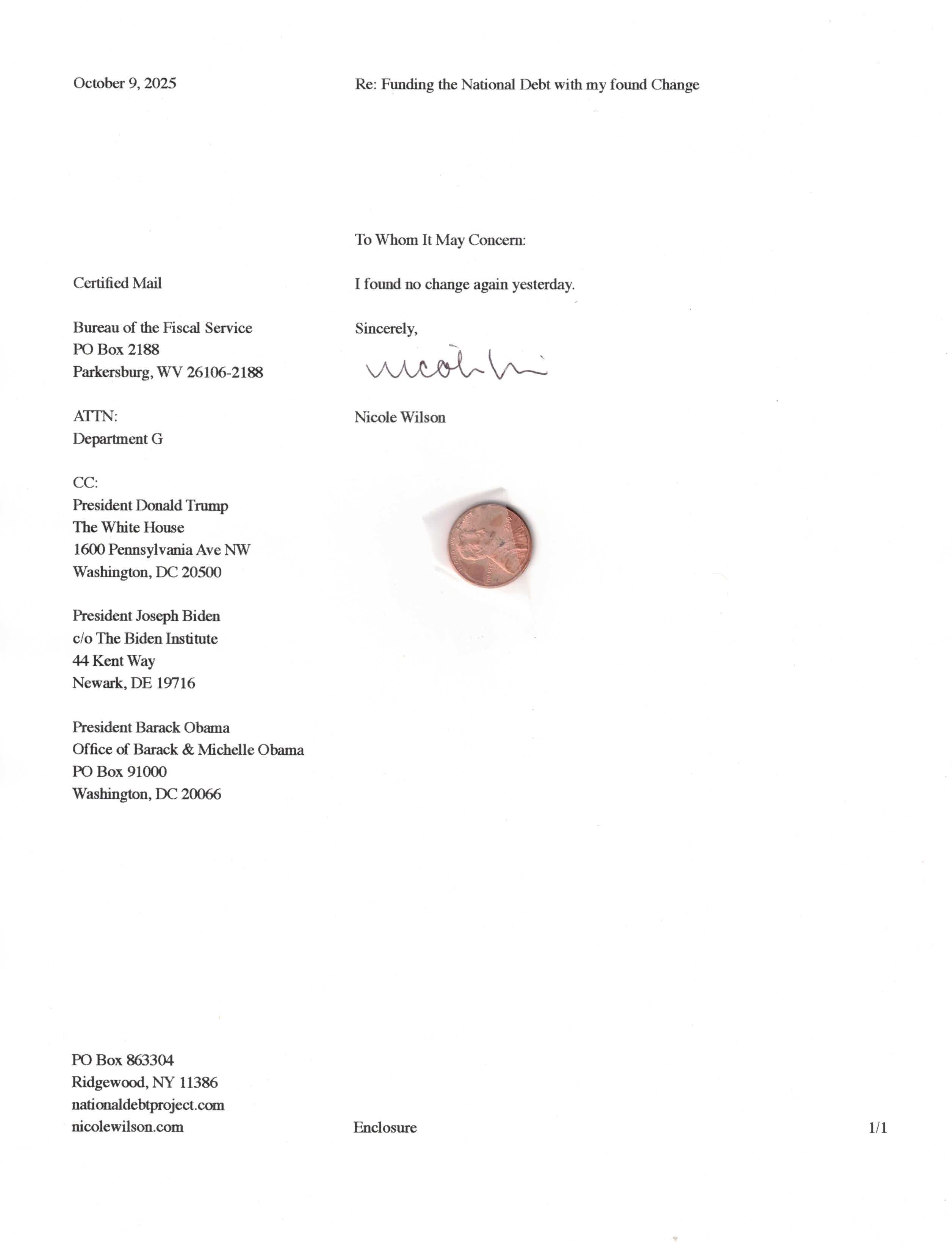 Yet, as I went through each day, I found at least one discarded penny. So, since August 31, 2009, I have sent my found change daily via certified mail to the Bureau of the Fiscal Service (previously the Bureau of the Public Debt), a sector of the Treasury Department whose purpose is to manage the deficit. If by some chance I do not find any change one day, then I send a penny of my own.